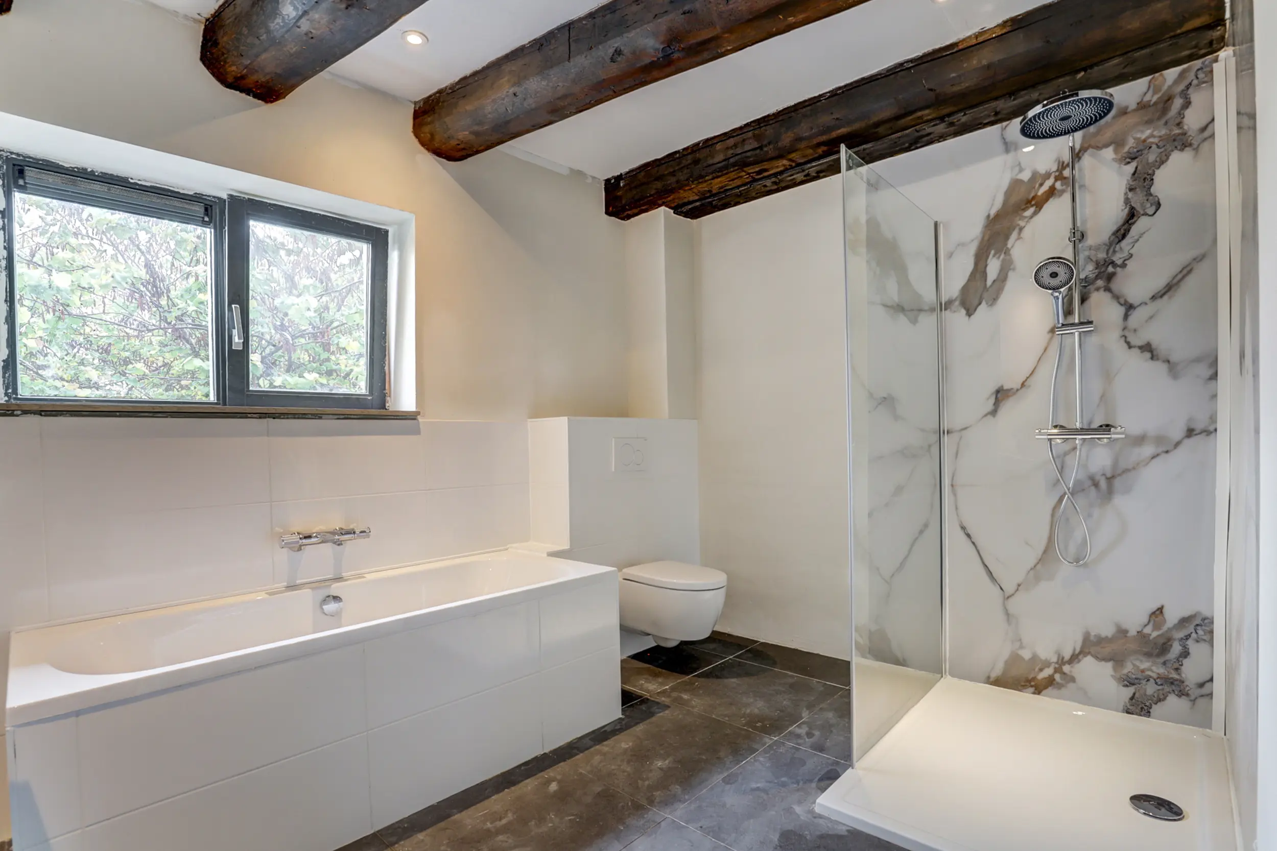 De badkamer is voorzien van een wastafel, douche, toilet en een ligbad.