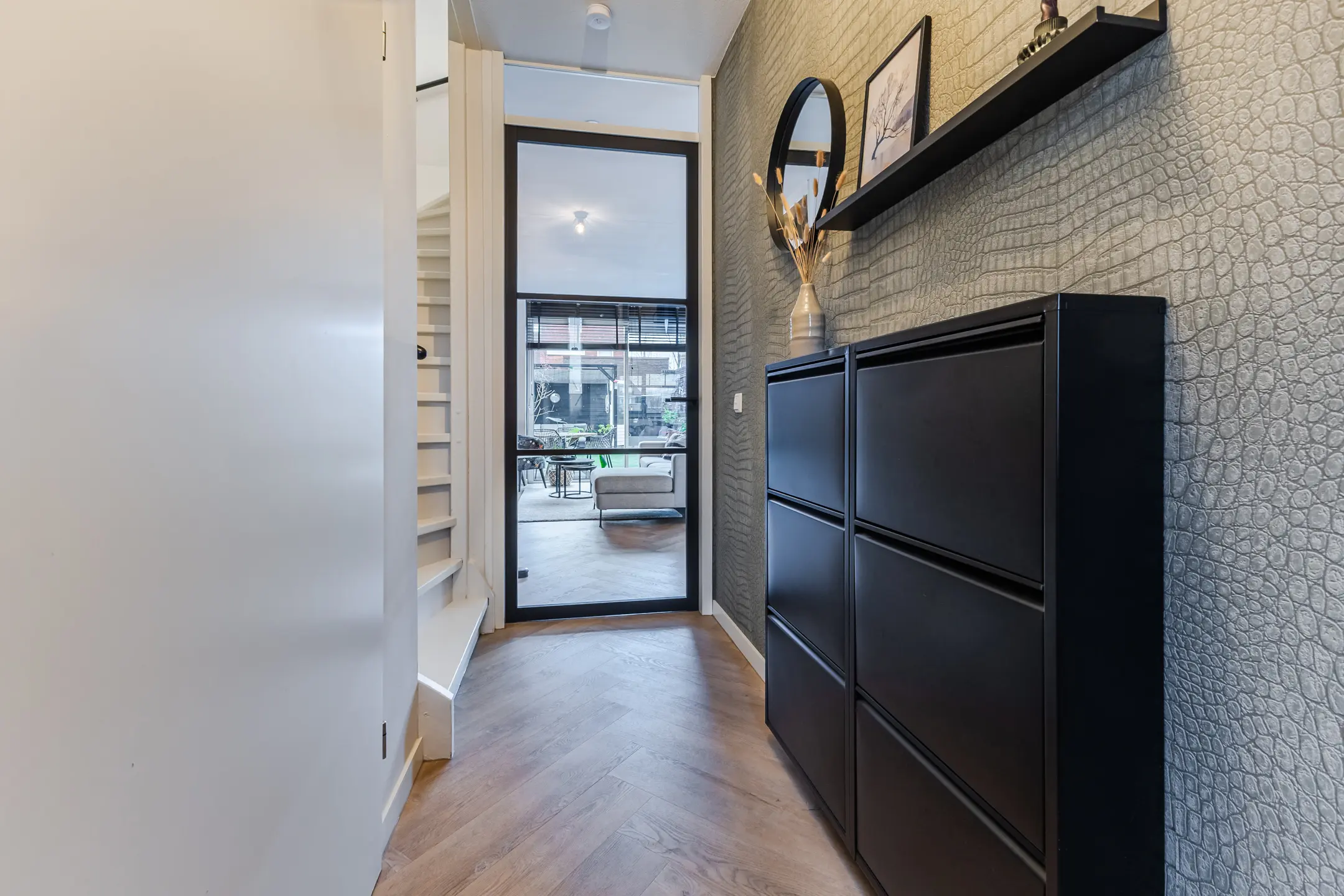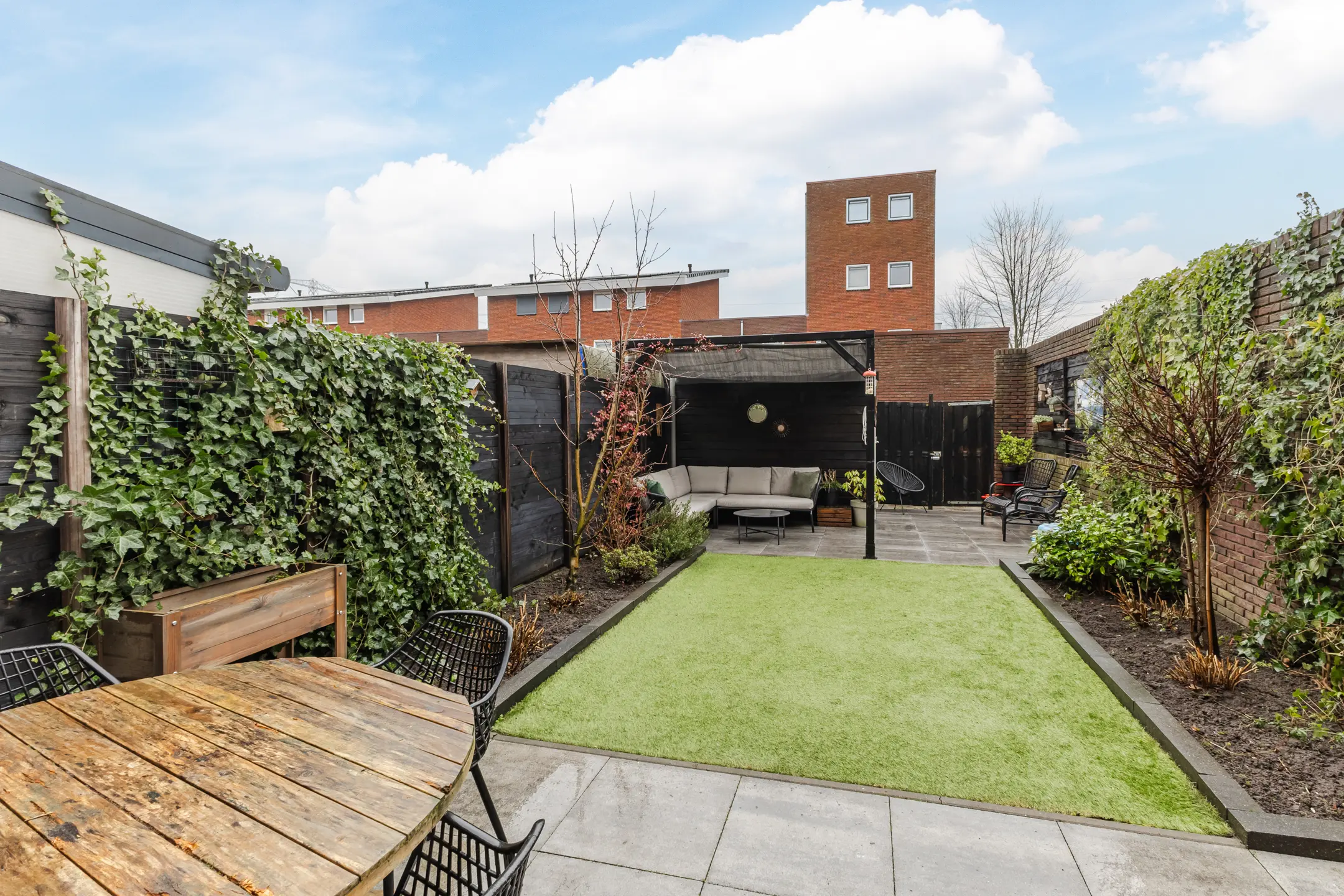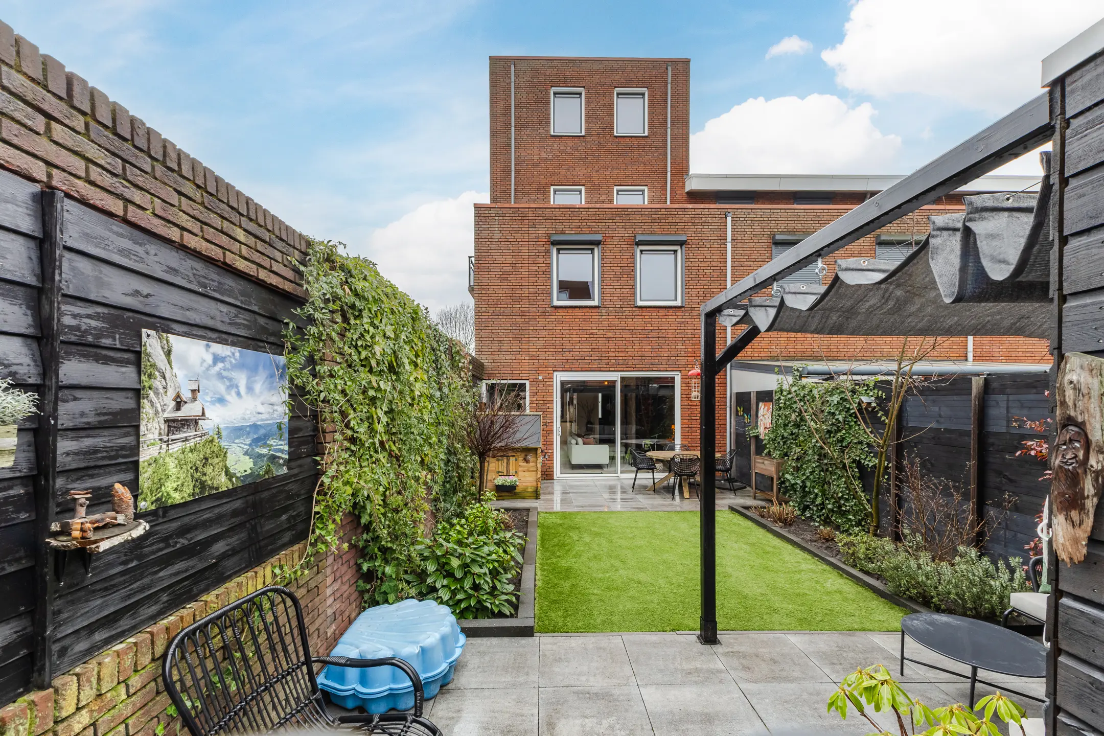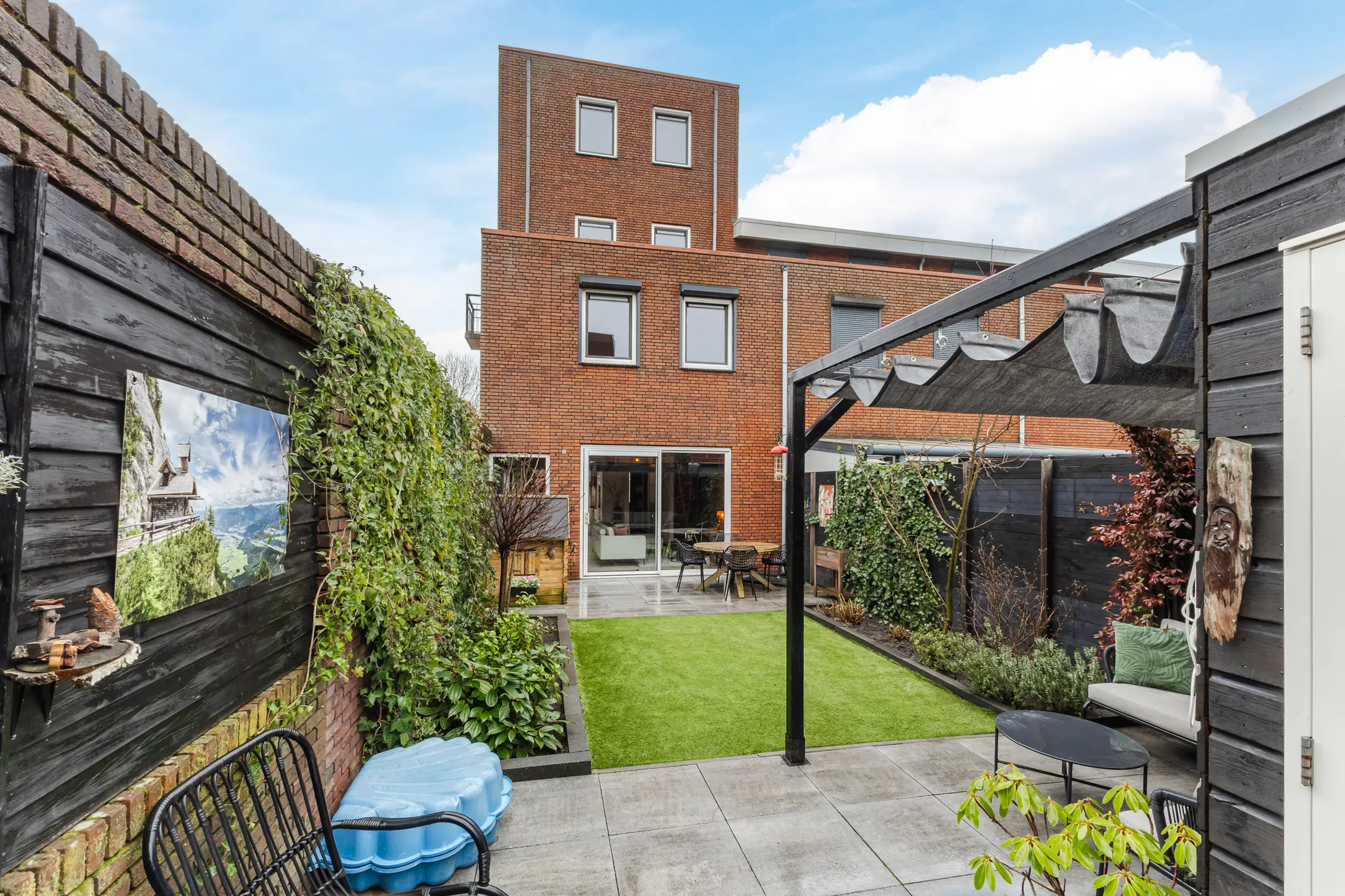 Ook buiten is het genieten. De tuin op het noordoosten is een fijne, rustige plek waar je in de ochtend heerlijk van de zon kunt genieten en op warme dagen altijd een aangenaam plekje in de schaduw vindt. Ook de tuin is in 2021 volledig vernieuwd. Dankzij de achterom is de tuin bovendien praktisch in gebruik. Extra bijzonder is het balkon aan de slaapkamer op de tweede verdieping, gelegen op het oosten — een heerlijke plek om de dag te beginnen met een kop koffie en de eerste zonnestralen.