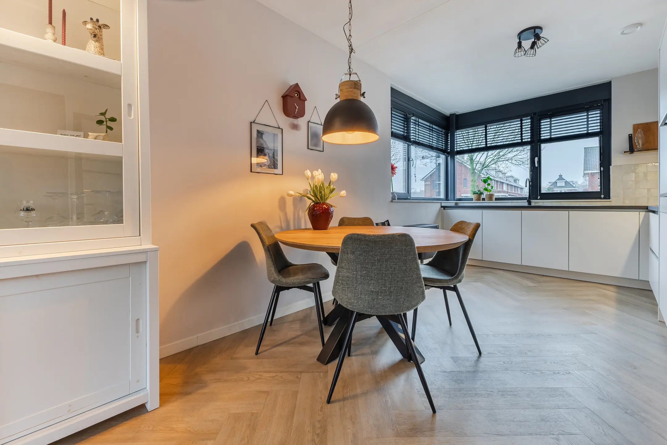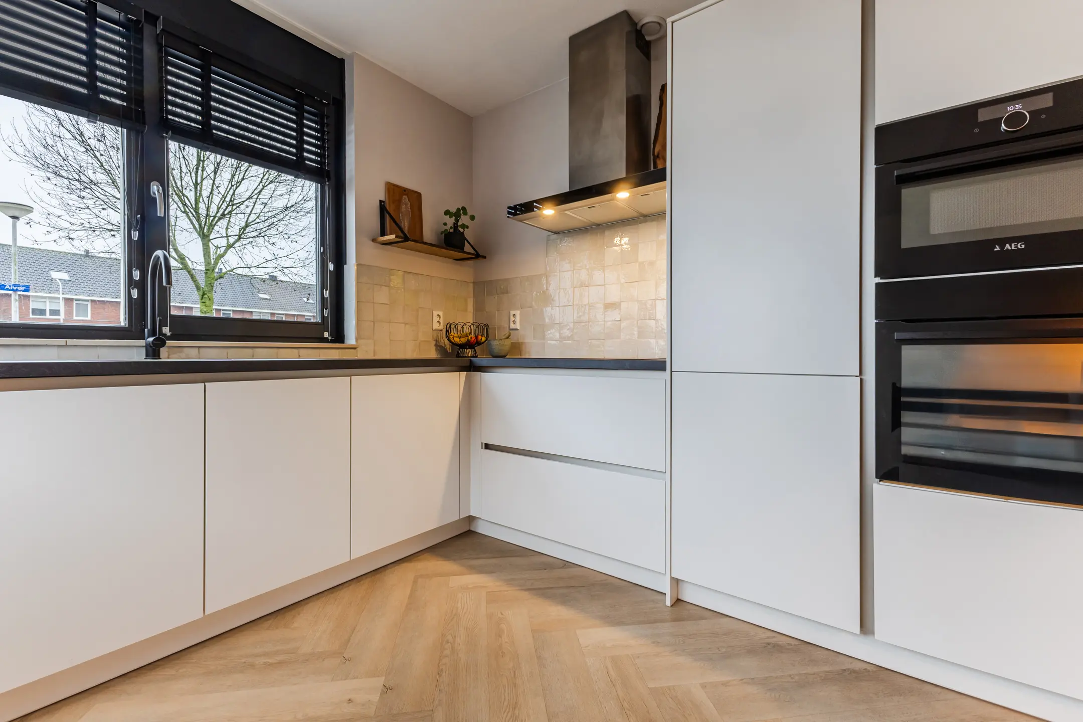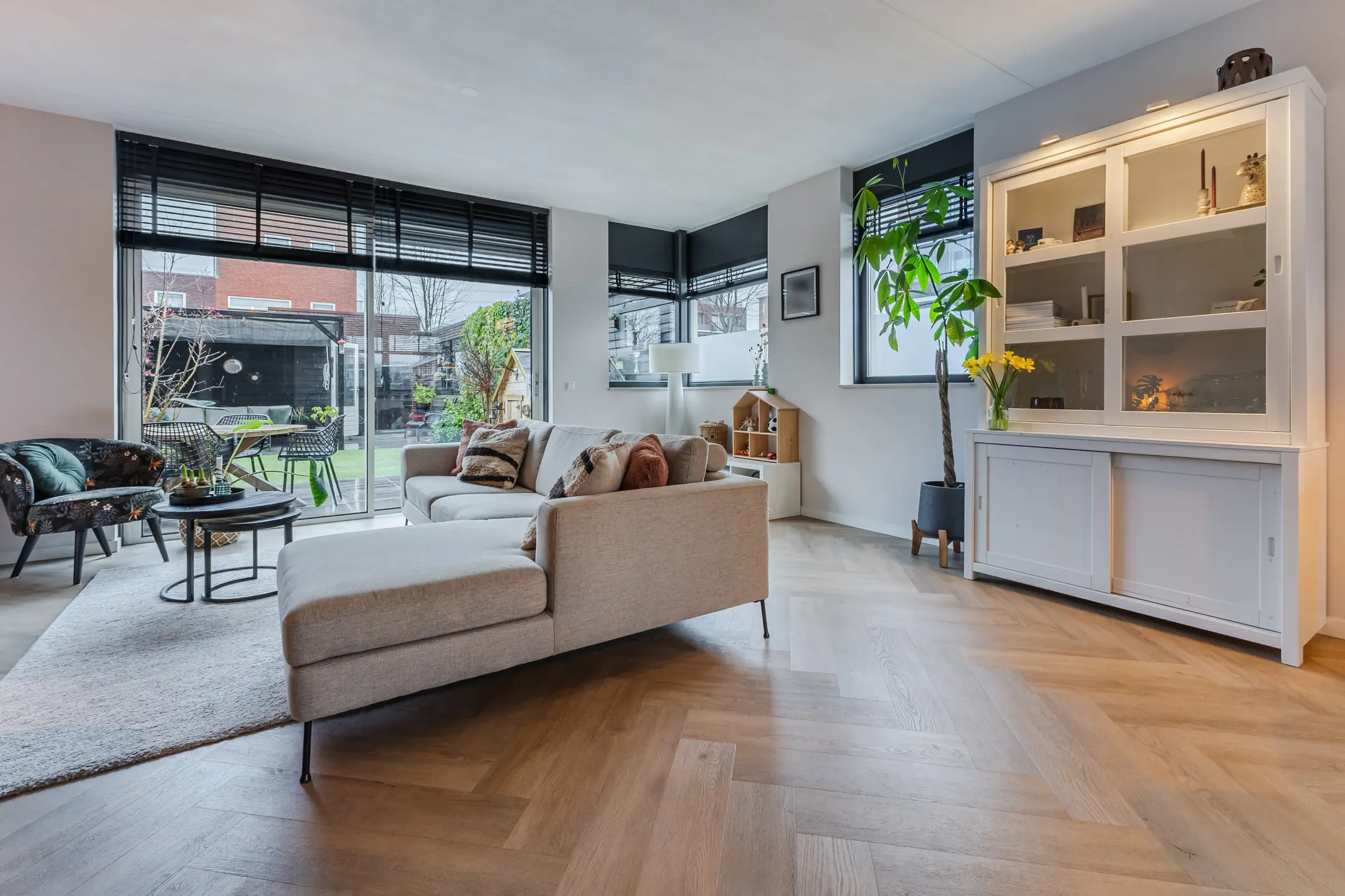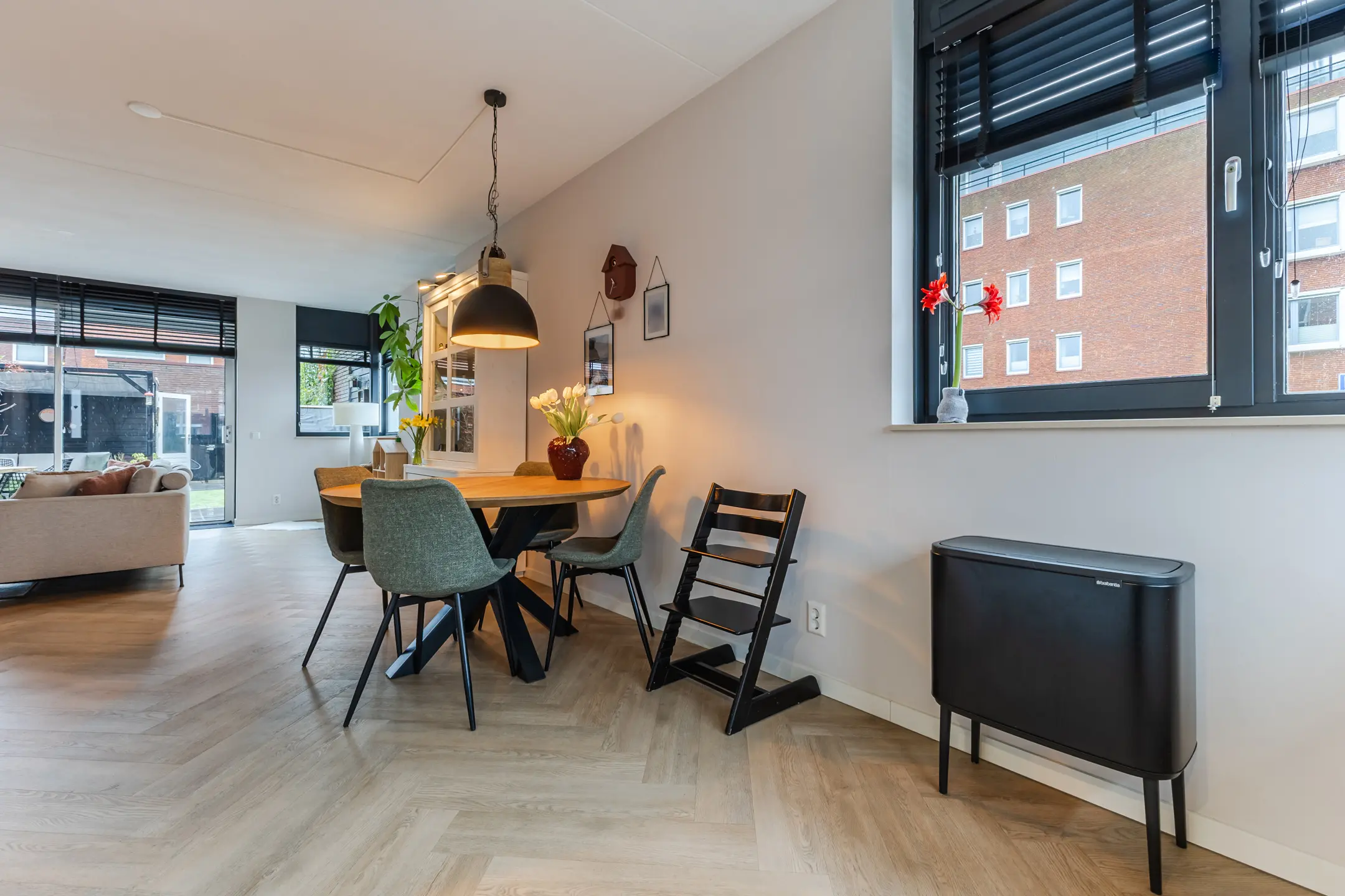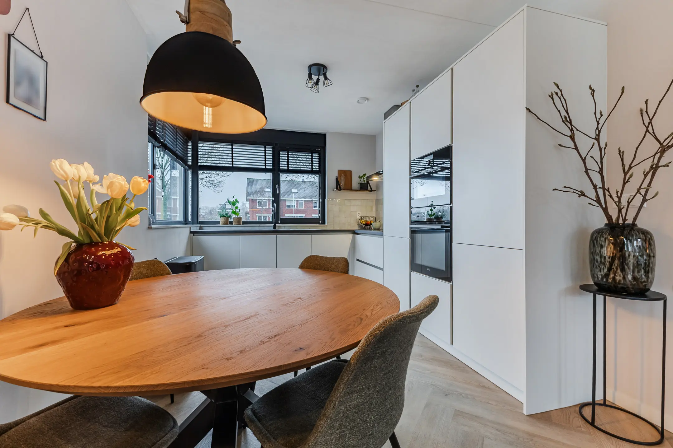 Binnen word je verwelkomd door een prettige, lichte leefruimte waar wonen en koken mooi in elkaar overlopen. De moderne keuken uit 2021 vormt het hart van het huis en is een fijne plek om samen te komen, te koken en lange avonden te tafelen. Grote ramen zorgen voor een aangename lichtinval en via de schuifpui in de woonkamer loopt binnen naadloos over in buiten. Op zonnige dagen zet je de deuren open en wordt de tuin vanzelf een verlengstuk van je leefruimte — perfect voor lange zomeravonden en gezellige momenten met familie en vrienden. Een grote plus zijn tevens de automatische, op zonne-energie werkende screens voor de keukenramen.