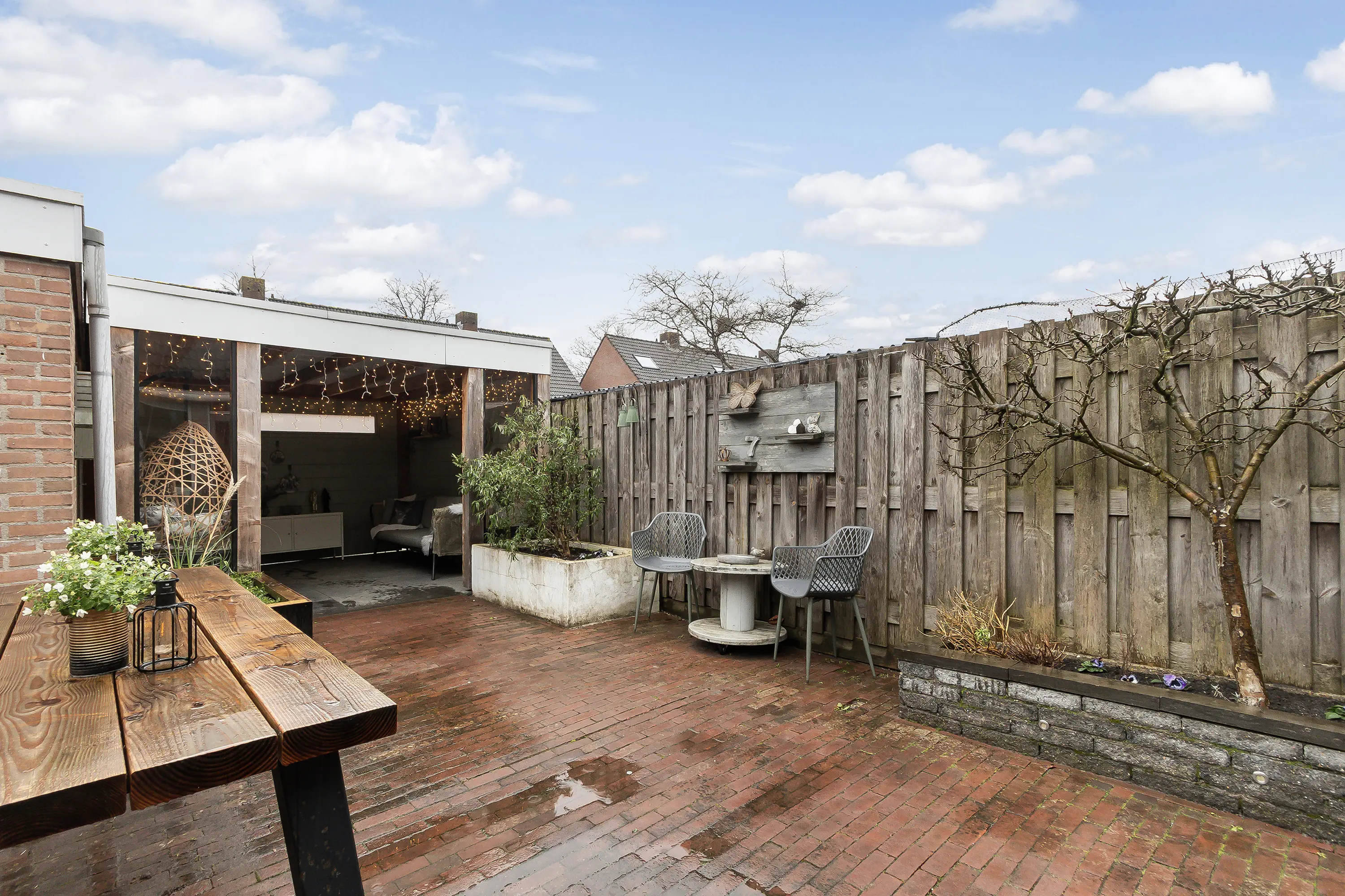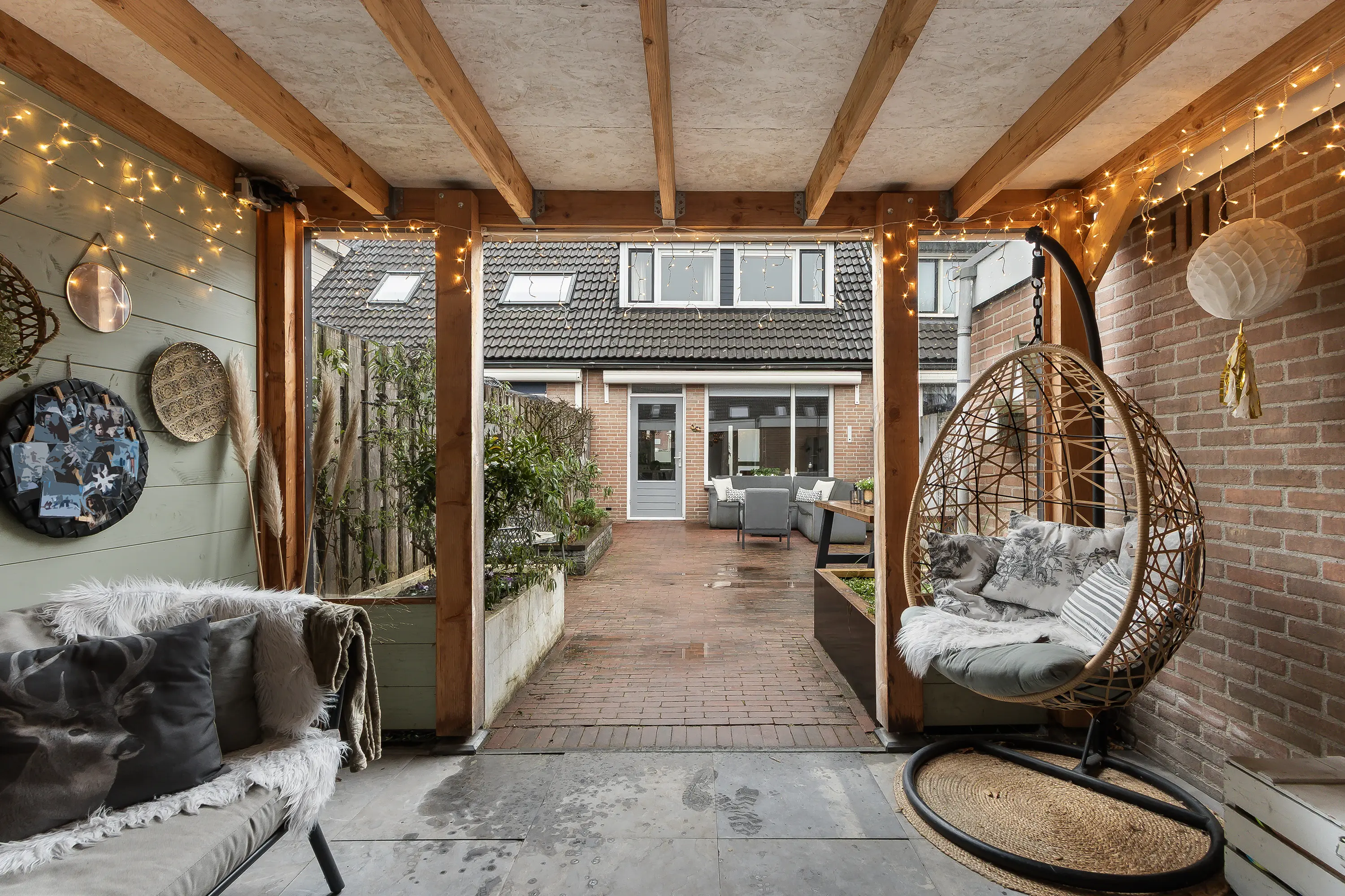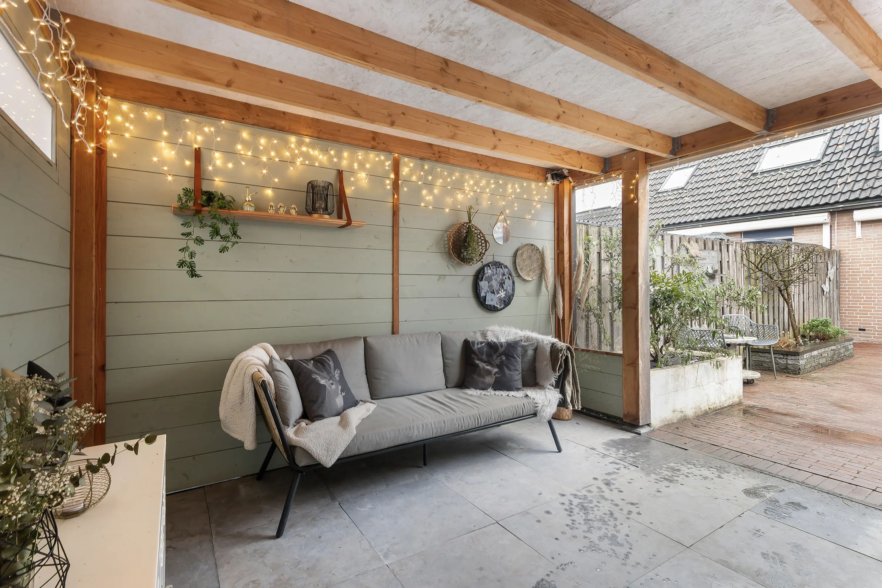 De verzorgde tuin vormt een waar verlengstuk van de woning. Onder de sfeervolle overkapping geniet je in alle rust van lange avonden buiten, ongeacht het seizoen. Of het nu gaat om een zomerse avond of een gezellige herfstdag, dit is een heerlijke plek om te ontspannen.