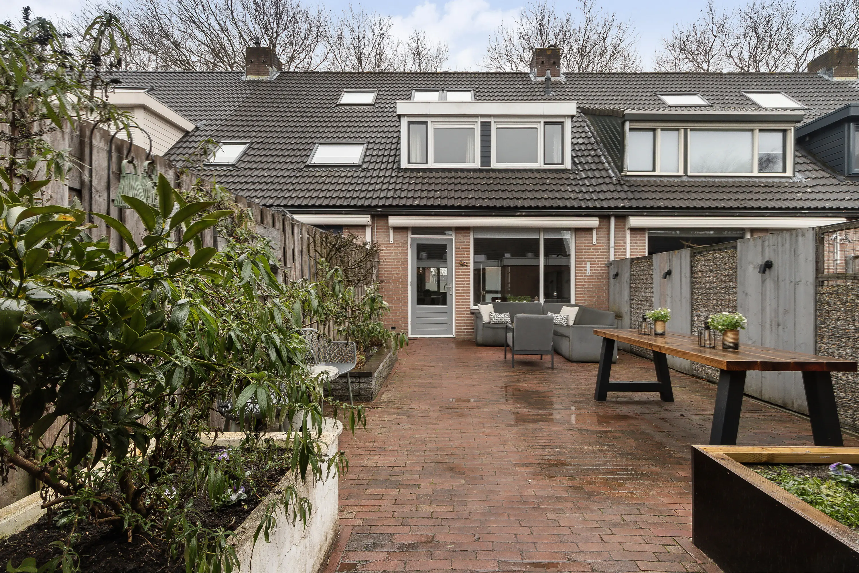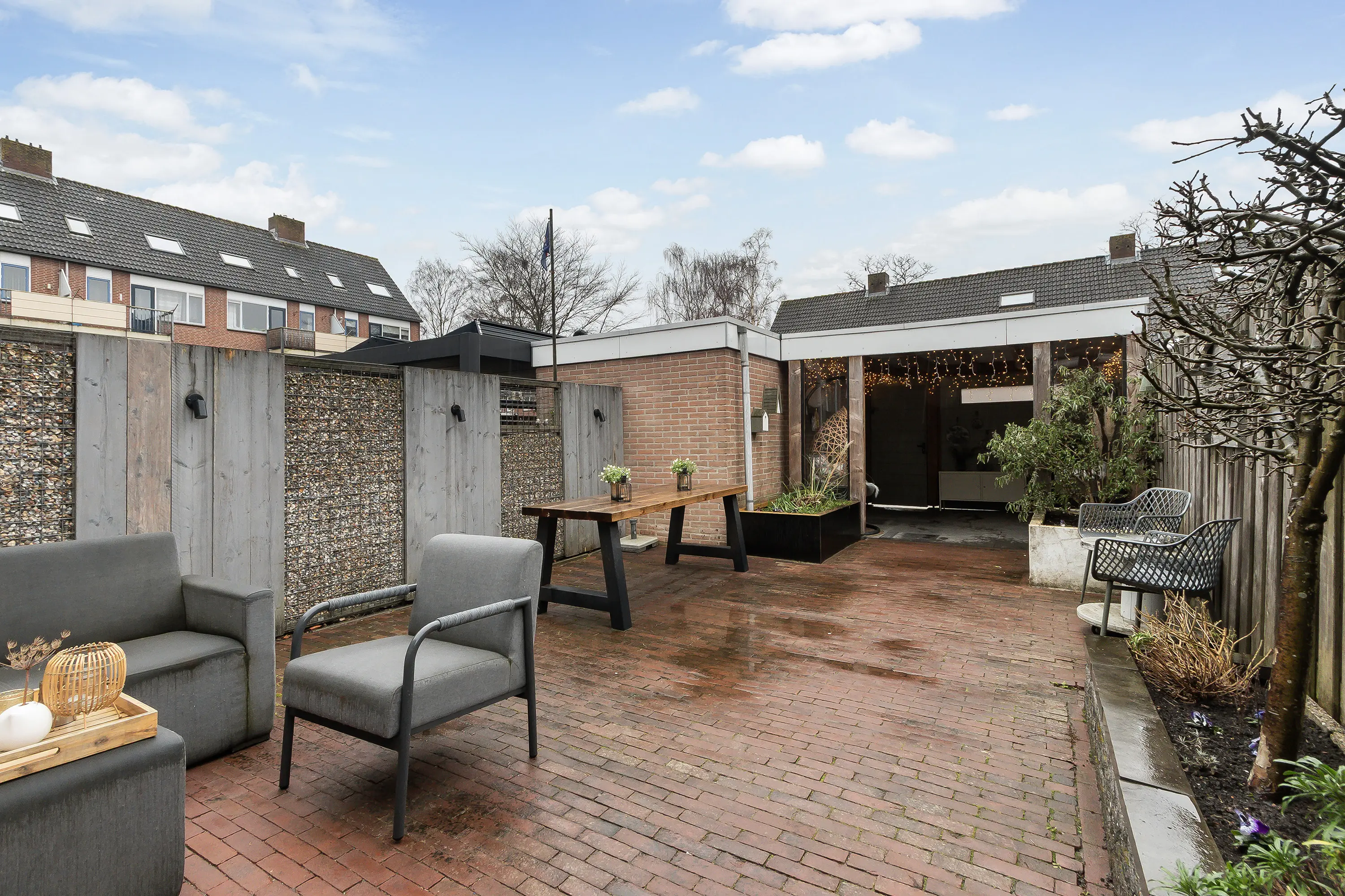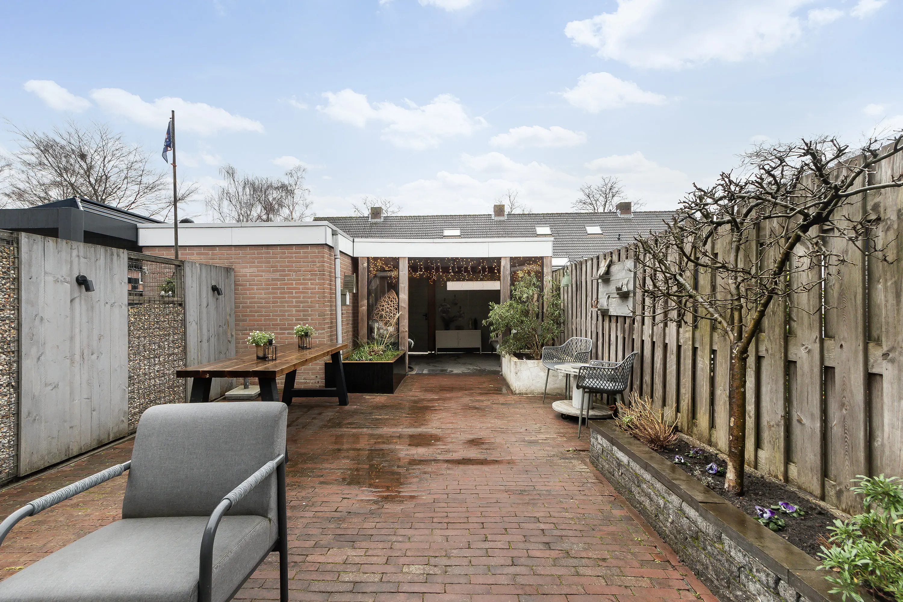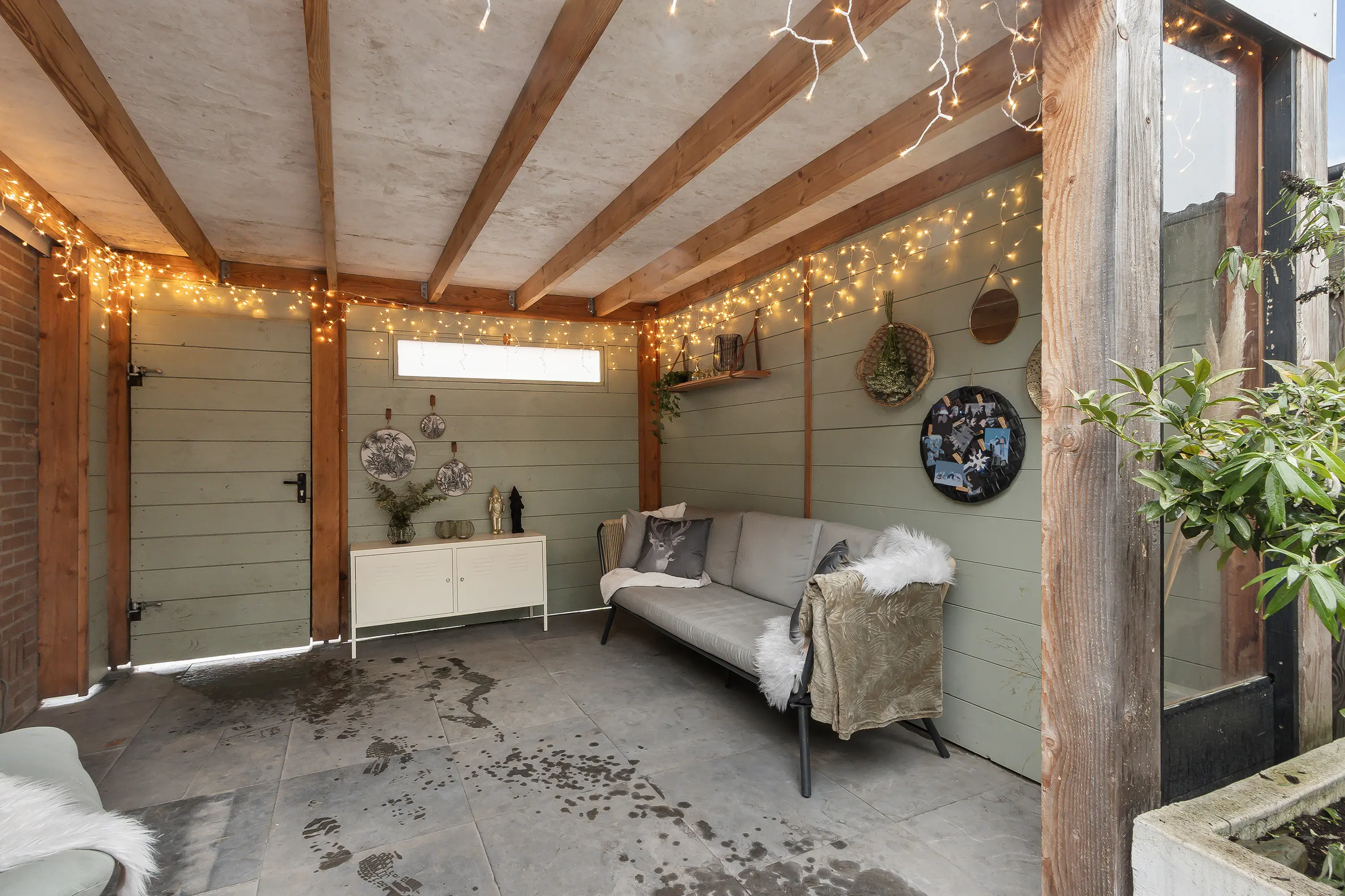 De verzorgde tuin vormt een waar verlengstuk van de woning. Onder de sfeervolle overkapping geniet je in alle rust van lange avonden buiten, ongeacht het seizoen. Of het nu gaat om een zomerse avond of een gezellige herfstdag, dit is een heerlijke plek om te ontspannen.
