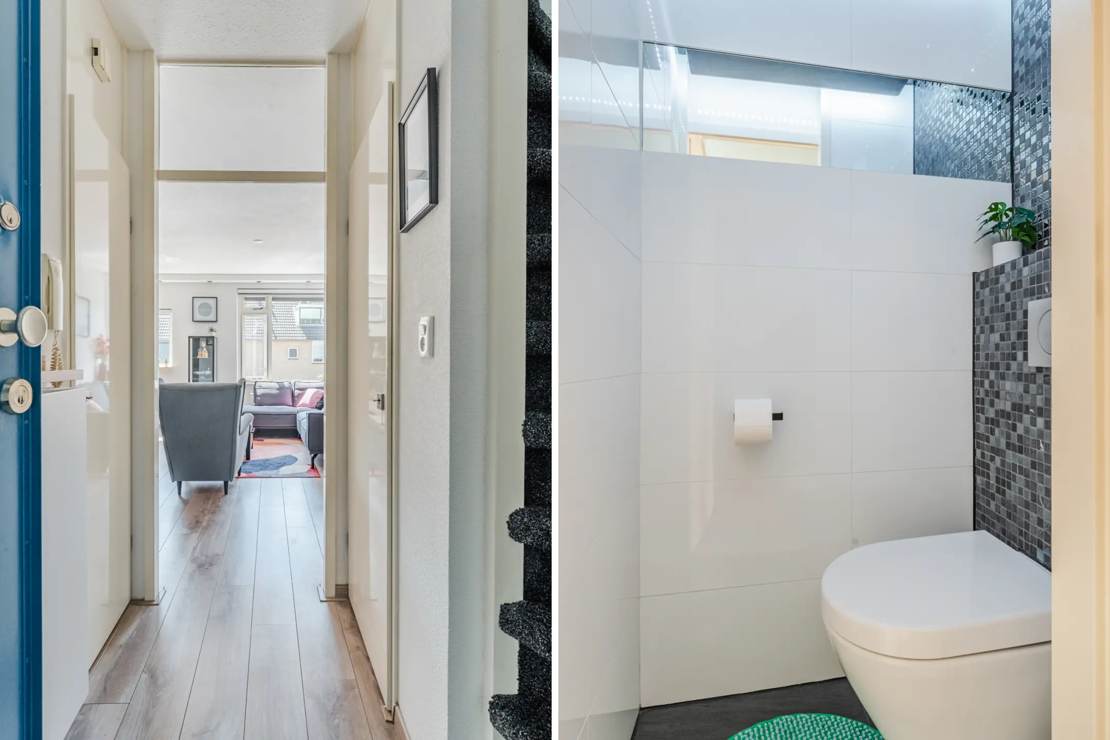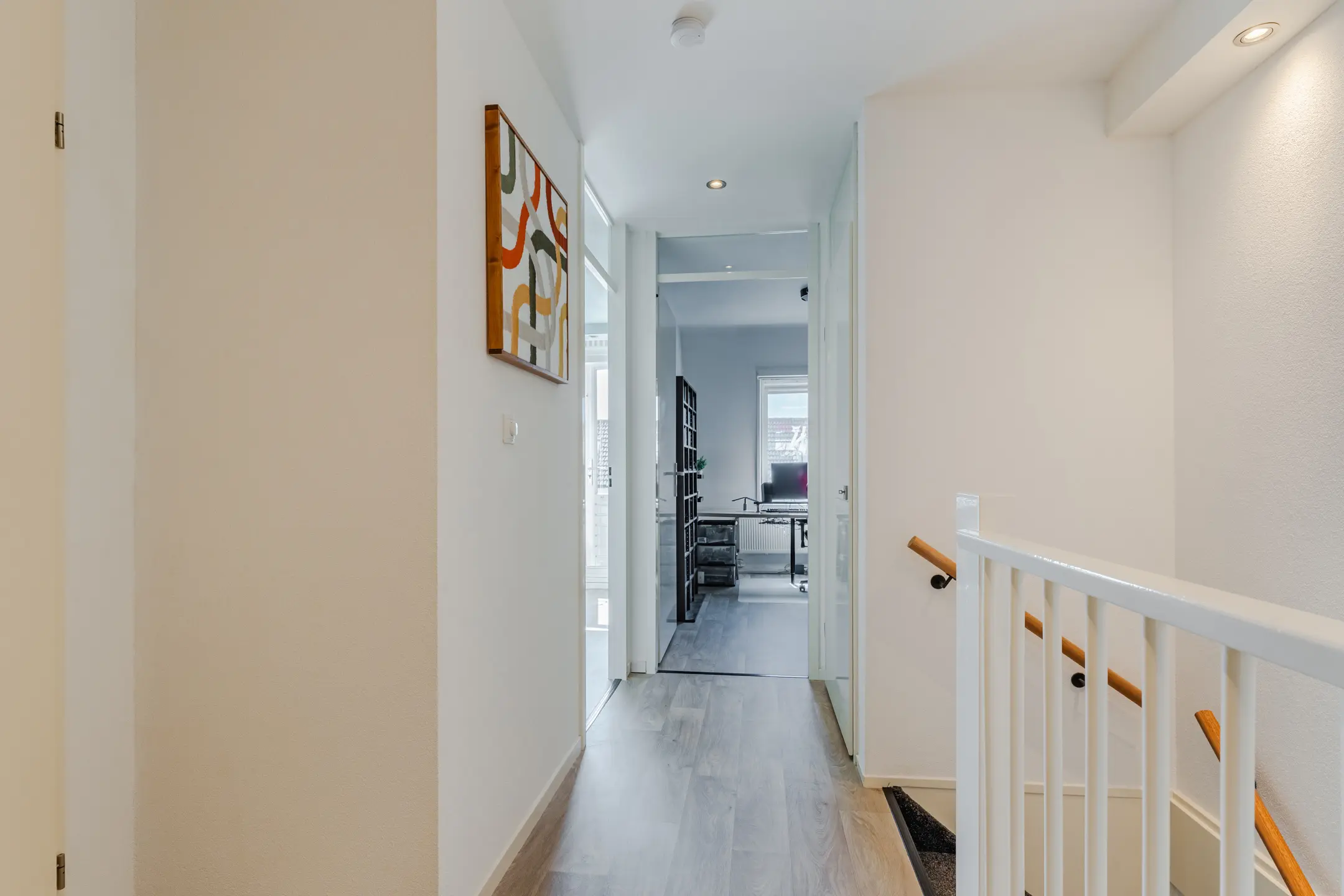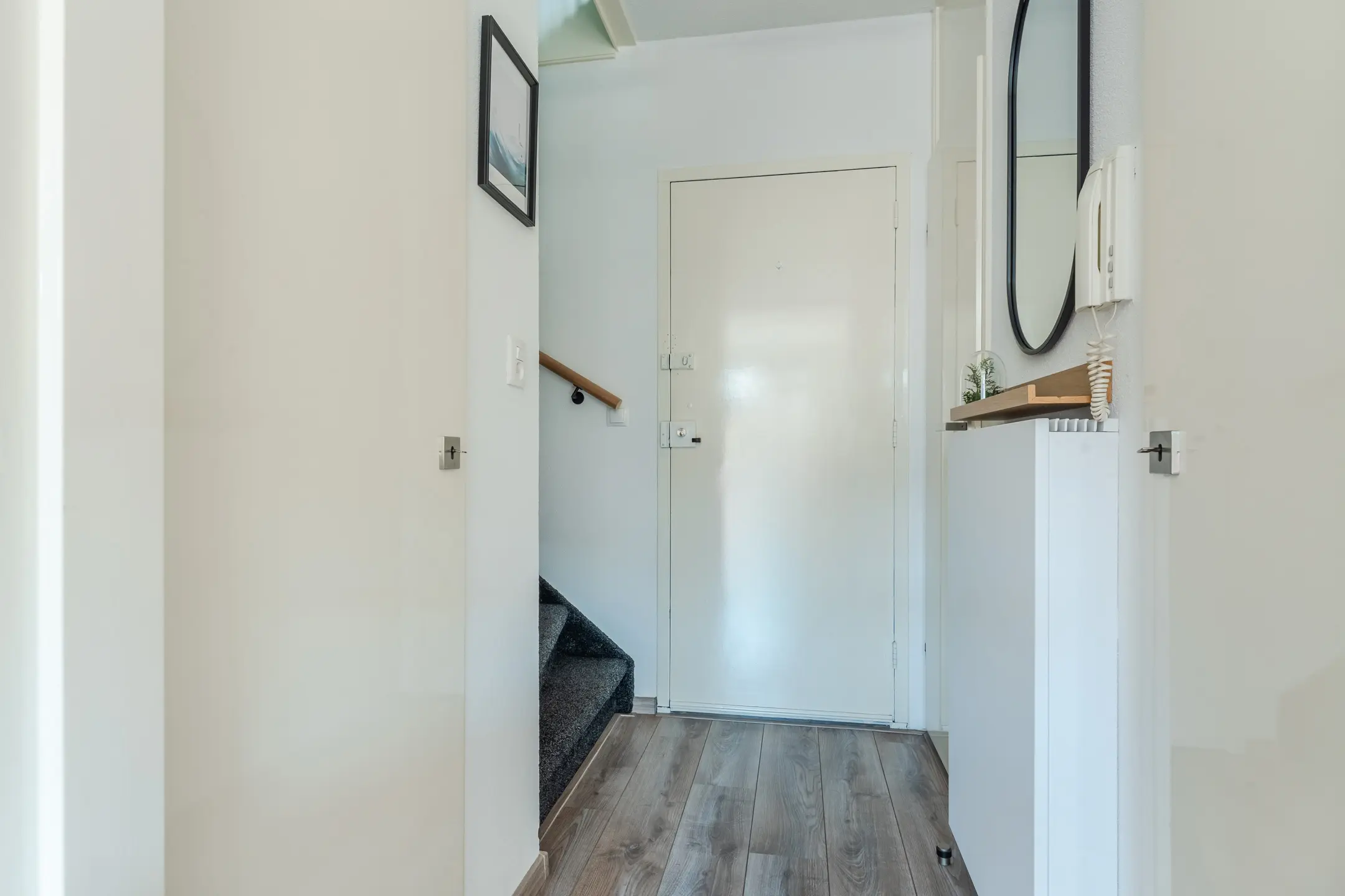 Entree met hal, waar zich de meterkast, een trapkast en het separate toilet bevinden. De trap leidt naar de volgende woonlaag. De sfeervolle en verrassend ruime woonkamer is heerlijk licht en voorzien van rolluiken. De halfopen keuken, uitgevoerd in een neutrale kleurstelling, is ingericht met een keukenblok in hoekopstelling en diverse inbouwapparatuur.