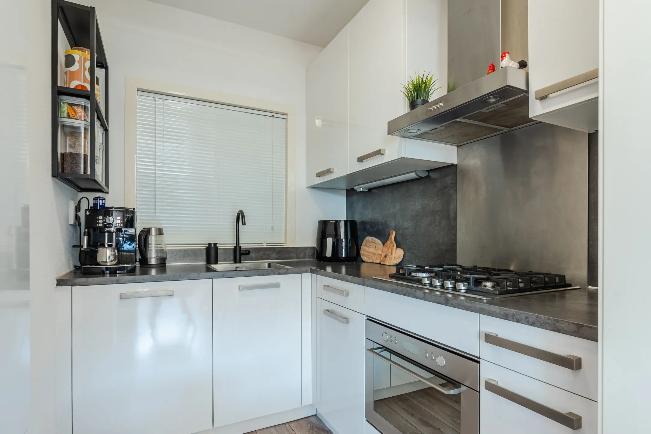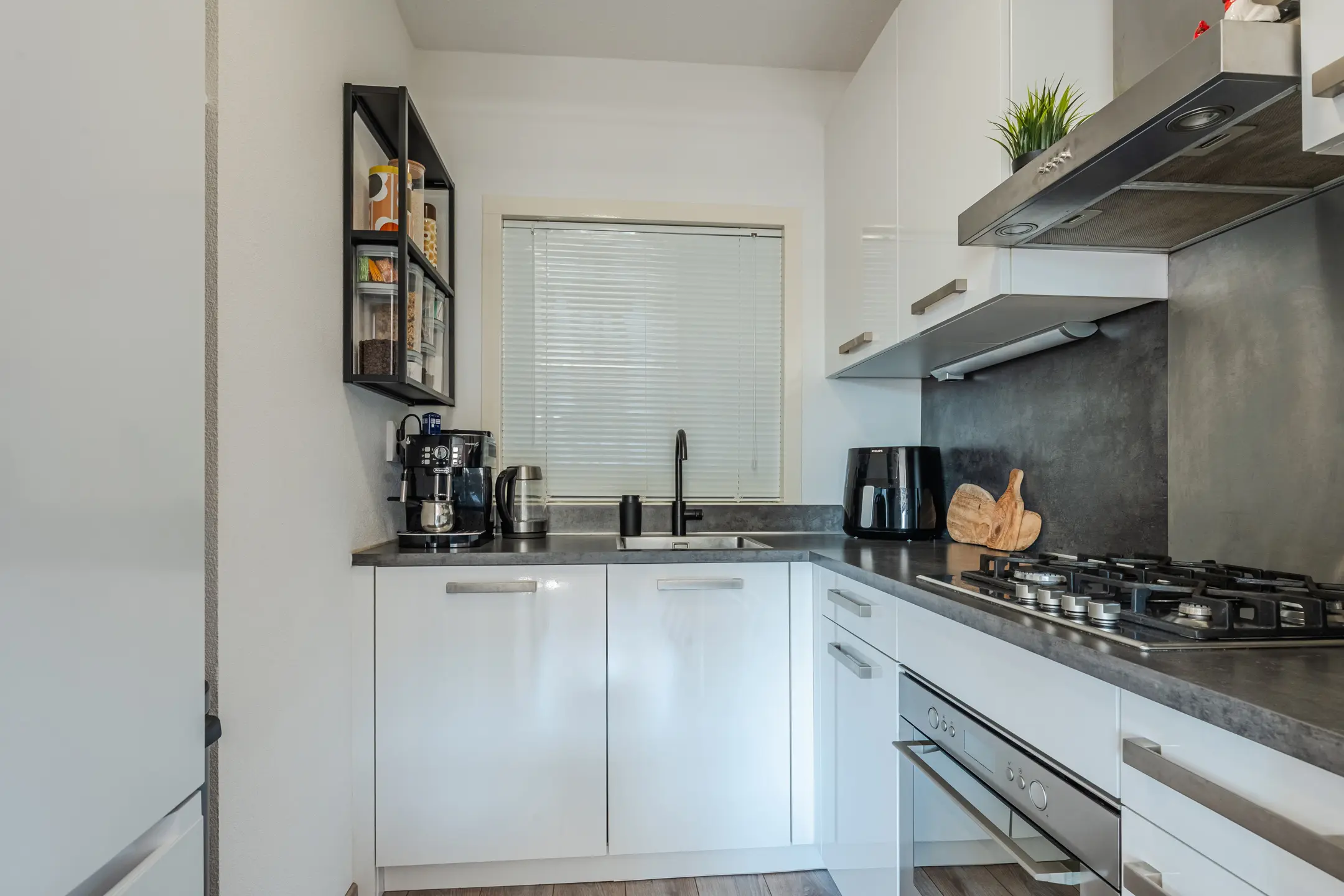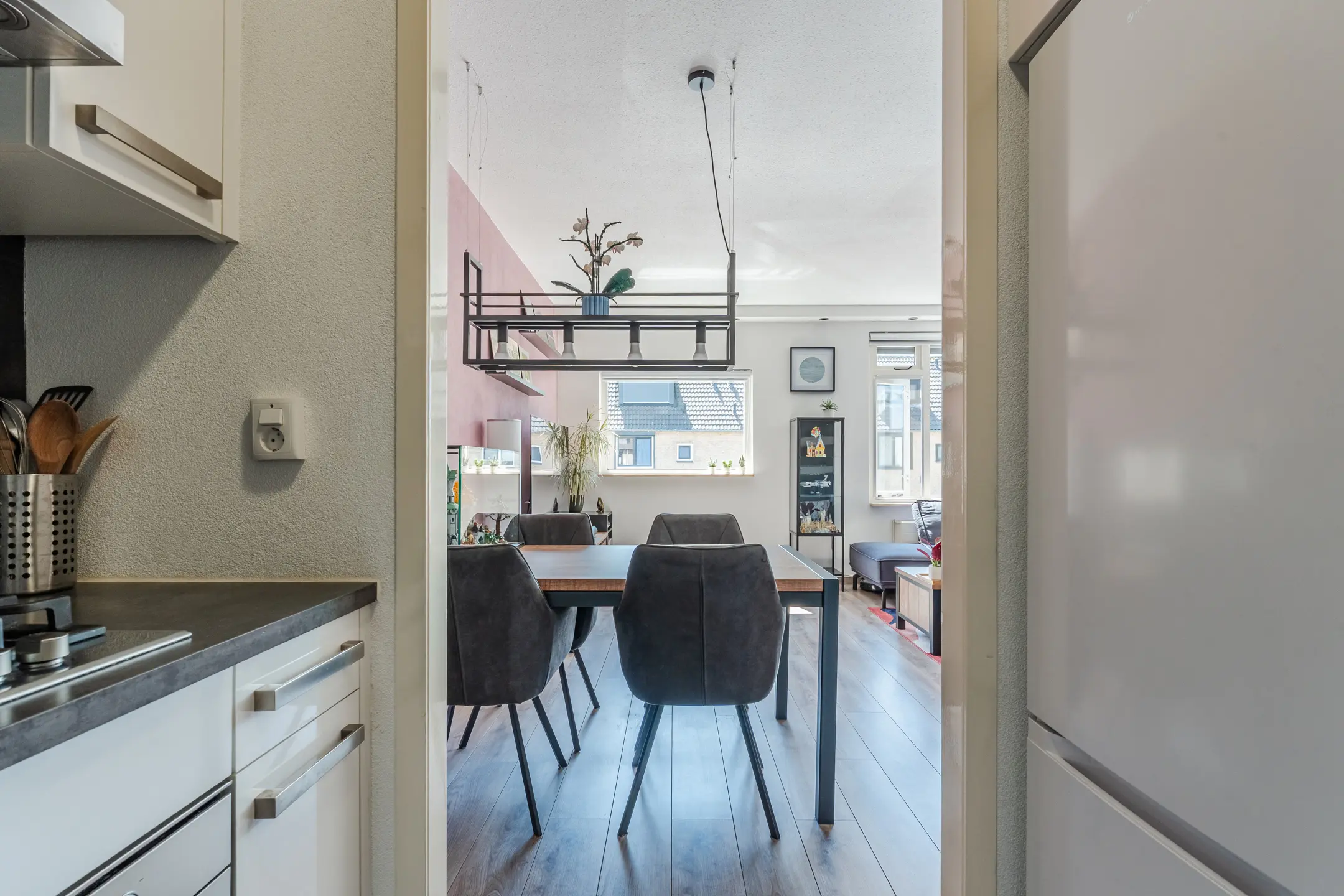 Entree met hal, waar zich de meterkast, een trapkast en het separate toilet bevinden. De trap leidt naar de volgende woonlaag. De sfeervolle en verrassend ruime woonkamer is heerlijk licht en voorzien van rolluiken. De halfopen keuken, uitgevoerd in een neutrale kleurstelling, is ingericht met een keukenblok in hoekopstelling en diverse inbouwapparatuur.