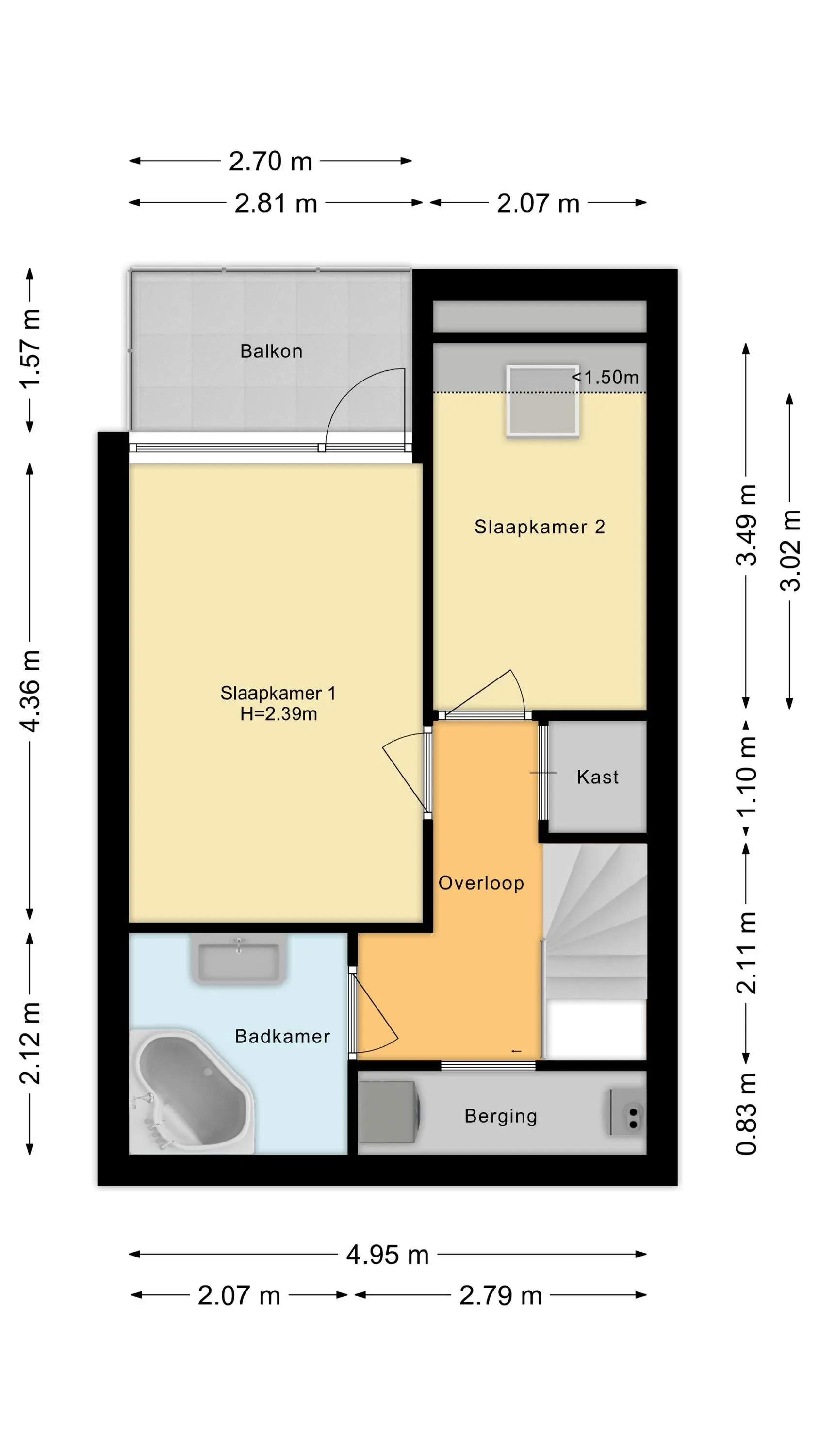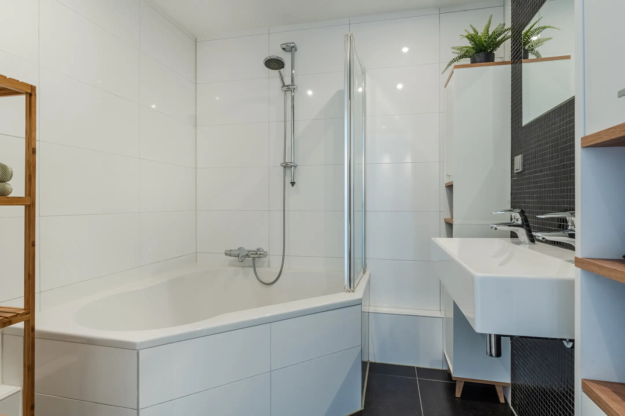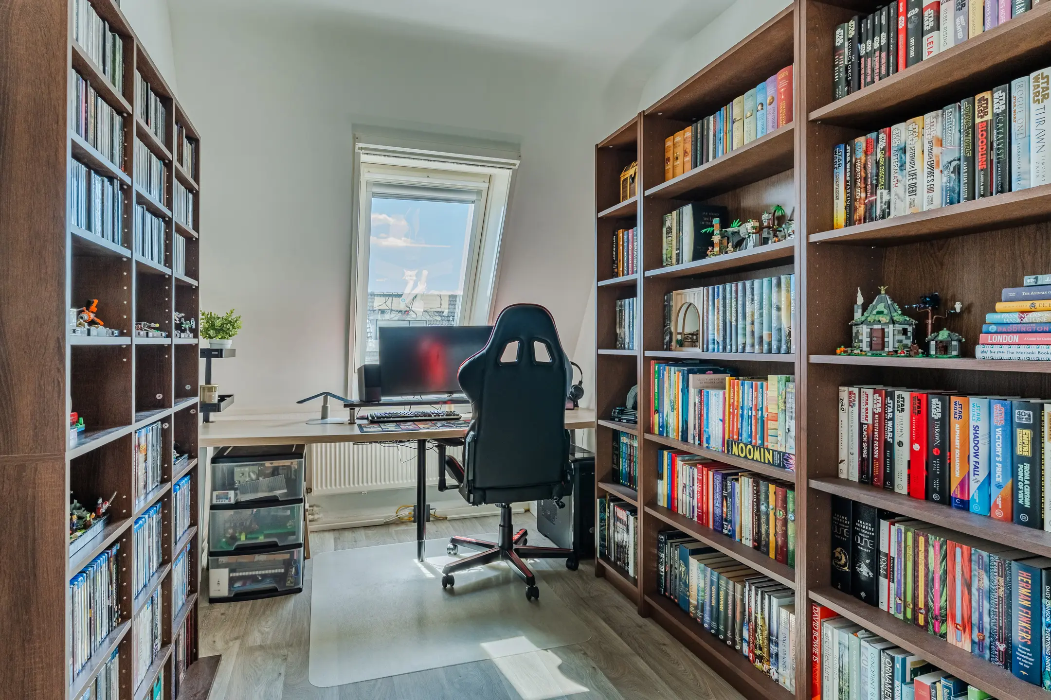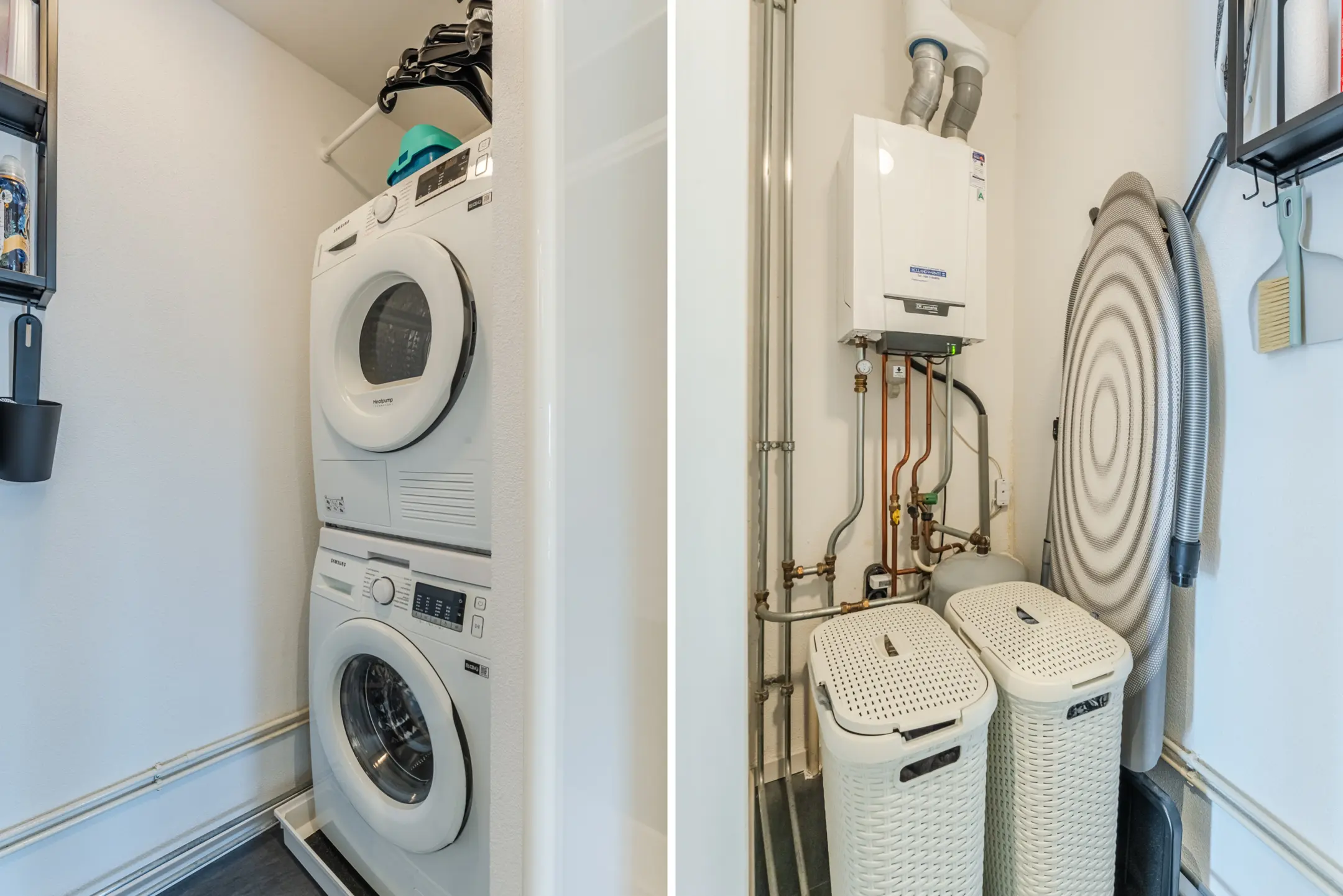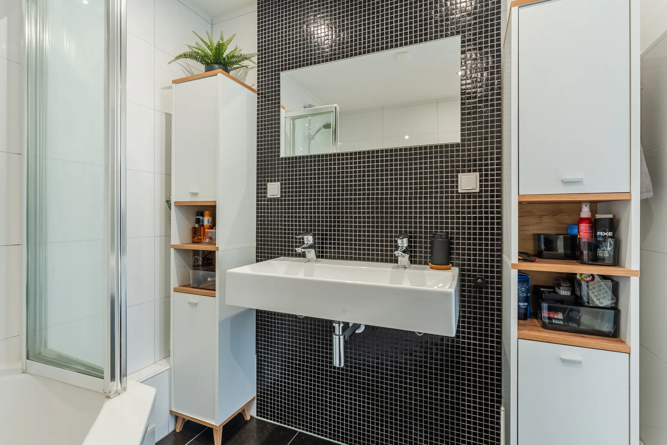 Via de overloop heb je toegang tot een praktische berging met witgoedaansluiting en de opstelling van de cv-installatie. De badkamer is uitgerust met een ligbad met douchefunctie, een wastafel/meubel. De hoofdslaapkamer biedt toegang tot het zonnige balkon en is voorzien van een rolluik. De tweede slaapkamer heeft een groot dakraam en is ideaal als logeerkamer, kinderkamer of thuiskantoor. Op de overloop bevindt zich bovendien een vaste kast voor extra opbergruimte.