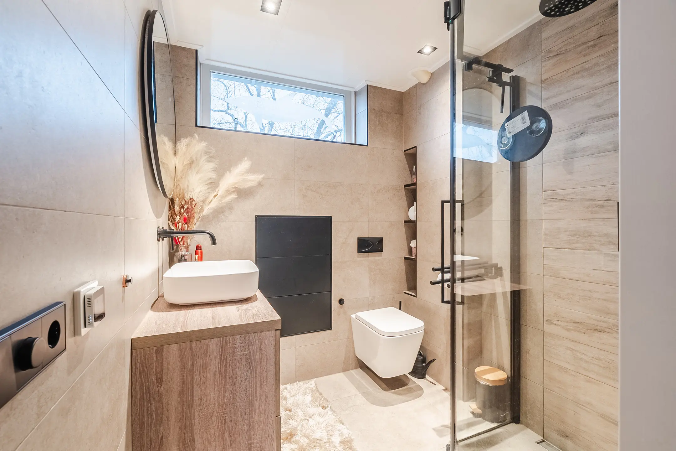 Badkamer met vloerverwarming: De badkamer op de eerste verdieping is voorzien van elektrische vloerverwarming, een inloopdouche, een tweede toilet en een wastafel met meubel.