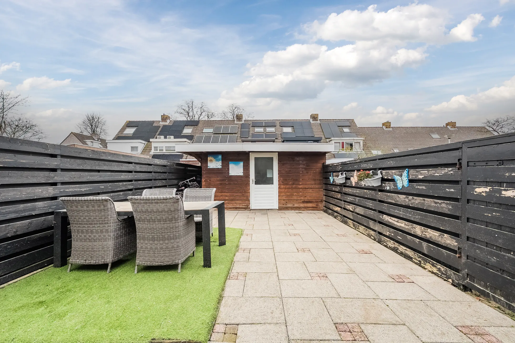 Praktische tuin: De achtertuin heeft een grote berging voor extra opslagruimte. Aan de gevel bevindt zich een zonnescherm, ideaal voor de zonnige dagen.