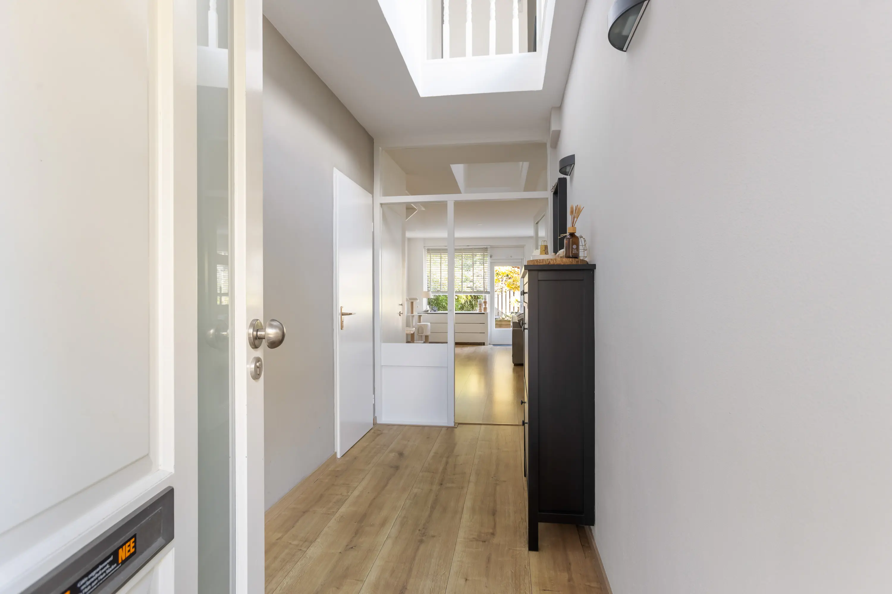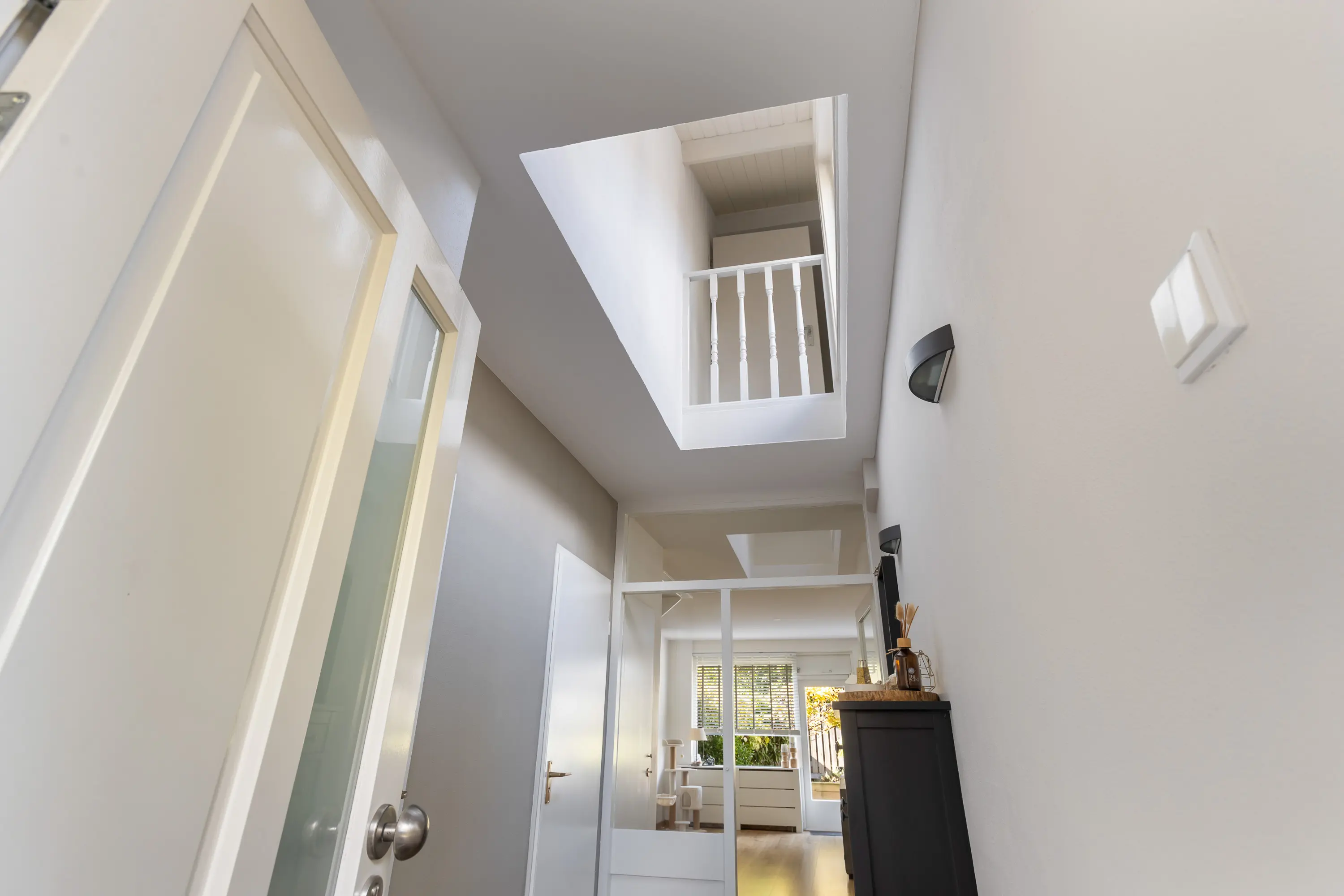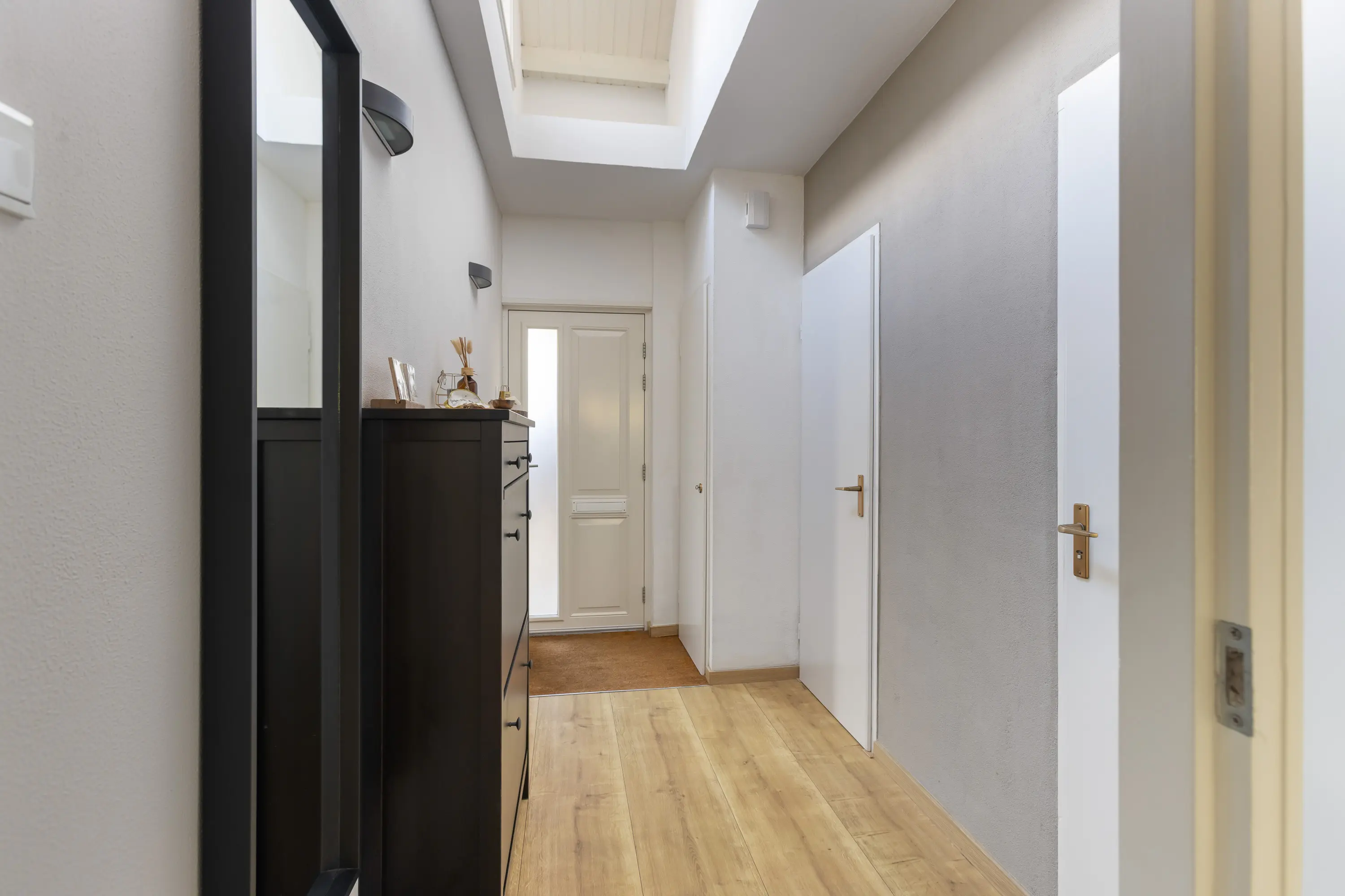 Bij binnenkomst valt meteen de mooie hoogte van de hal op, die doorloopt tot de eerste verdieping en zorgt voor een heerlijk lichte en open sfeer. Vanuit de hal heb je toegang tot de wasruimte en een praktische berging voor fietsen, met daarboven een handige vliering, beide ook vanaf de buitenzijde bereikbaar. Een separaat toilet met fonteintje en de meterkast.