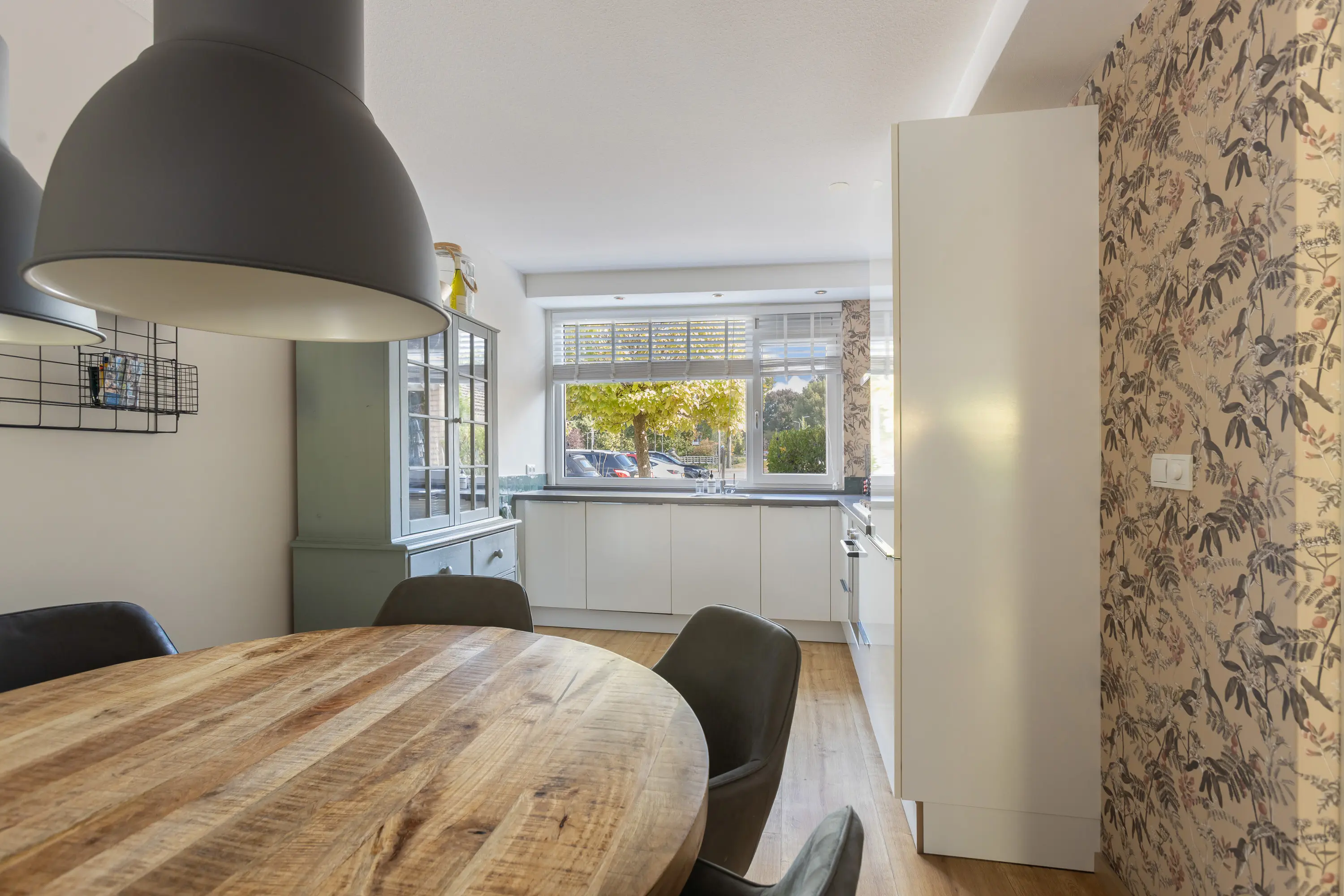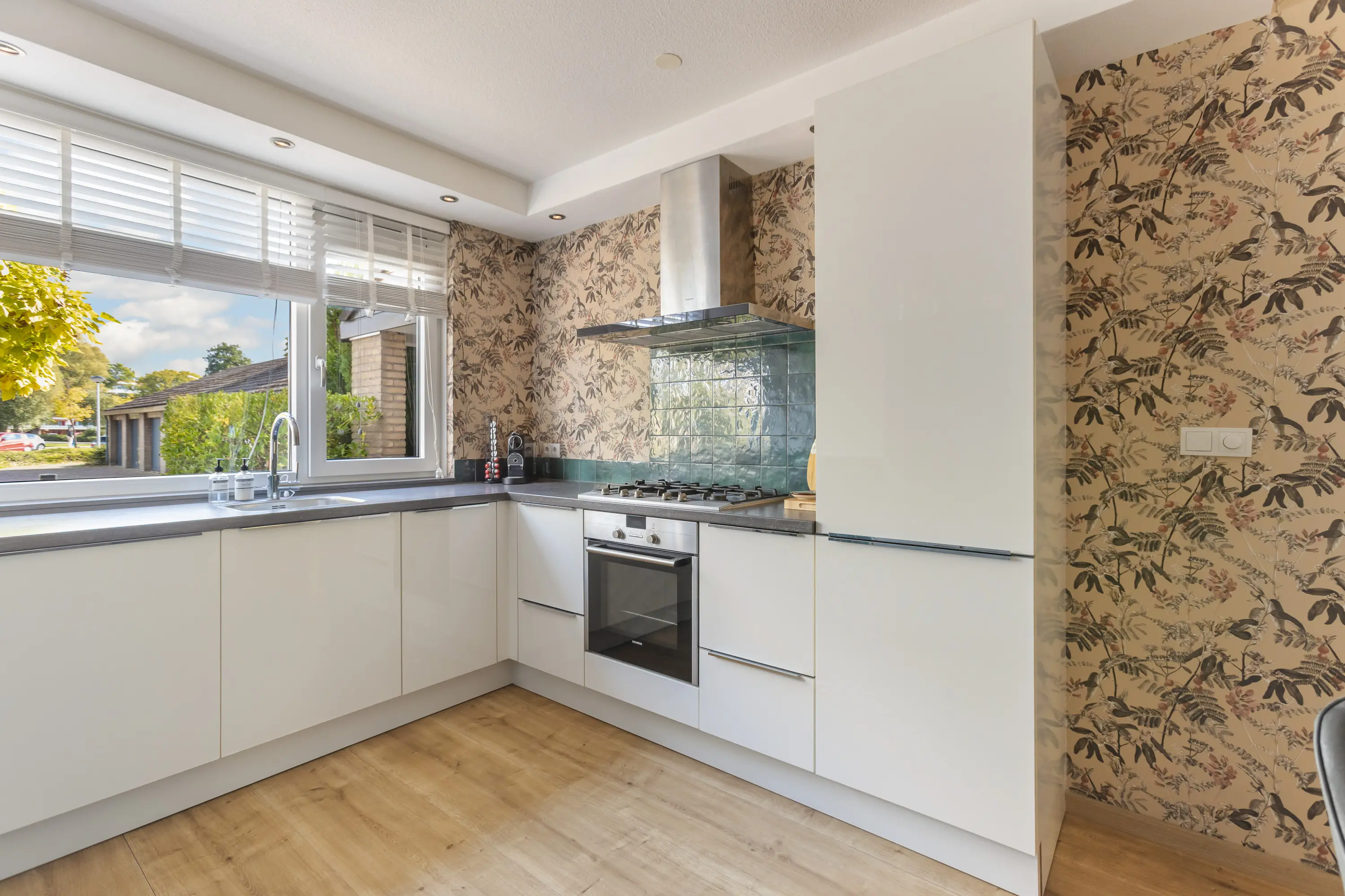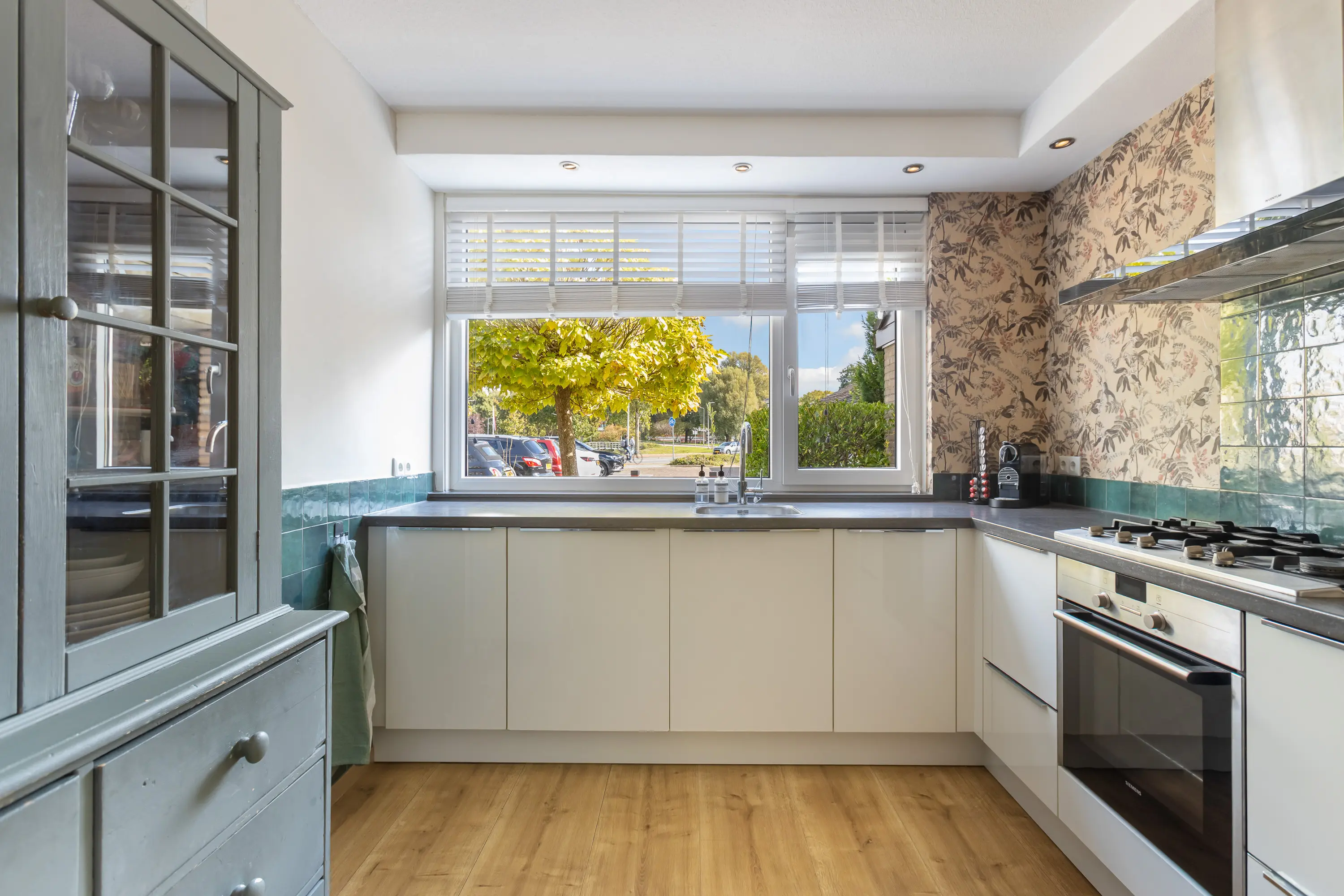 De woonkamer is ruim, licht en sfeervol, met een gezellige open haard die een warm accent geeft. De open keuken in hoekopstelling is uitgerust met diverse inbouwapparatuur en biedt volop ruimte om te koken en samen te eten. Vanuit de woonkamer leidt de loopdeur direct naar de achtertuin.