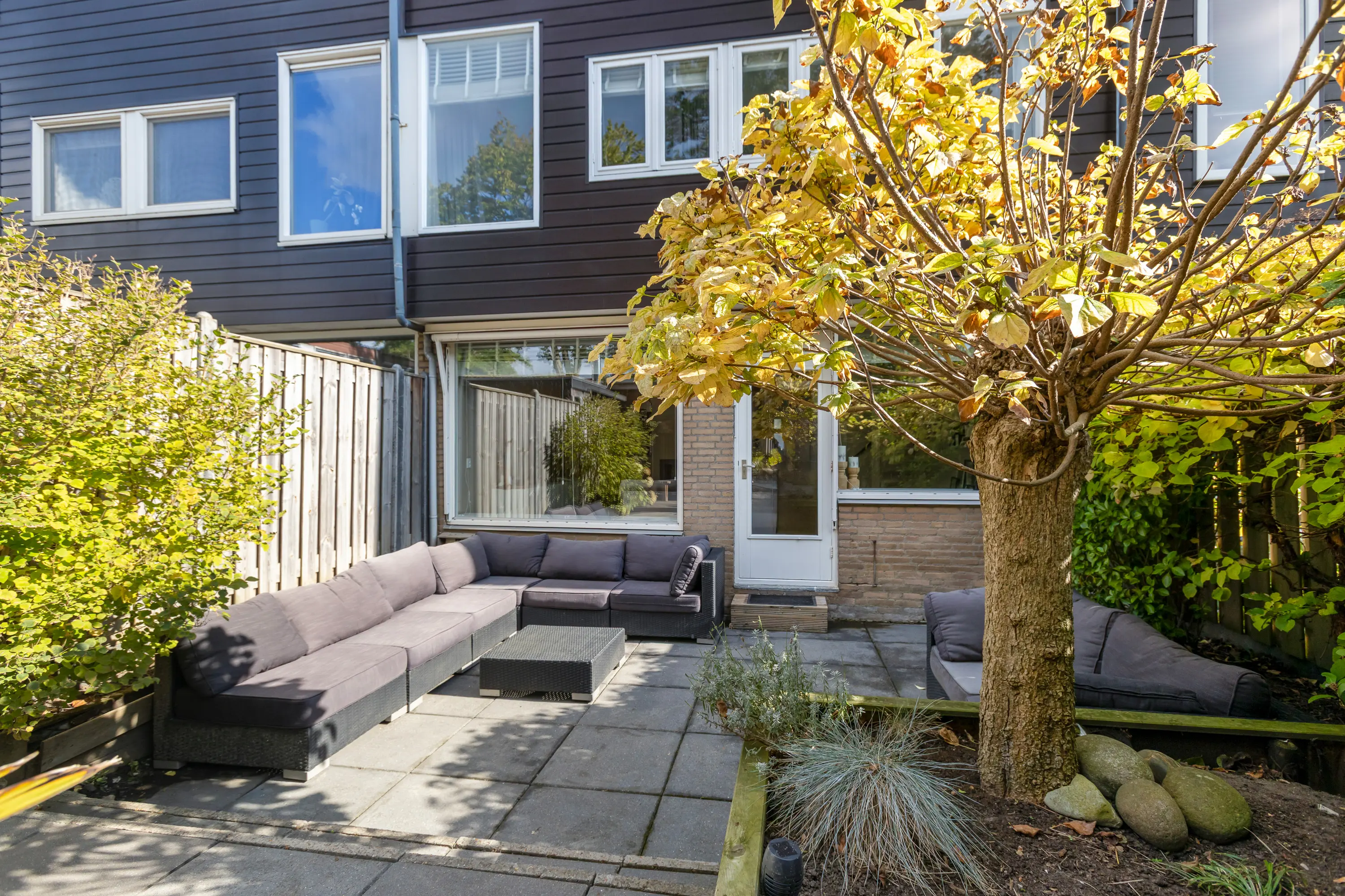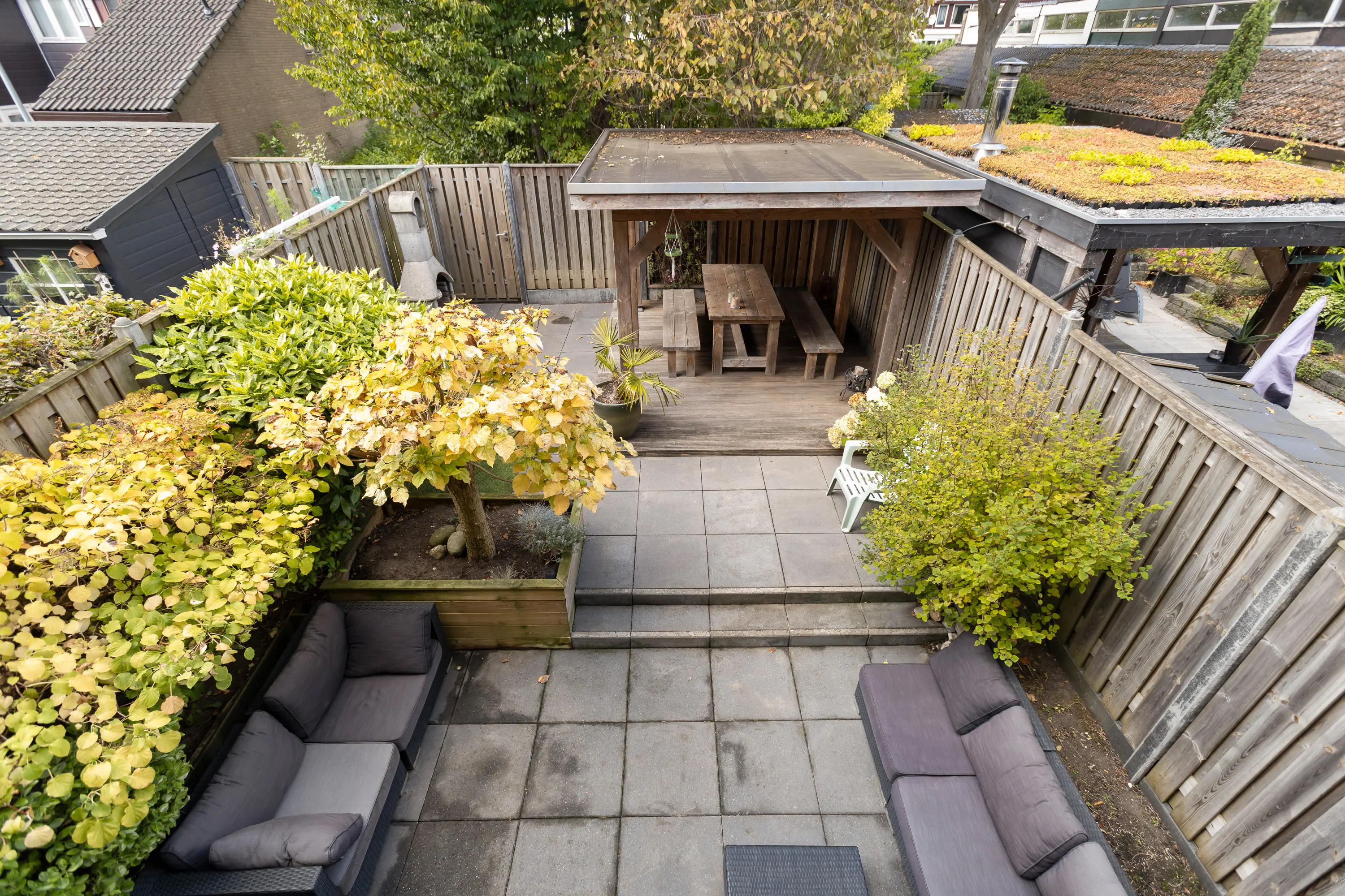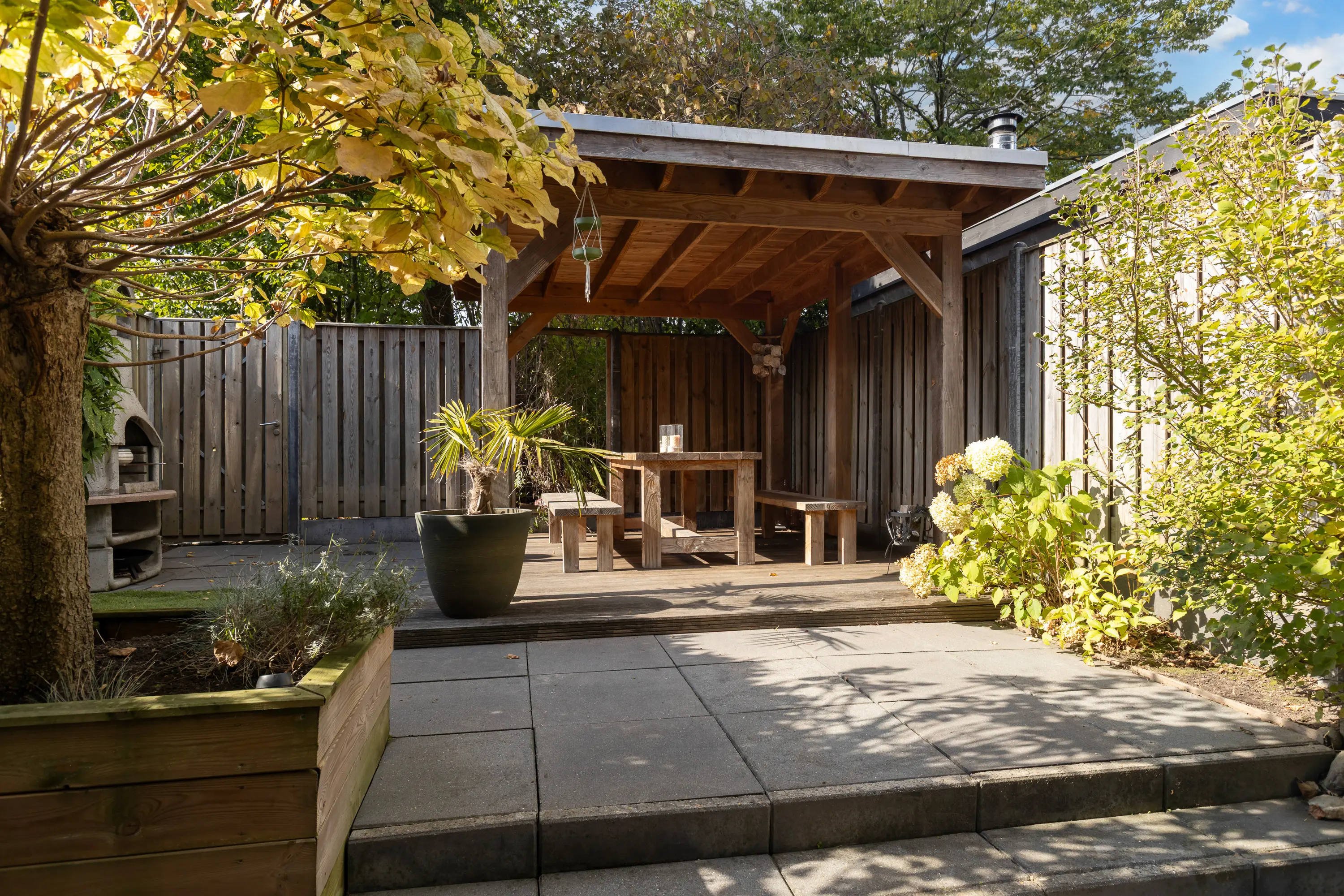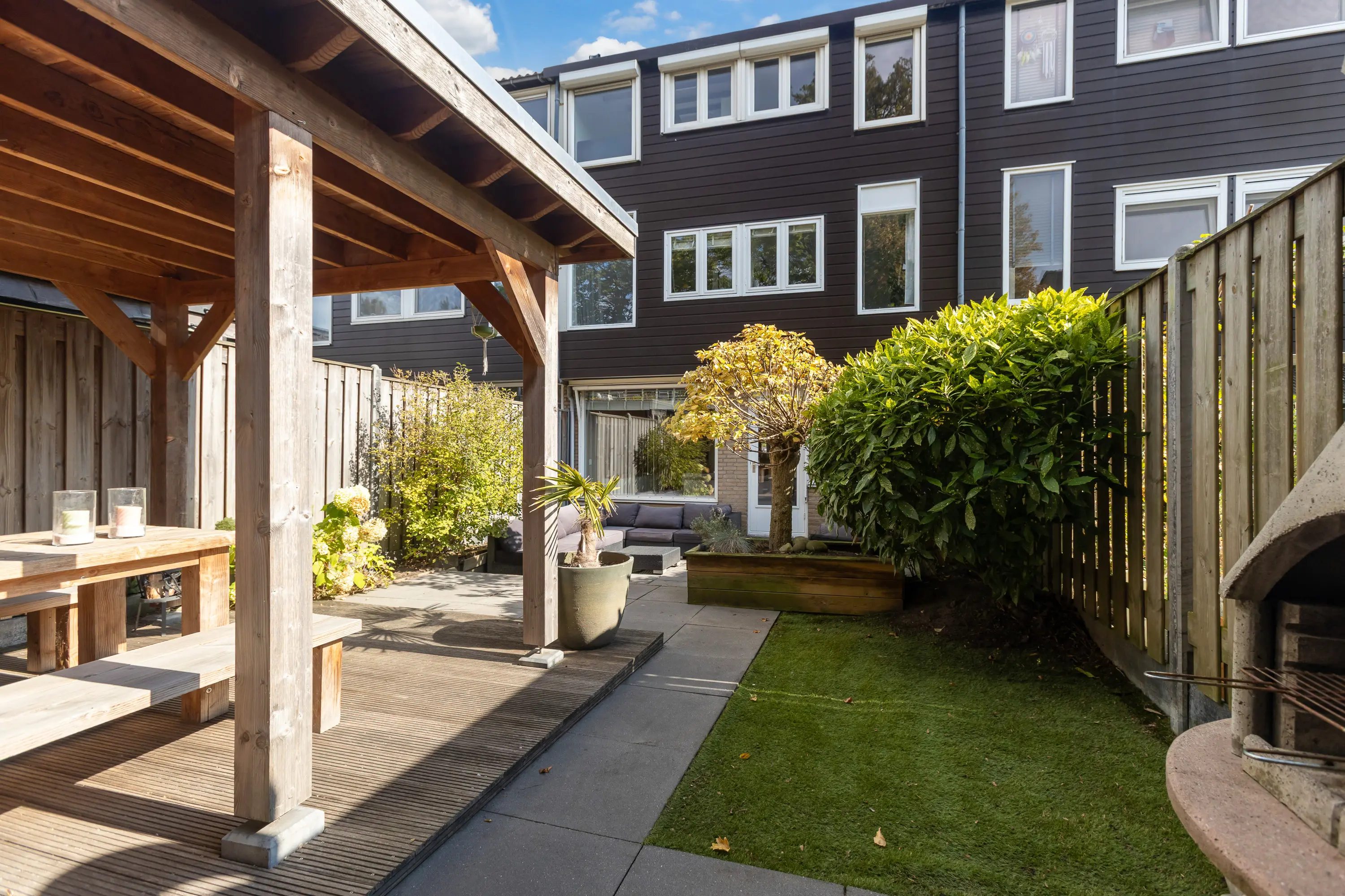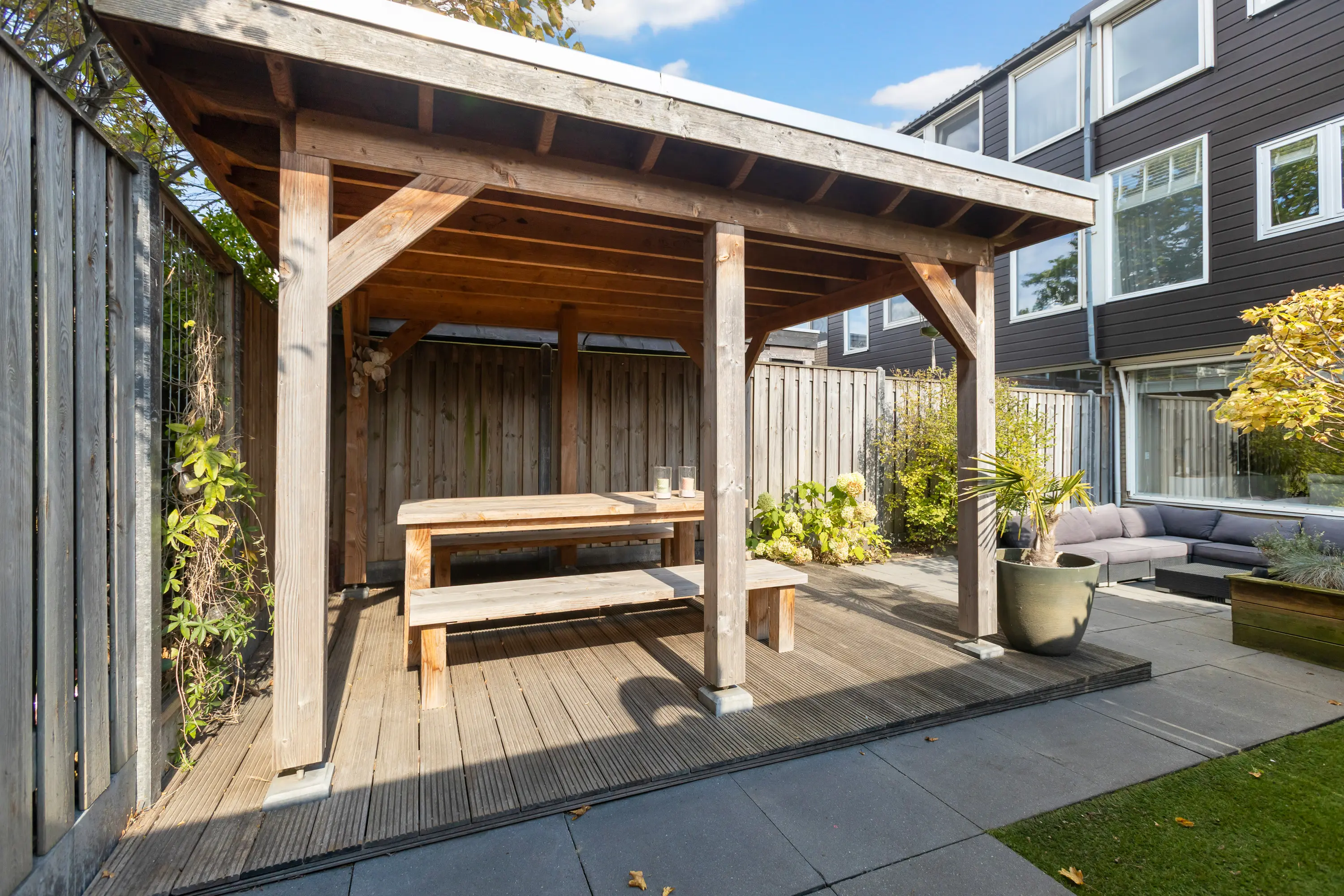 - Achtertuin met loungeoverkapping, op het westen;
