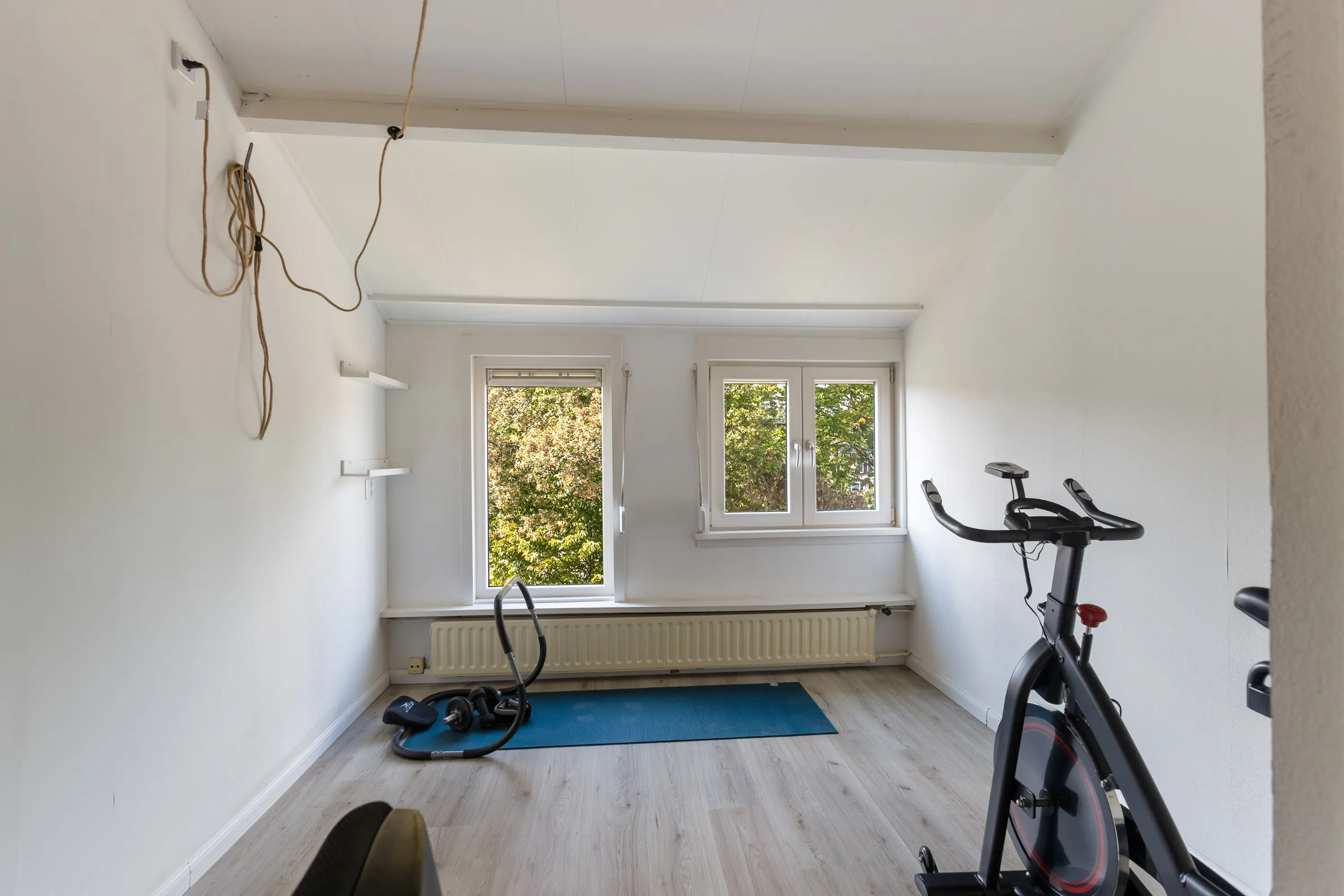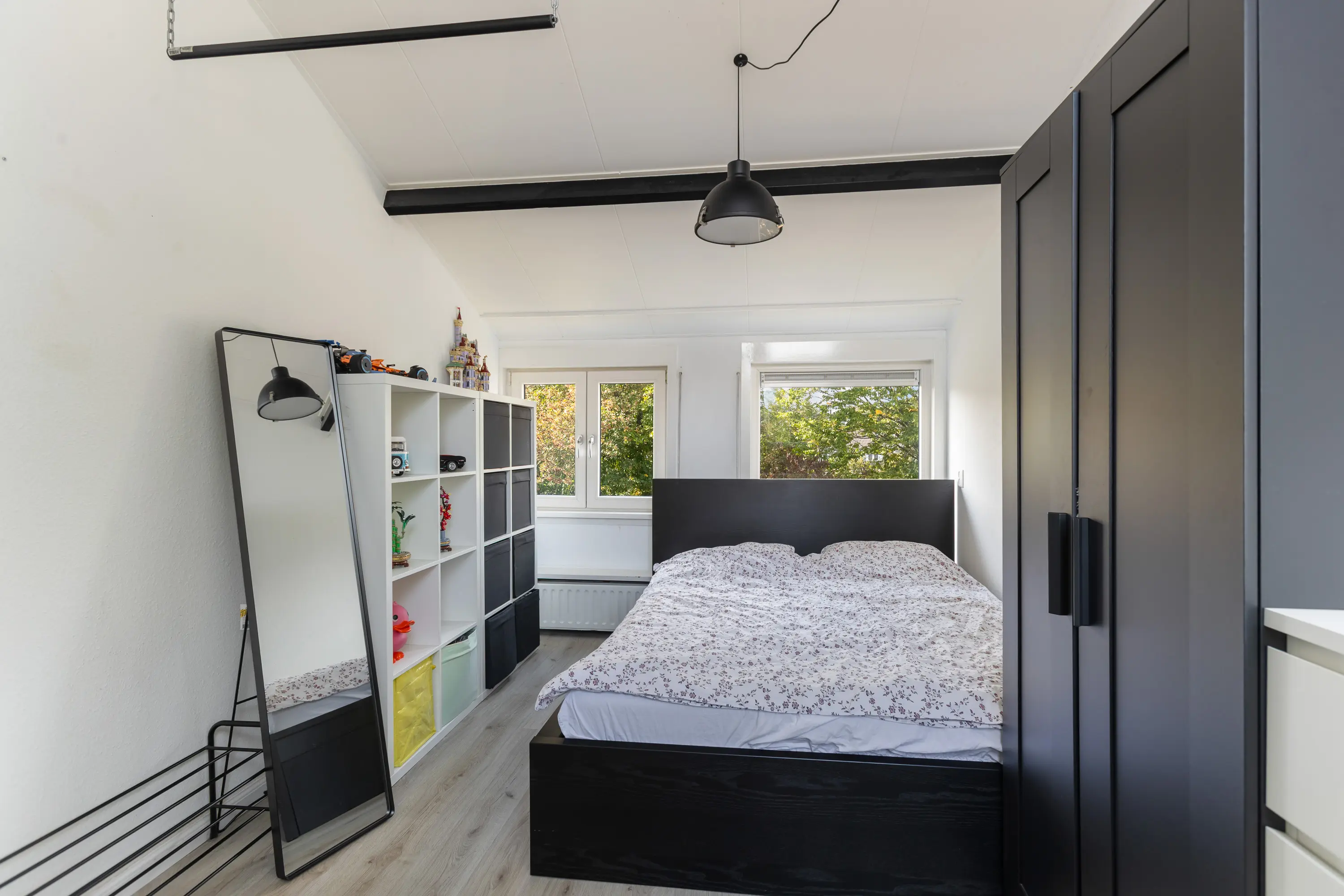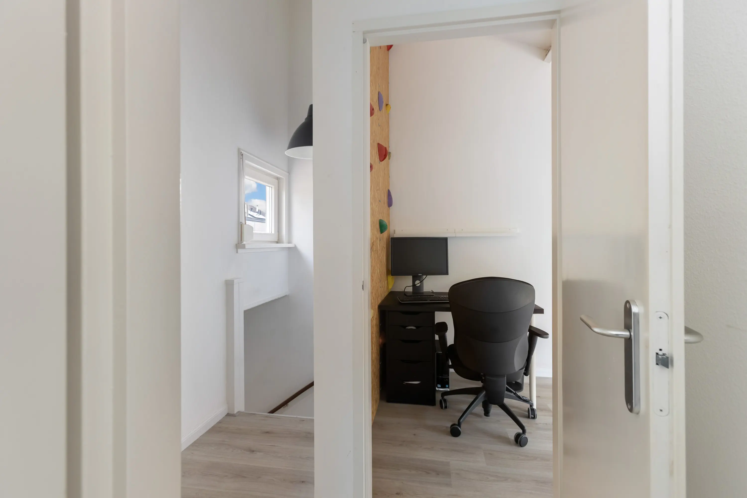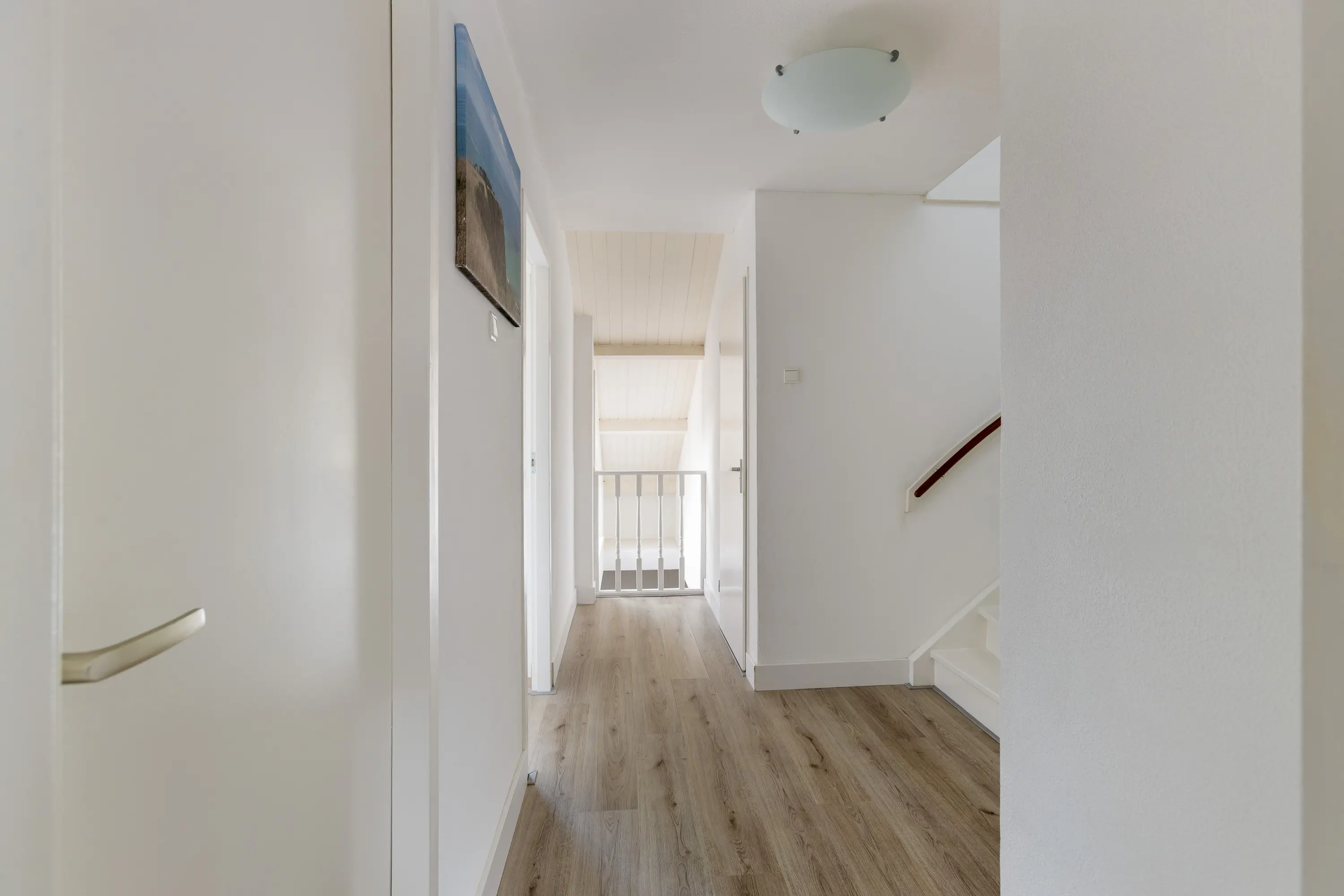 De overloop biedt toegang tot de stookruimte en leidt naar twee ruime slaapkamers. Dankzij de hoge nok voelen deze kamers extra ruim en licht, wat een prettig en open gevoel geeft.