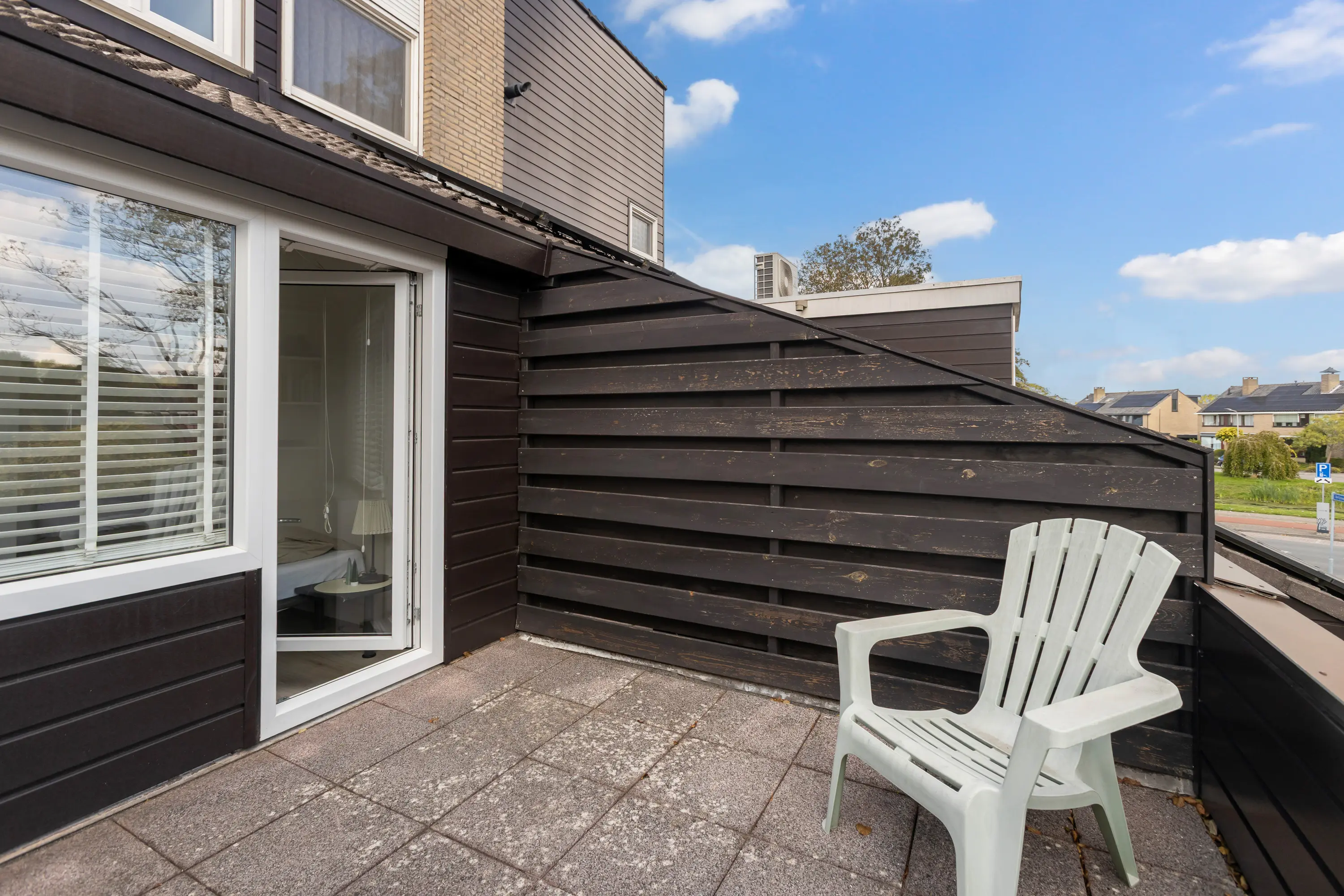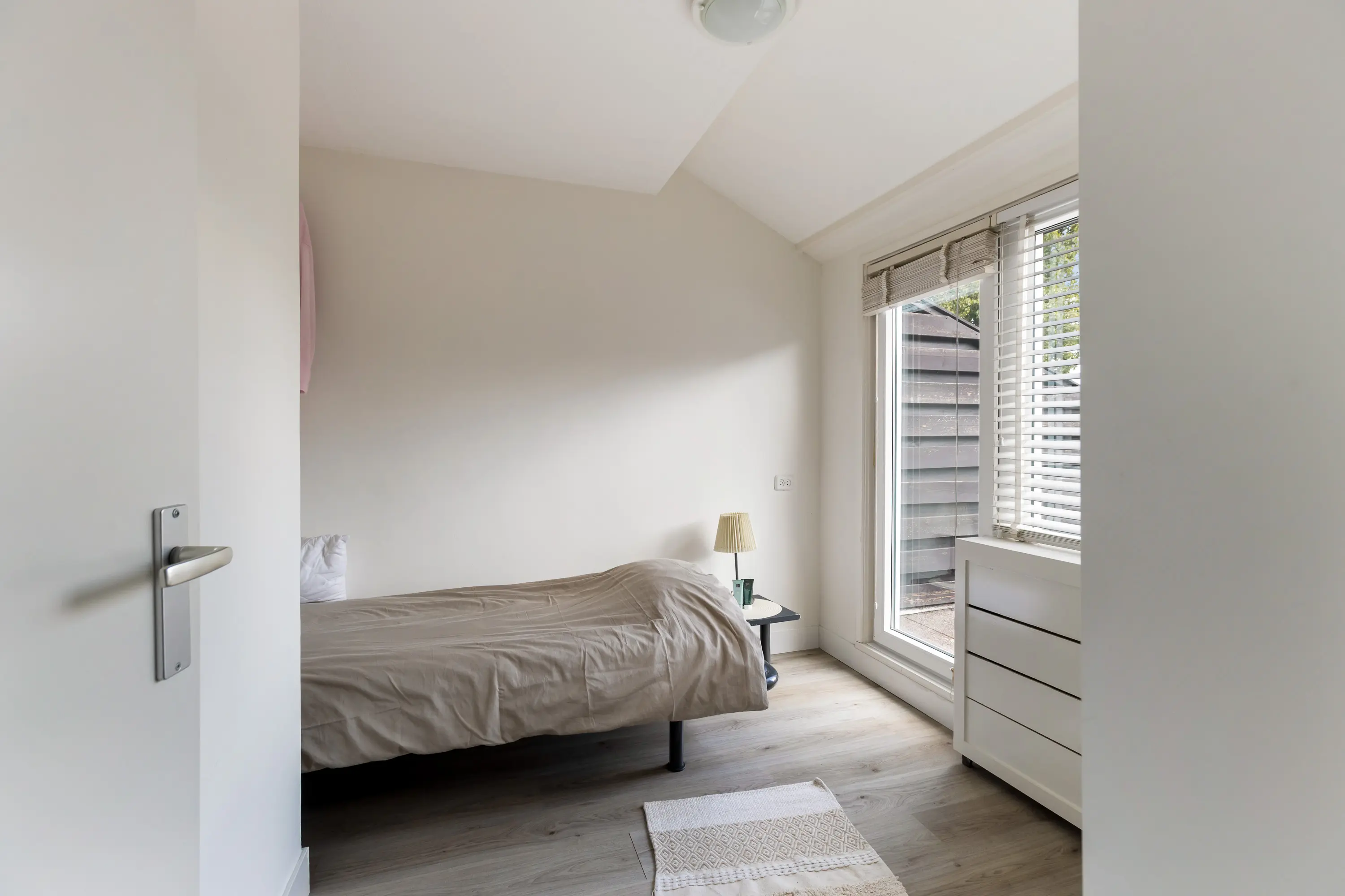 Aan de voorzijde van de woning ligt een slaapkamer met toegang tot het balkon, een fijne plek om ’s ochtends van het zonnetje te genieten.