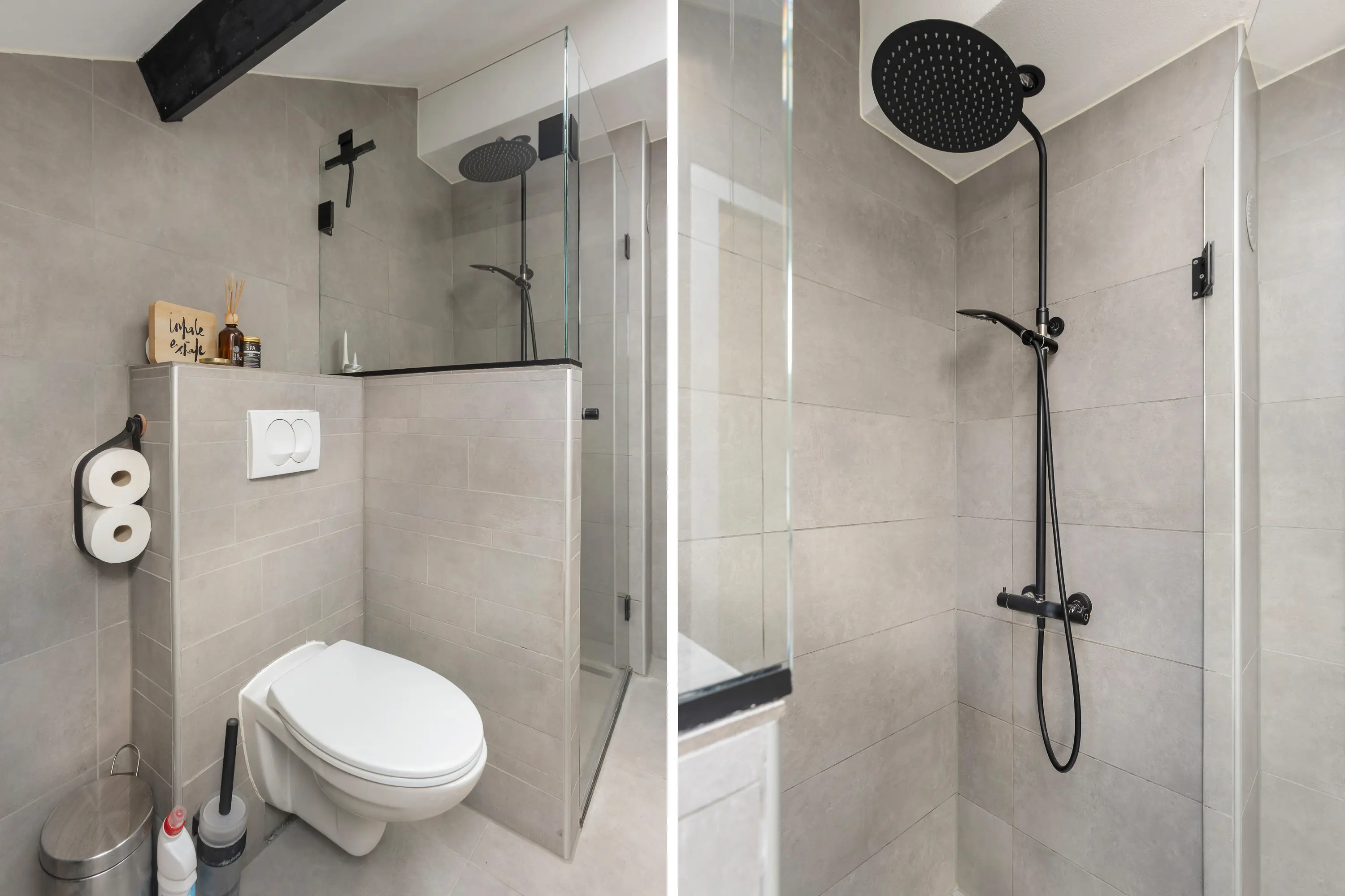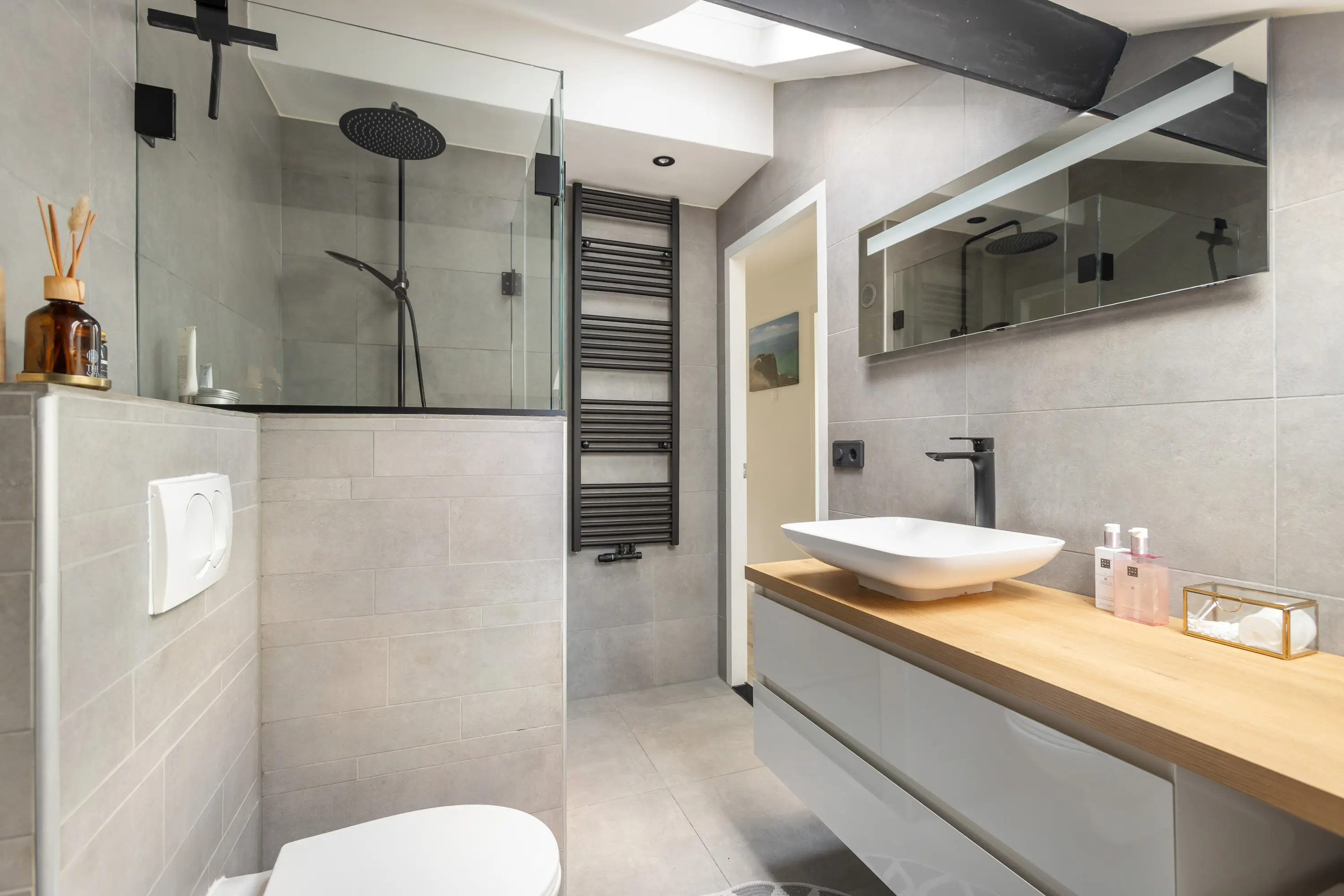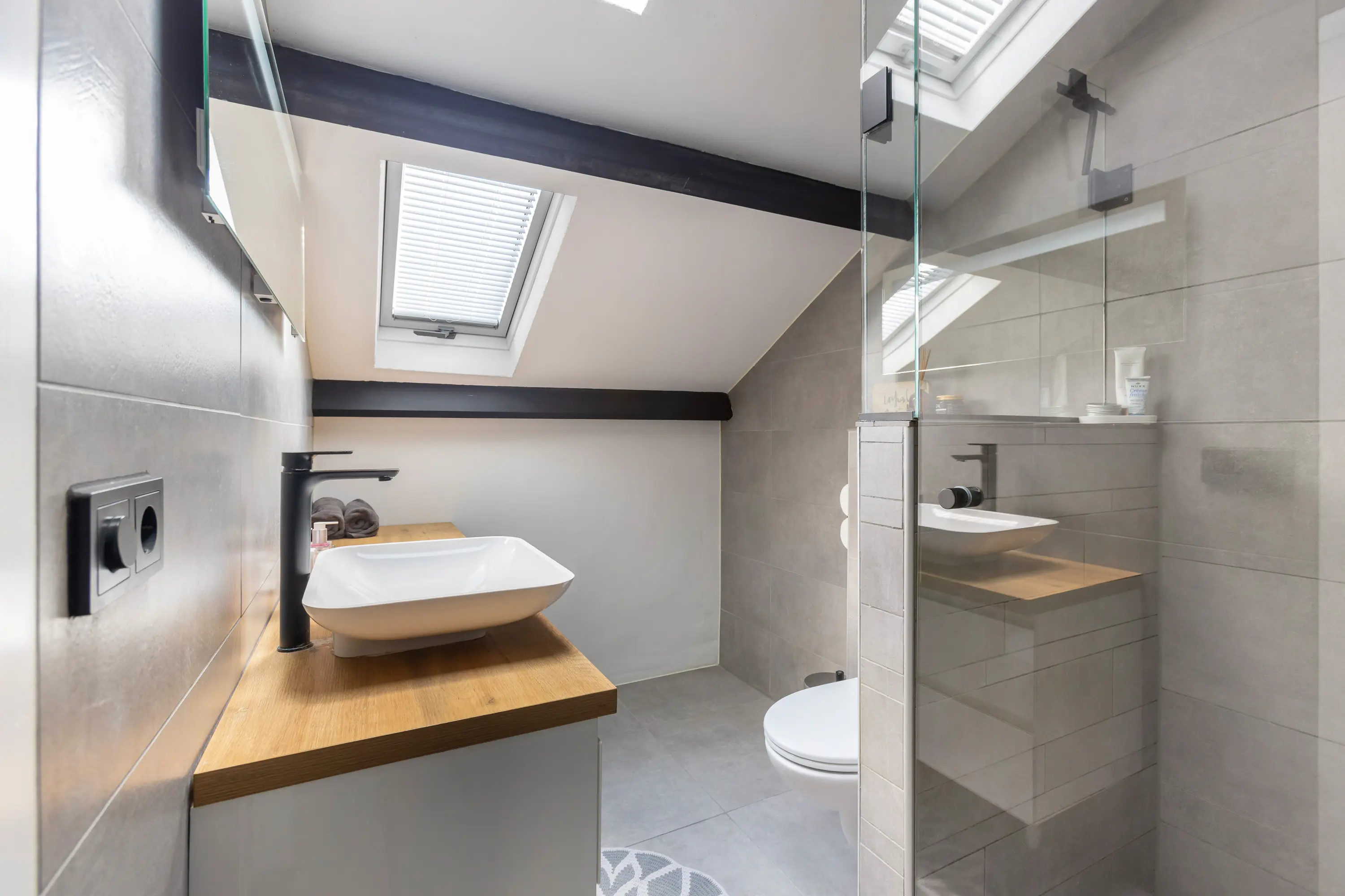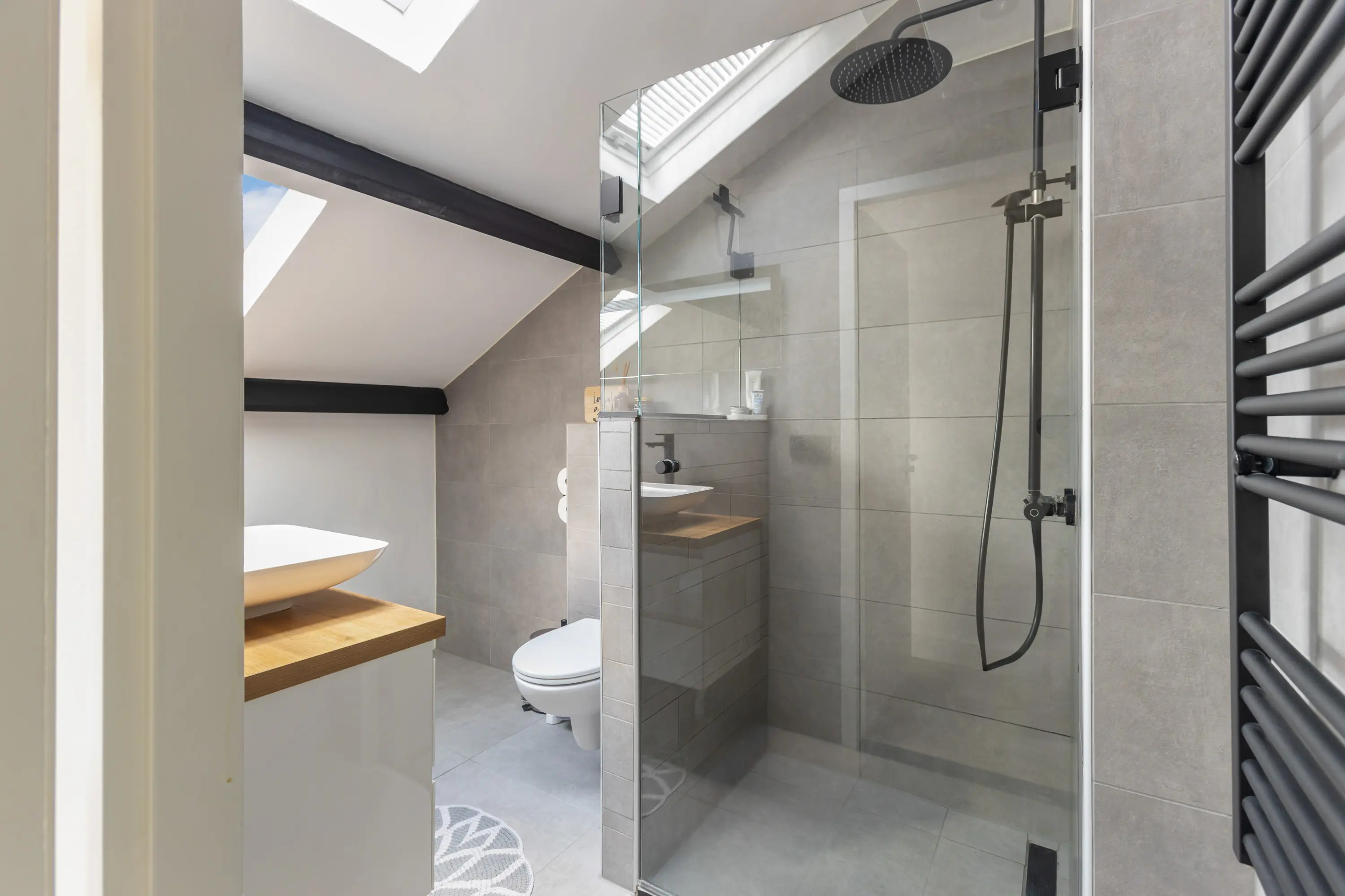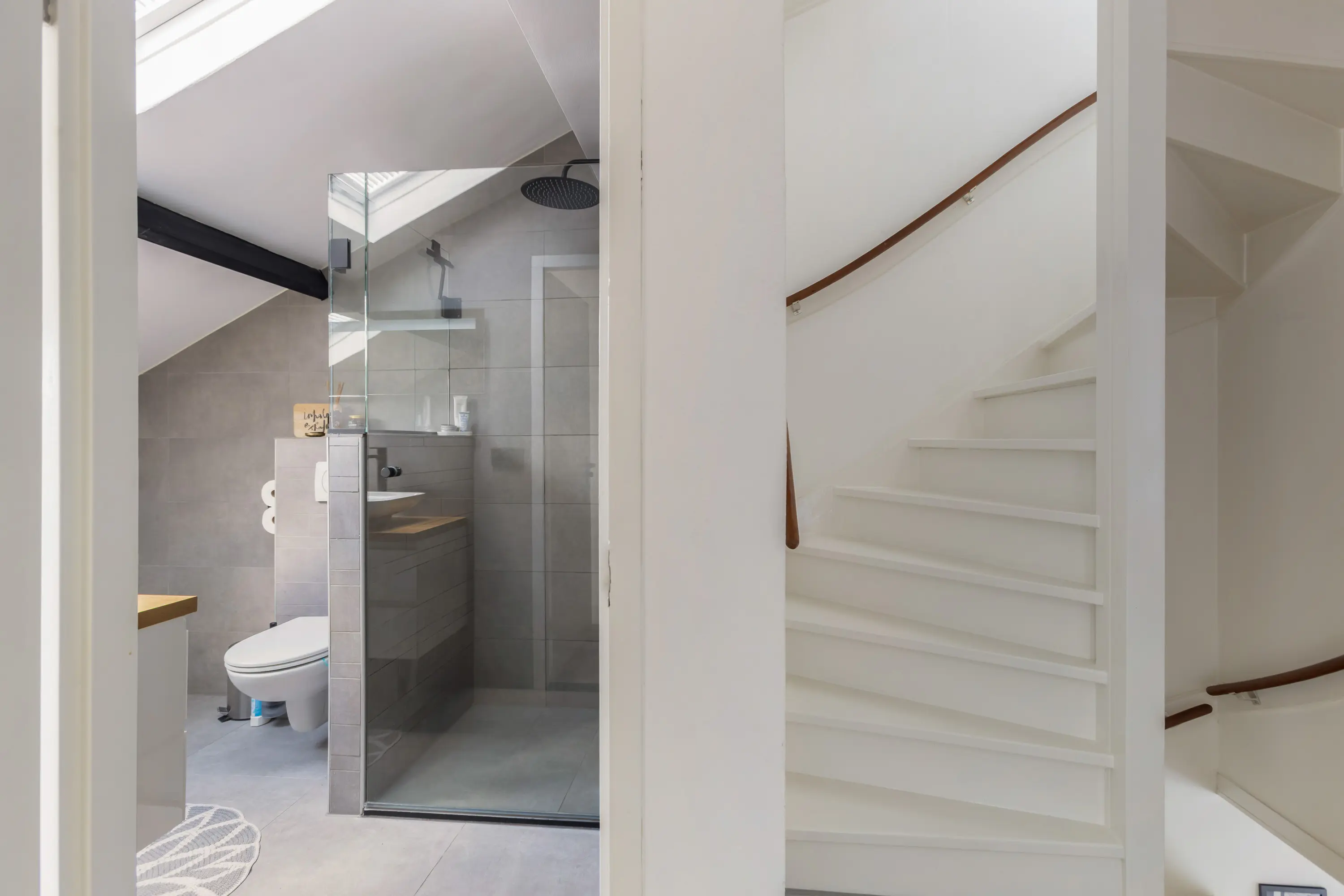 Op de overloop heb je toegang tot de moderne badkamer, voorzien van een wastafelmeubel, toilet en douche, strak afgewerkt en van alle gemakken voorzien.