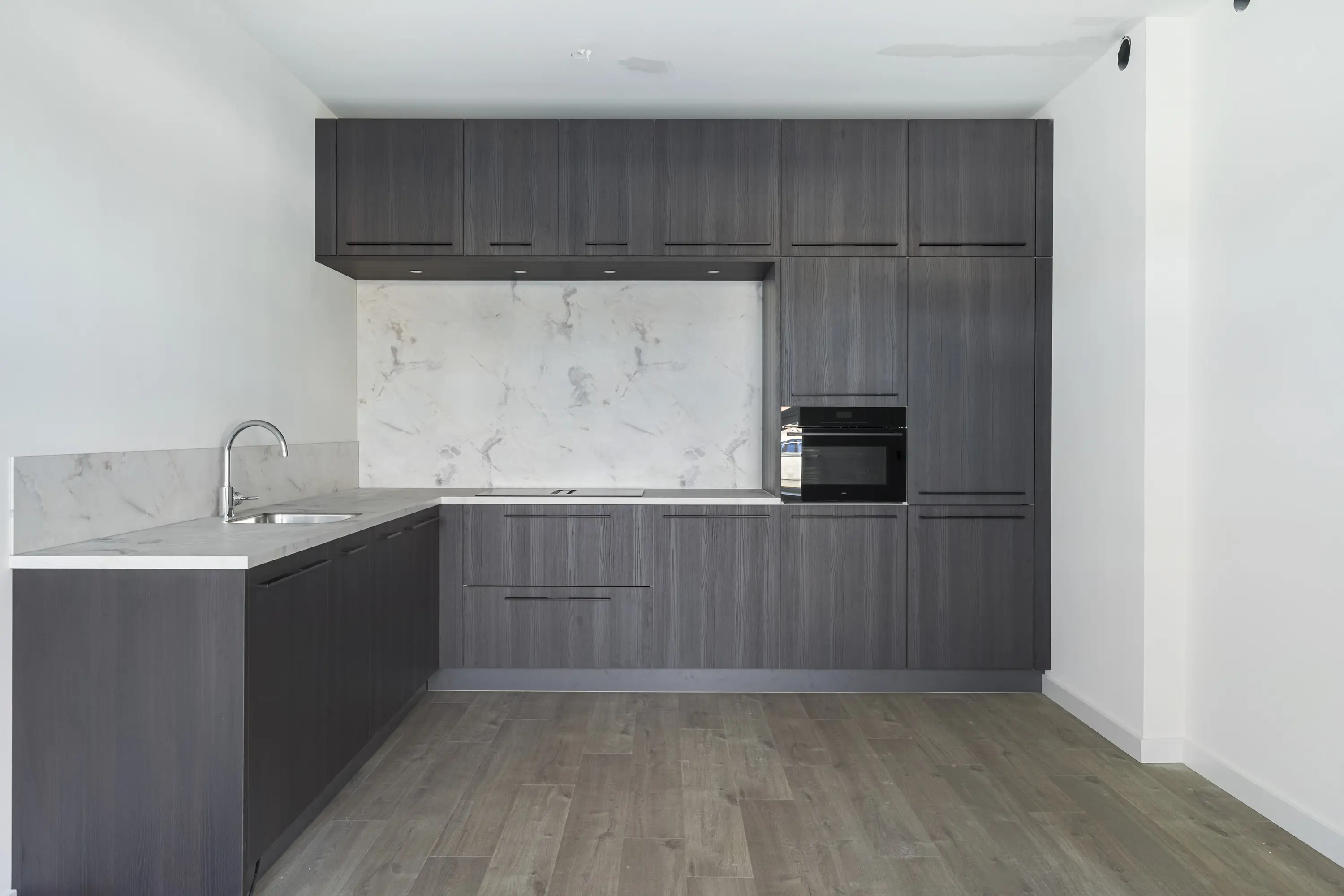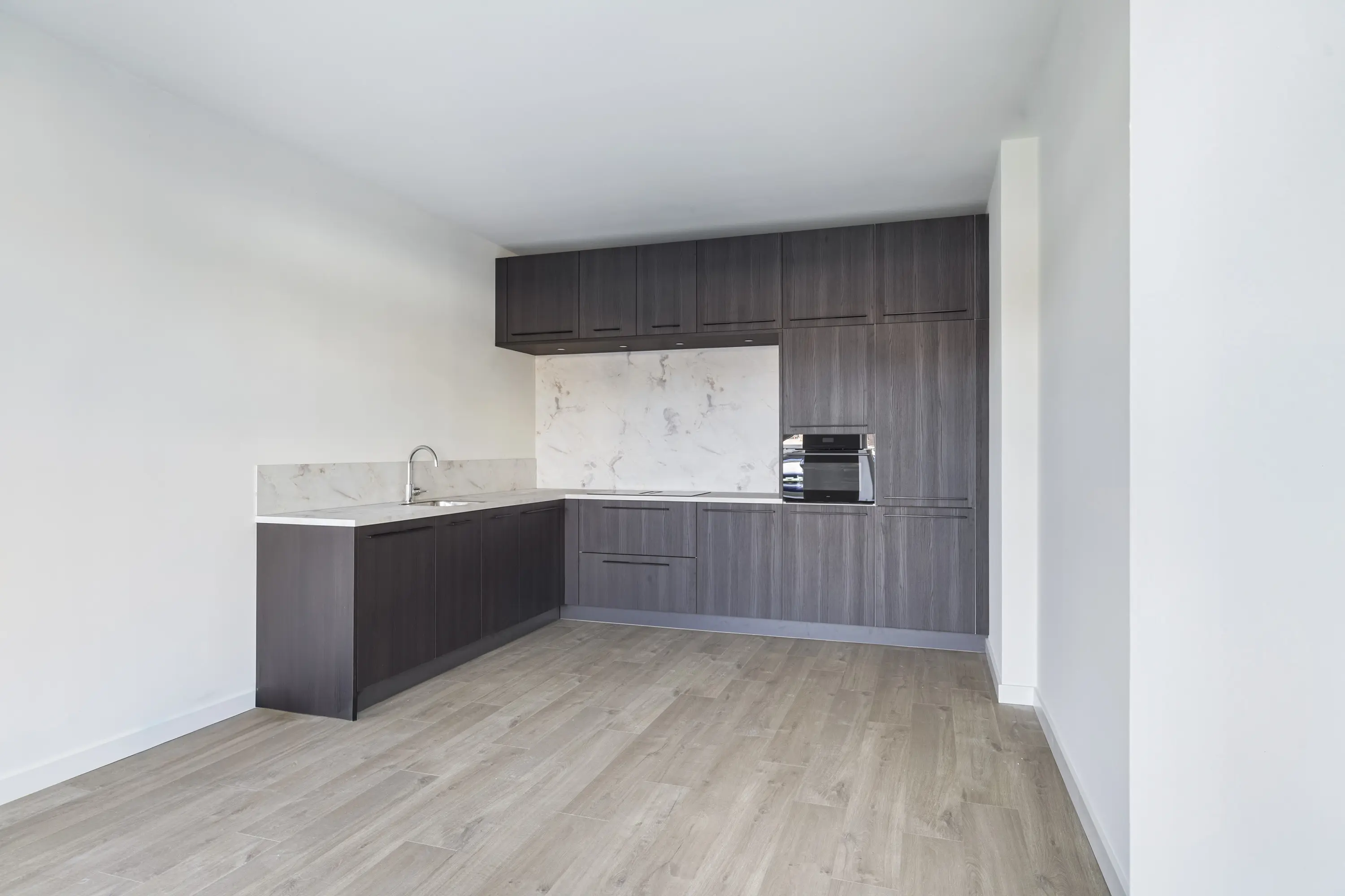 Bij binnenkomst word je meteen betoverd door de stijlvolle woonkeuken, een plek die zo uit Pinterest lijkt te komen! De keuken heeft een verfijnde Japandi-stijl, met donkerbruine houten kastfronten, een natuursteen-look werkblad met praktische spatrand en hoogwaardige ATAG inbouwapparatuur.