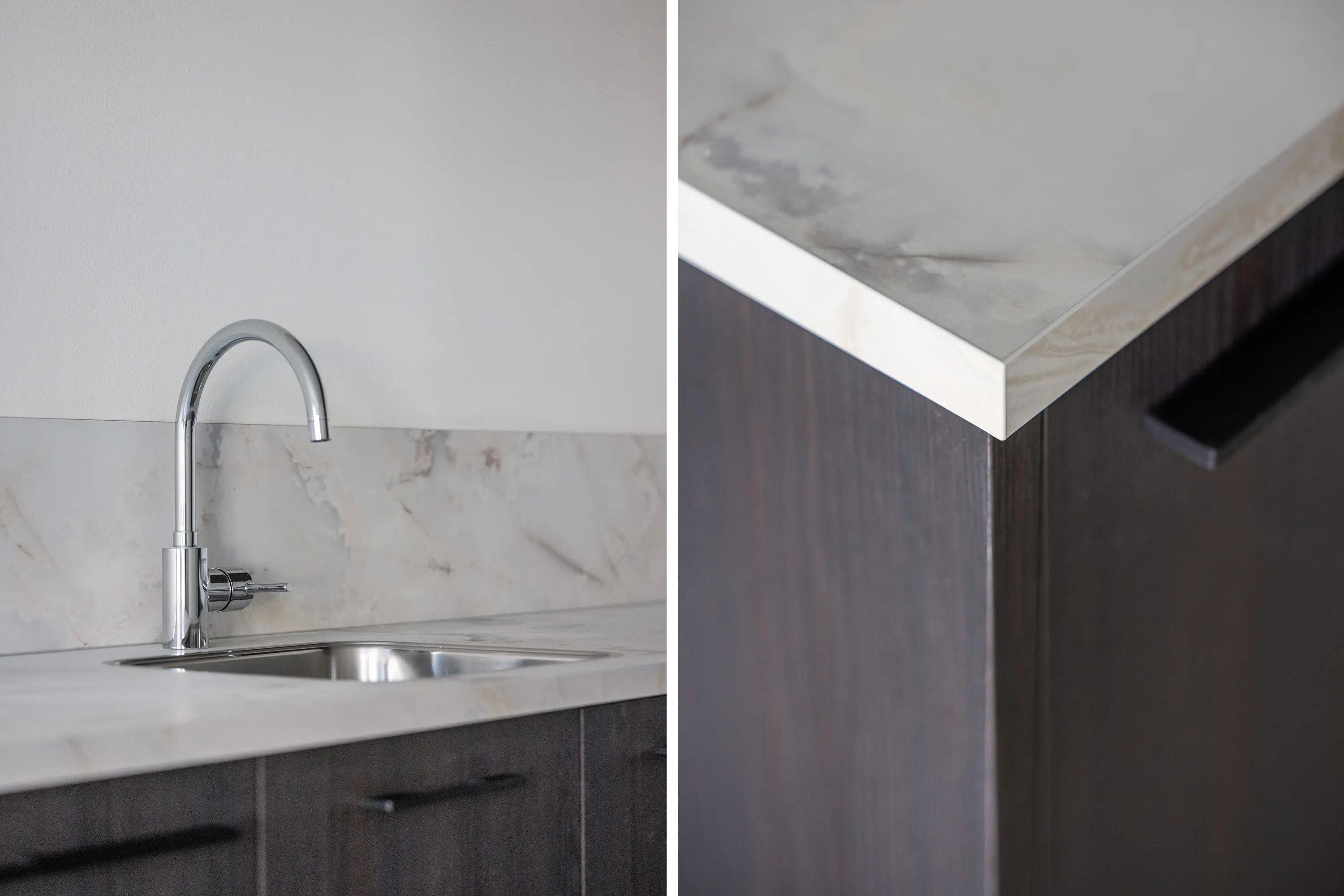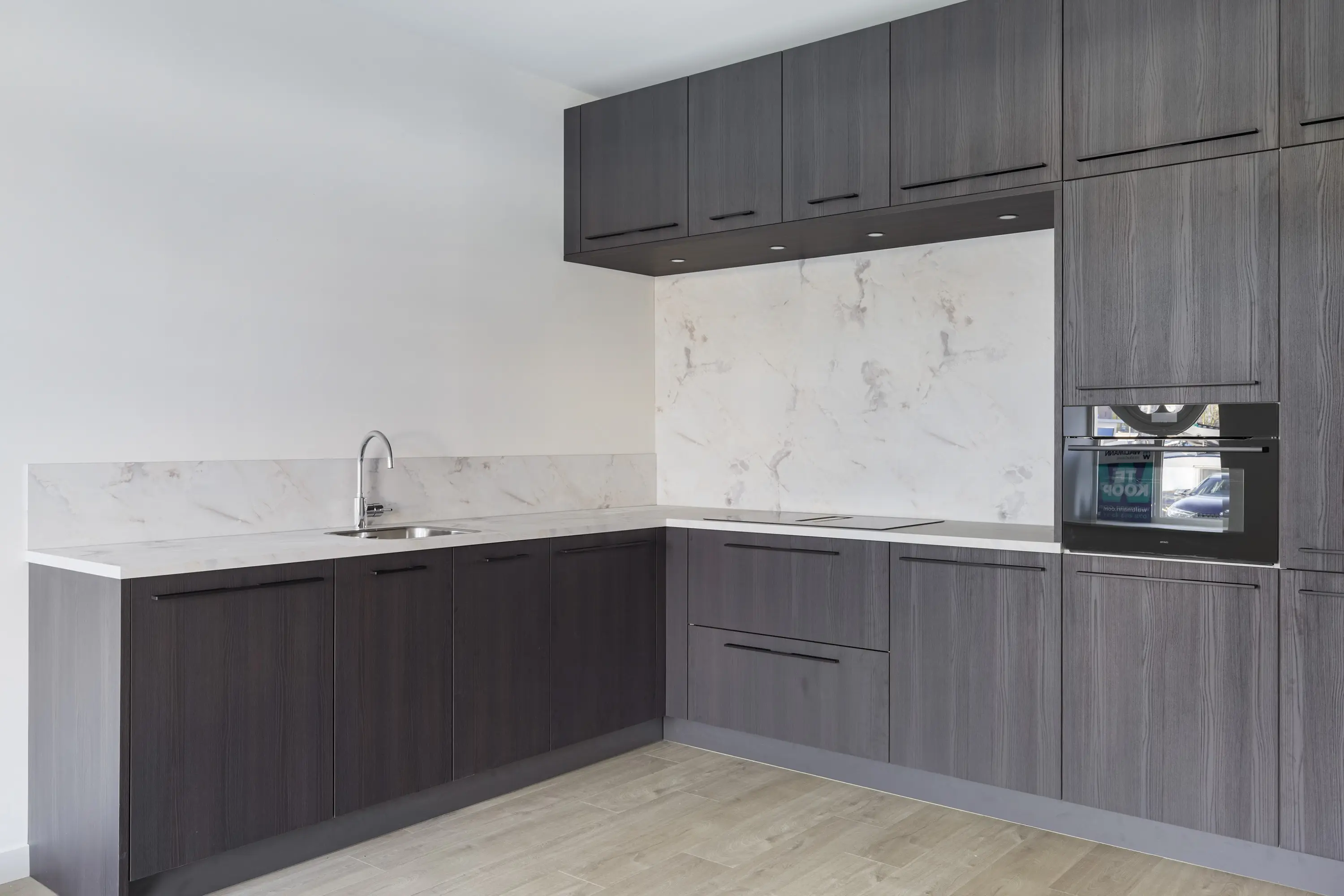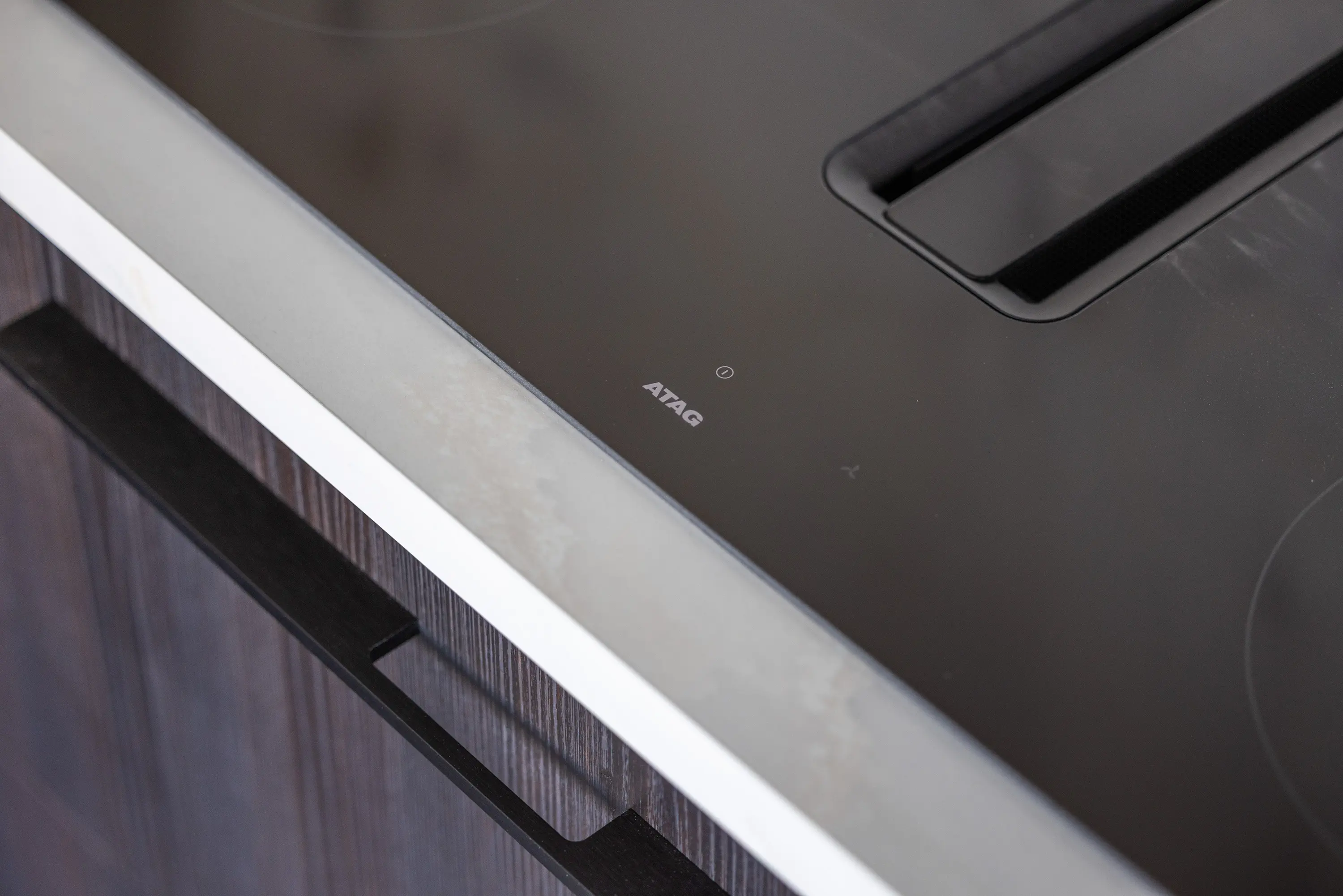 *Woonkeuken in Japandi-stijl met donkerbruine houten kastfronten, natuursteen-look werkblad en hoogwaardige ATAG inbouwapparatuur