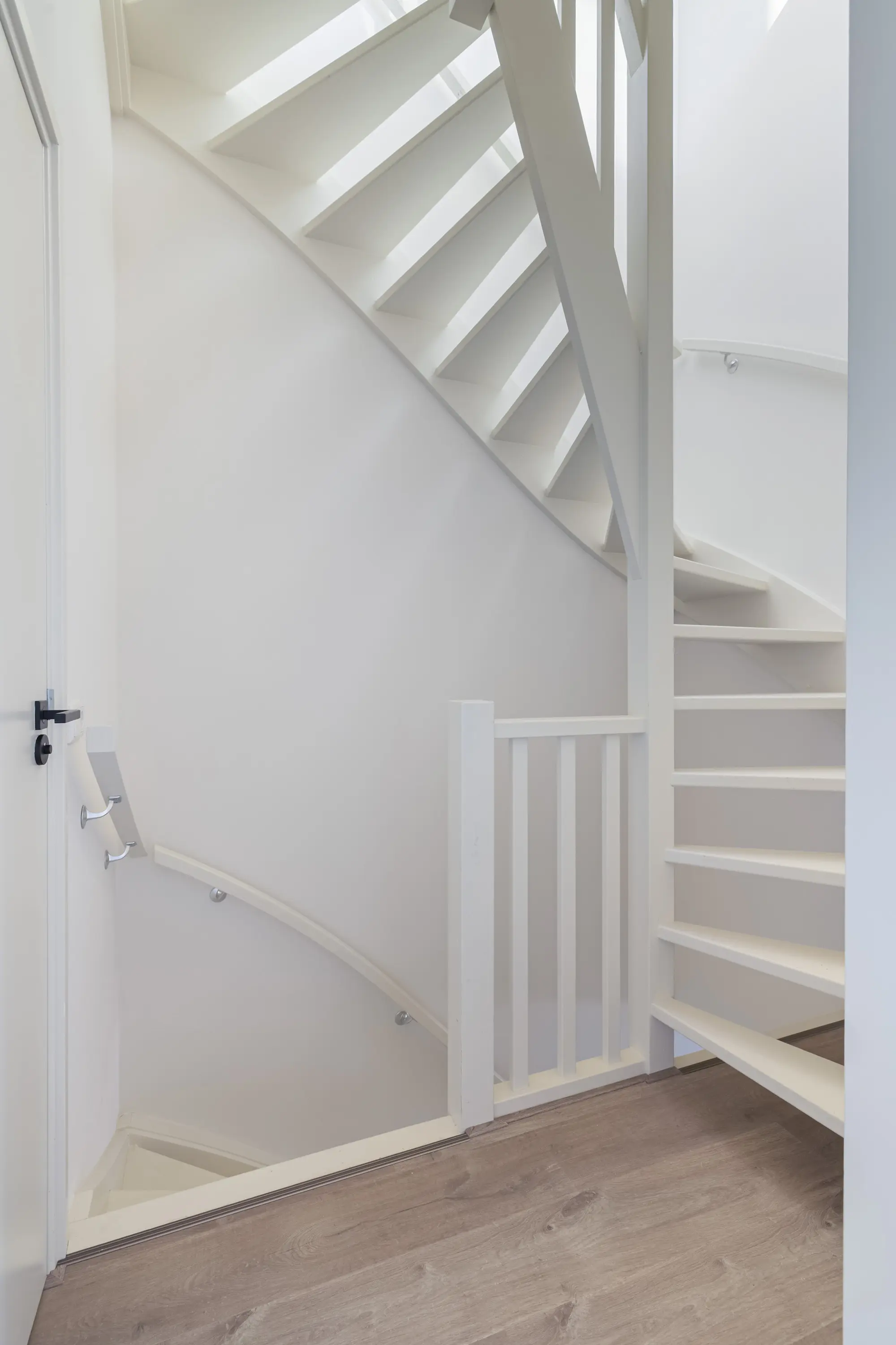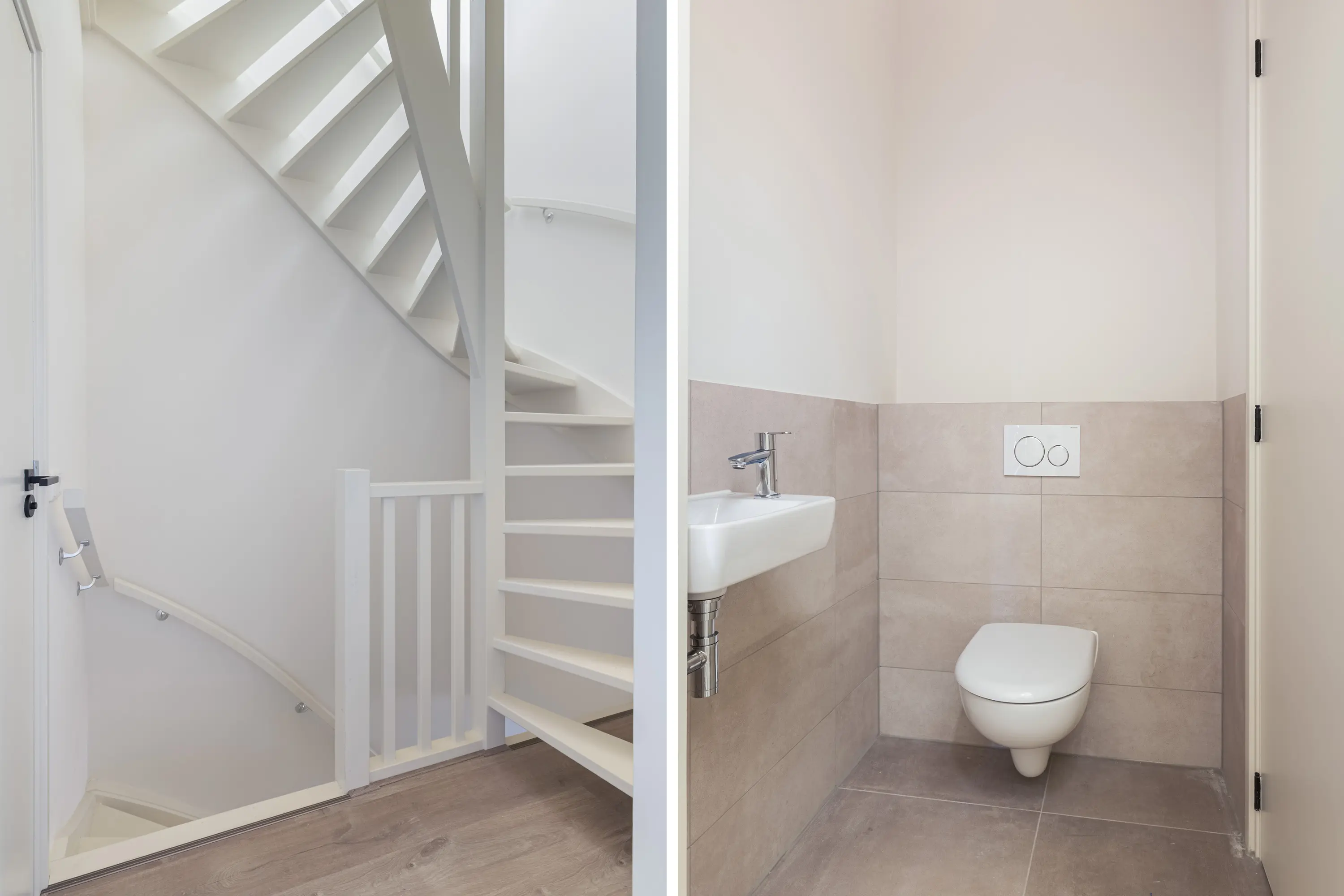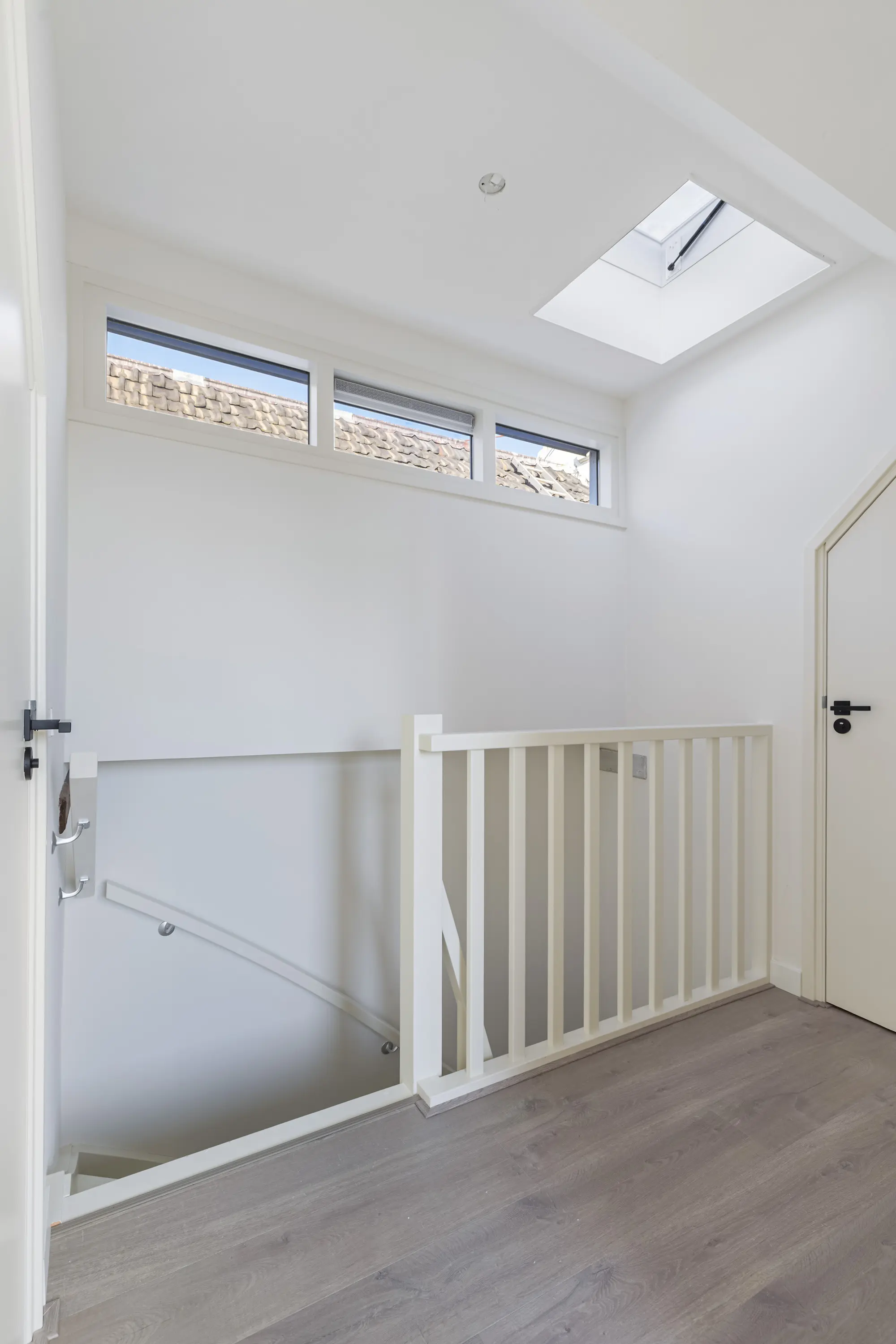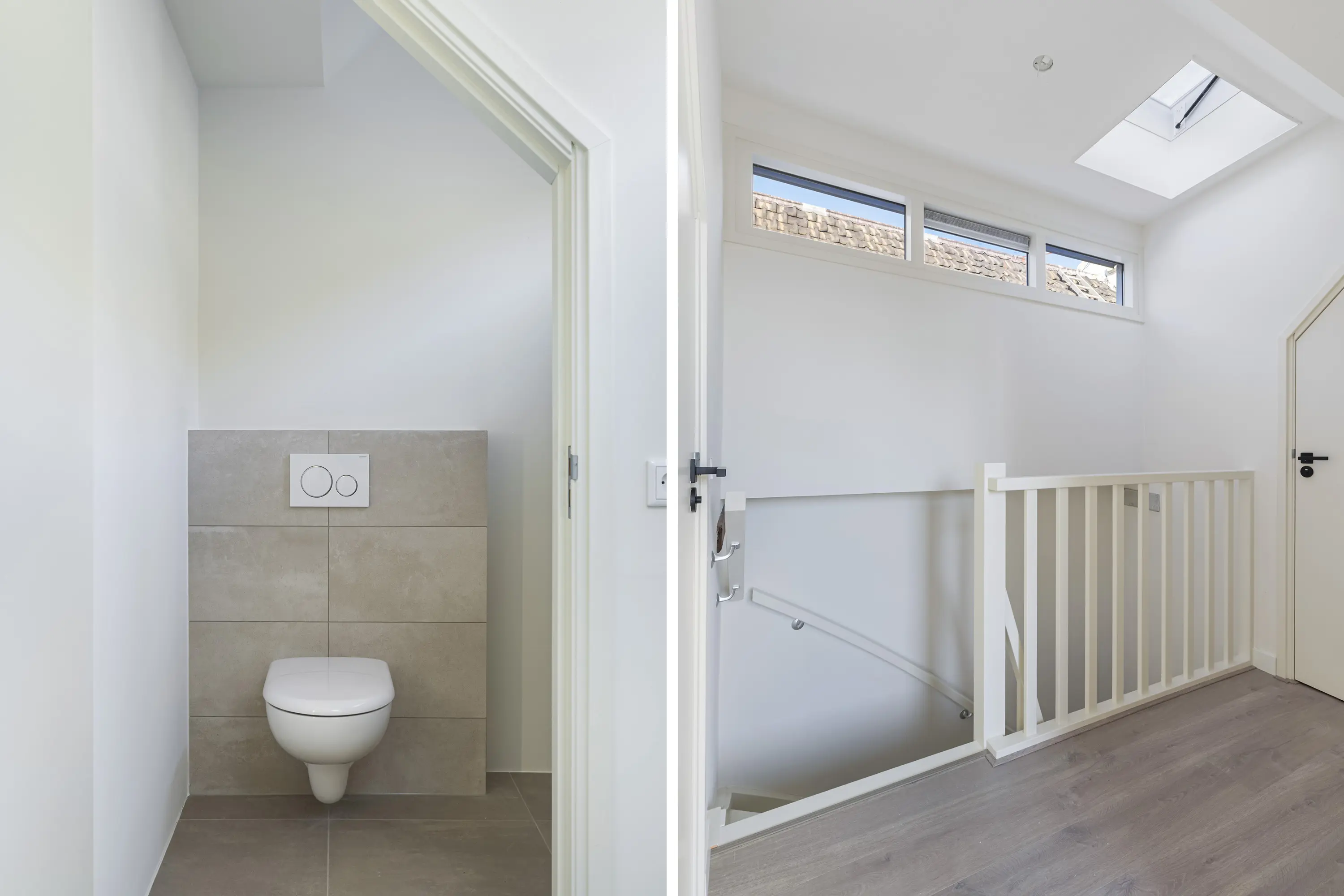 De warme houtlookvloer geeft de ruimte extra sfeer en vormt de perfecte basis voor koken, eten en gezellig samenzijn. Achter de entree vind je een praktische binnenberging, terwijl de bijzondere ronde raampartijen deze verdieping een uniek karakter en een extra dimensie geven.