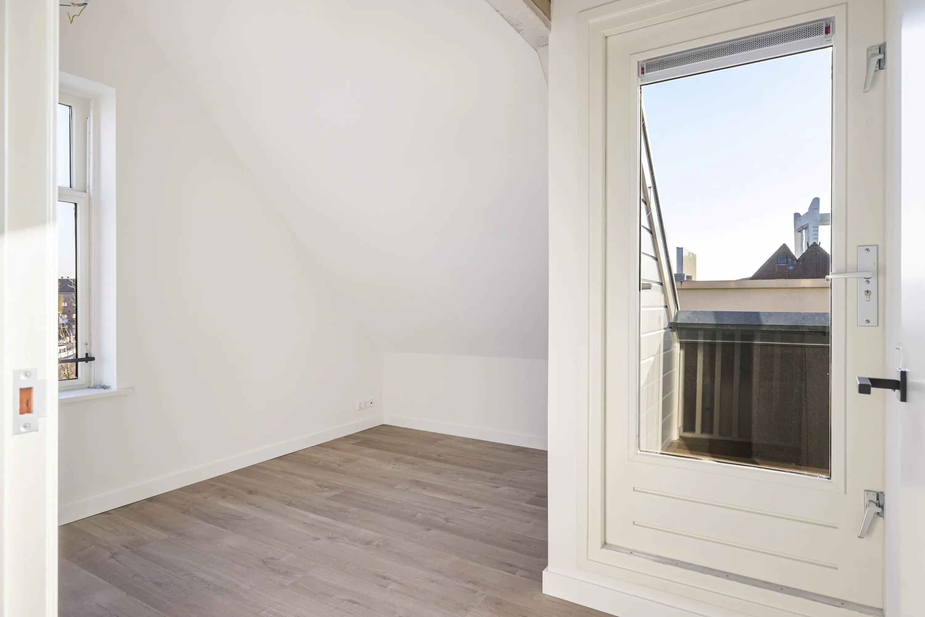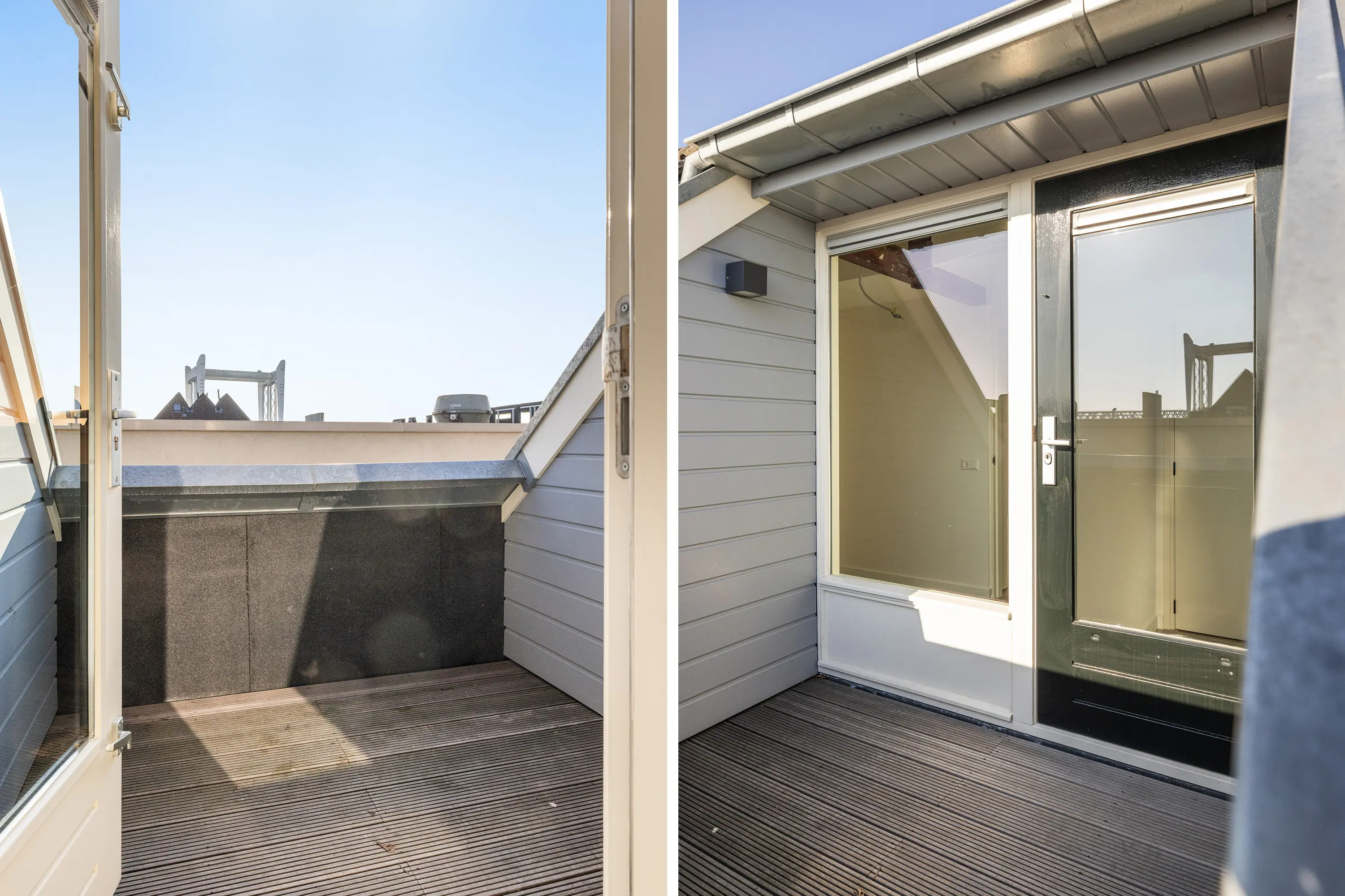 Via deze verdieping stap je zo het zonneterras op – de perfecte plek om te ontspannen, te genieten van de rust en te kijken naar het levendige havenbeeld.