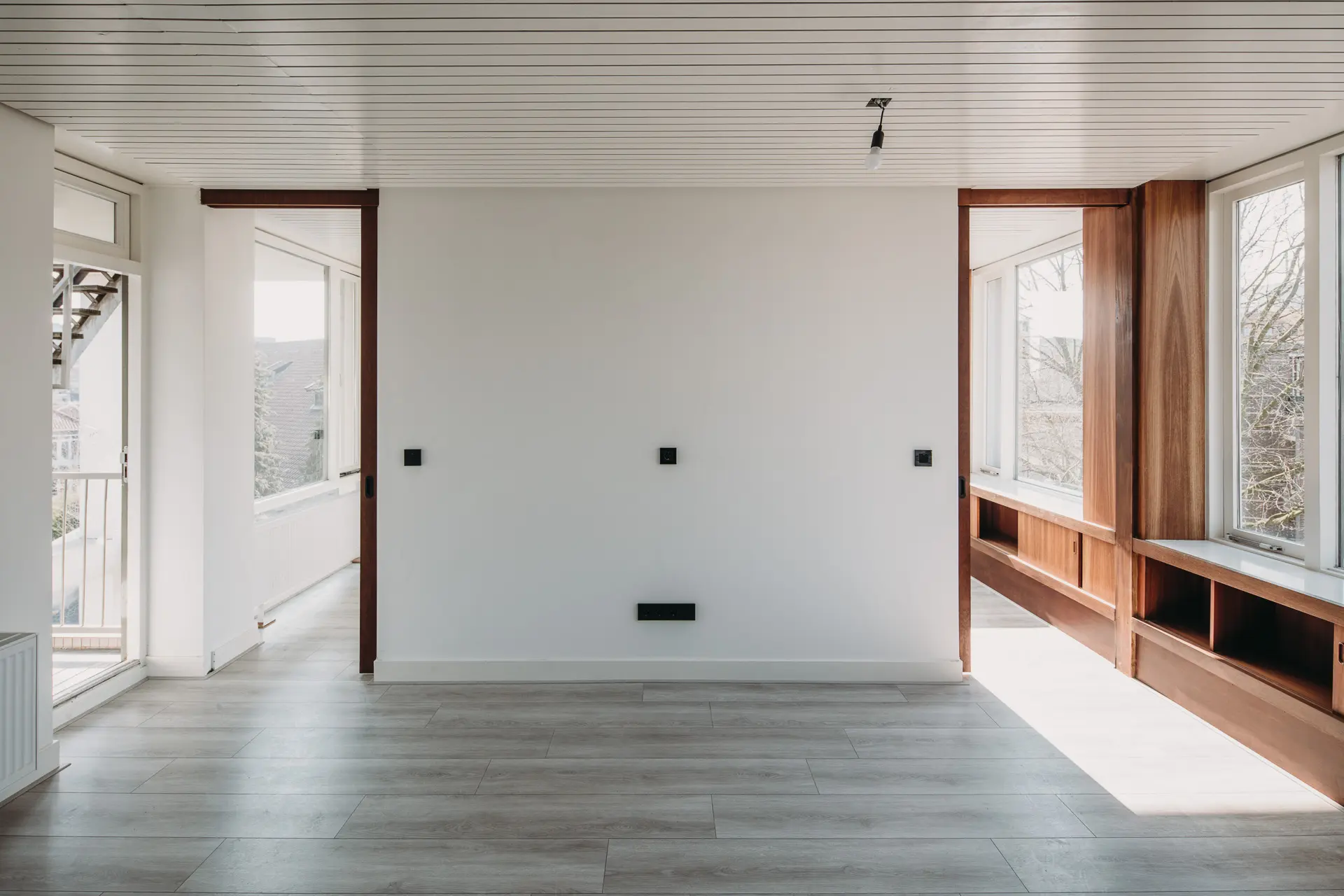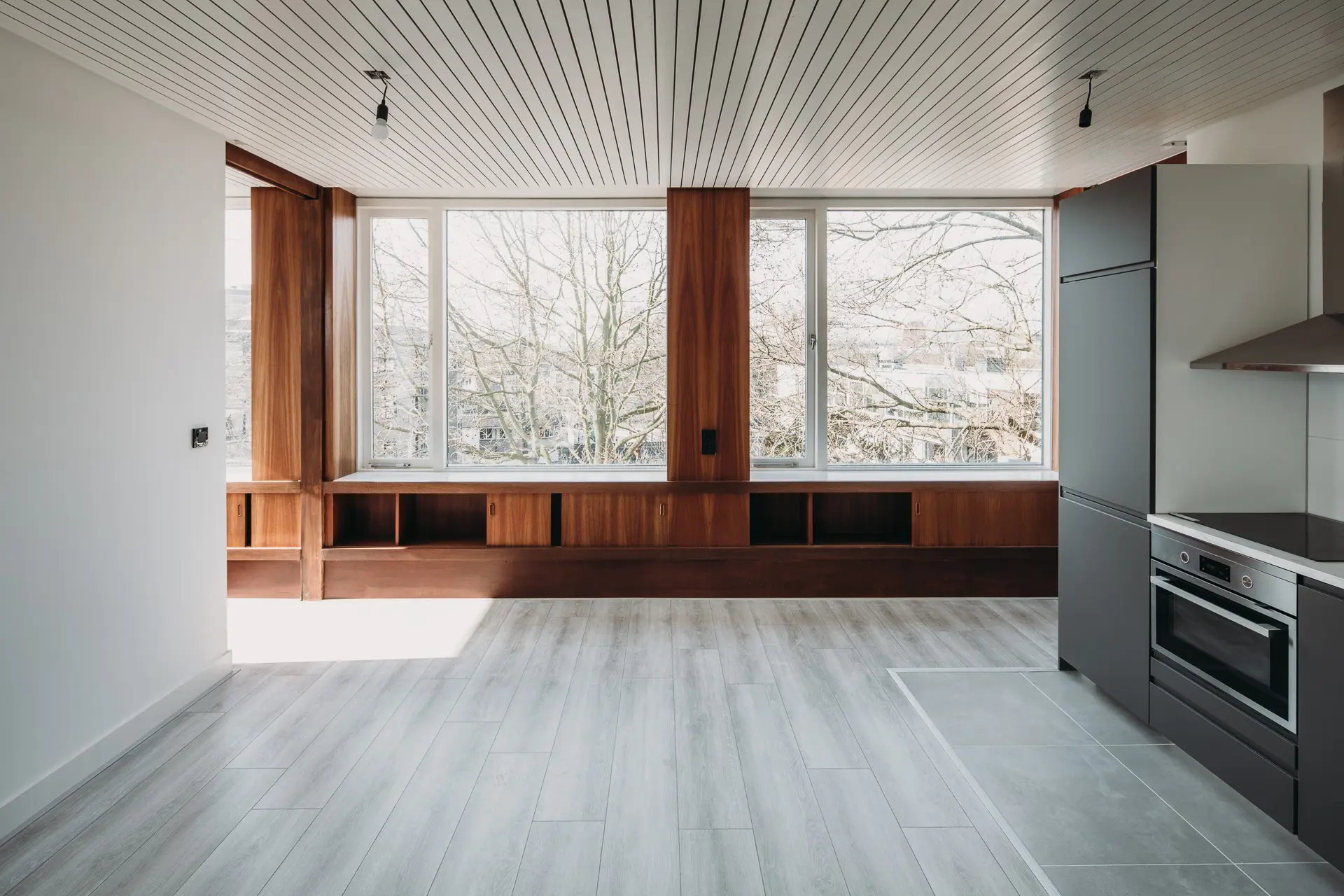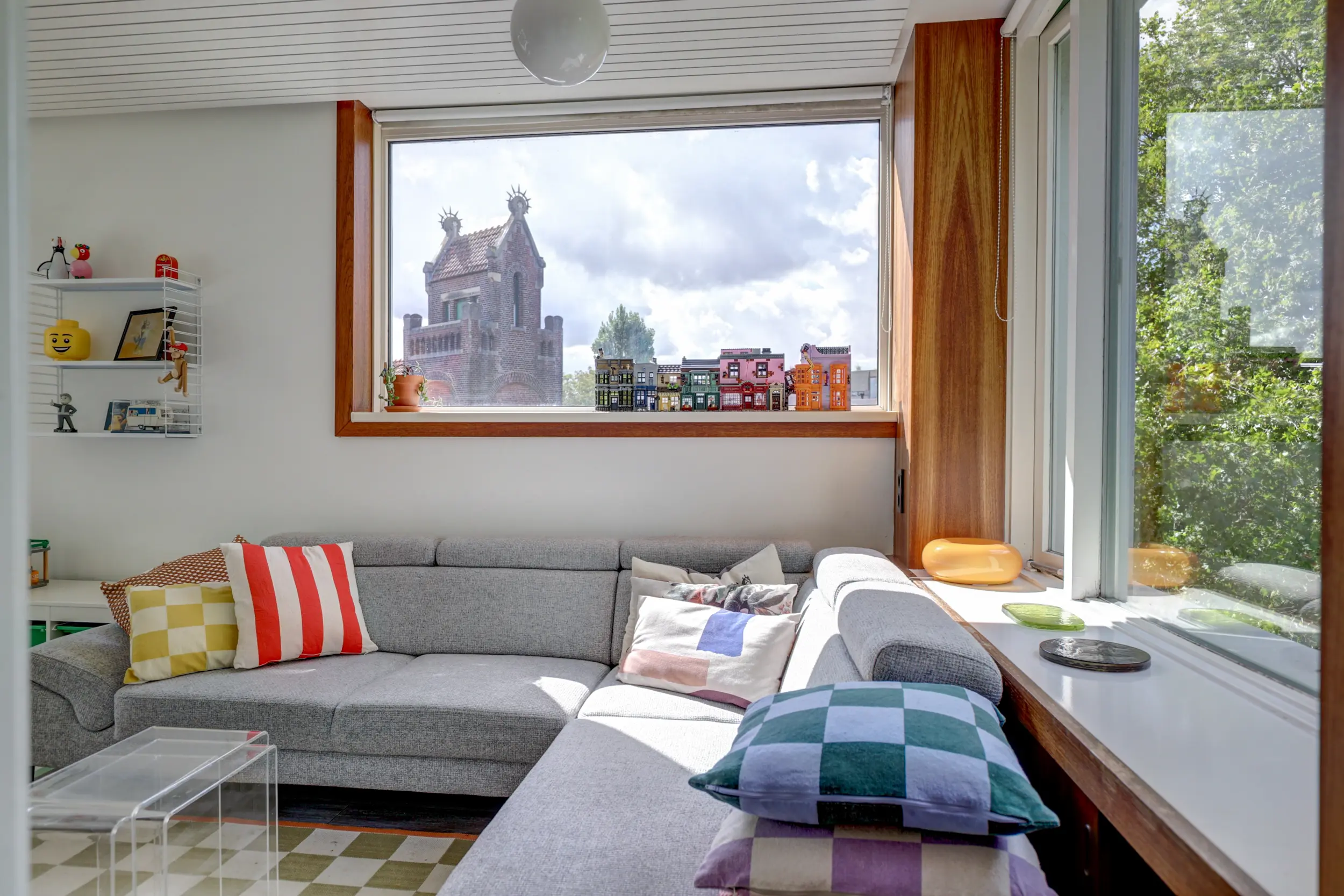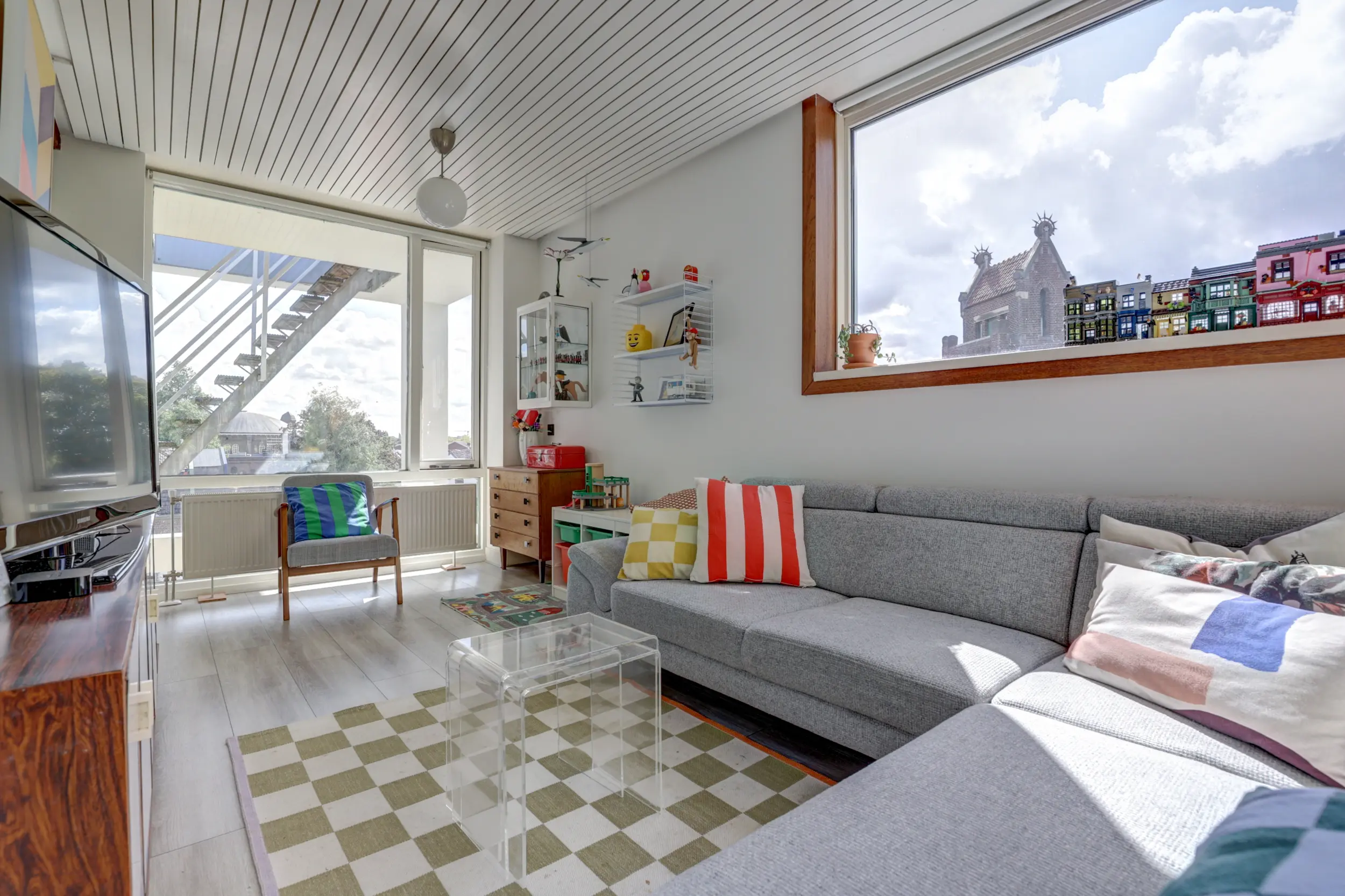 De woonkamer en slaapkamer zijn heerlijk licht dankzij de vele raampartijen, die zorgen voor een open en uitnodigende sfeer in het hele penthouse.
