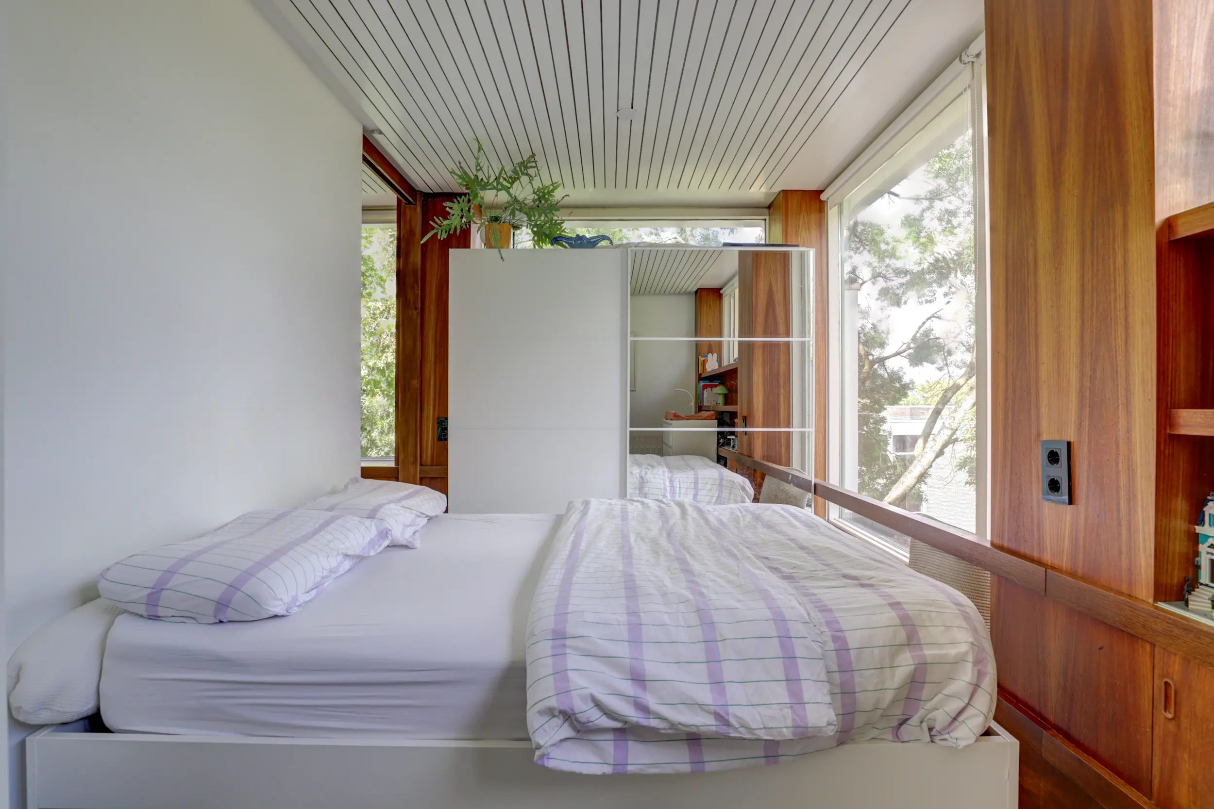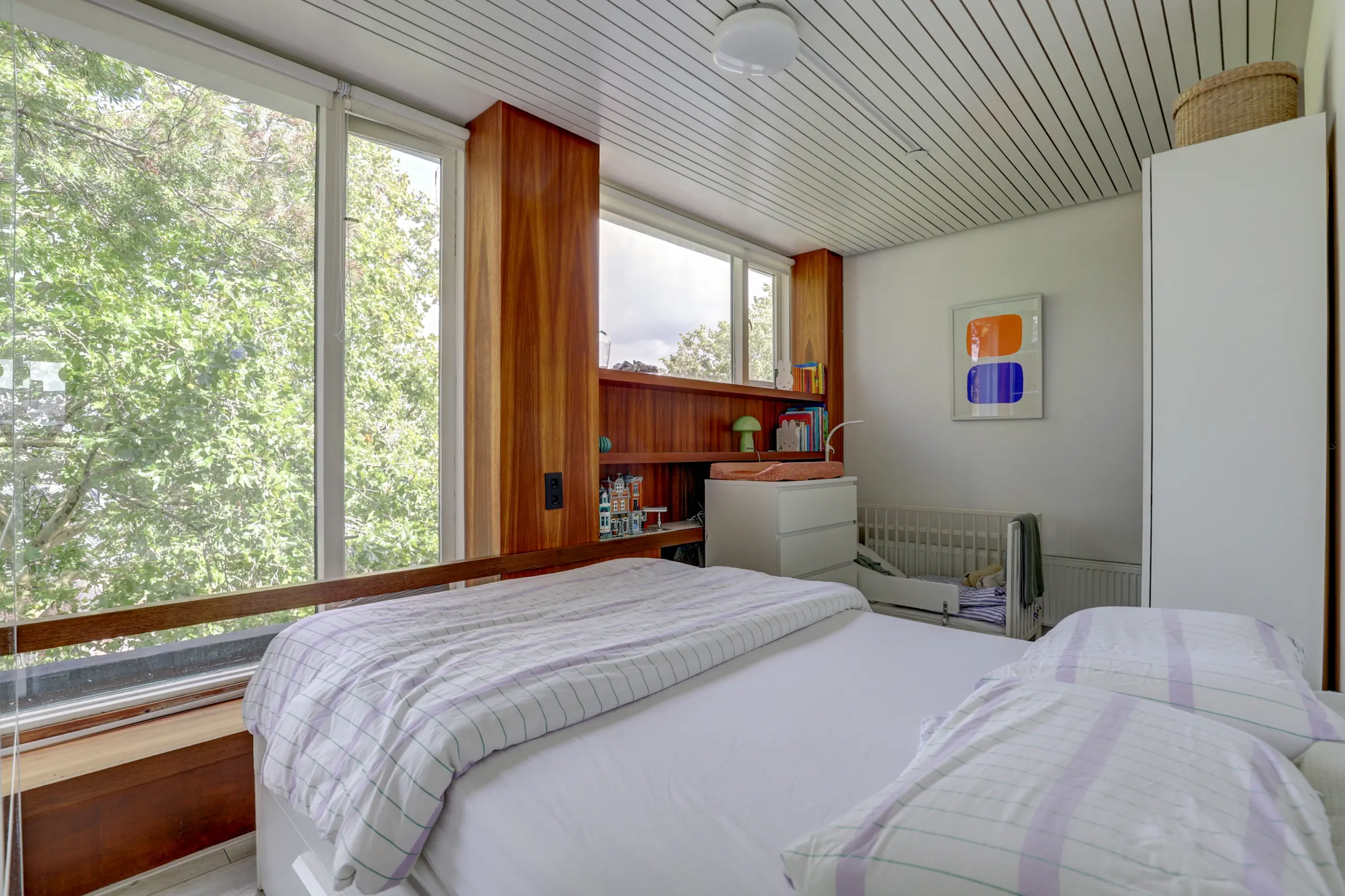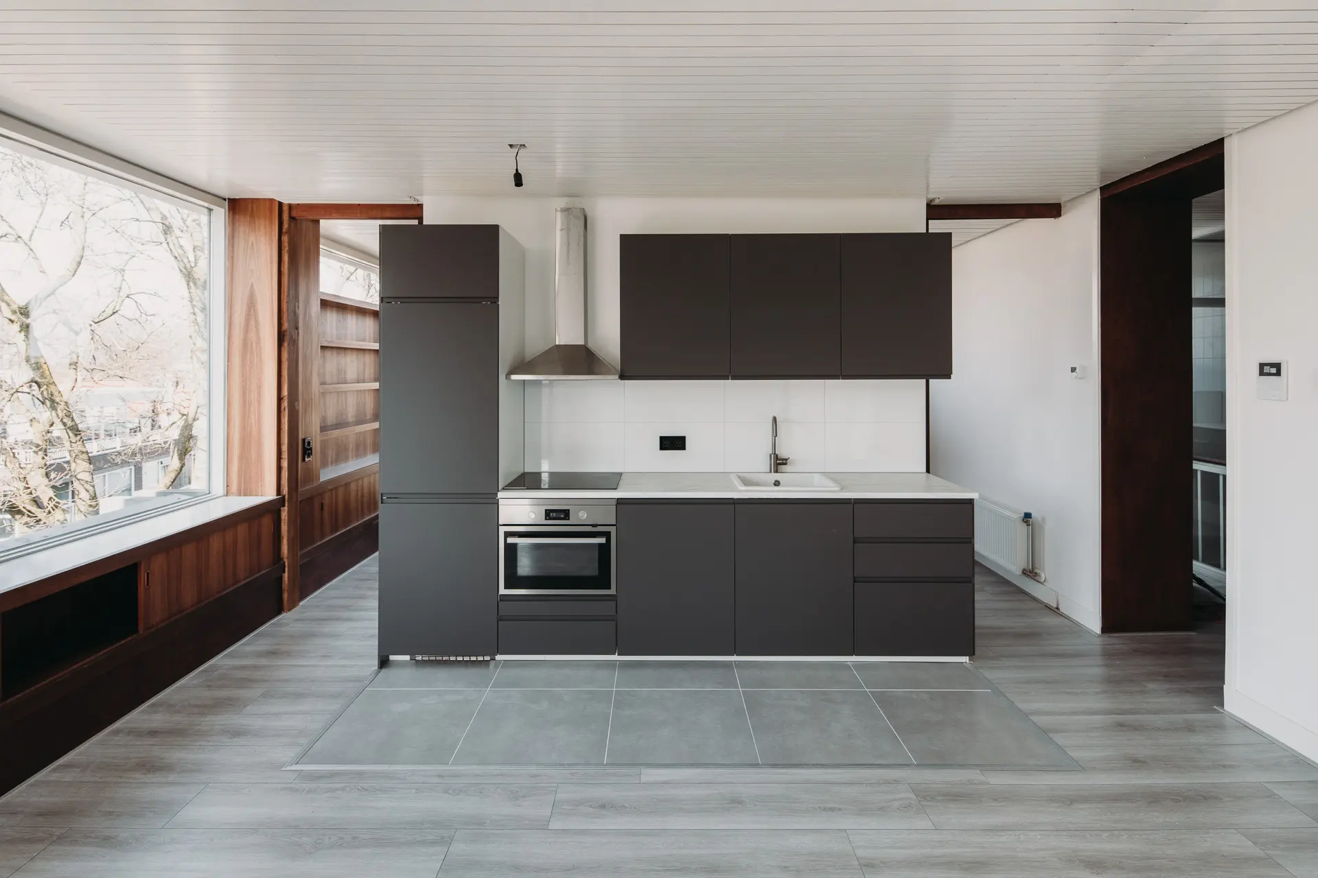 De woonkamer en slaapkamer zijn heerlijk licht dankzij de vele raampartijen, die zorgen voor een open en uitnodigende sfeer in het hele penthouse.