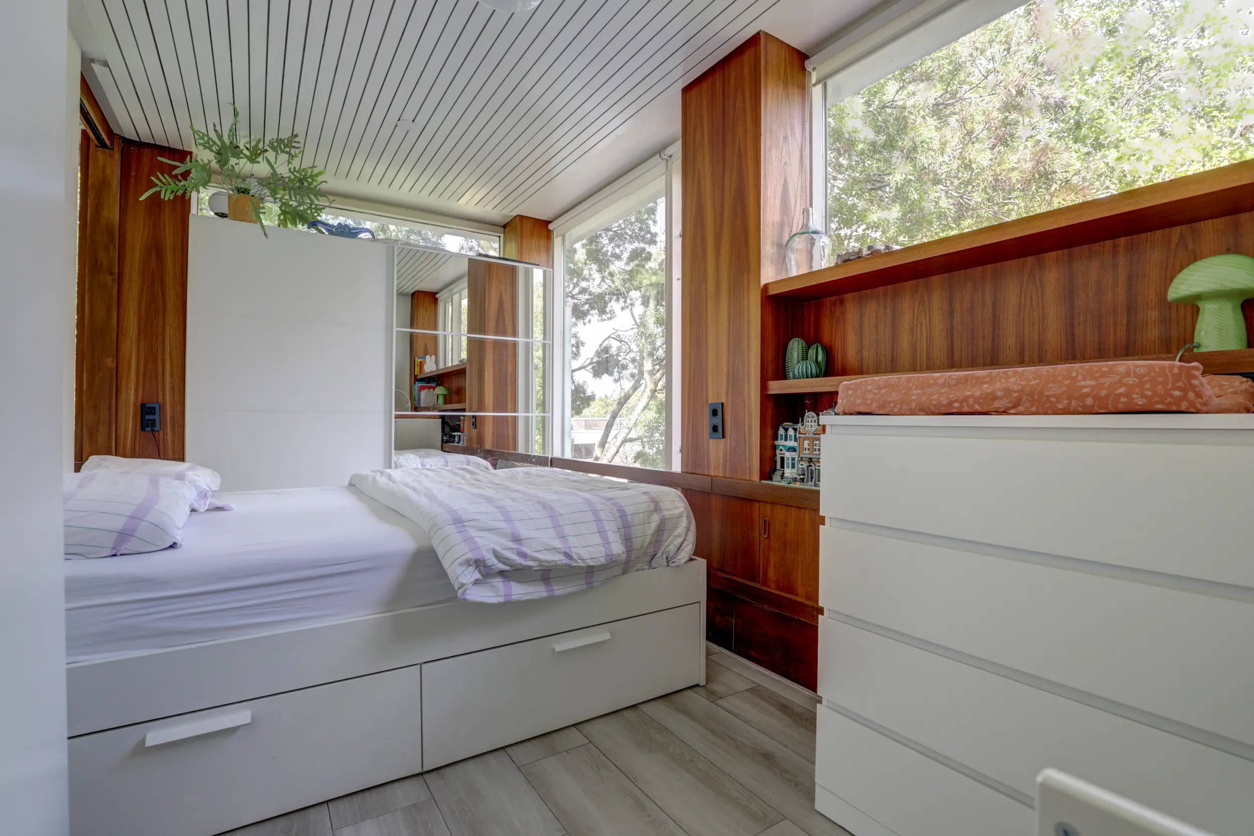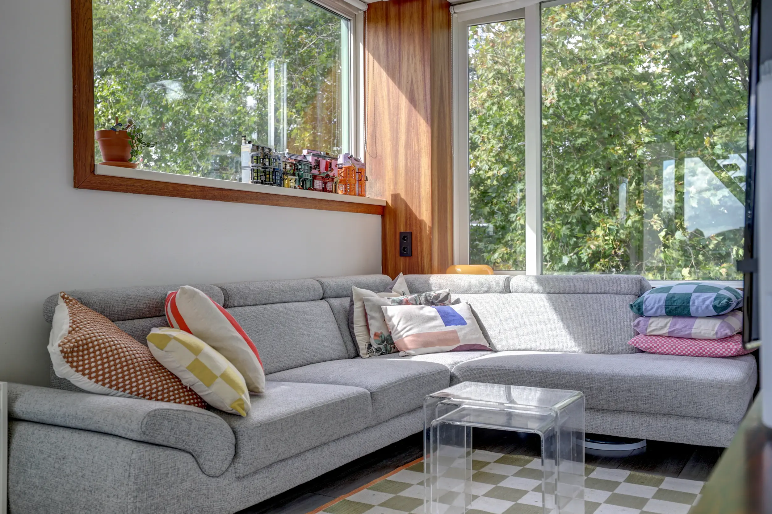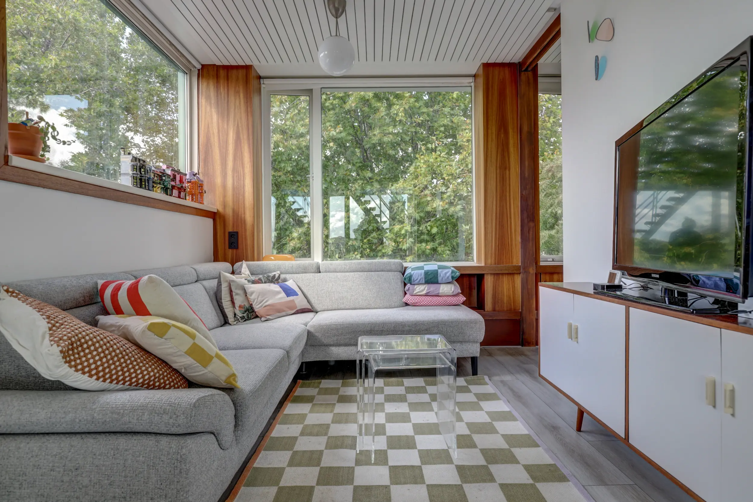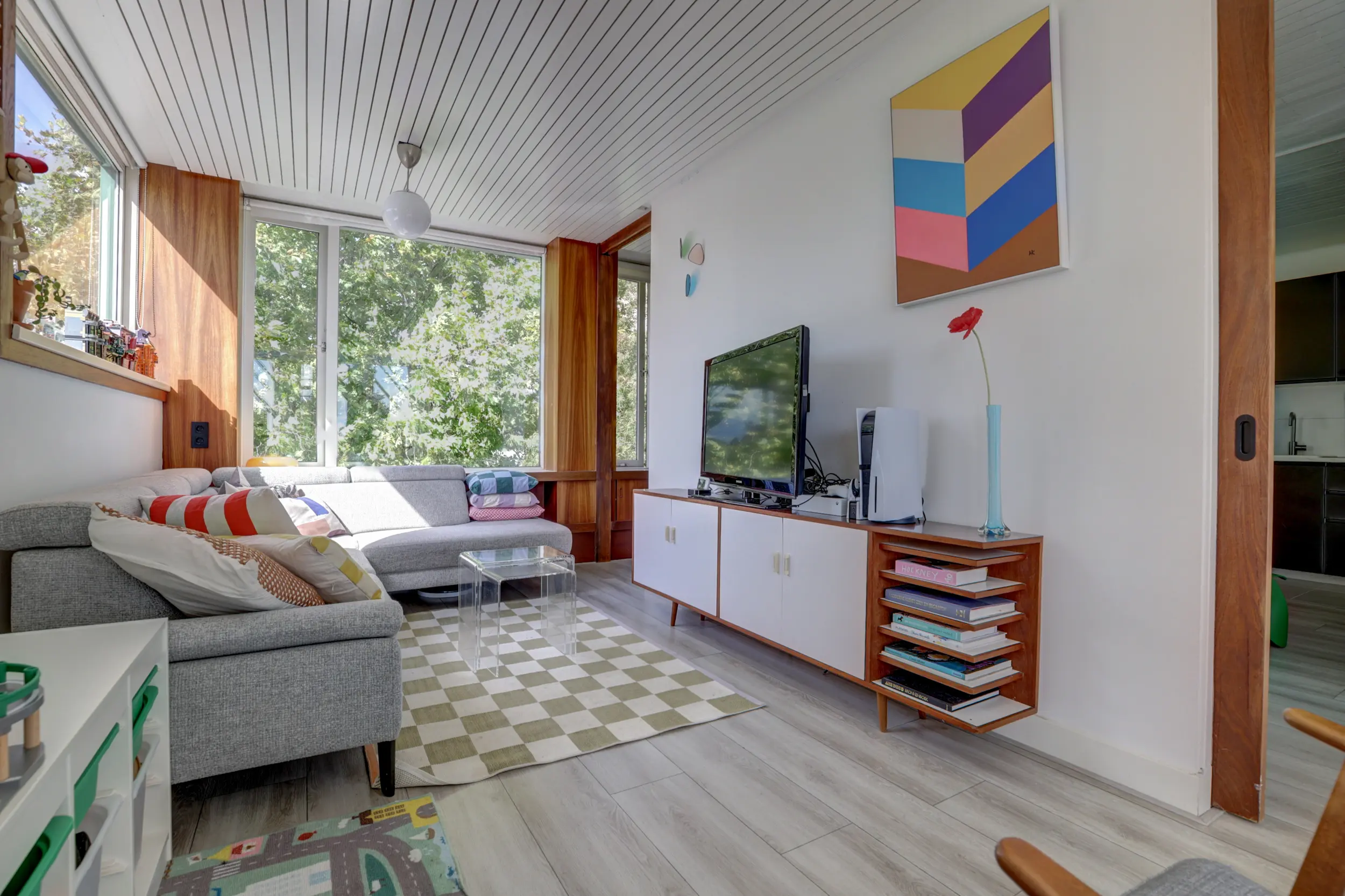 De woonkamer en slaapkamer zijn heerlijk licht dankzij de vele raampartijen, die zorgen voor een open en uitnodigende sfeer in het hele penthouse.