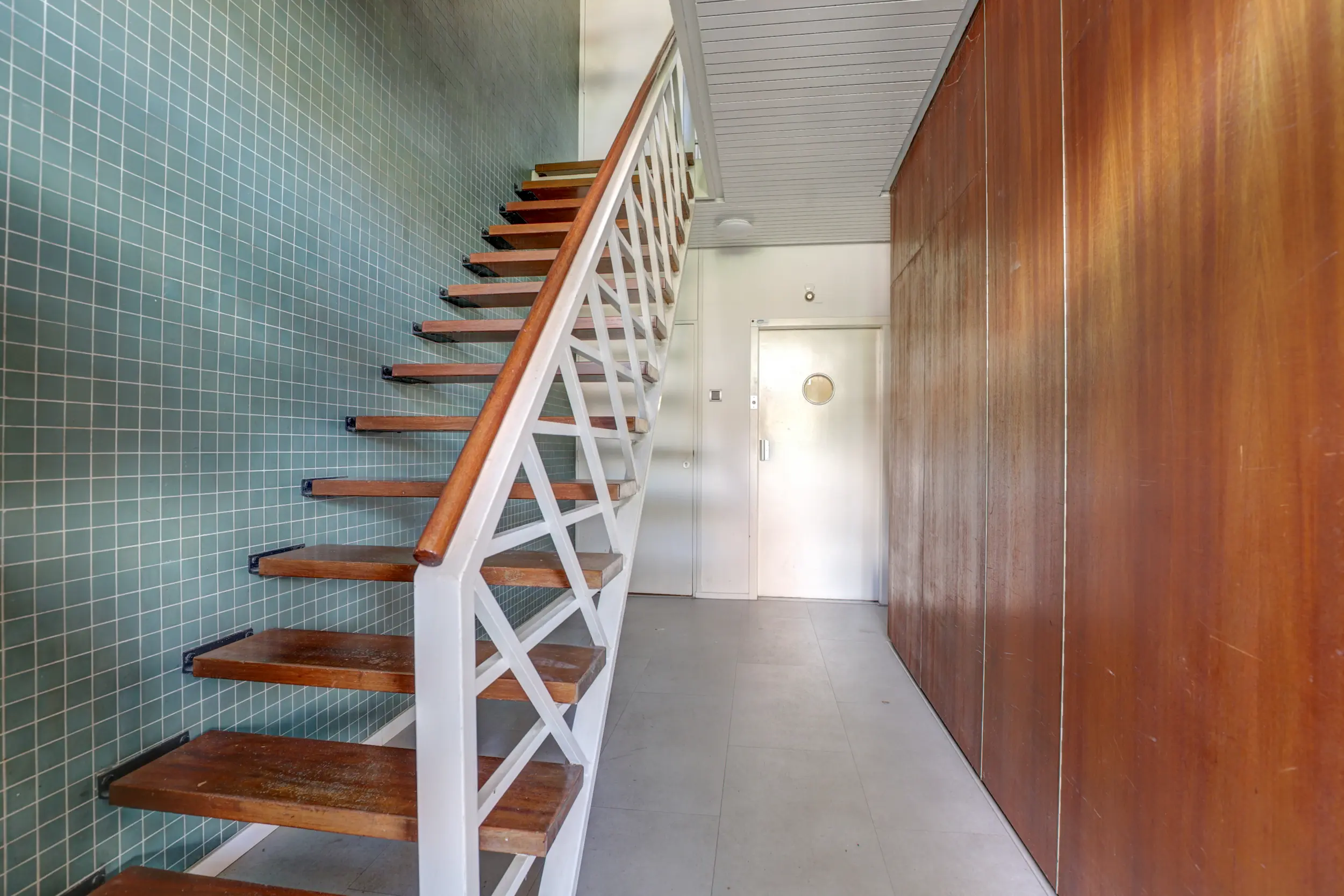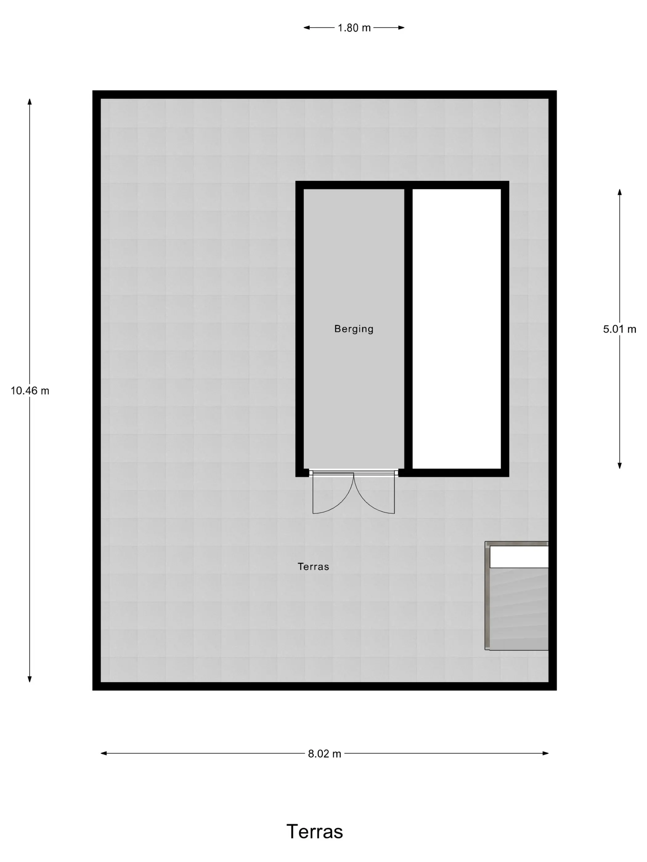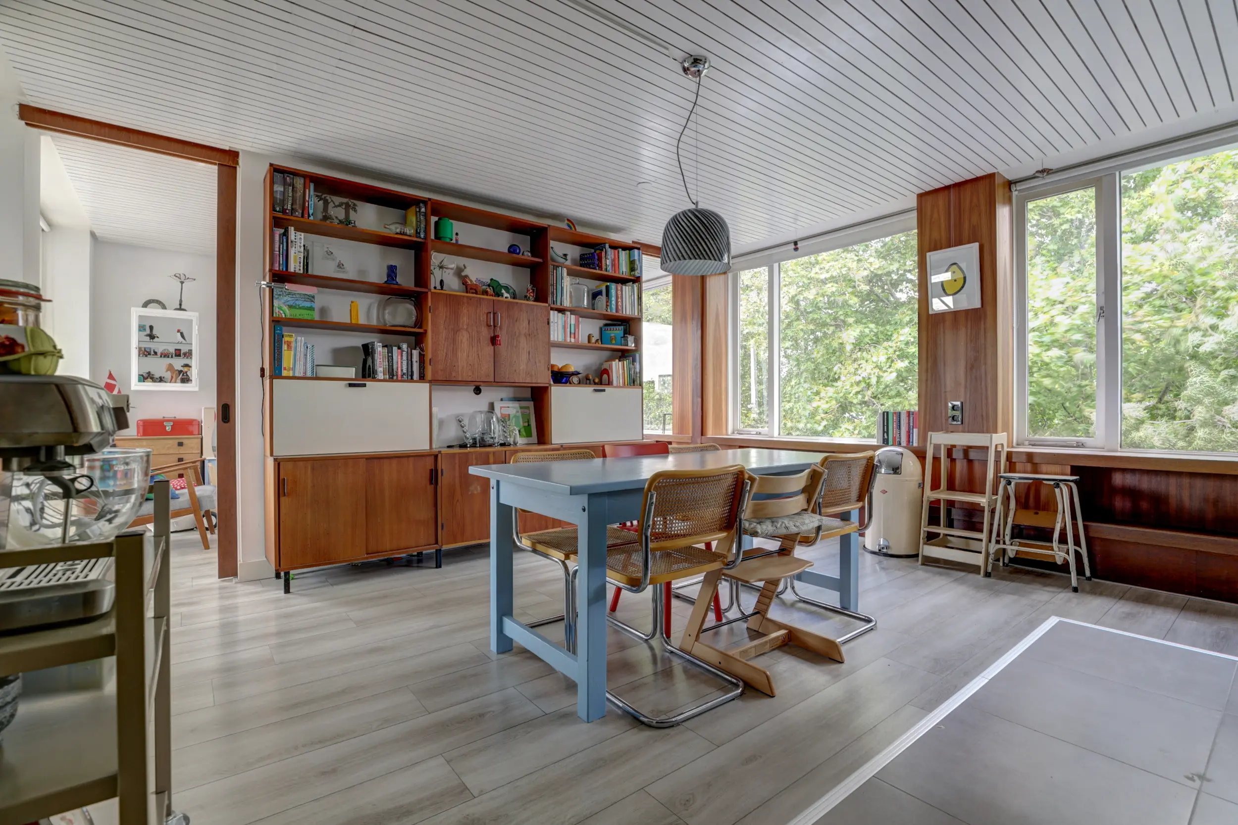 Vanuit de eetkamer leidt een loopdeur naar buiten, waar een trap je brengt naar het indrukwekkende zonneterras met berging. Hier geniet je optimaal van de zon en het buitenleven, helemaal privé en met volop ruimte.