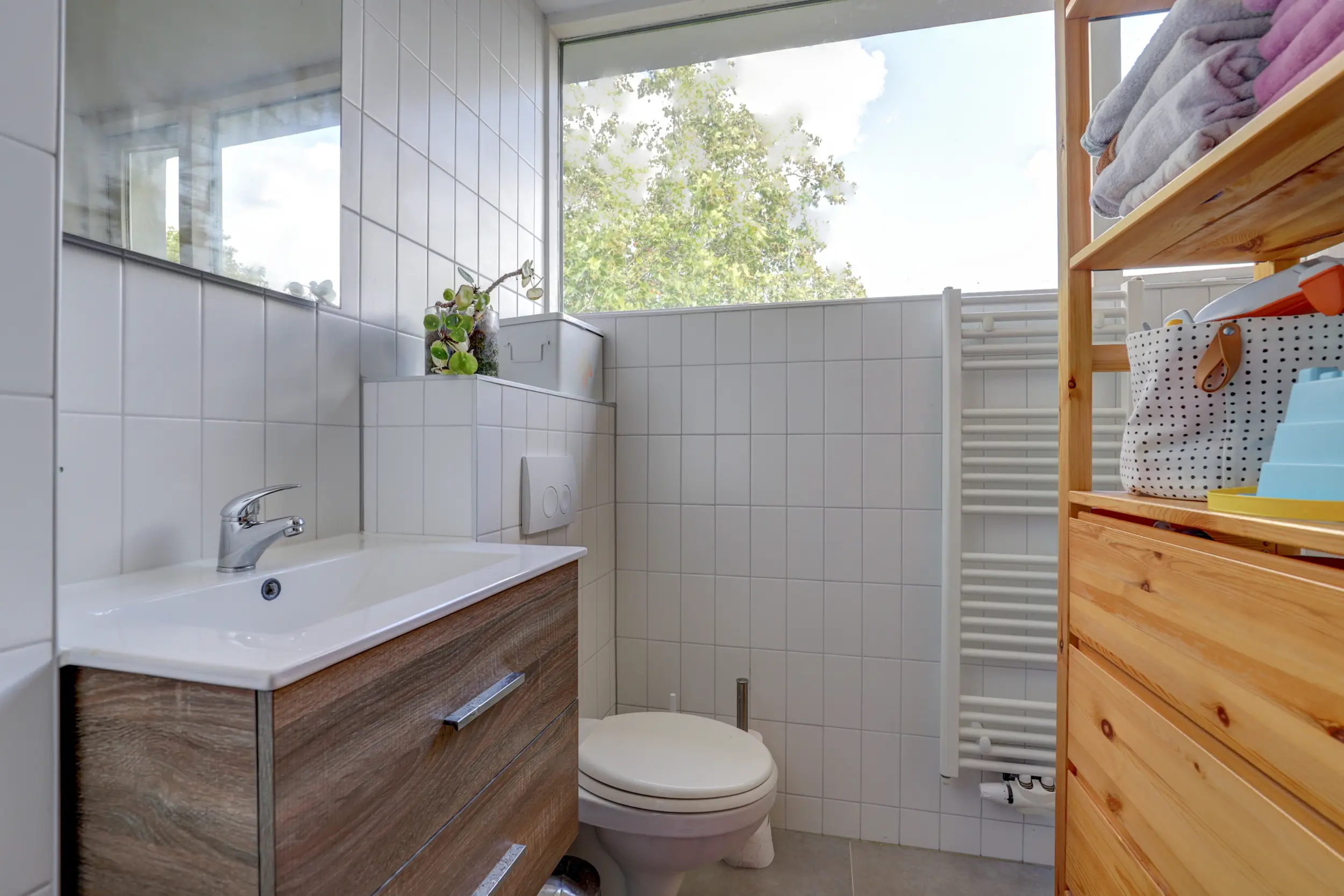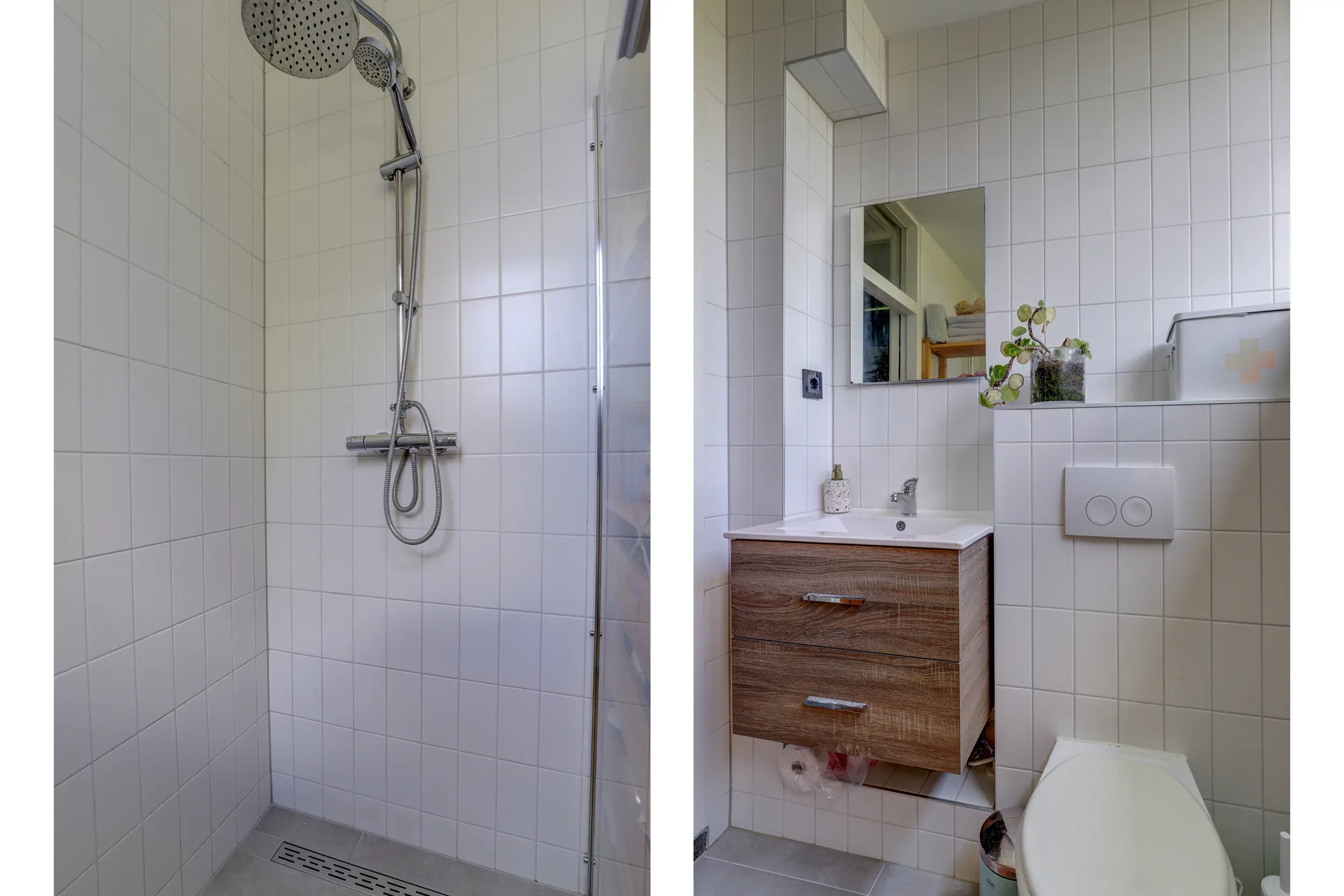 De badkamer is voorzien van een douche, toilet en een wastafelmeubel.