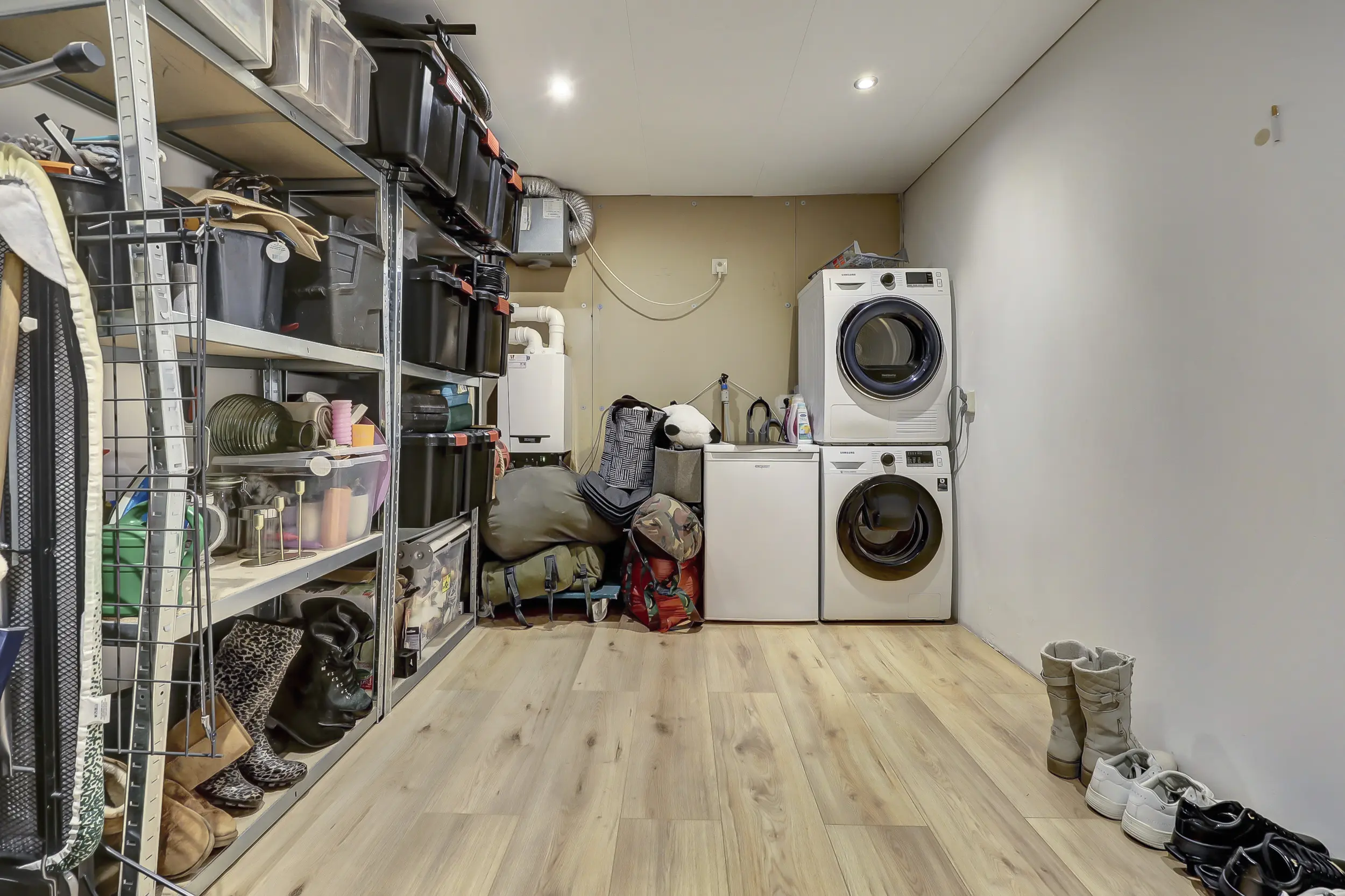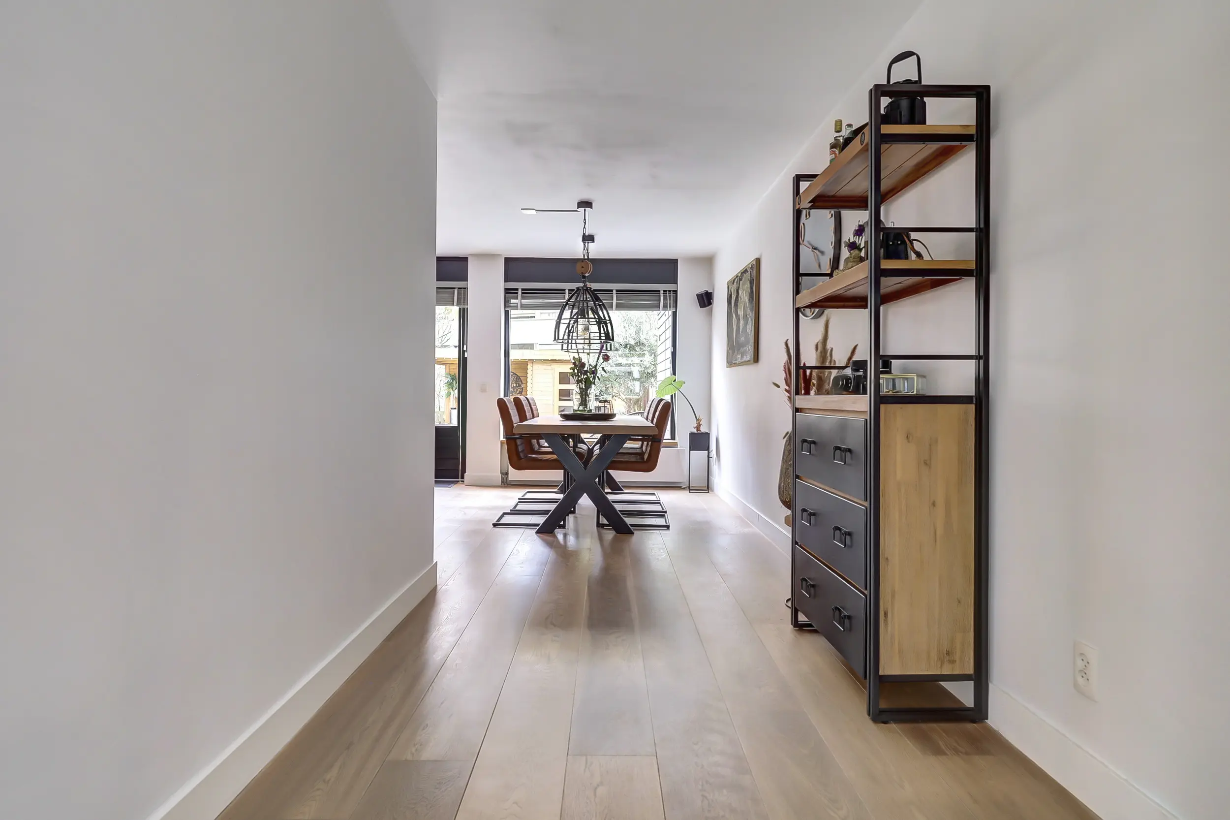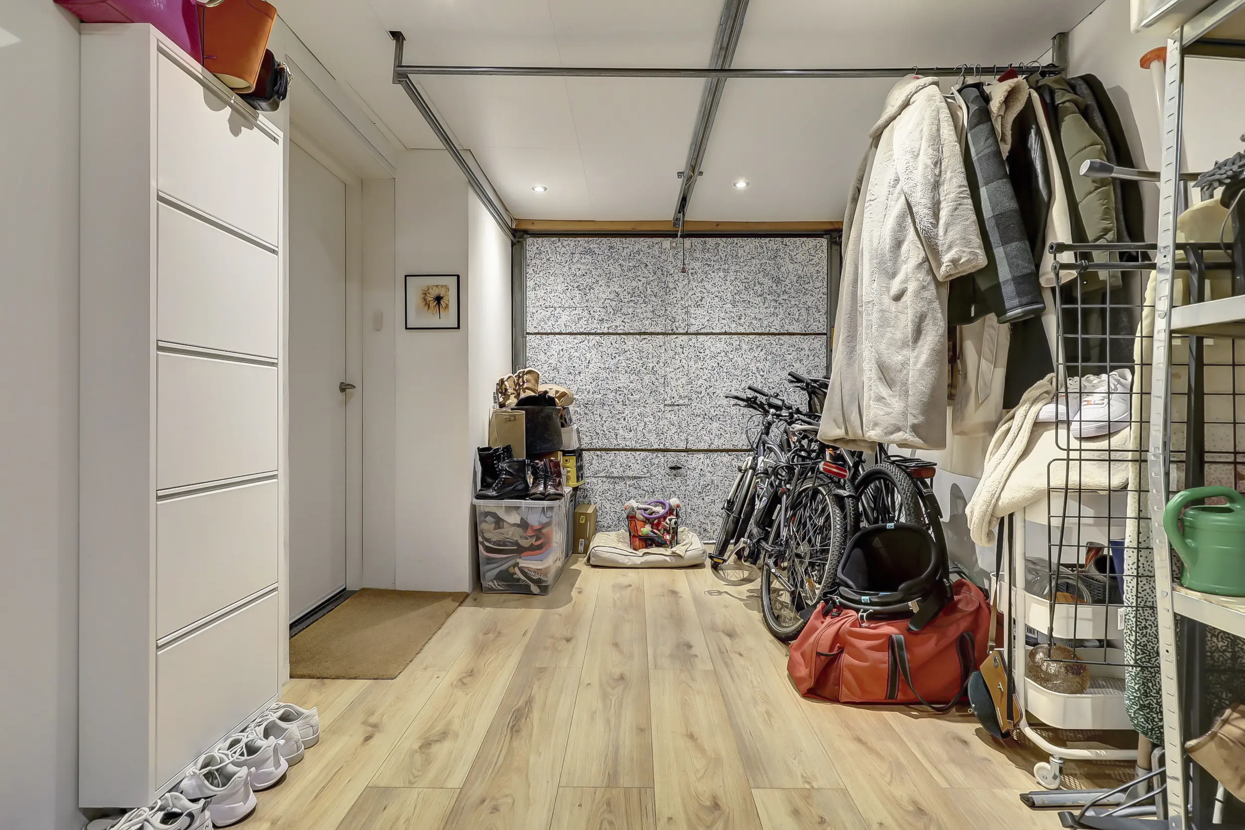 Via de heerlijke ruime entree word je direct welkom geheten in deze comfortabele woning. De hal beschikt over een volledig betegelde toiletruimte met zwevend toilet en fonteintje en biedt toegang tot de inpandige garage. Deze multifunctionele ruimte heeft niet alleen plaats voor een auto, maar herbergt ook de witgoedaansluitingen en de opstelling van de CV. Ideaal voor een praktische woonindeling.