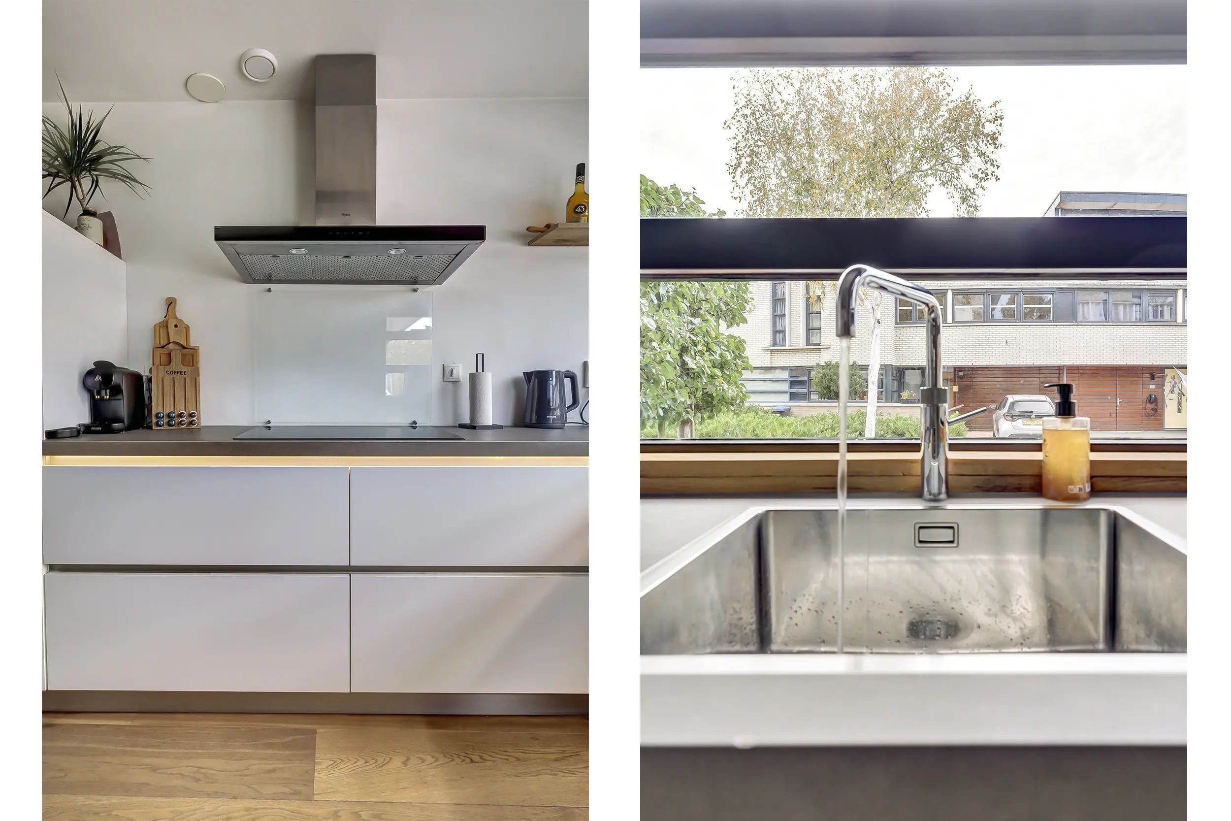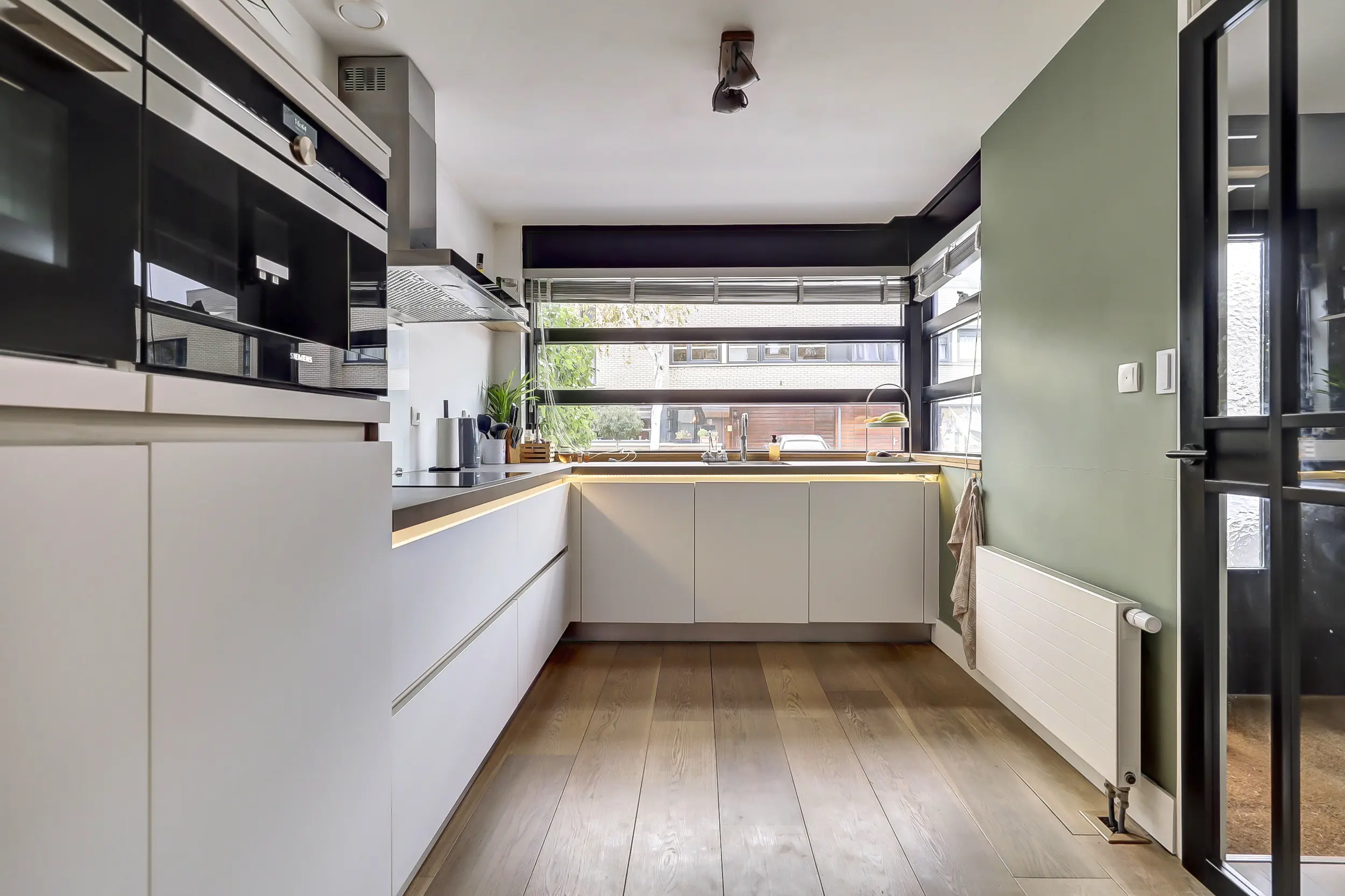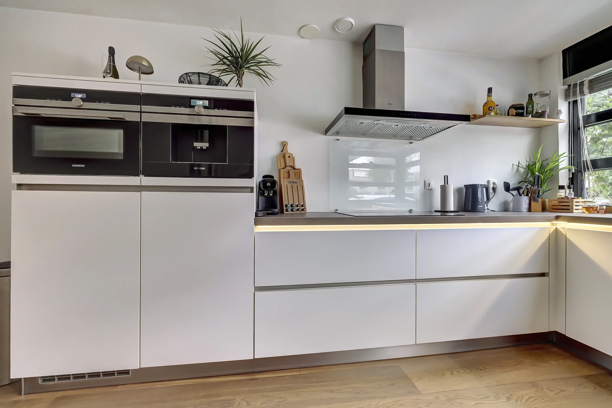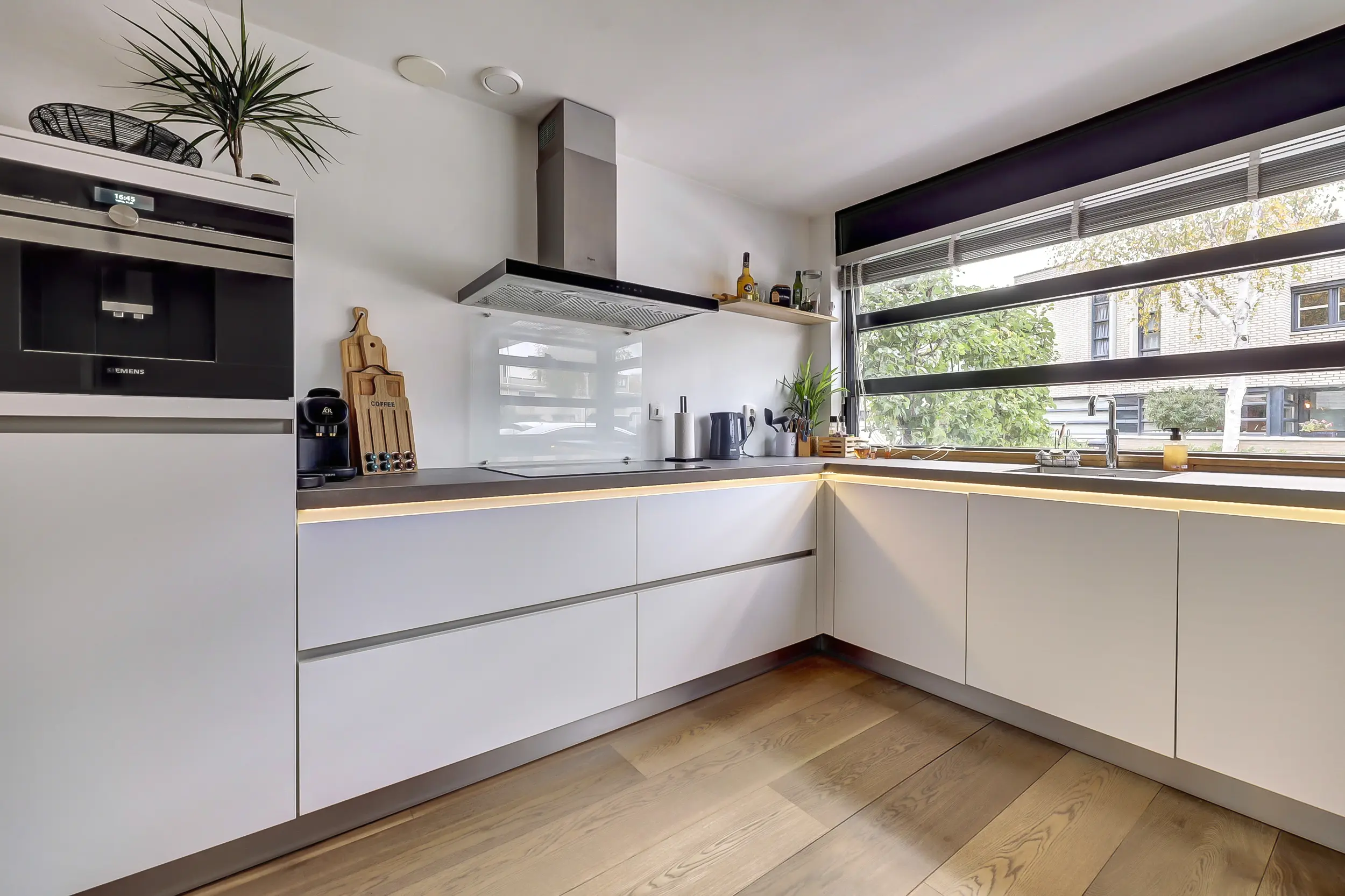 In de hal bevindt zich tevens de trapopgang naar de eerste verdieping, met onder de trap een bijzonder ruime trapkast. Vanuit de hal bereik je de luxe keuken aan de voorzijde van de woning. Deze royale keuken is voorzien van sfeervolle verlichting onder het blad en alle denkbare inbouwapparatuur, waaronder een ingebouwd koffieapparaat en een Quooker.