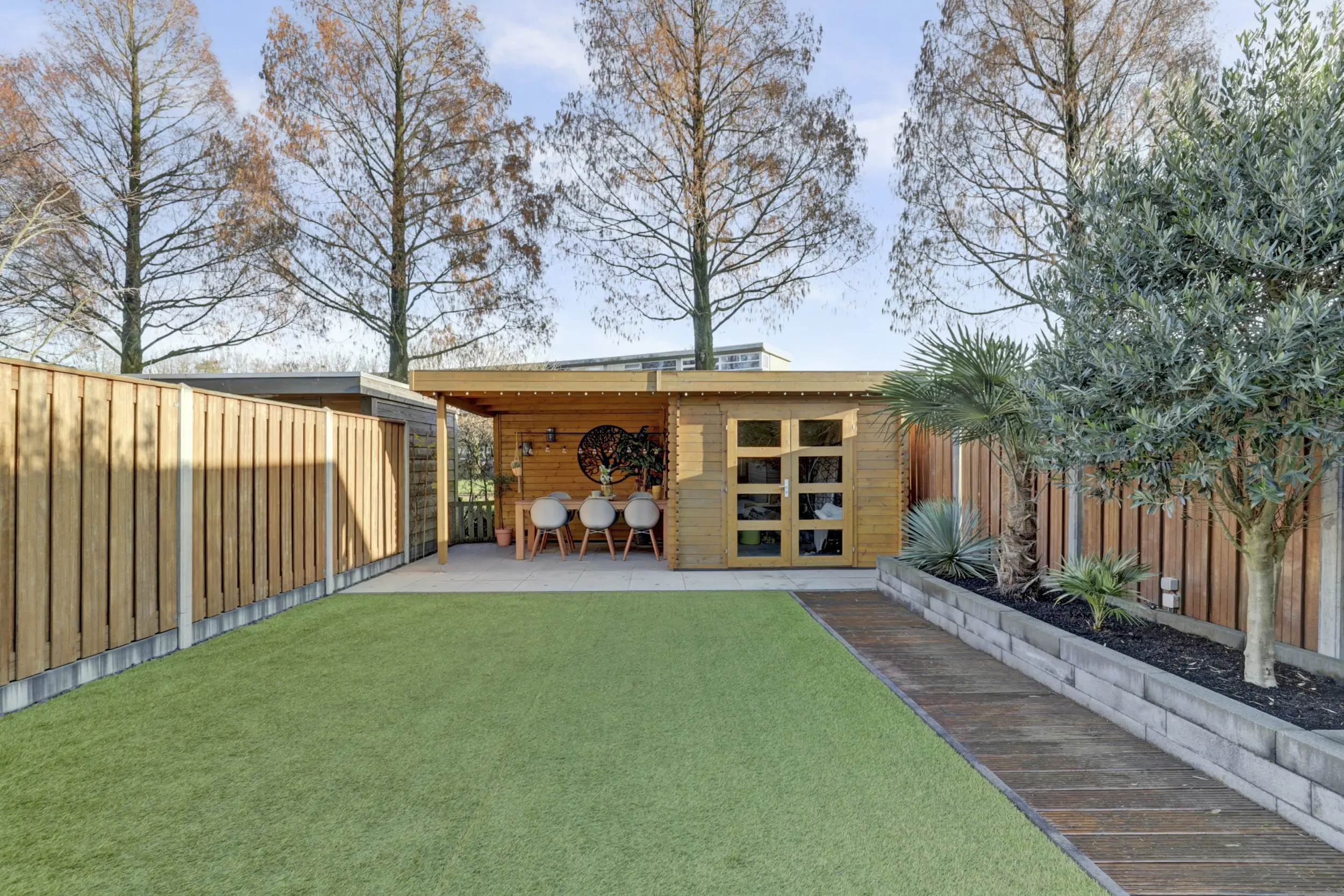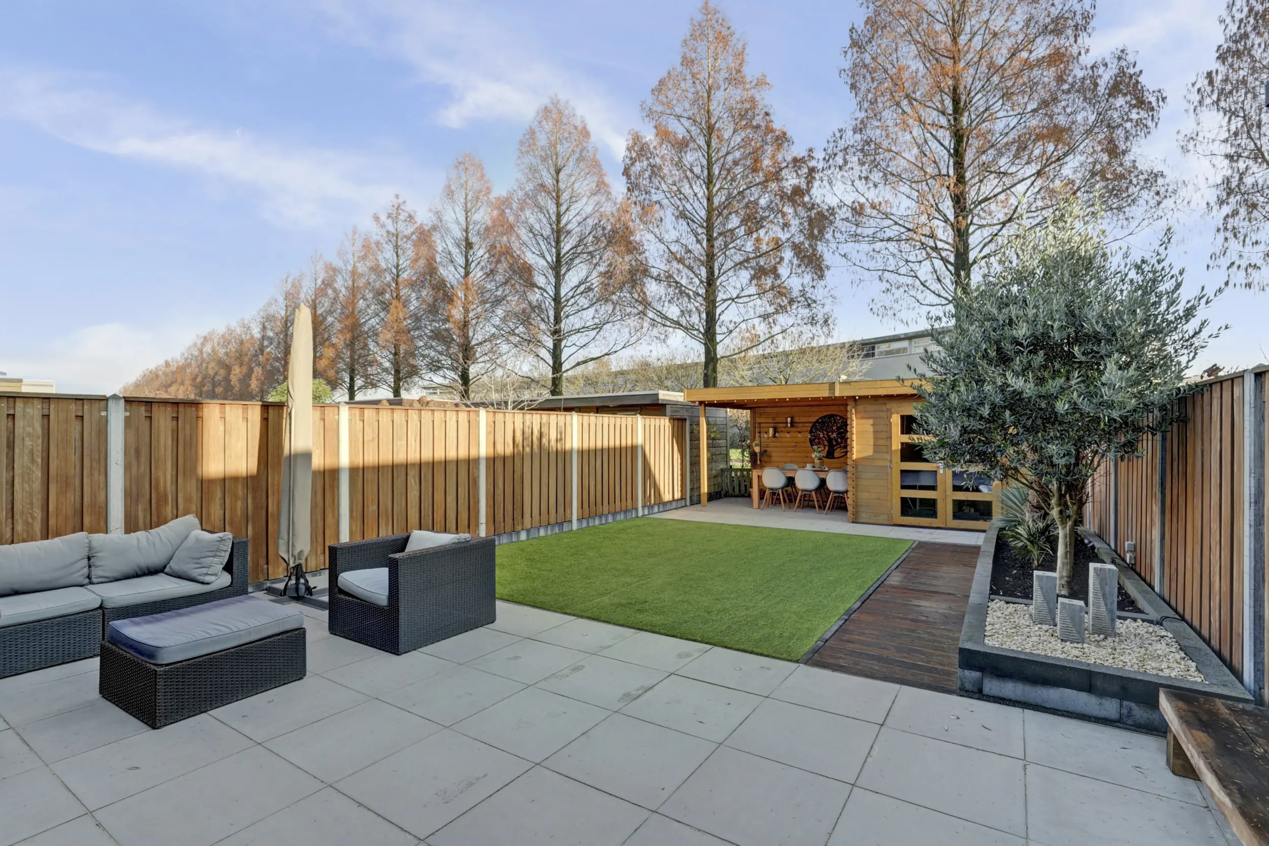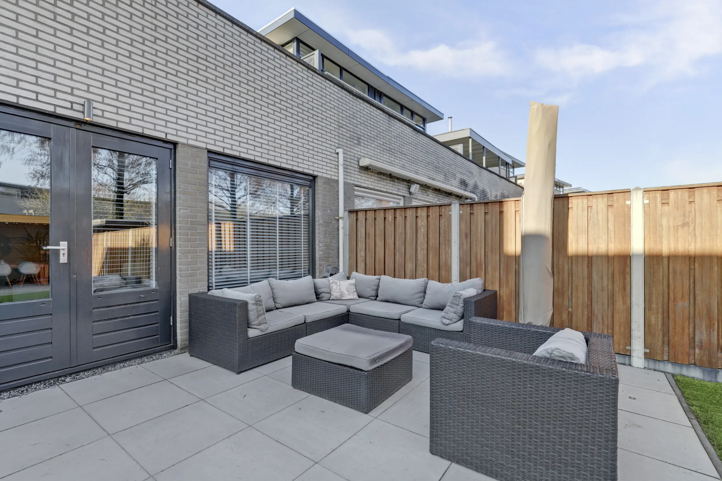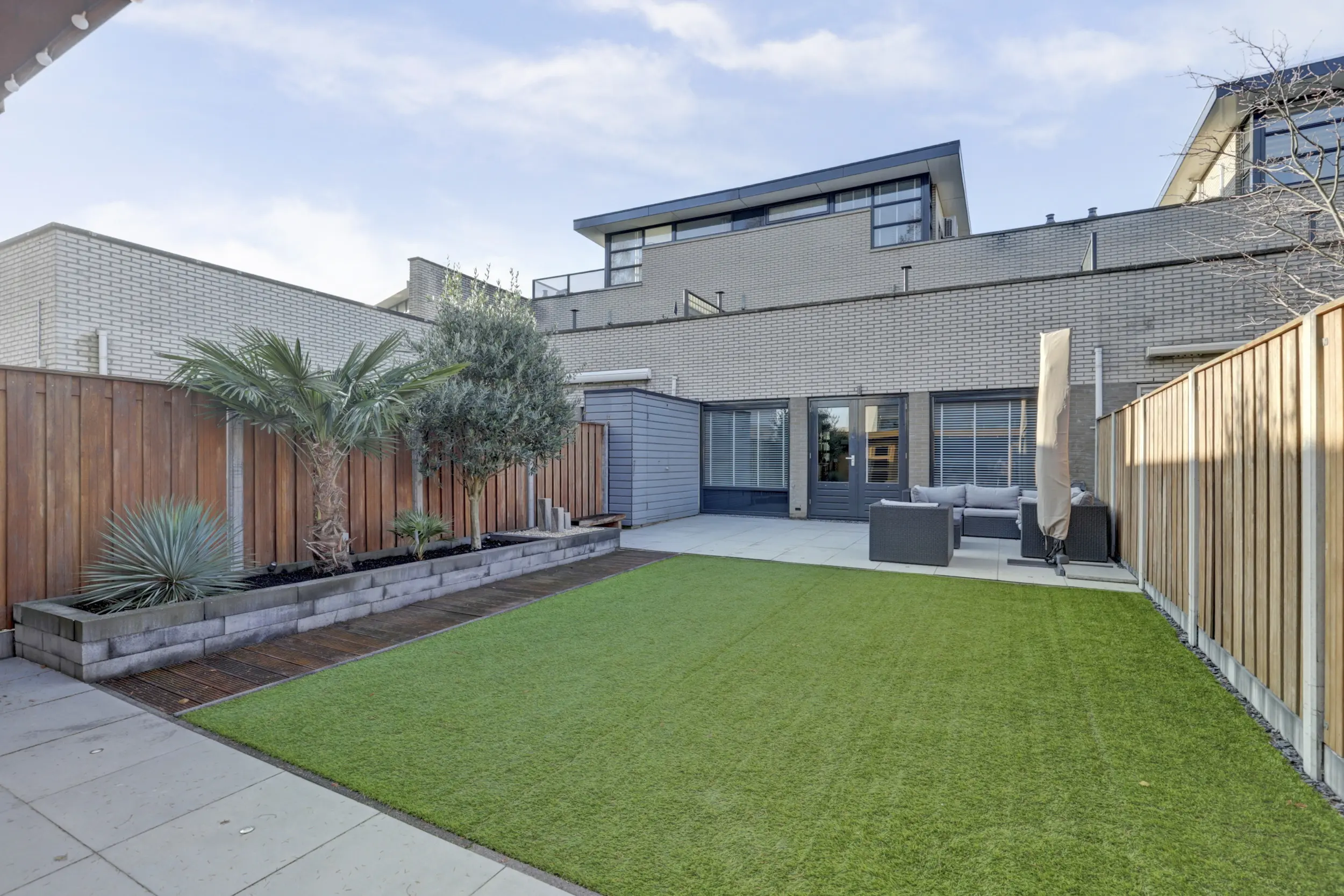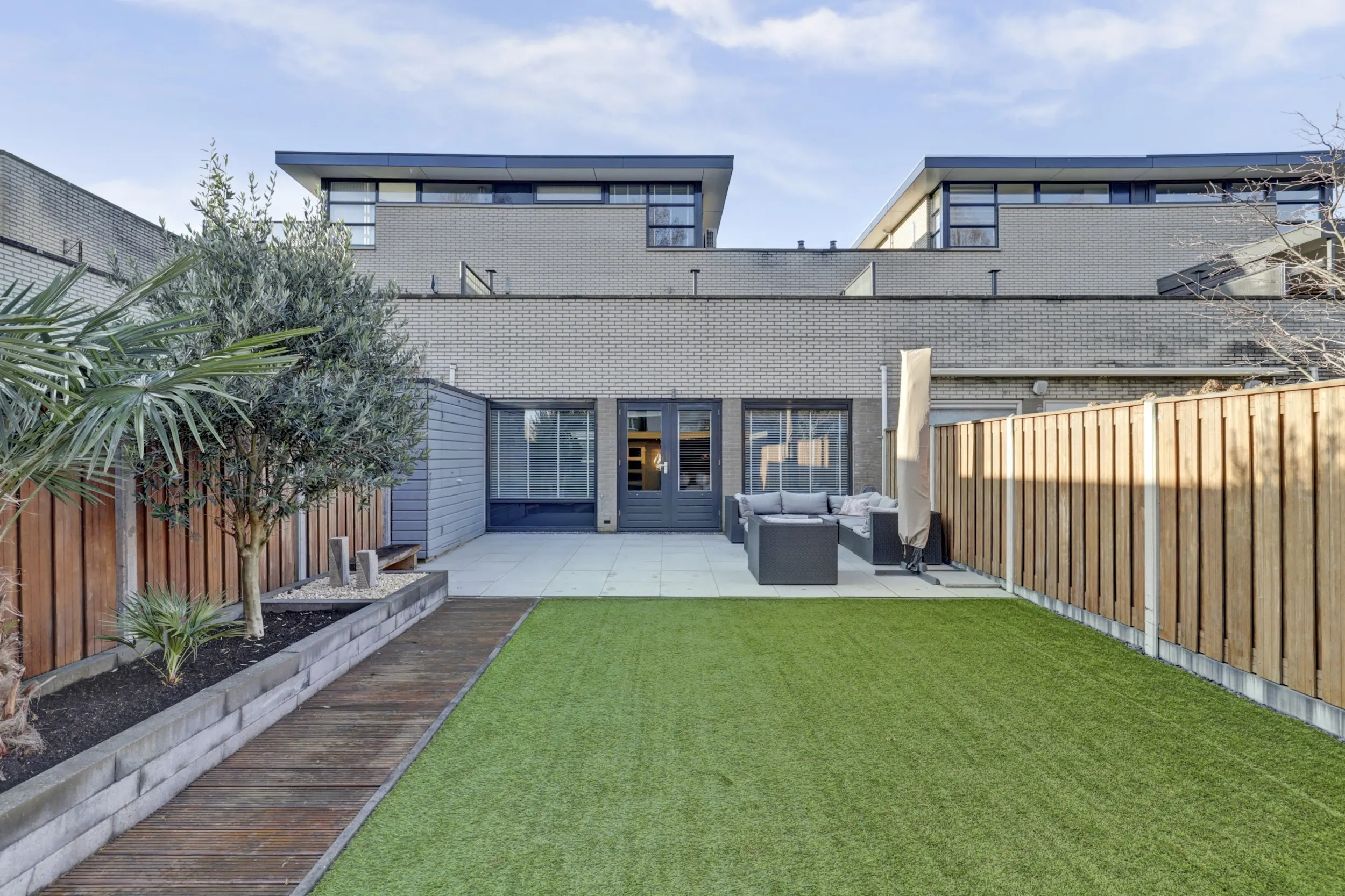 Voor de woning is ruimte om twee auto’s te parkeren. De achtertuin is tot in de puntjes verzorgd en ademt luxe en kwaliteit. Fraaie tegels, strakke borders, een solide schutting met betonnen palen en een tuinhuis met veranda maken dit de perfecte plek om te genieten. Dankzij de groenstrook en het fietspad achter de woning is rust én privacy gegarandeerd.