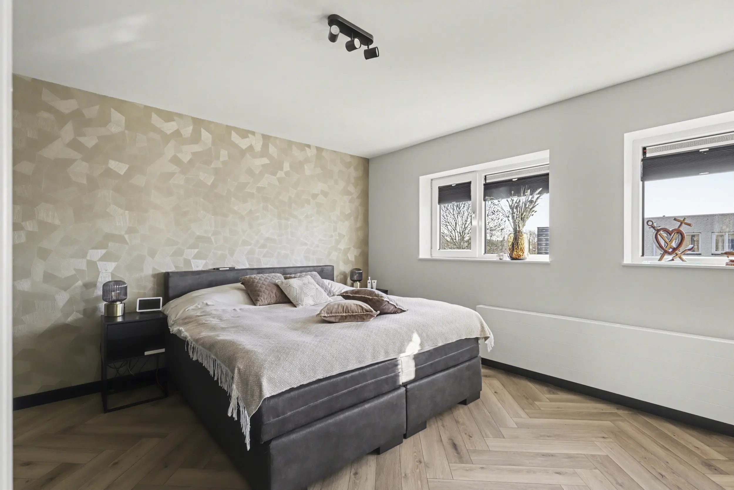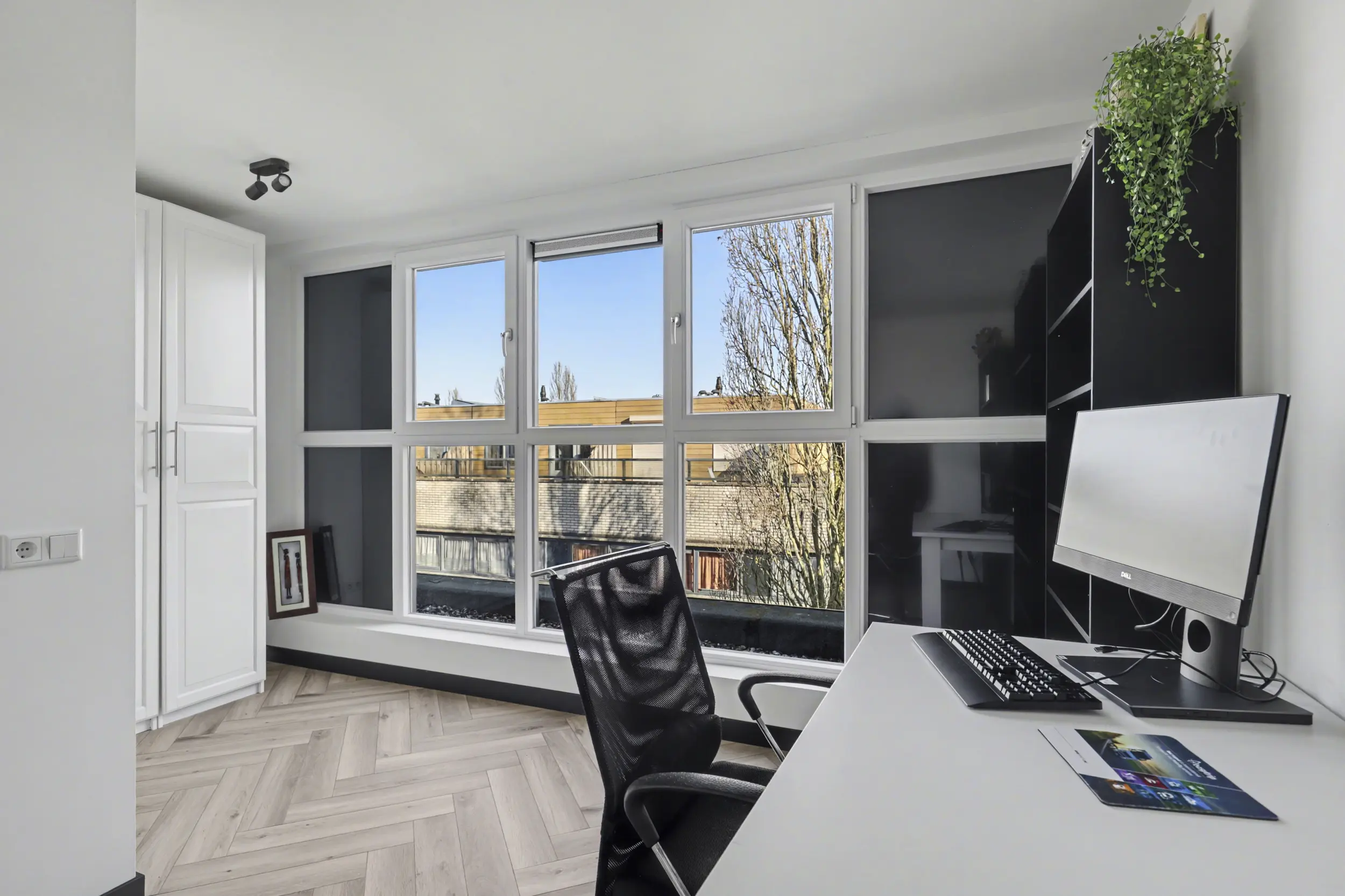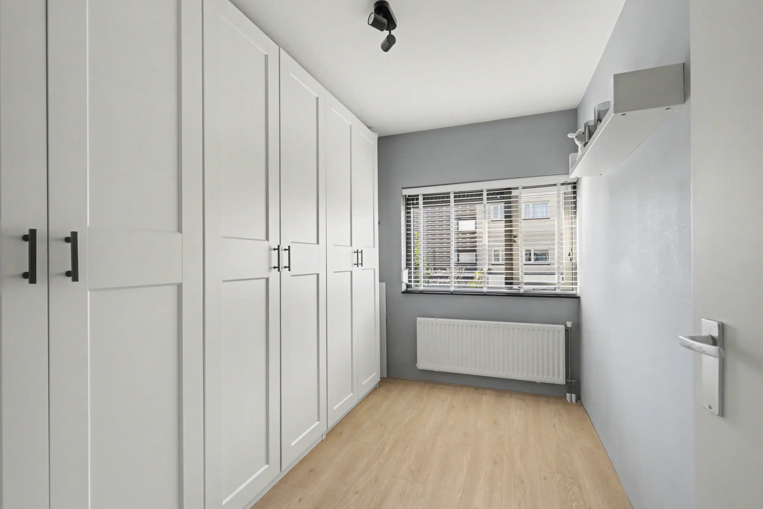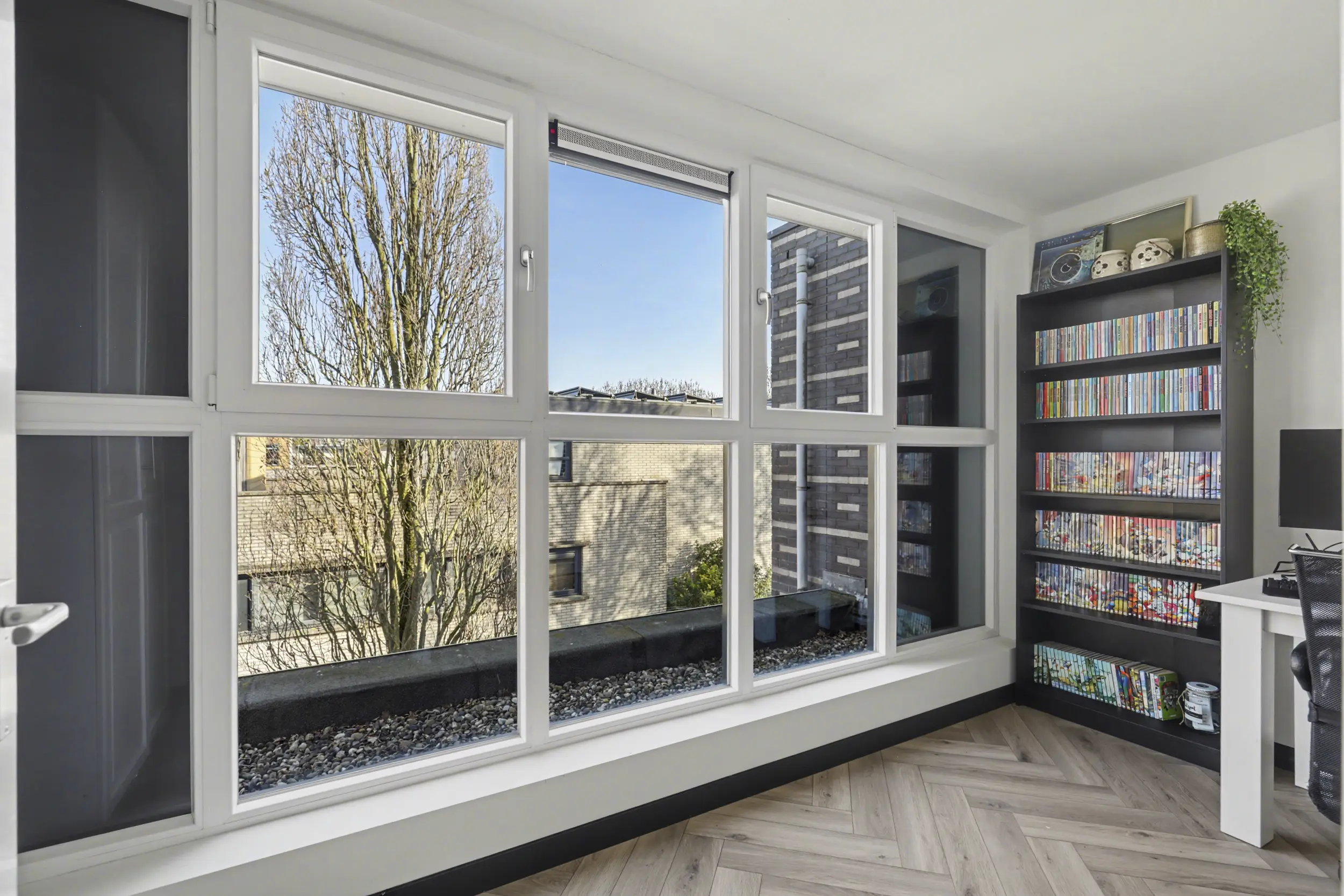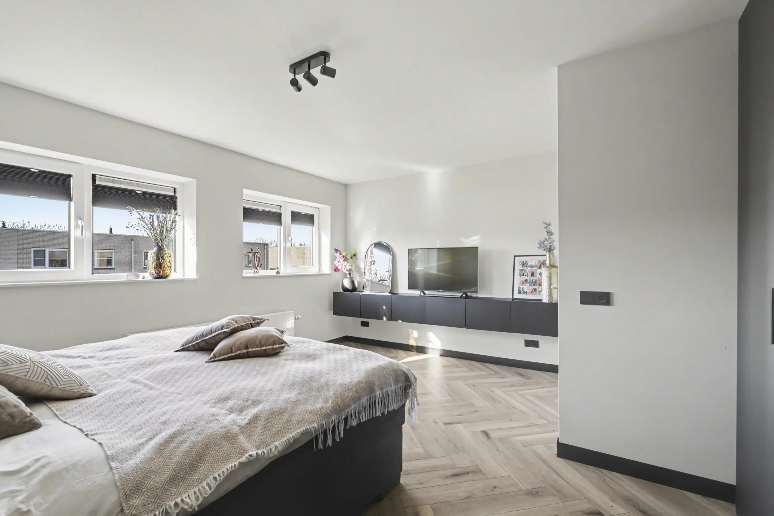 Aan de voorzijde bevindt zich een ruime slaapkamer met grote raampartijen, waaronder een raam dat bijna tot de vloer doorloopt en zorgt voor een prachtige lichtinval. Aan de achterzijde liggen nog twee goed bemeten slaapkamers, beide voorzien van rolluiken.