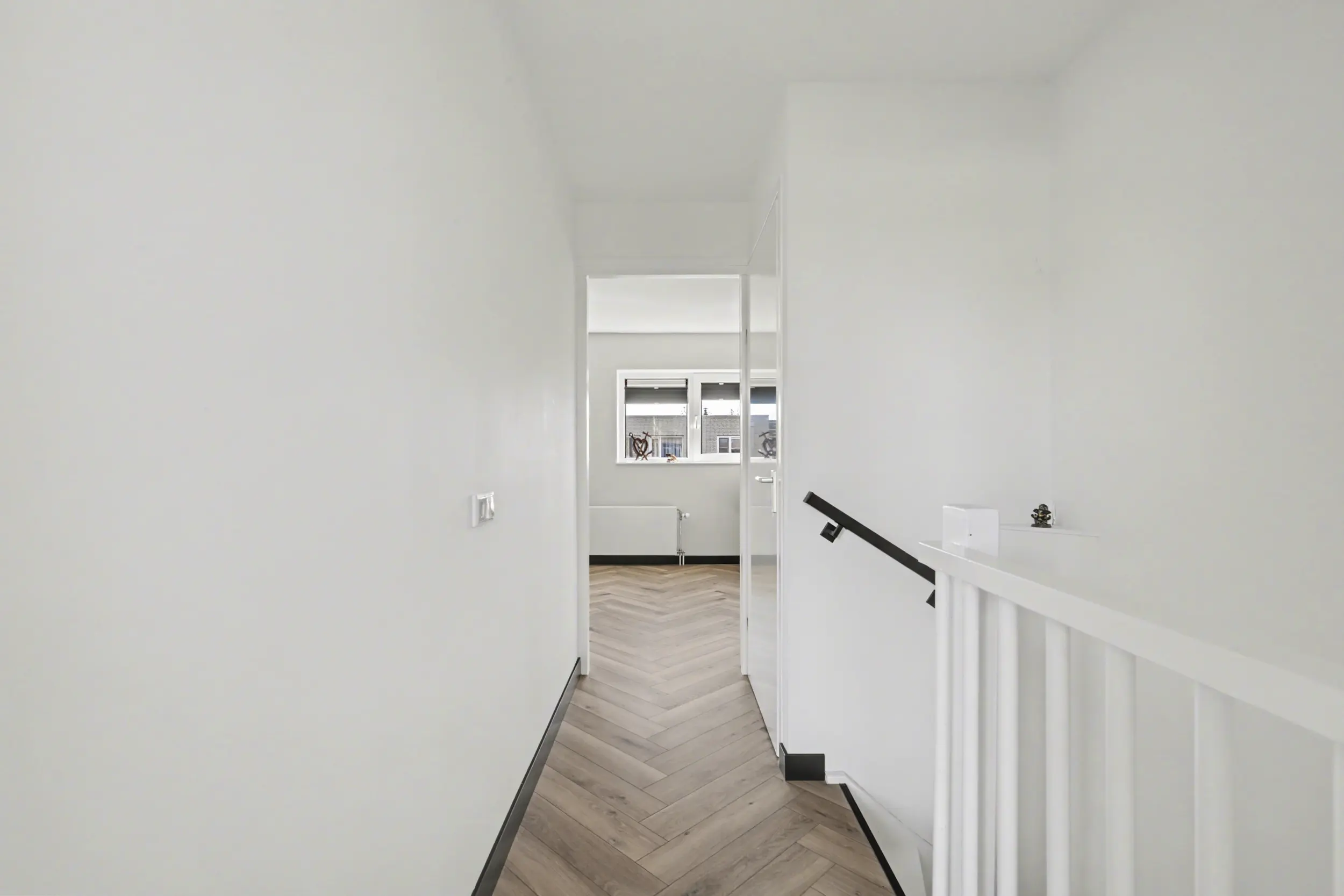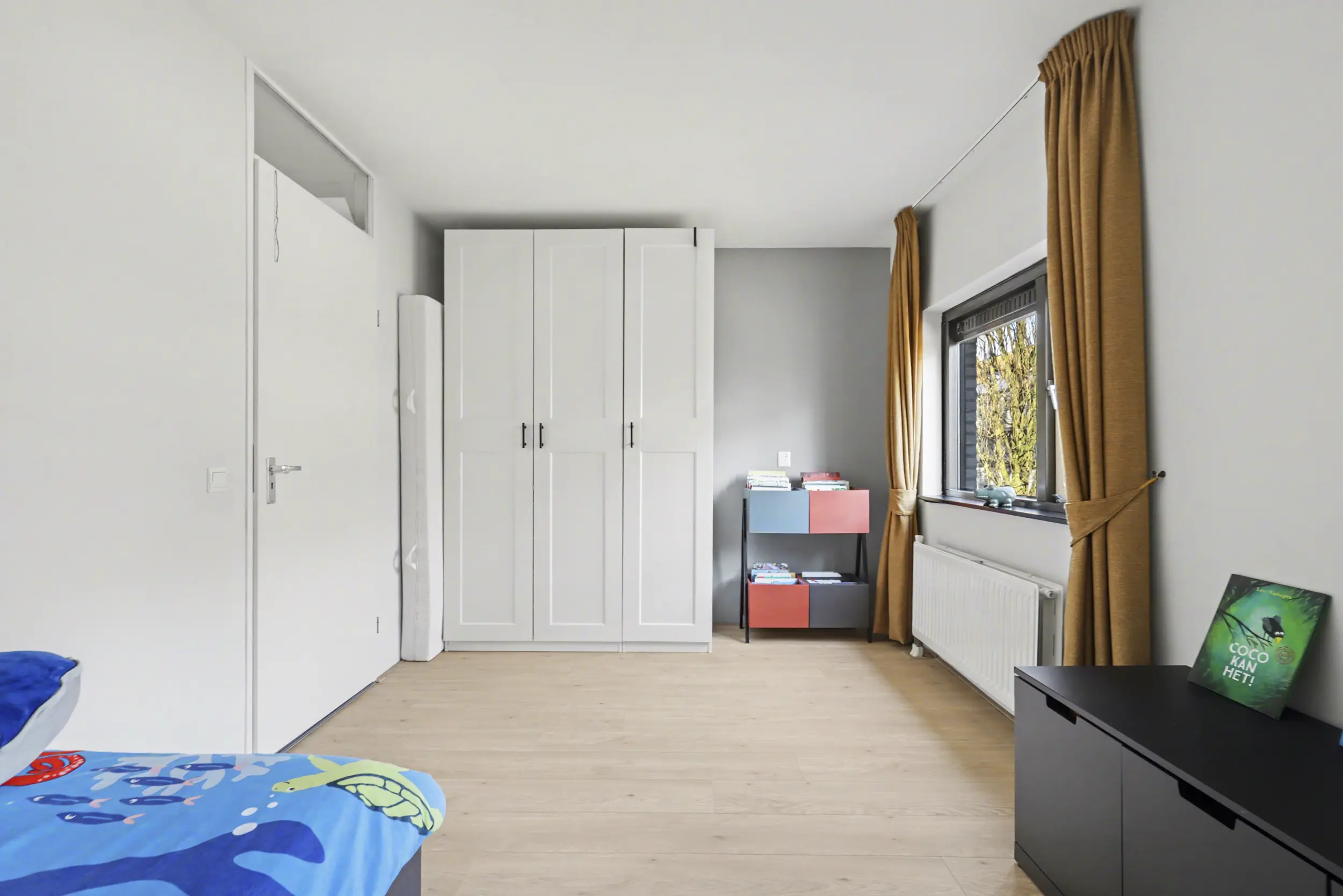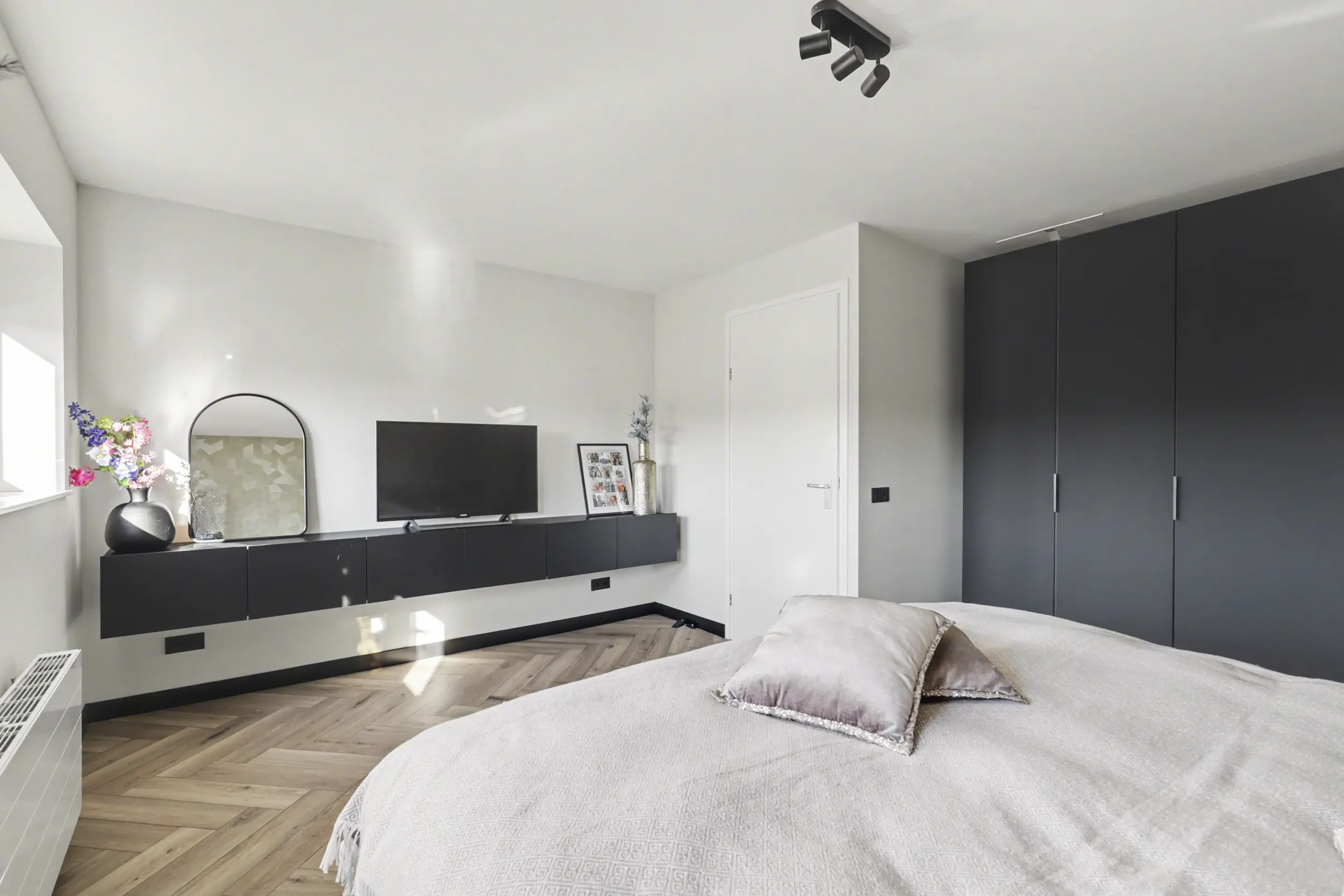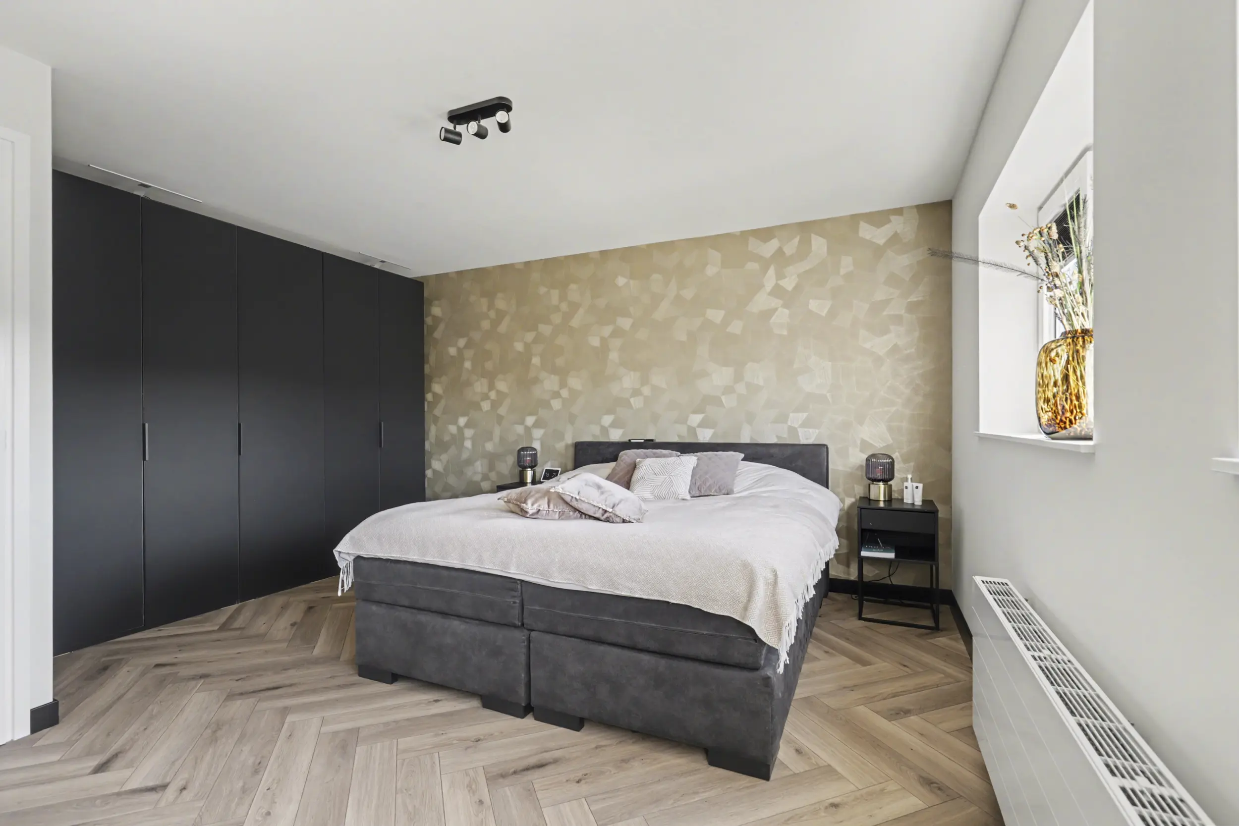 Aan de voorzijde bevindt zich een ruime slaapkamer met grote raampartijen, waaronder een raam dat bijna tot de vloer doorloopt en zorgt voor een prachtige lichtinval. Aan de achterzijde liggen nog twee goed bemeten slaapkamers, beide voorzien van rolluiken.