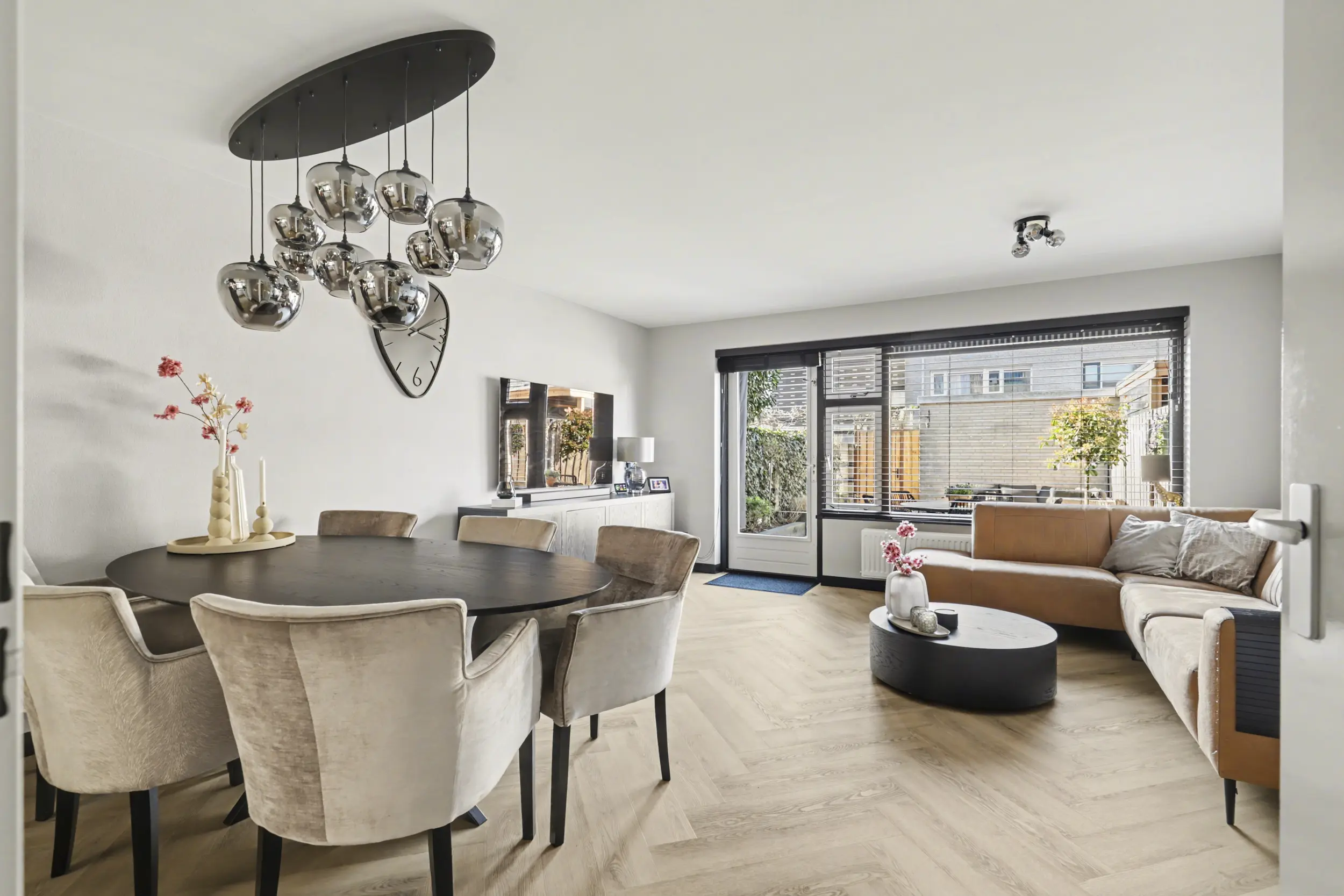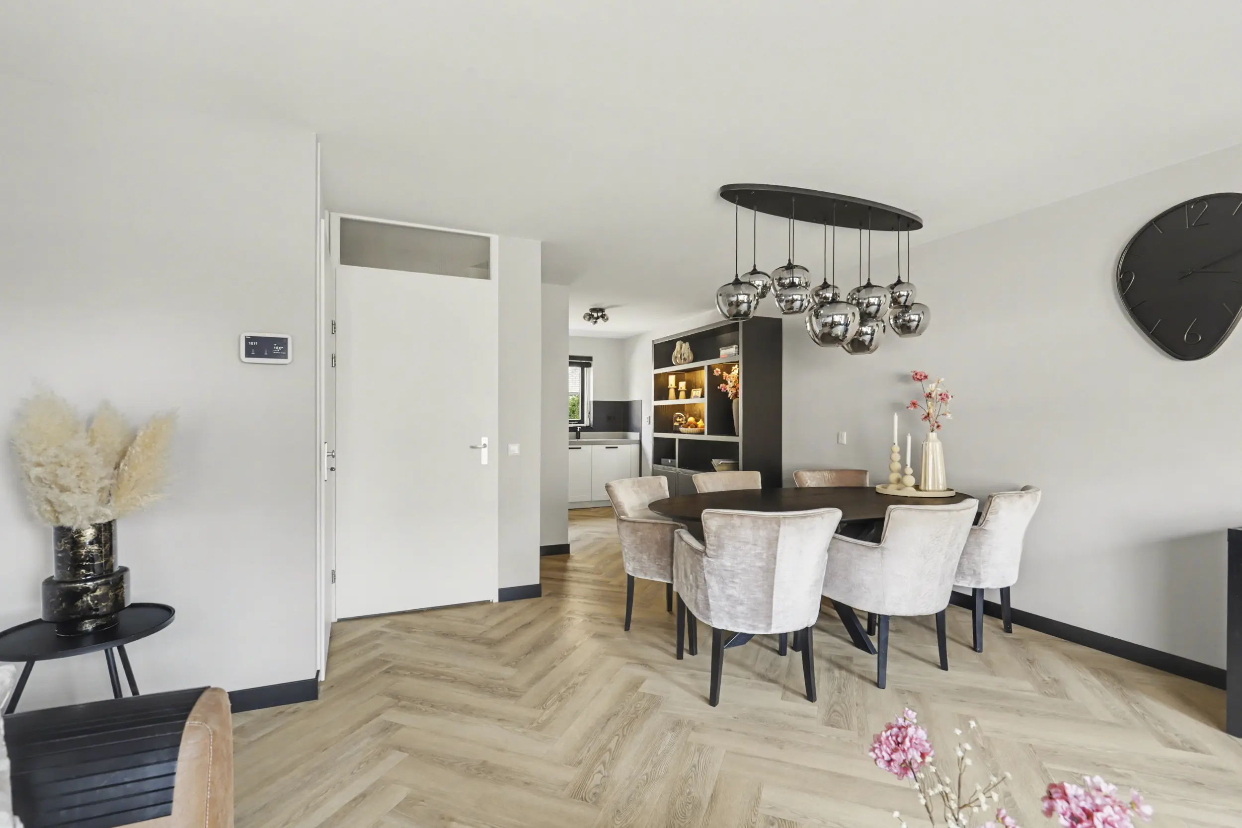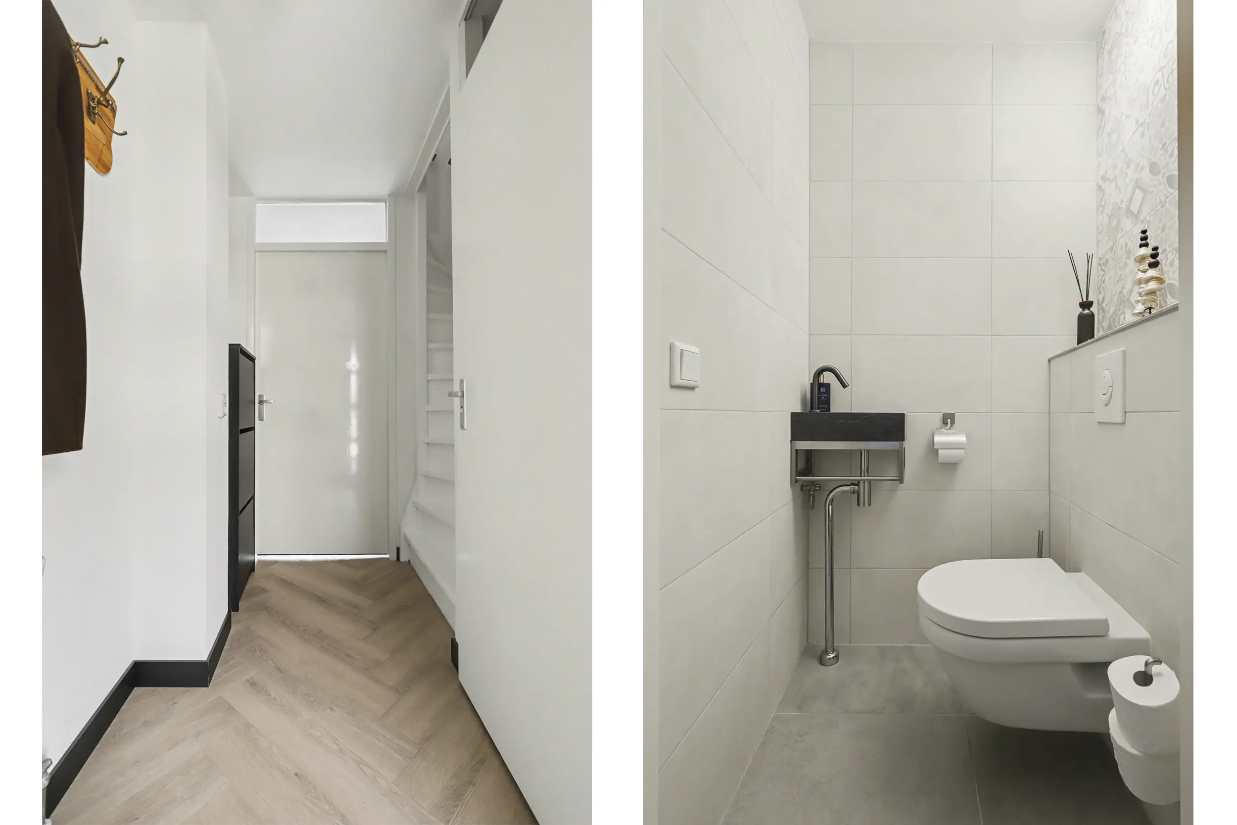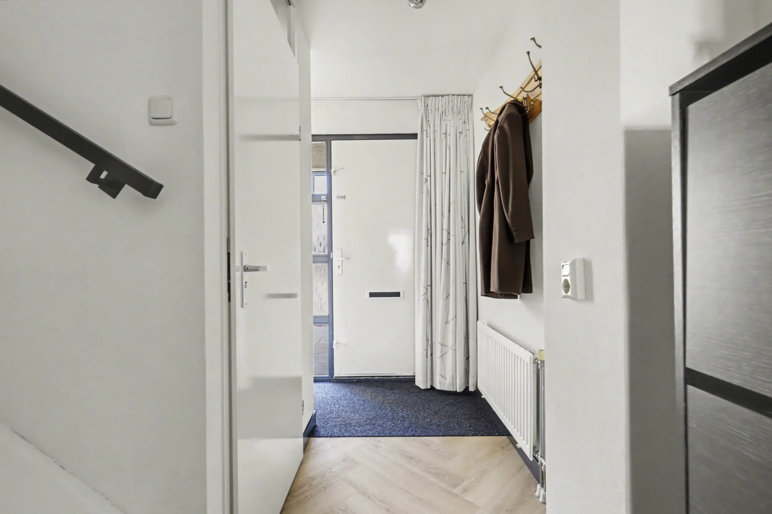 Bij binnenkomst treft u een ruime entree met voldoende plaats voor een garderobe. De luxe toiletruimte is voorzien van een zwevend toilet en een fontein. De tuingerichte woonkamer is een echte eyecatcher; strak gestucte wanden en een fraaie visgraat pvc-vloer zorgen voor een warme en moderne uitstraling. De praktische trapkast biedt extra bergruimte. Via de openslaande deur bereikt u de verzorgde achtertuin, waar het heerlijk vertoeven is.