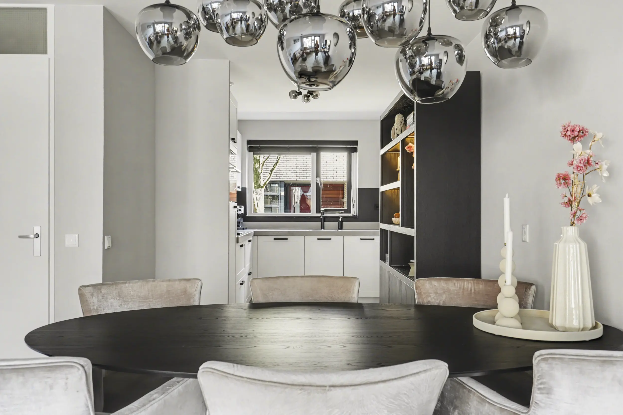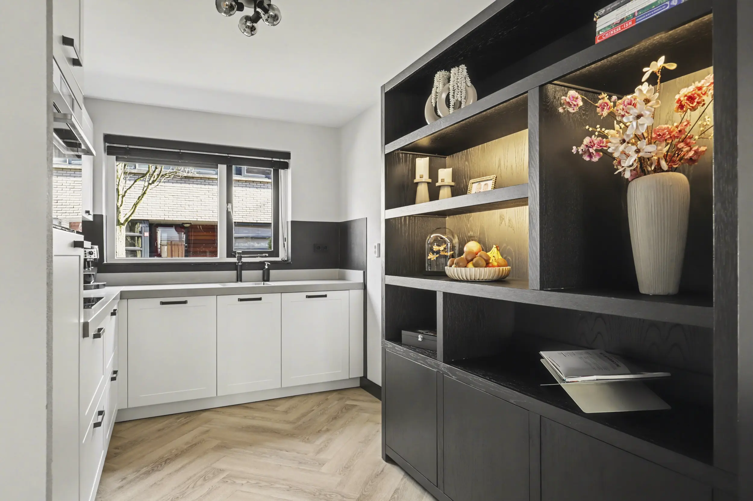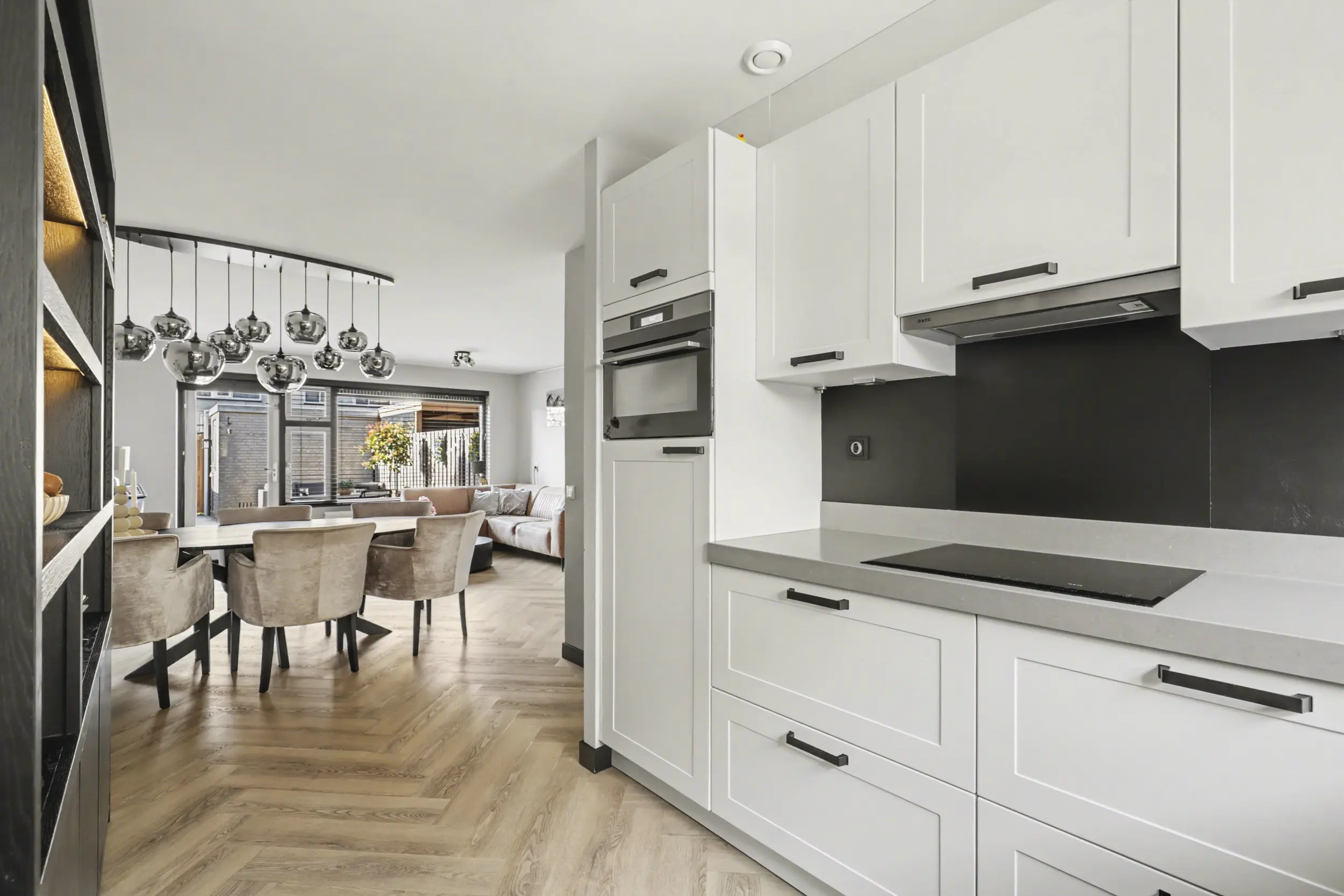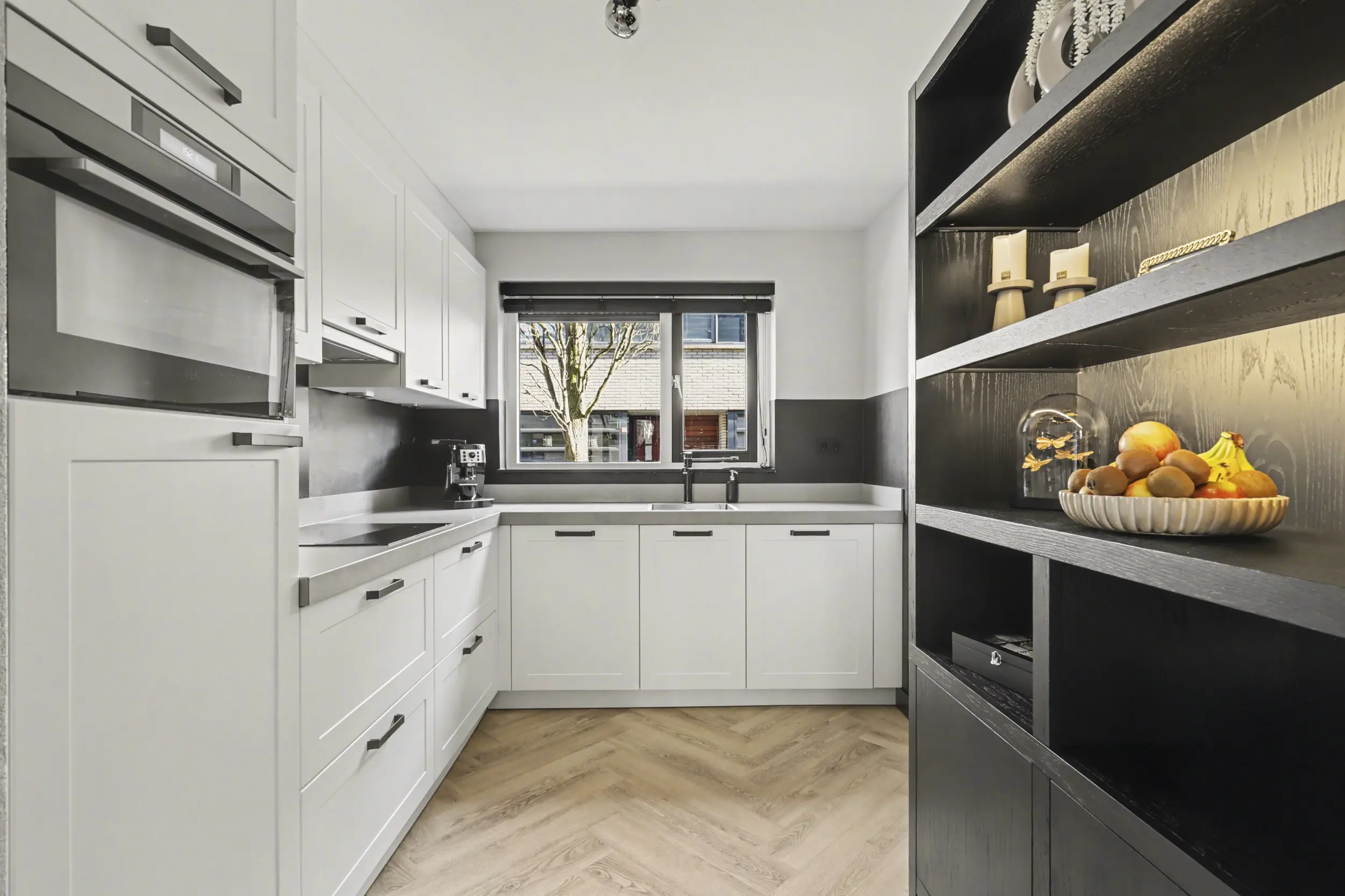 De keuken bevindt zich aan de voorzijde van de woning en biedt vrij uitzicht op het wandelpad. Deze moderne keuken (2019) is voorzien van diverse inbouwapparatuur en beschikt over veel kastruimte, ideaal voor de kookliefhebber.