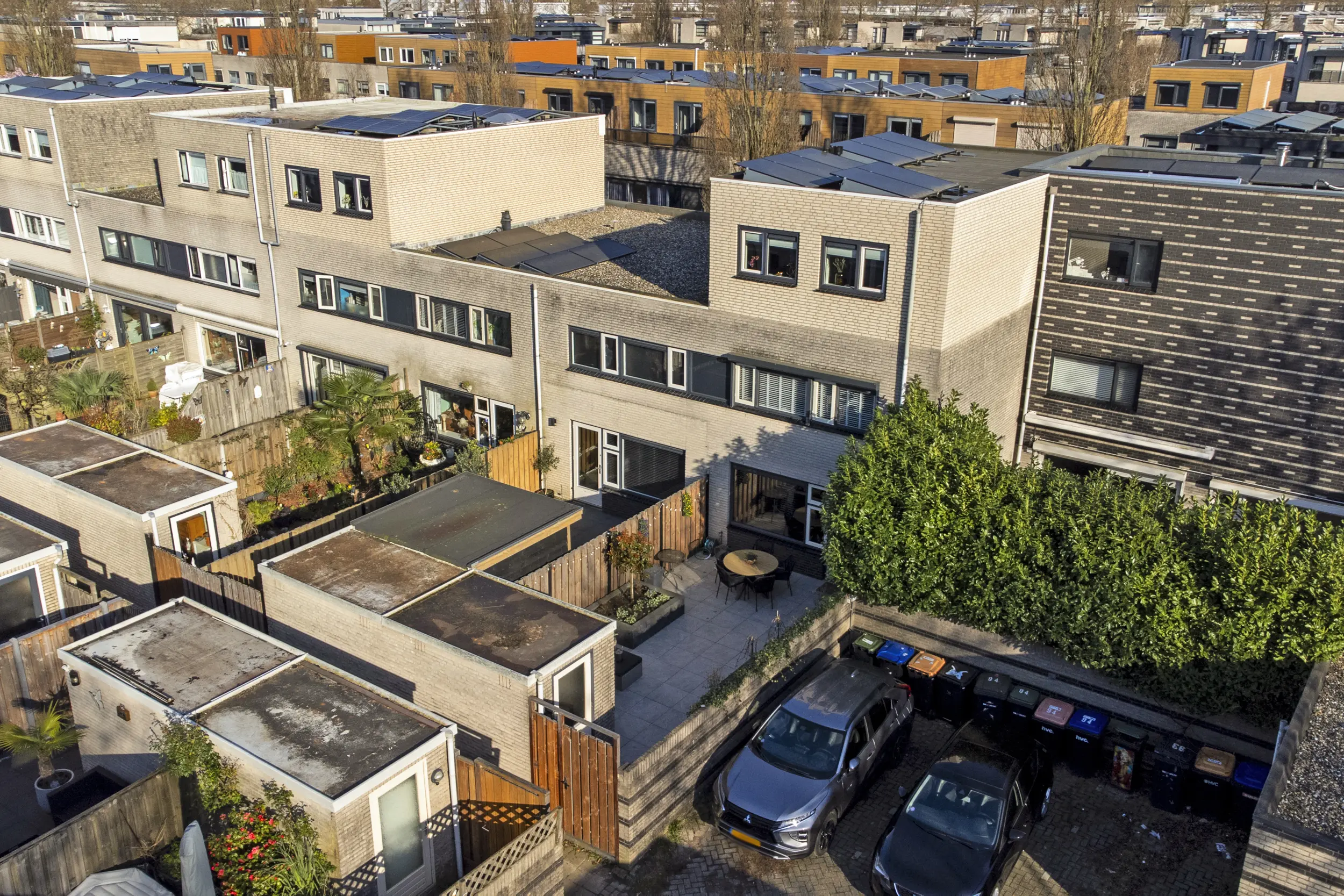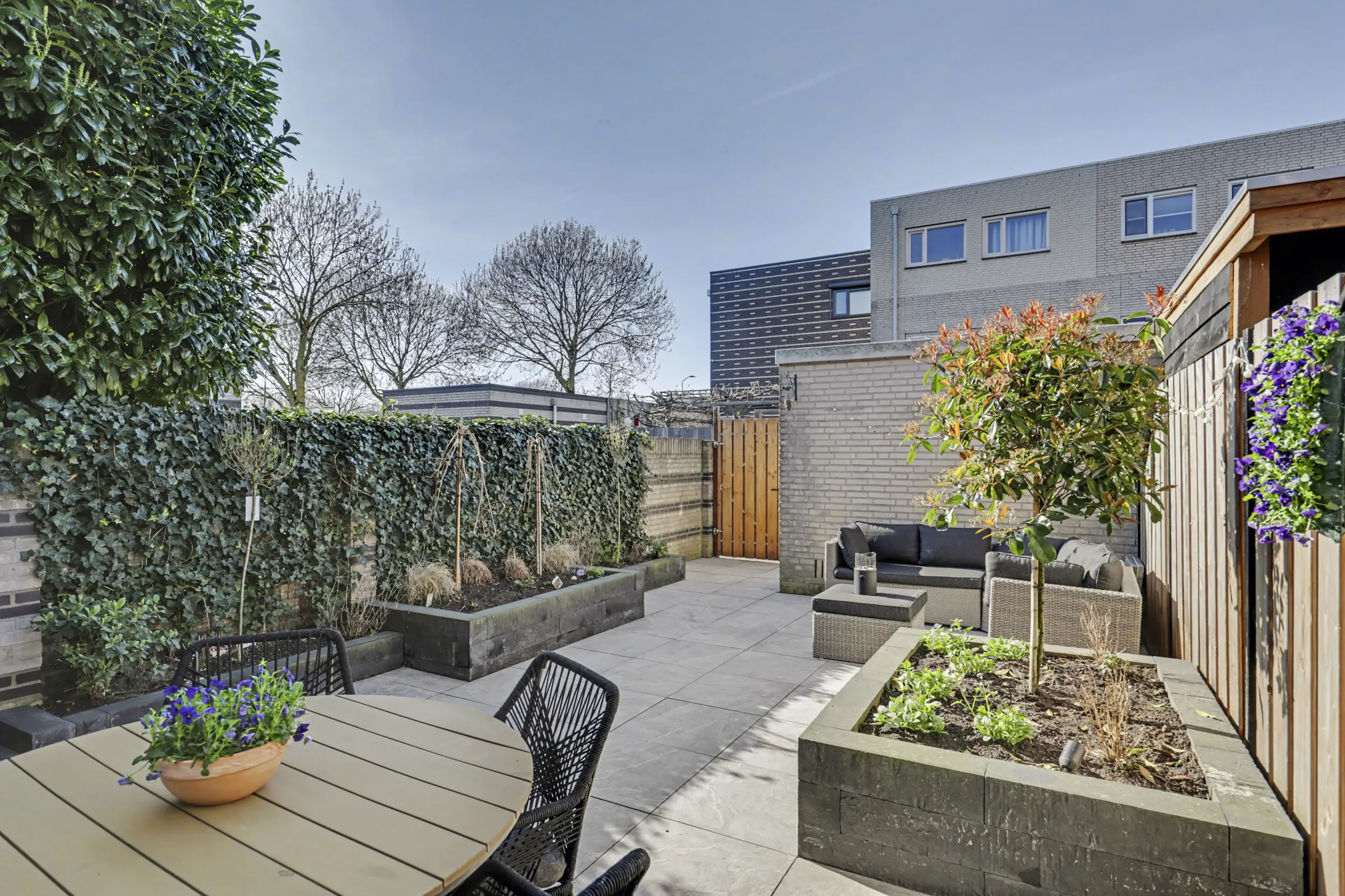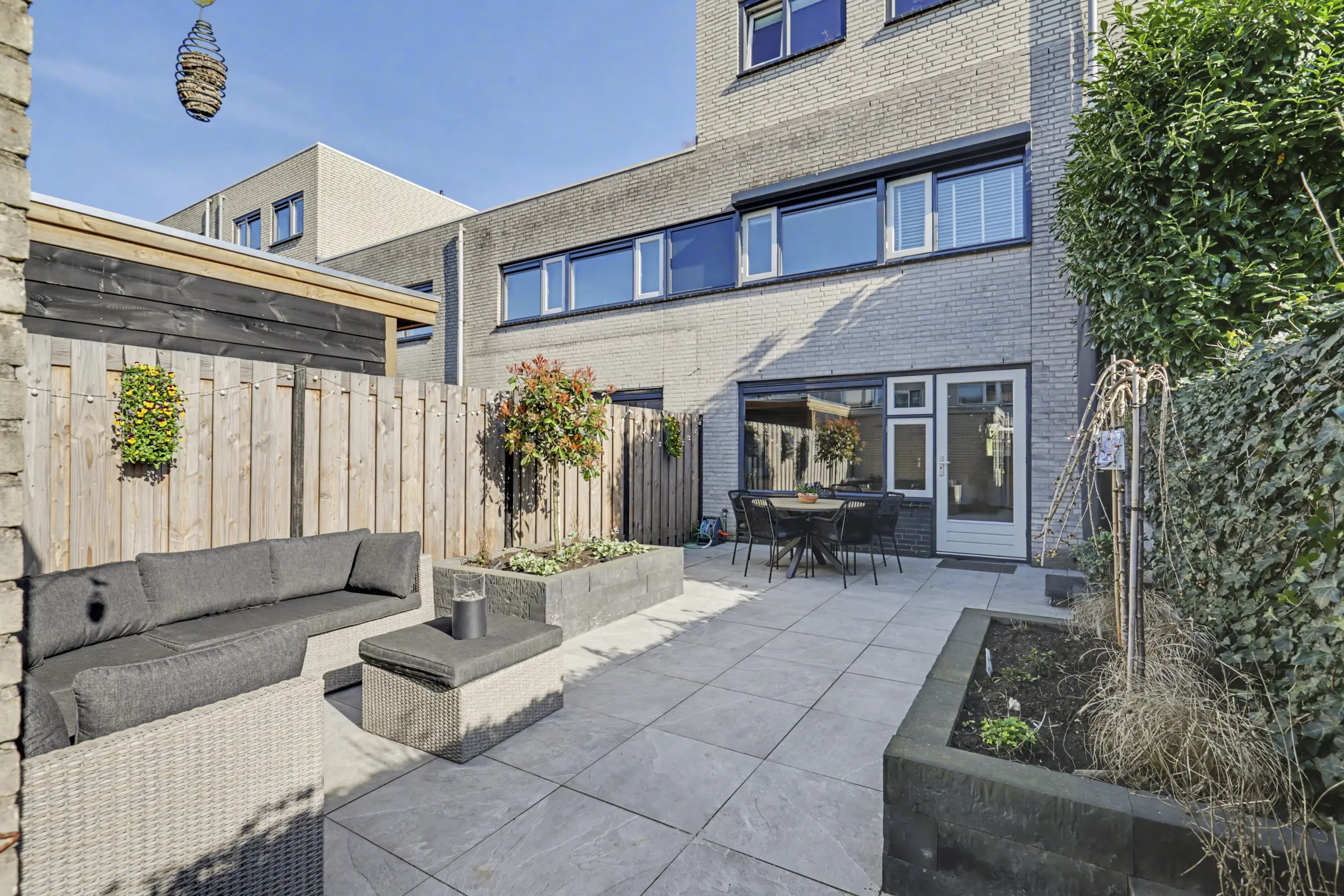 De achtertuin is fraai aangelegd met diverse borders en zitplekken, waardoor u op elk moment van de dag van zon of schaduw kunt genieten. De stenen berging biedt voldoende bergruimte voor fietsen en andere spullen . Via de achterom bereikt u het terrein waar zich uw eigen parkeerplaats bevindt.