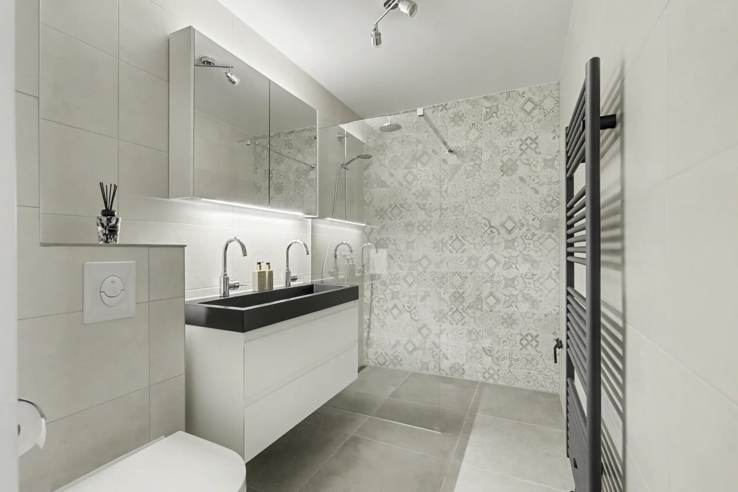 De overloop geeft toegang tot een separate cv-ruimte met opstelling van de combiketel (2020) en aansluitingen voor witgoed. Tevens is er een ruime bergkast aanwezig. De badkamer (2017) is stijlvol uitgevoerd en voorzien van een zwevend toilet, dubbele wastafel en een royale inloopdouche.