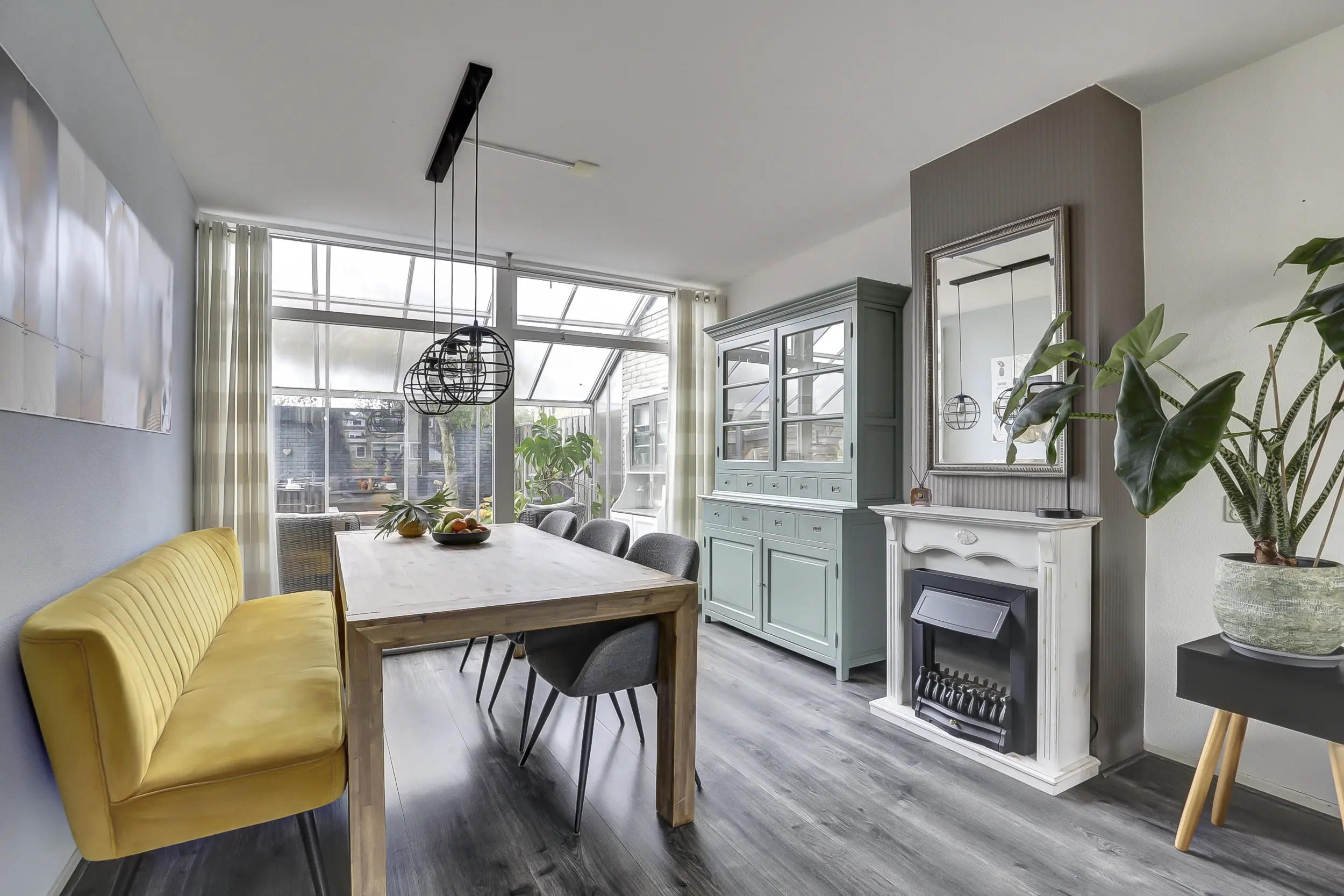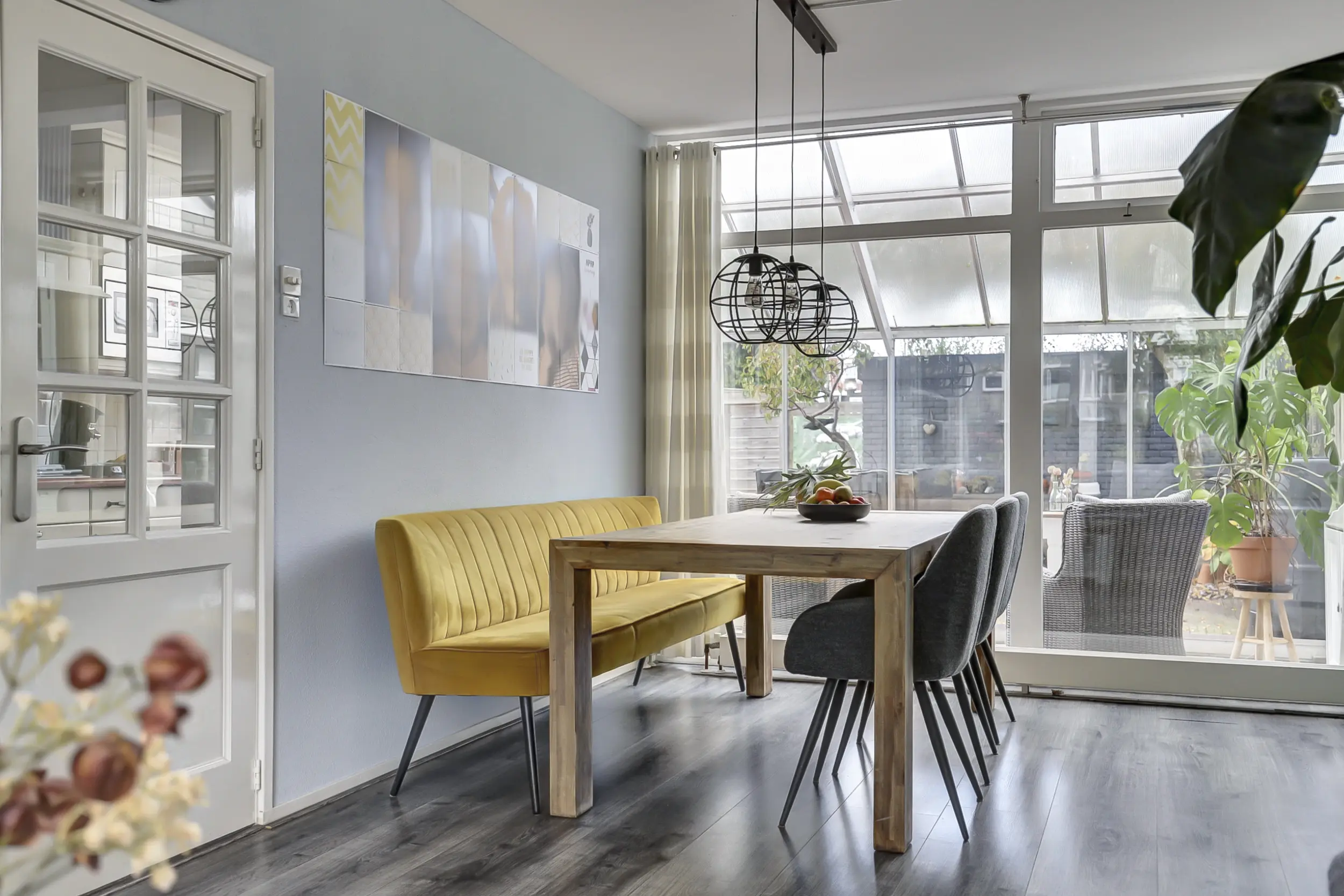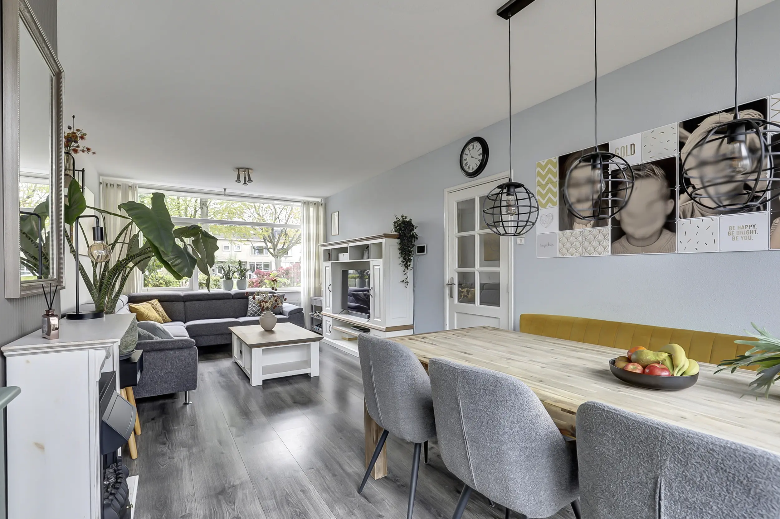 De sfeervolle woonkamer is heerlijk licht dankzij de grote raampartijen en biedt een fraai uitzicht over het groene plantsoen aan de voorzijde. Hier kunt u fijn tot rust komen. Aan de voorzijde is een zonnescherm aanwezig. Aan de achterzijde heeft u zicht op de serre en de achtertuin. De vloer is afgewerkt met een mooie laminaatvloer.