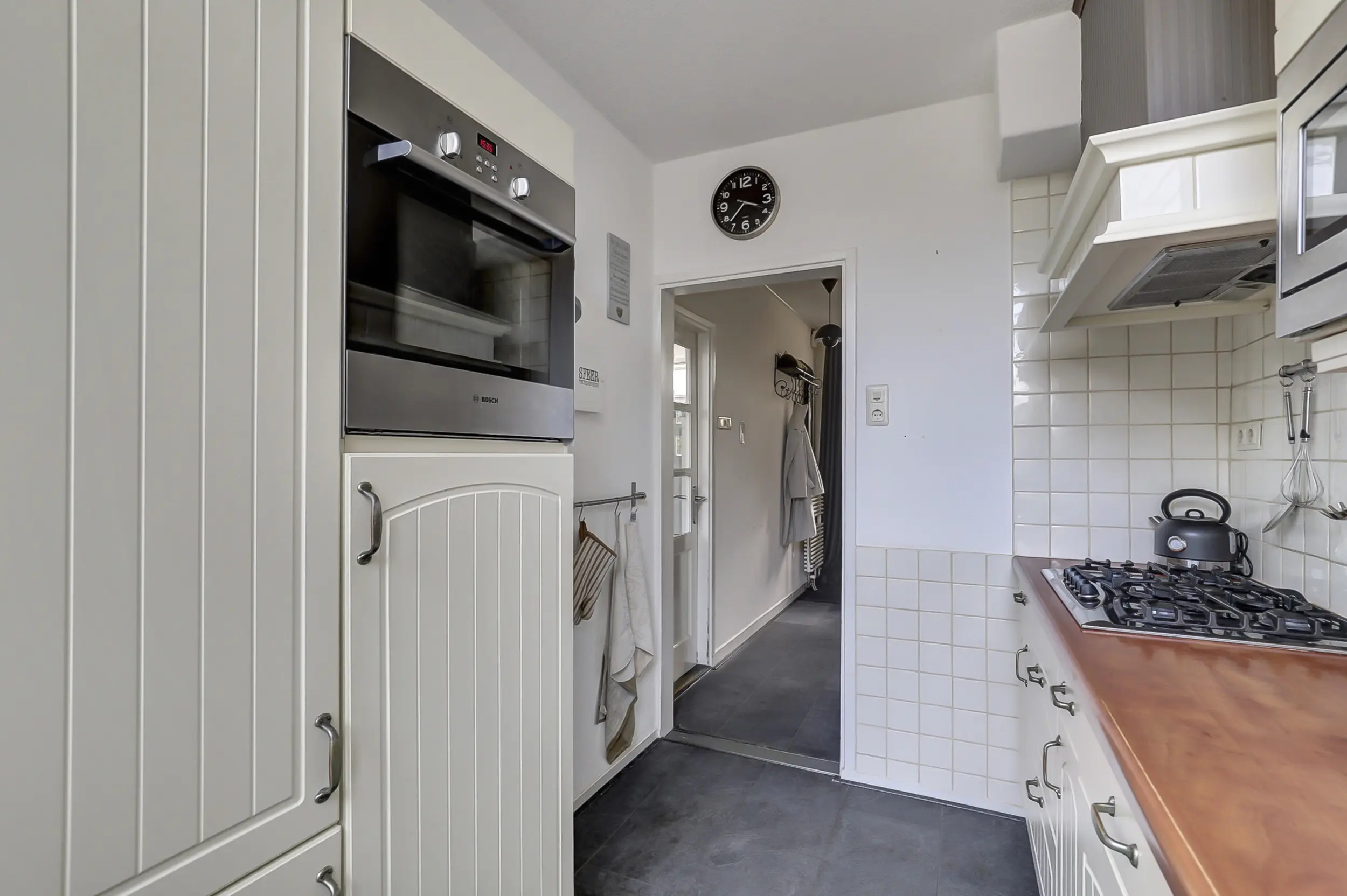 De dichte keuken is netjes en praktisch ingericht met twee rechte keukenopstellingen, uitgevoerd in een landelijke stijl. Aan de ene zijde vindt u een 5-pits gasfornuis met afzuigkap, magnetron en vaatwasser, aan de andere zijde een koel-/vriescombinatie en oven. Verder is er veel kastruimte aanwezig. Vanuit de keuken heeft u directe toegang tot de serre.
