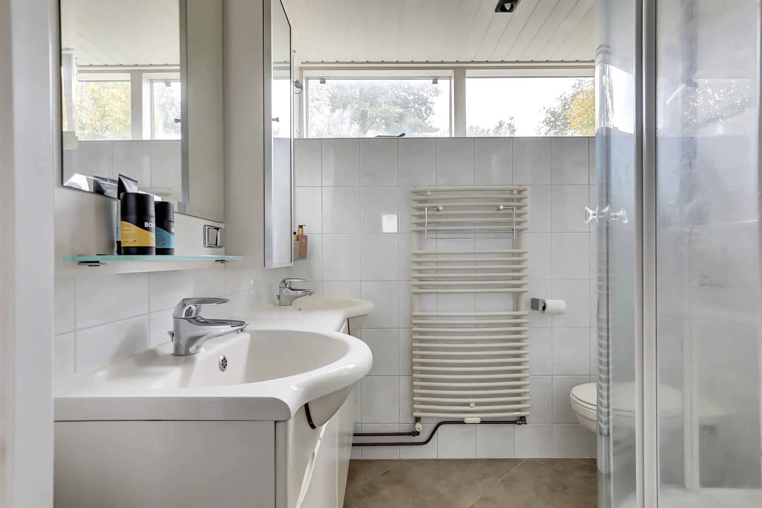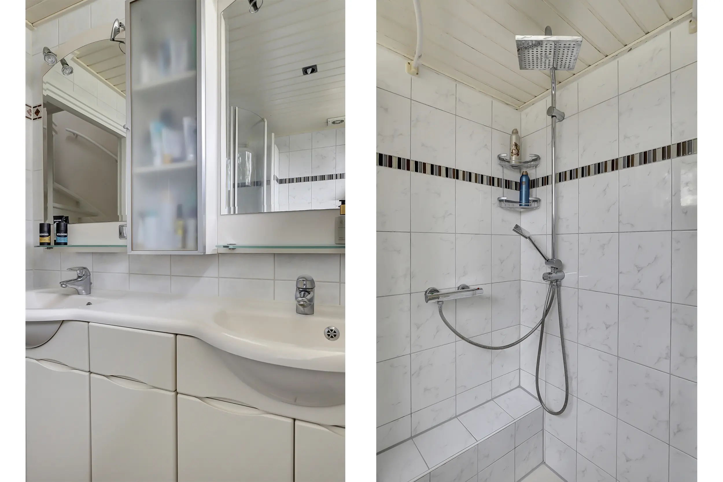 De volledig betegelde badkamer is modern en compleet ingericht met een hoekdouche, hangcloset en een badmeubel met dubbele wastafel. Verder is er een designradiator aanwezig als extra comfort.