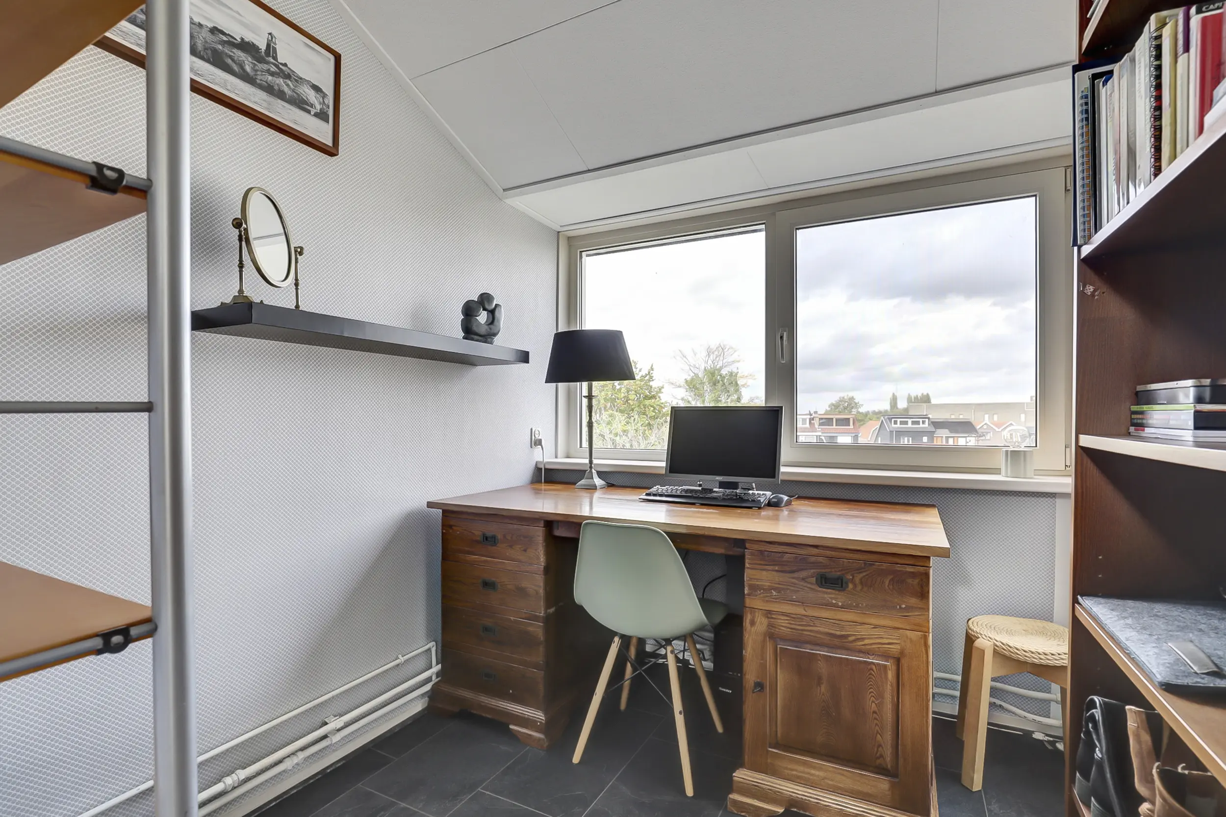 De zolderslaapkamer (gelegen in de volle lengte) is ruim van afmeting en geeft toegang tot het zonnige dakterras, waar u de hele dag door kunt genieten van de zon en het uitzicht over het groene plantsoen. De andere kamer is momenteel in gebruik als kantoor, maar kan uiteraard ook dienstdoen als slaapkamer of hobbyruimte. Beide kamers zijn keurig afgewerkt met een laminaatvloer.