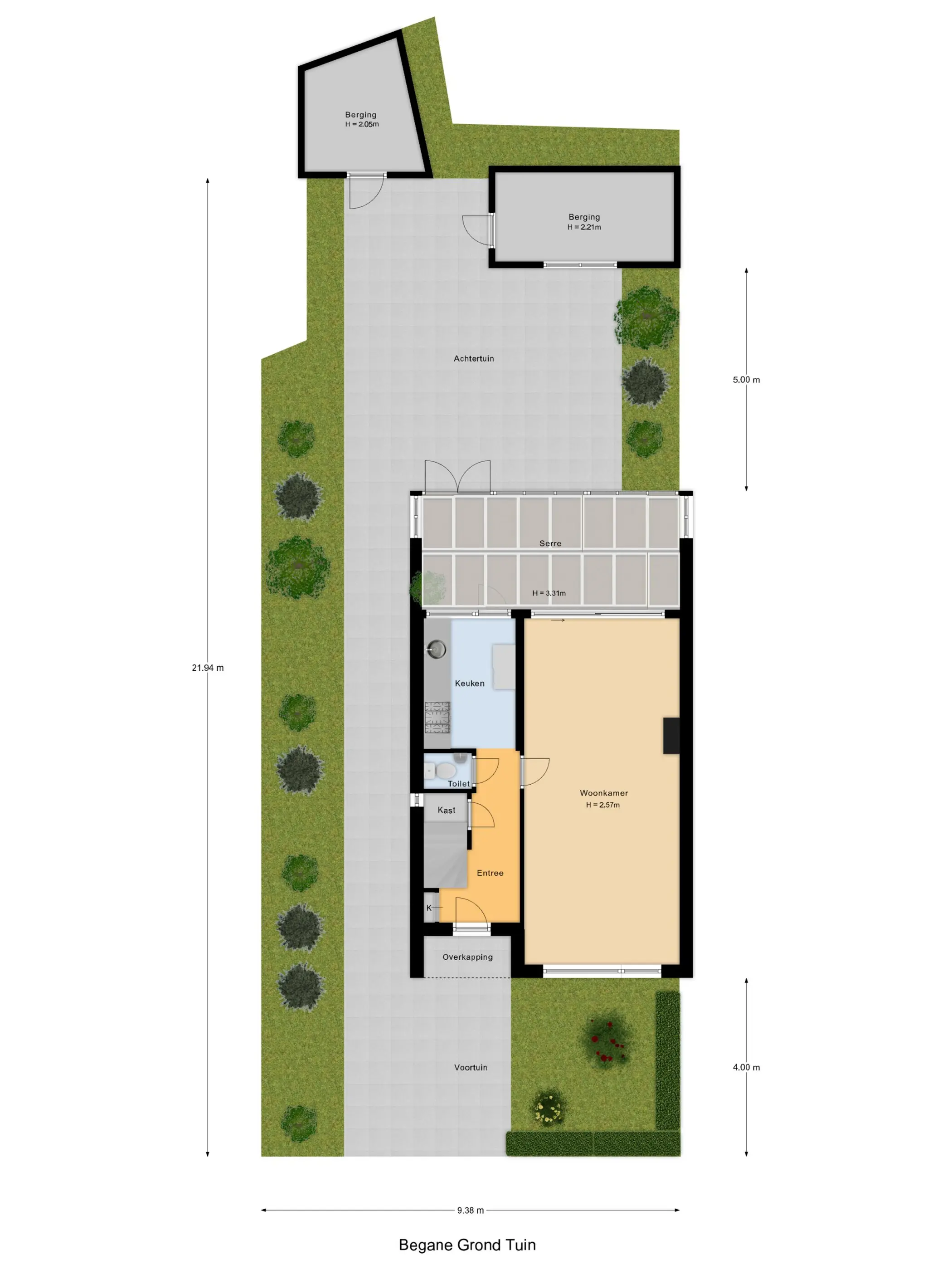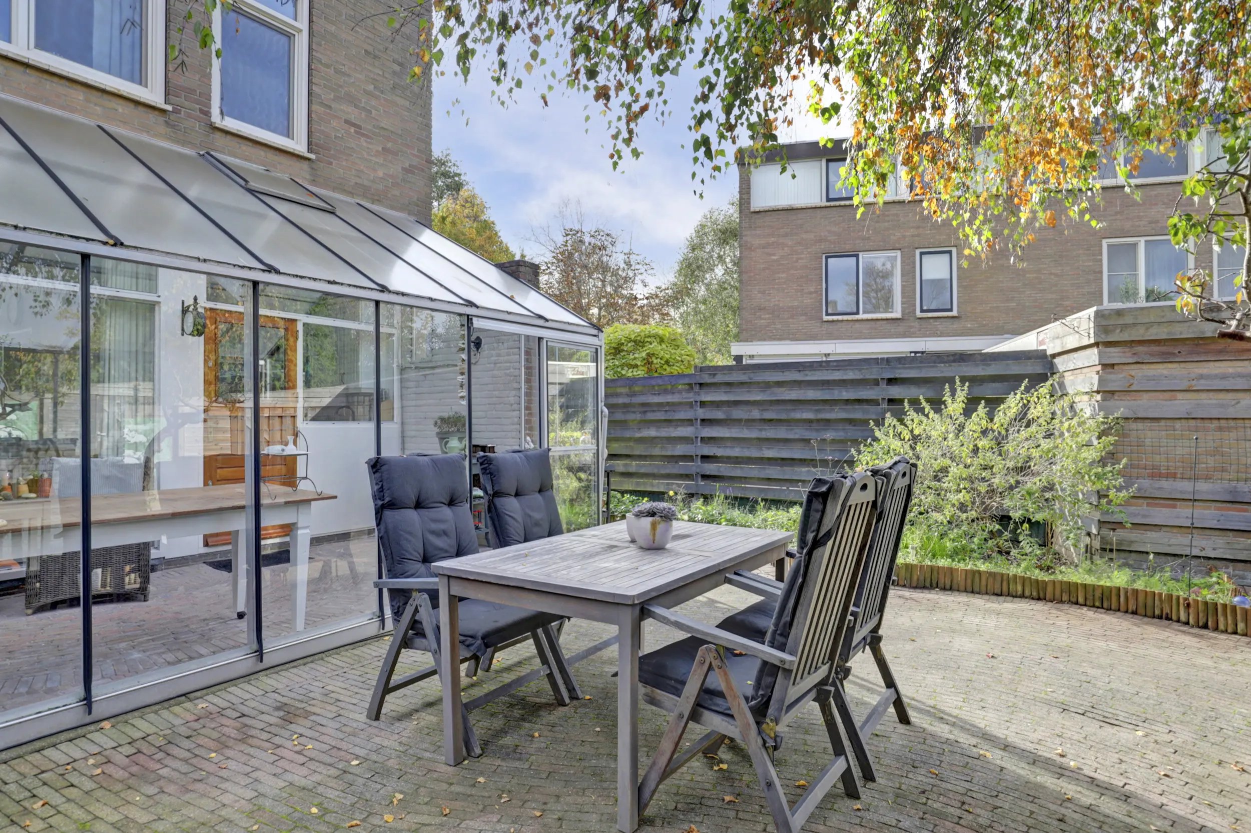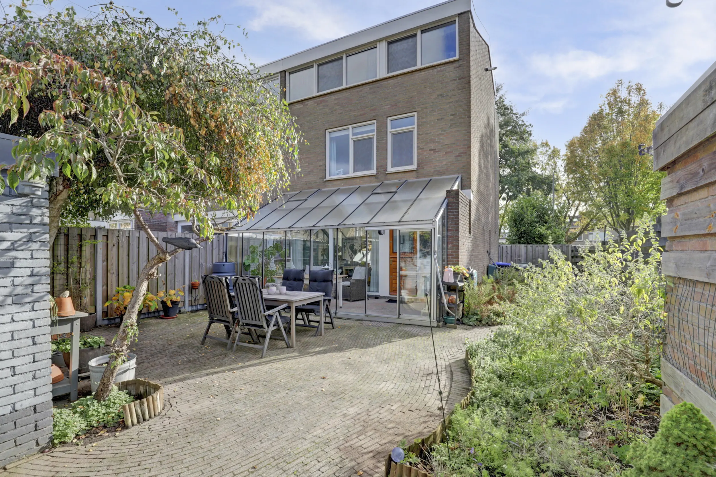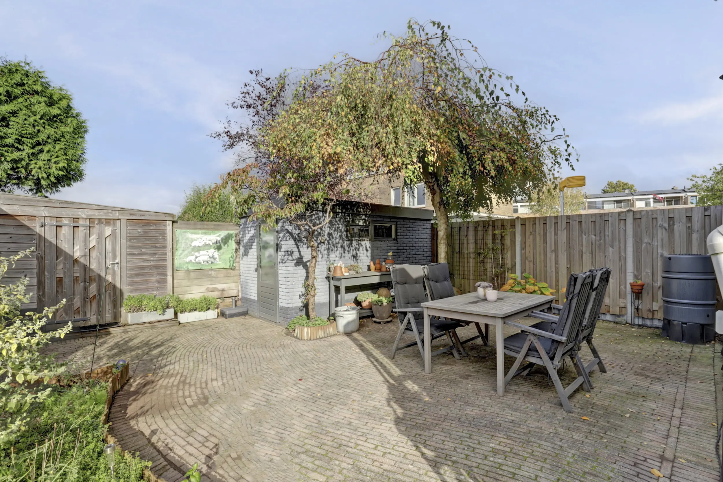 De achtertuin is verzorgd aangelegd met een ruim terras en groene borders met vaste beplanting. U vindt hier volop ruimte om te zitten of te tuinieren. Er zijn twee bergingen aanwezig: een ruime stenen berging met betonvloer, verlichting en elektra en een houten berging voor extra opslag. Via de zijtuin met afsluitbare poort bereikt u de fraai aangelegde voortuin.