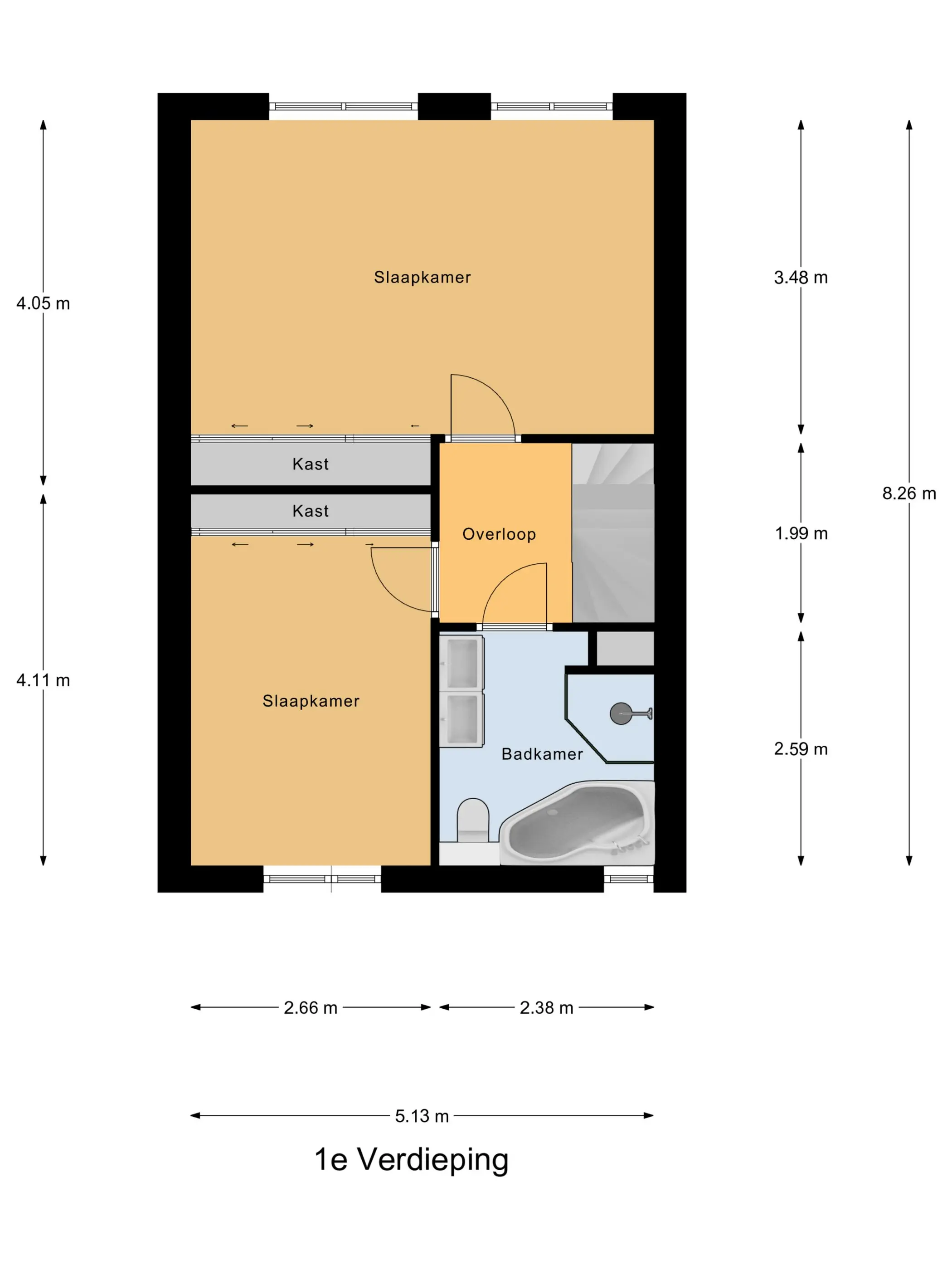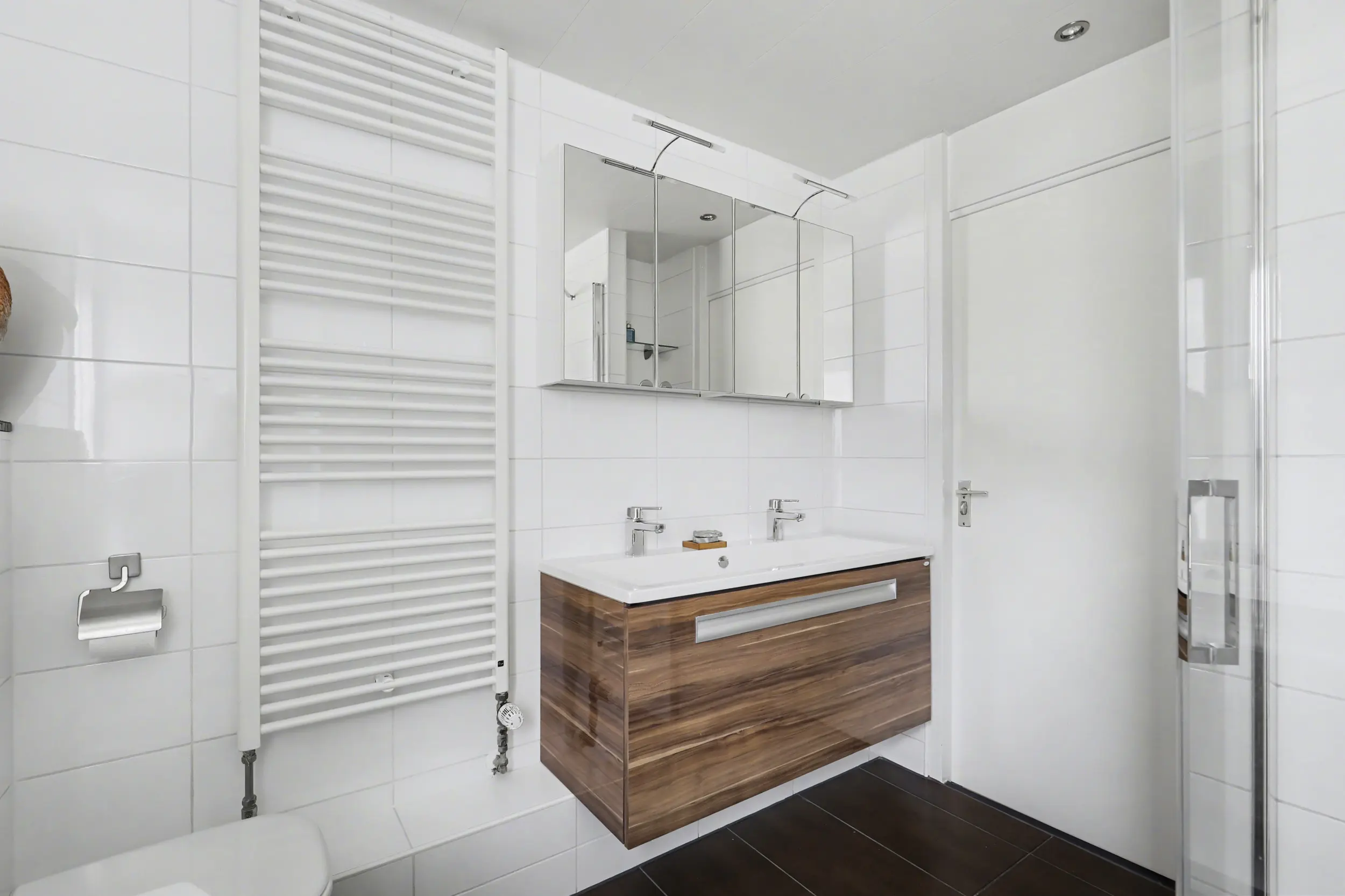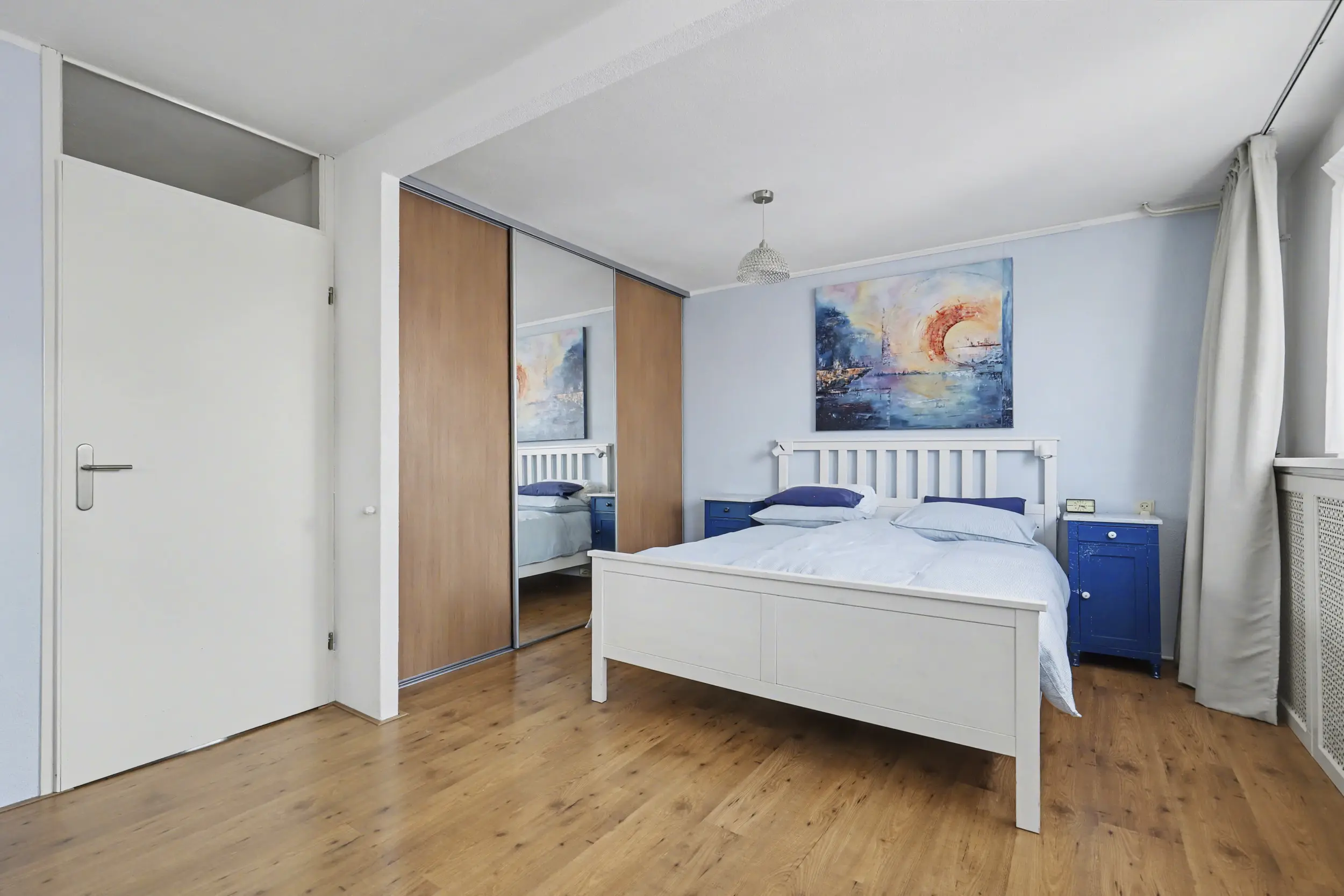 Overloop. De hoofdslaapkamer ligt aan de achterzijde en kan eenvoudig weer worden opgesplitst in twee slaapkamers. Deze kamer beschikt over een praktische inbouwkast. Aan de voorzijde bevindt zich nog een slaapkamer met ingebouwde kast. De vergrote badkamer is volledig uitgerust met een ligbad, douche, toilet, wastafelmeubel en radiator.