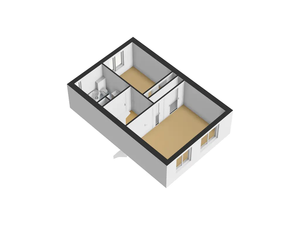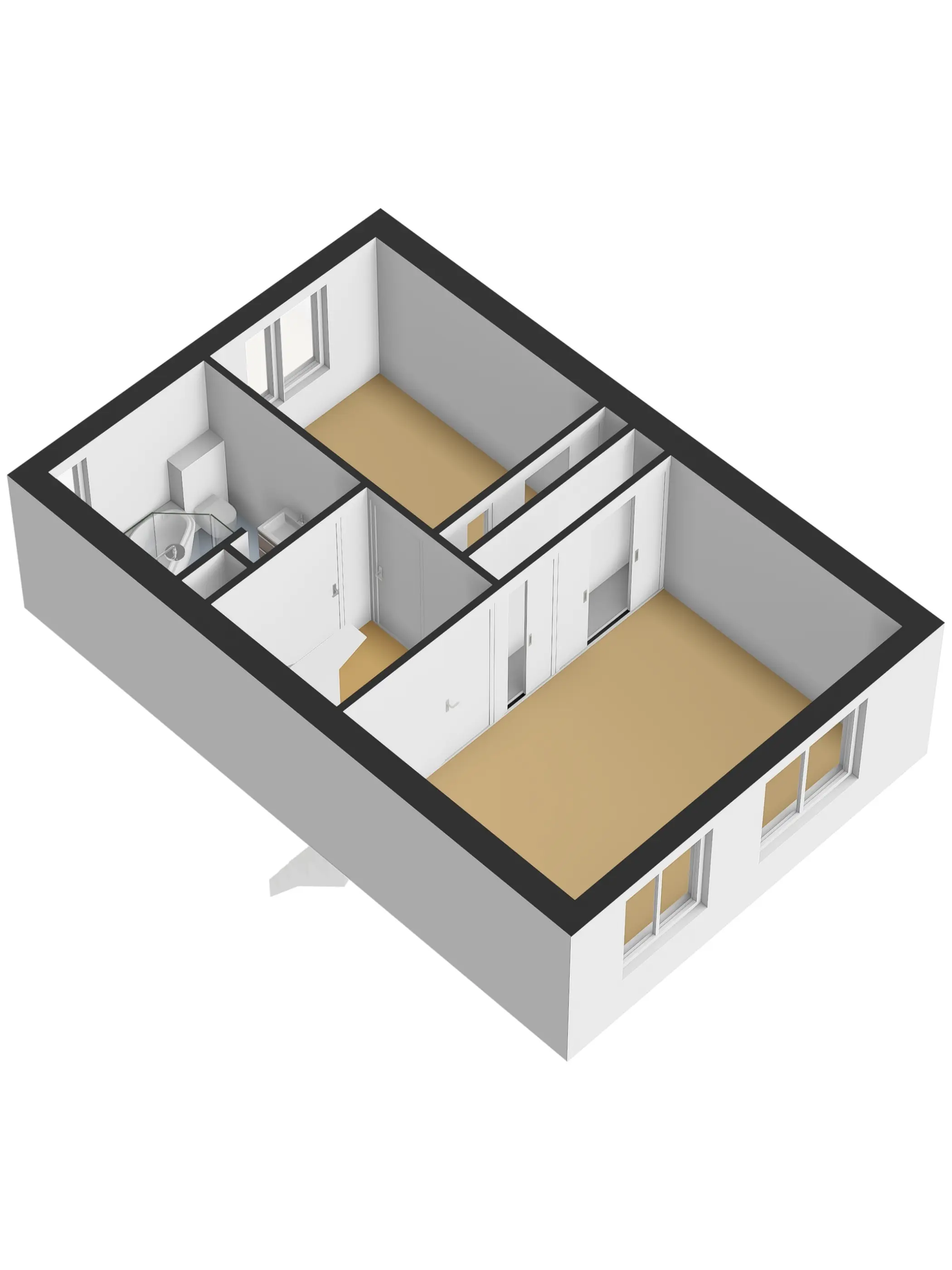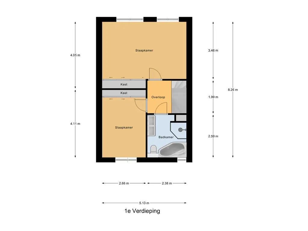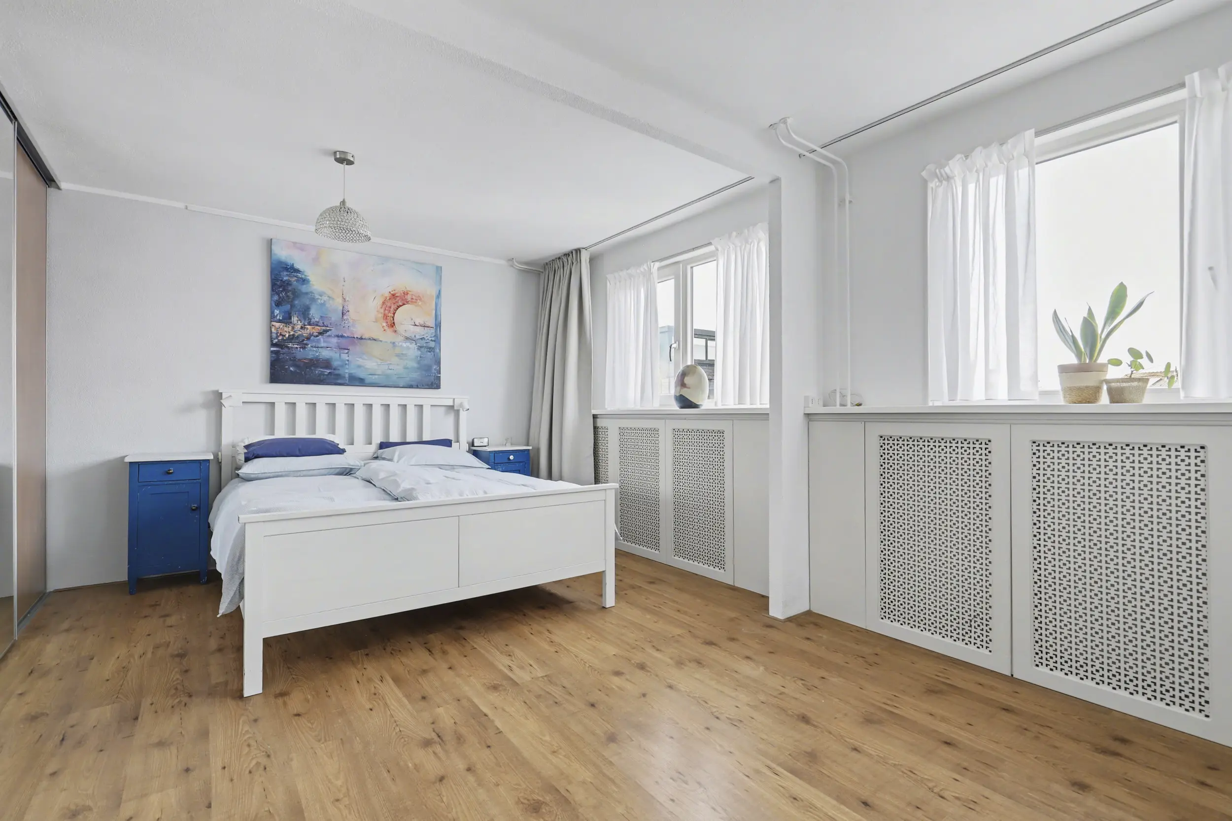 Overloop. De hoofdslaapkamer ligt aan de achterzijde en kan eenvoudig weer worden opgesplitst in twee slaapkamers. Deze kamer beschikt over een praktische inbouwkast. Aan de voorzijde bevindt zich nog een slaapkamer met ingebouwde kast. De vergrote badkamer is volledig uitgerust met een ligbad, douche, toilet, wastafelmeubel en radiator.