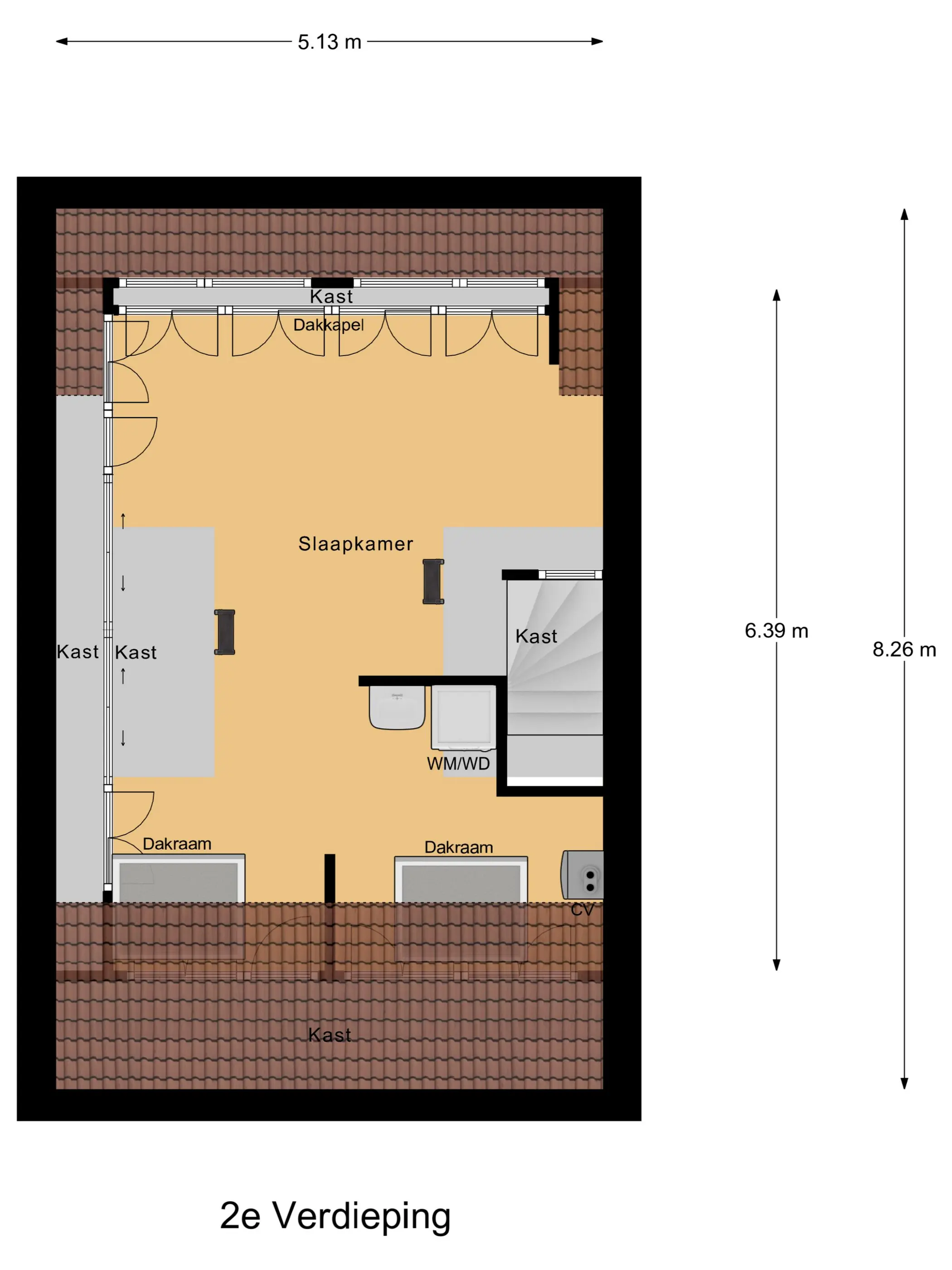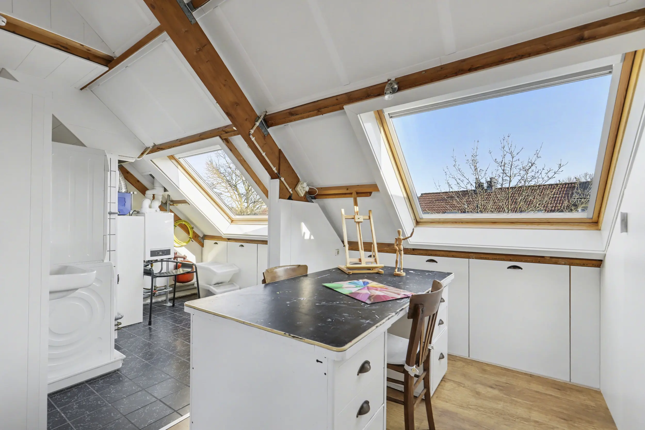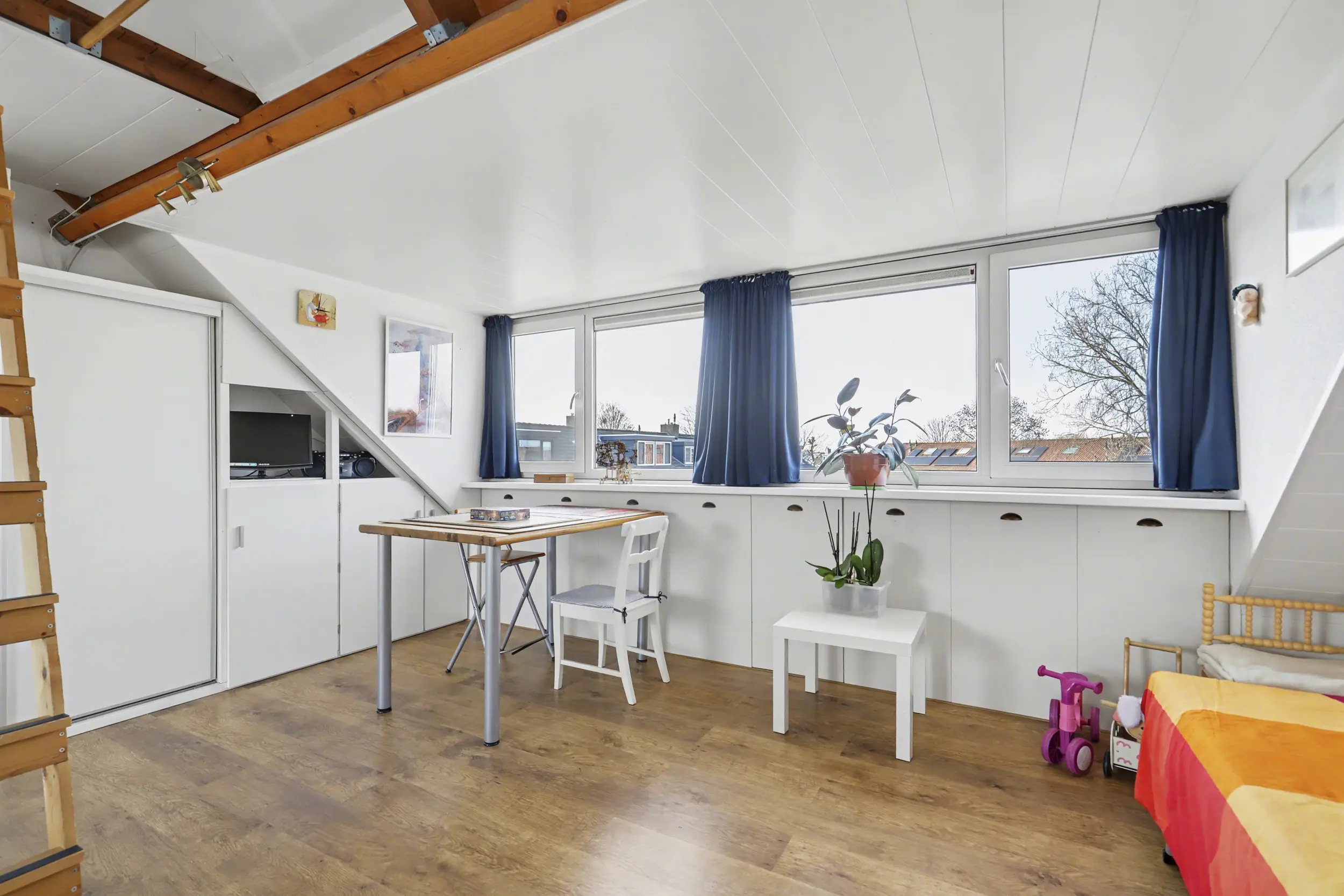 Op zolder is een grote open ruimte die nu wordt gebruikt als hobbyruimte, maar dankzij de royale dakkapel en de dakramen kun je hier gemakkelijk één of twee extra slaapkamers maken. Daarnaast is er een praktische wasruimte met cv-installatie en wastafel, en biedt de vliering een knus speelhoekje voor de kinderen.
