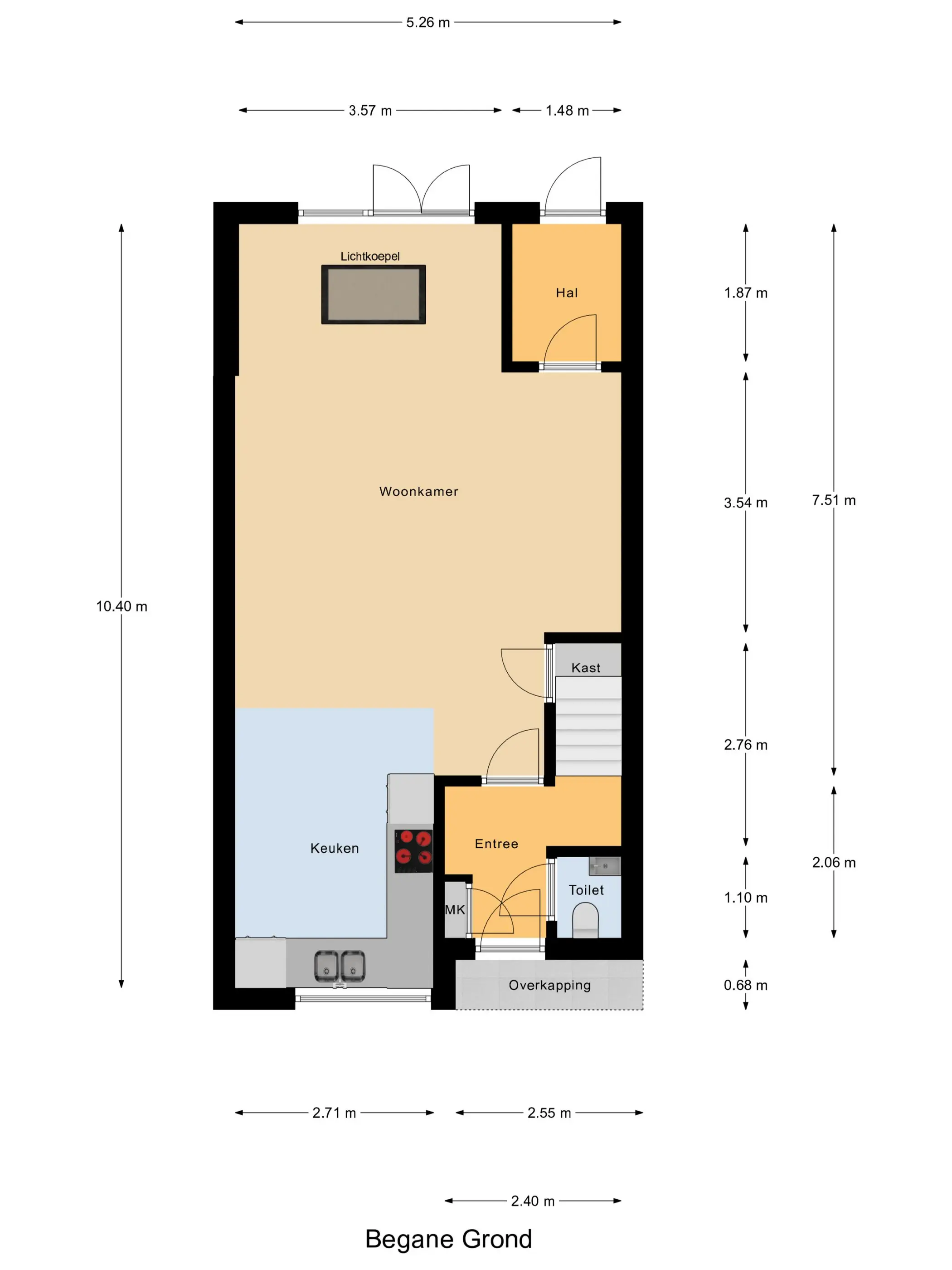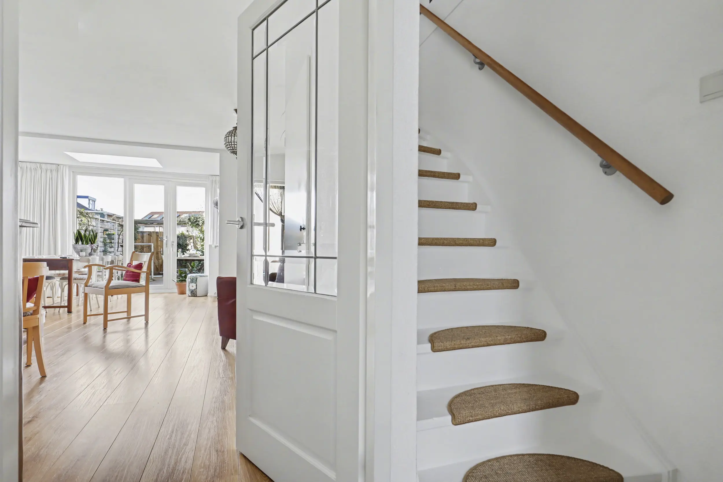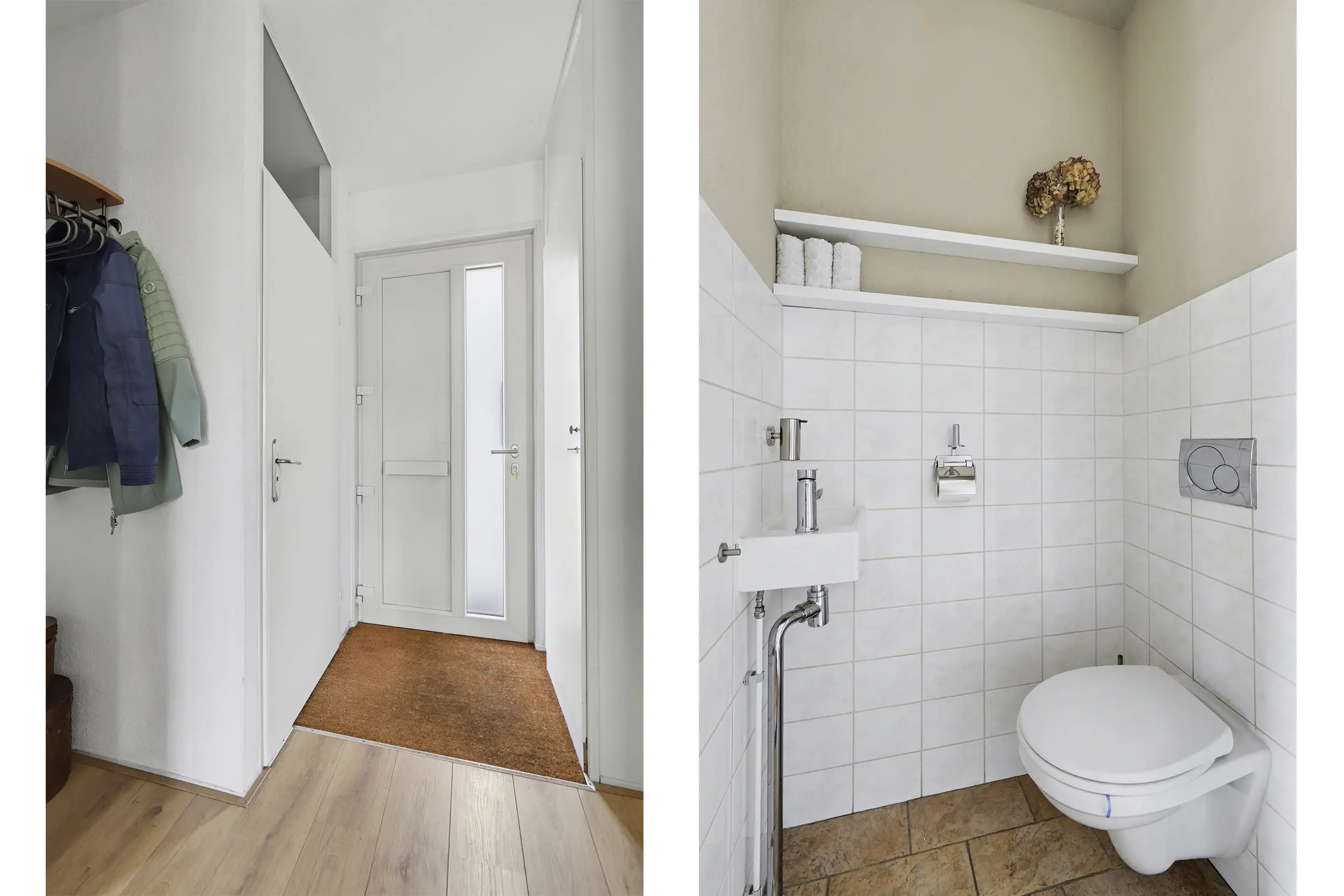 Entree, hal met meterkast en radiatorombouw en een separaat toilet met fonteintje. Vanaf de hal is de trap naar de eerste verdieping en de deur naar de woonkamer is voorzien van glas.