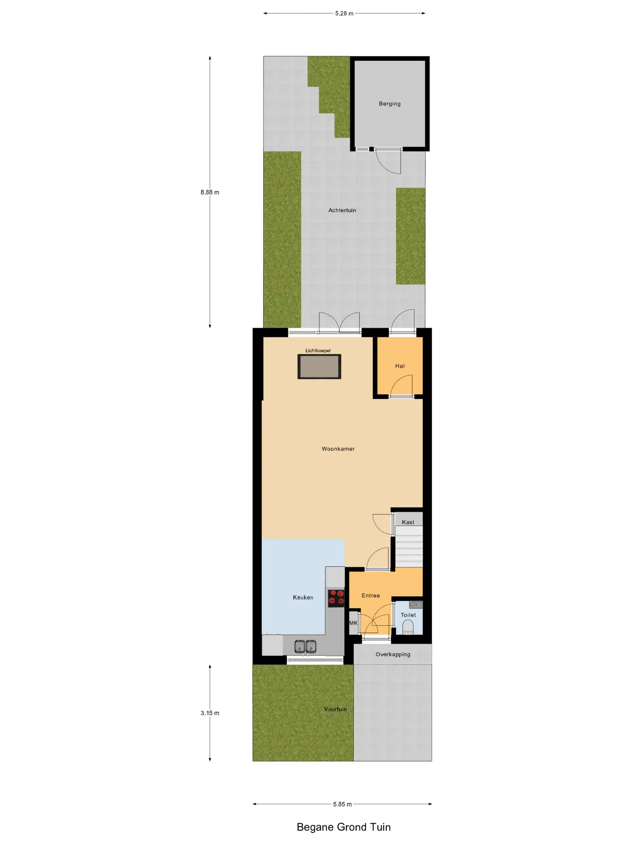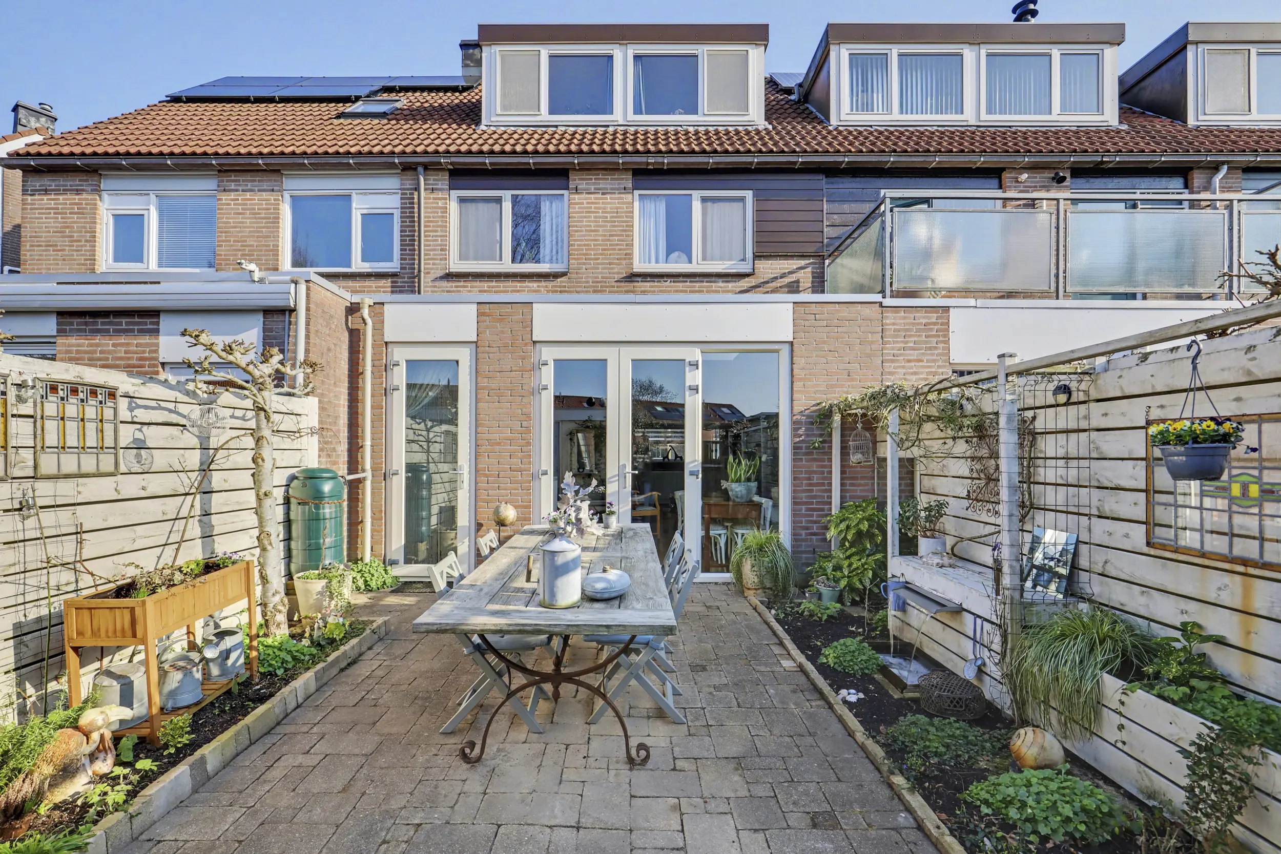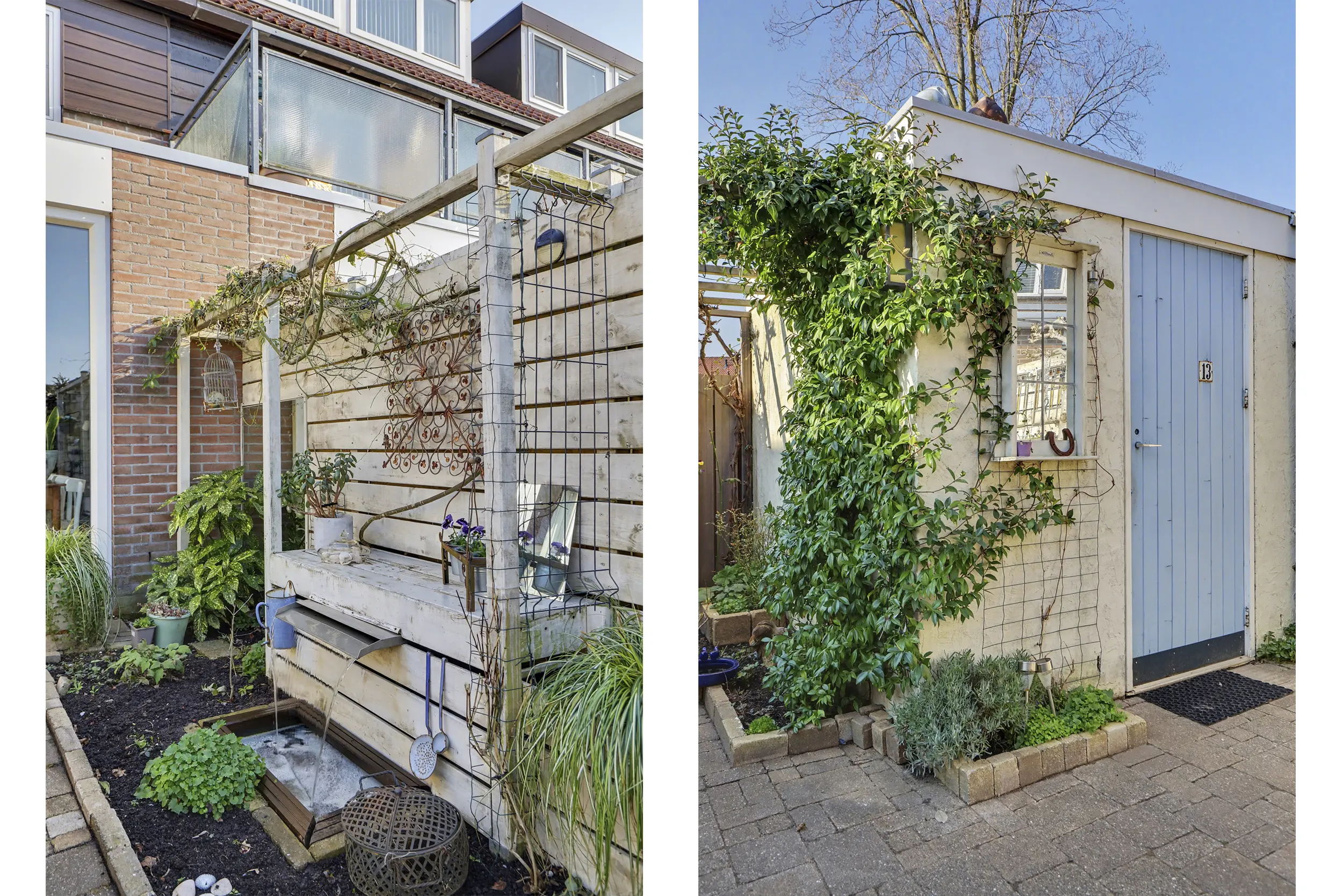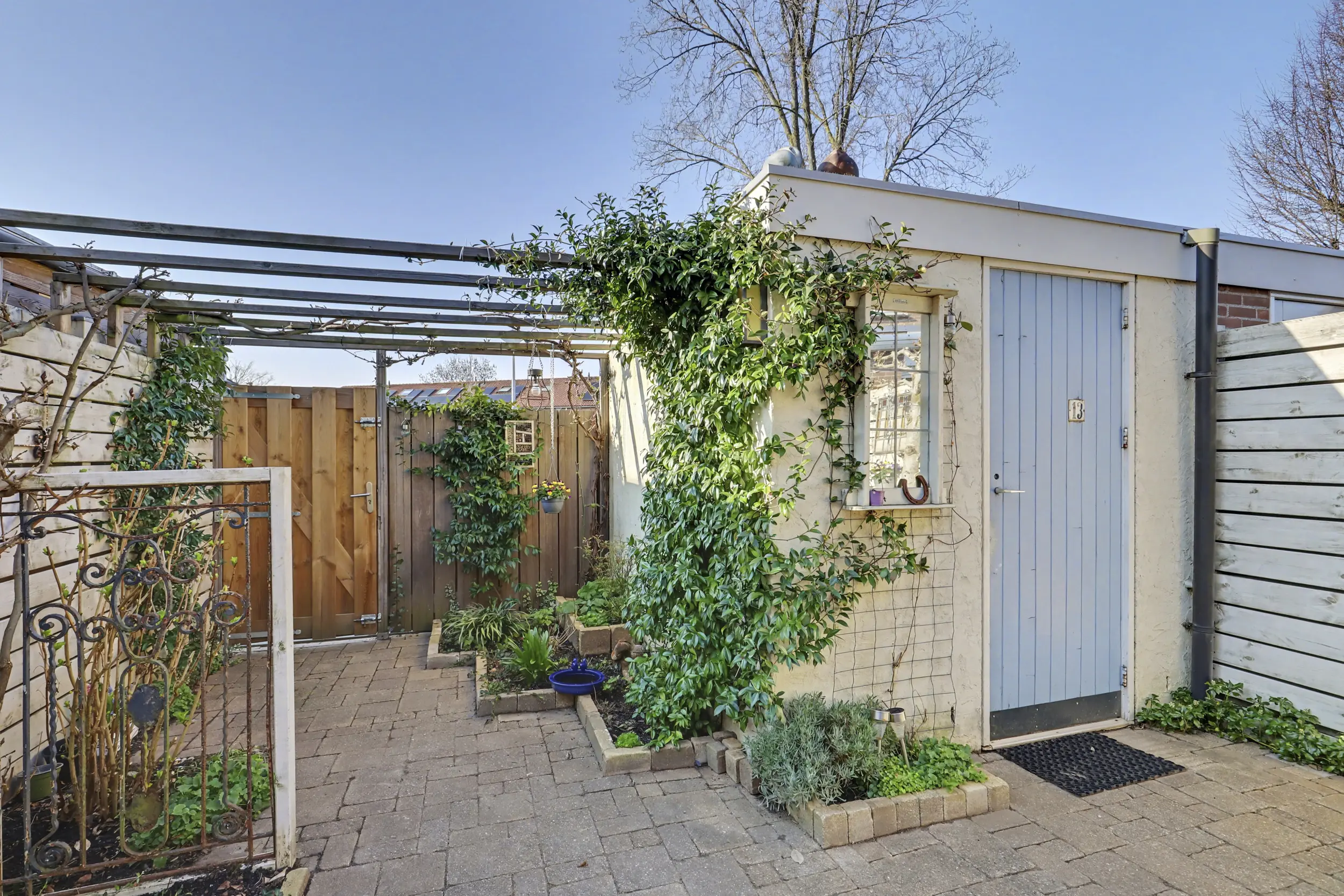De sfeervolle achtertuin beschikt over een vrijstaande stenen berging met elektriciteit en is via een achterom bereikbaar. Aan de achterzijde ligt een ruim parkeerterrein. De verzorgde voortuin grenst aan een plein waar geen auto’s komen, waardoor er een veilige plek is voor kinderen om te spelen of naar de speeltuinen en/of buurtgenootjes te gaan.