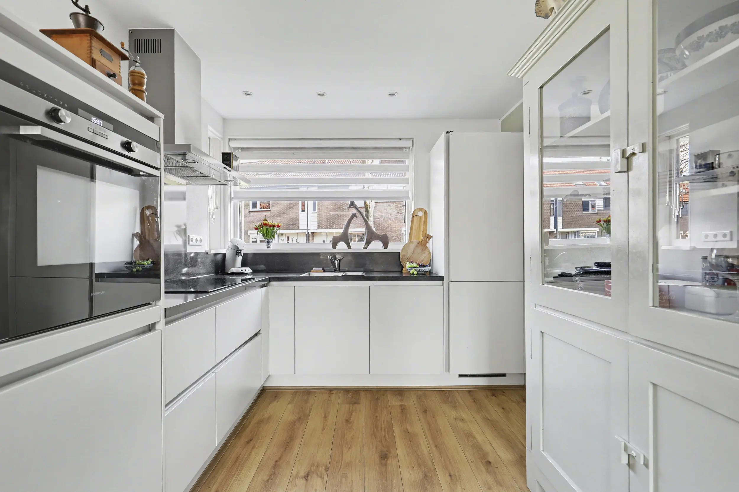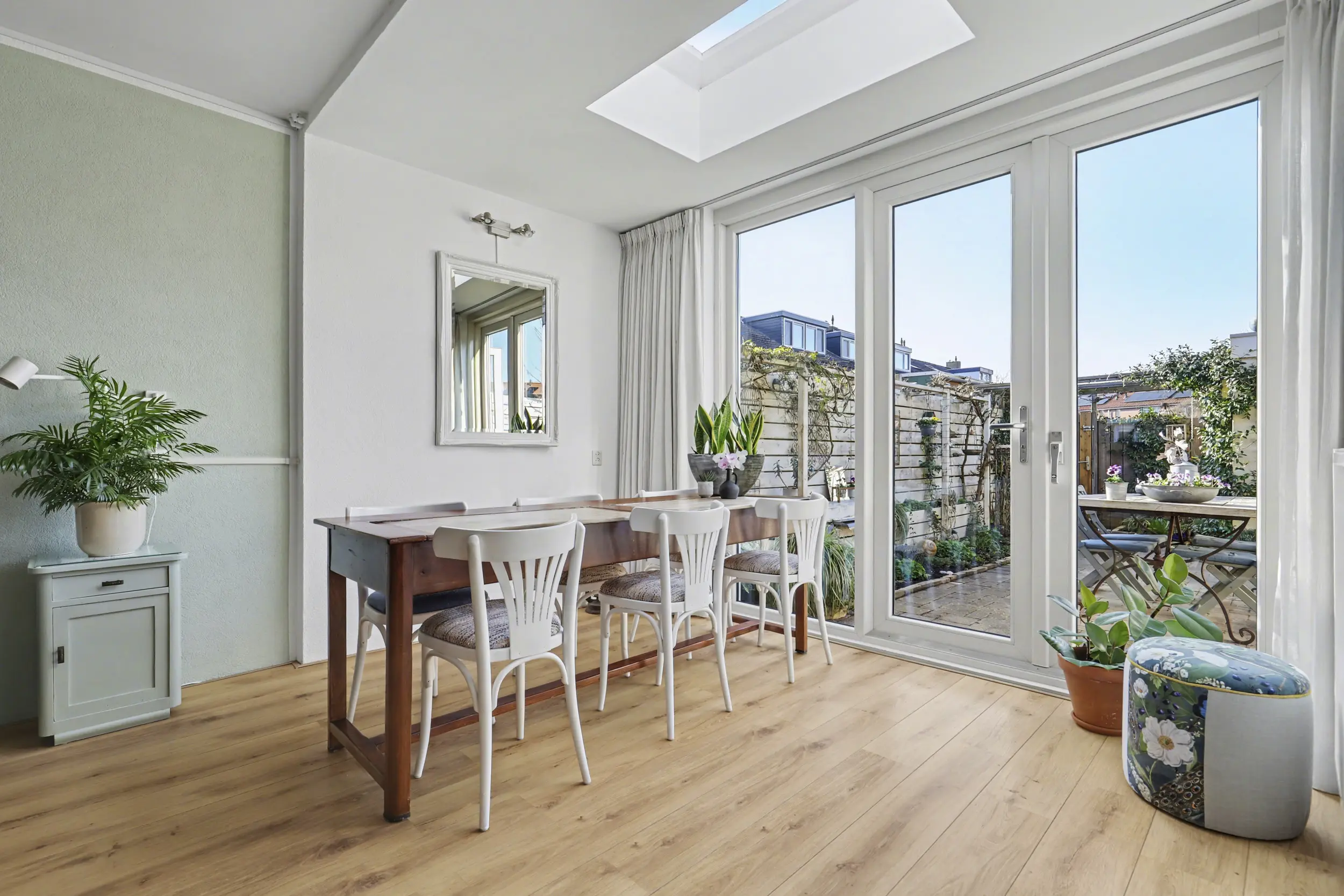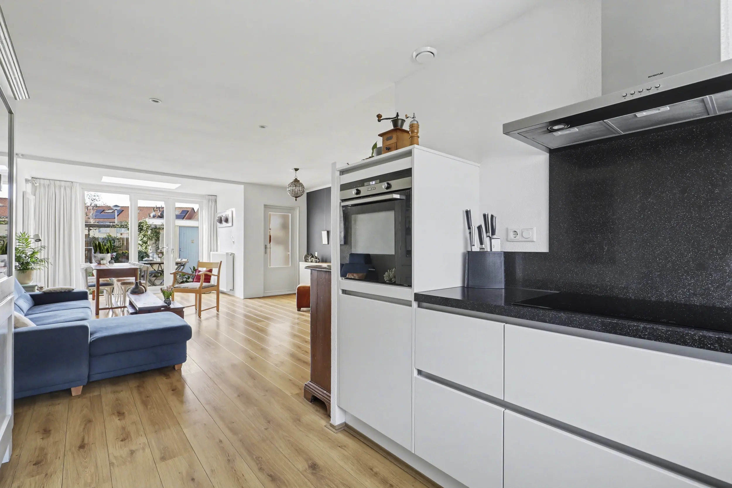 De woonkamer is ruim en licht, mede dankzij de fijne uitbouw met openslaande deuren en lichtkoepel, waardoor je een mooi uitzicht hebt op de sfeervolle achtertuin. Aan de achterzijde is een praktische berging of een zogenaamd klompenhok, ideaal om direct de tuin in te lopen. De moderne open keuken is voorzien van een granieten werkblad en diverse inbouwapparatuur waaronder inductie koken. De keuken sluit naadloos aan op de leefruimte. Bovendien ligt de keuken aan de voorzijde en kijkt uit op een autovrij binnengebied waar kinderen kunnen spelen.
