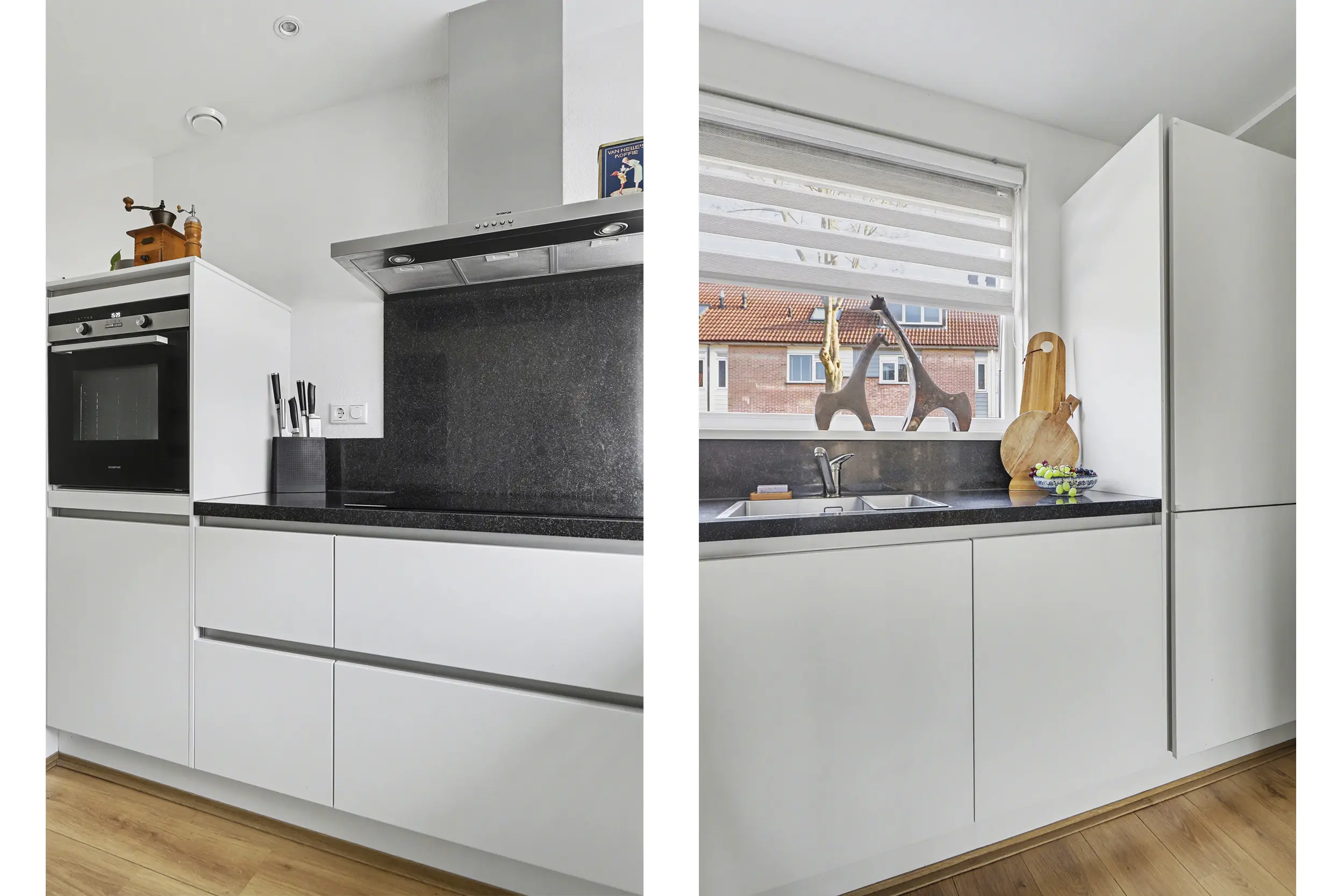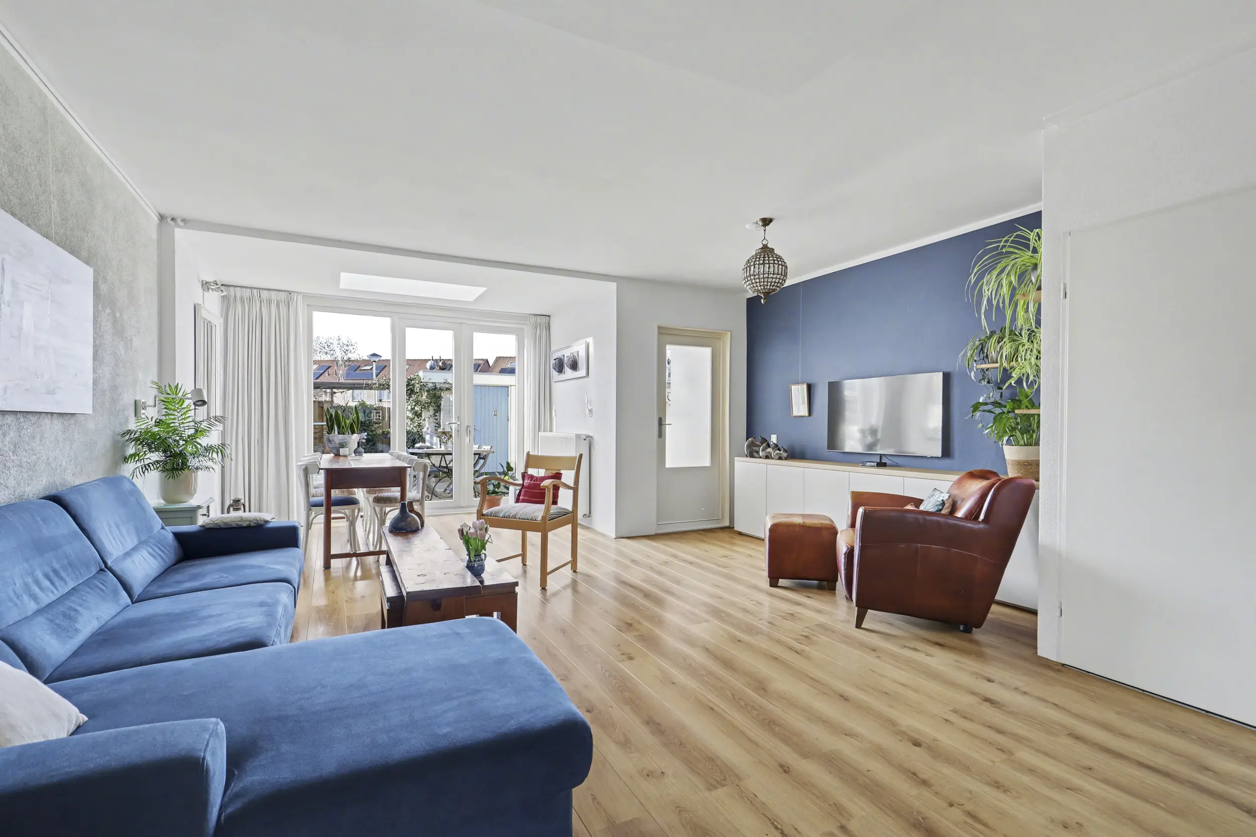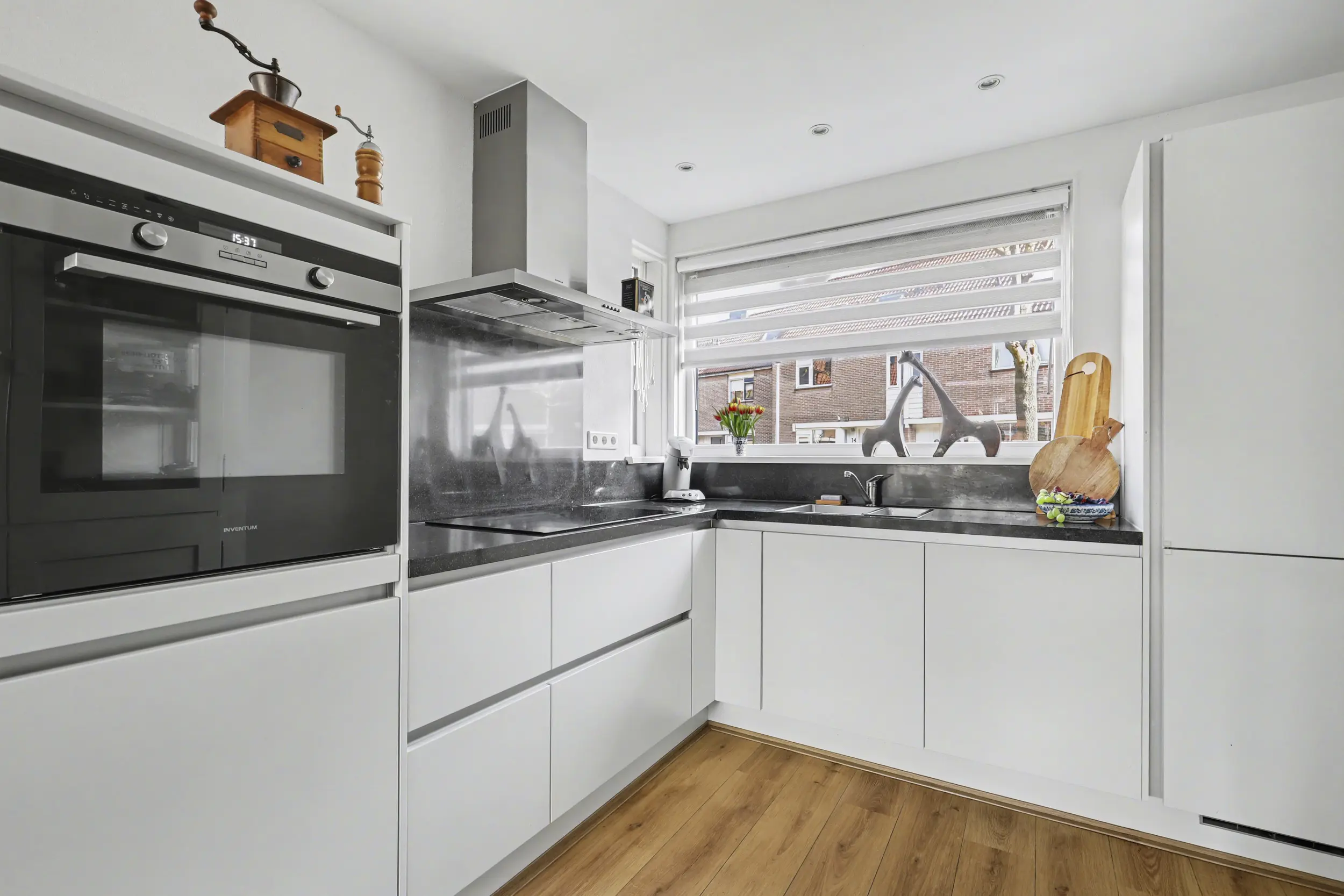 De woonkamer is ruim en licht, mede dankzij de fijne uitbouw met openslaande deuren en lichtkoepel, waardoor je een mooi uitzicht hebt op de sfeervolle achtertuin. Aan de achterzijde is een praktische berging of een zogenaamd klompenhok, ideaal om direct de tuin in te lopen. De moderne open keuken is voorzien van een granieten werkblad en diverse inbouwapparatuur waaronder inductie koken. De keuken sluit naadloos aan op de leefruimte. Bovendien ligt de keuken aan de voorzijde en kijkt uit op een autovrij binnengebied waar kinderen kunnen spelen.