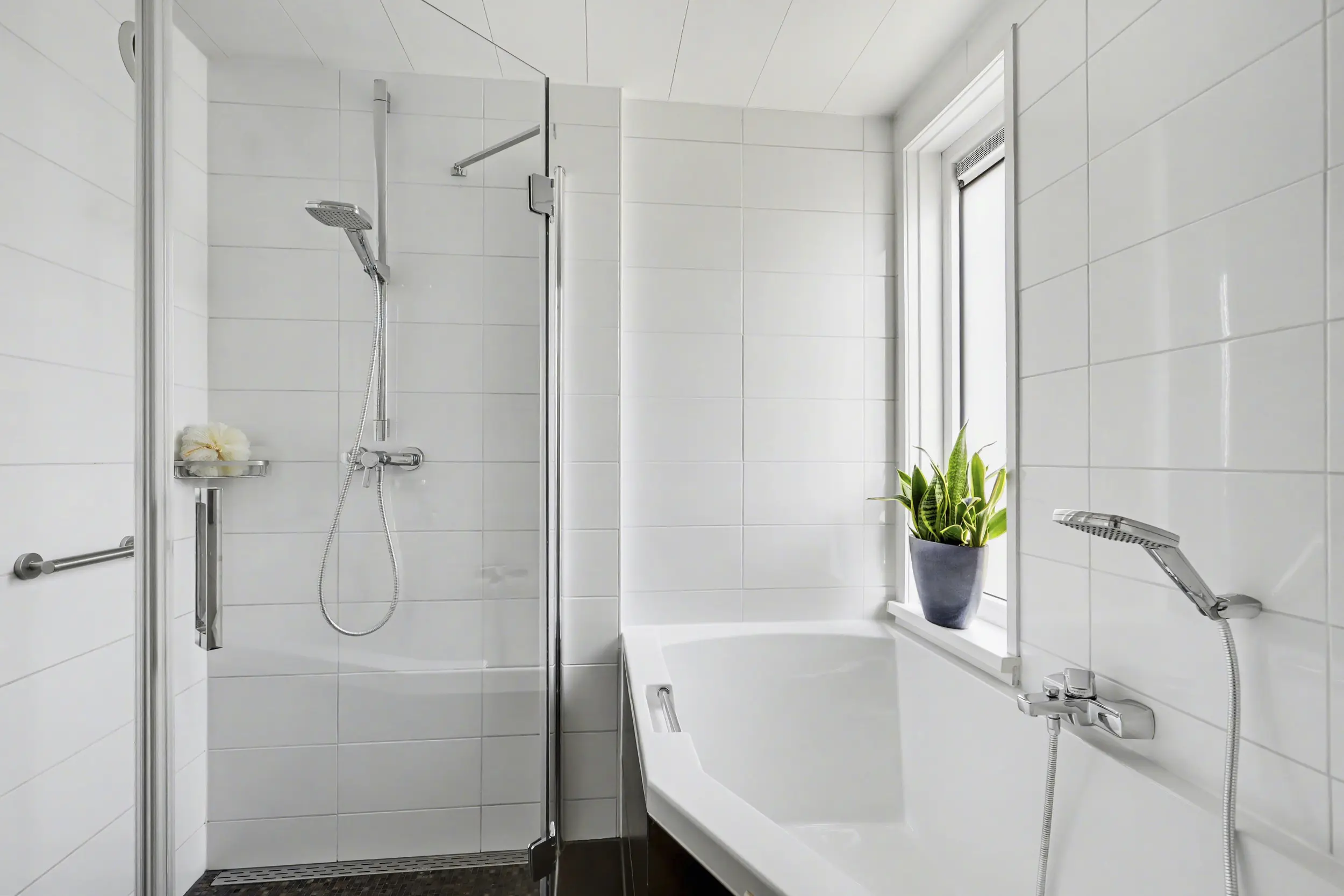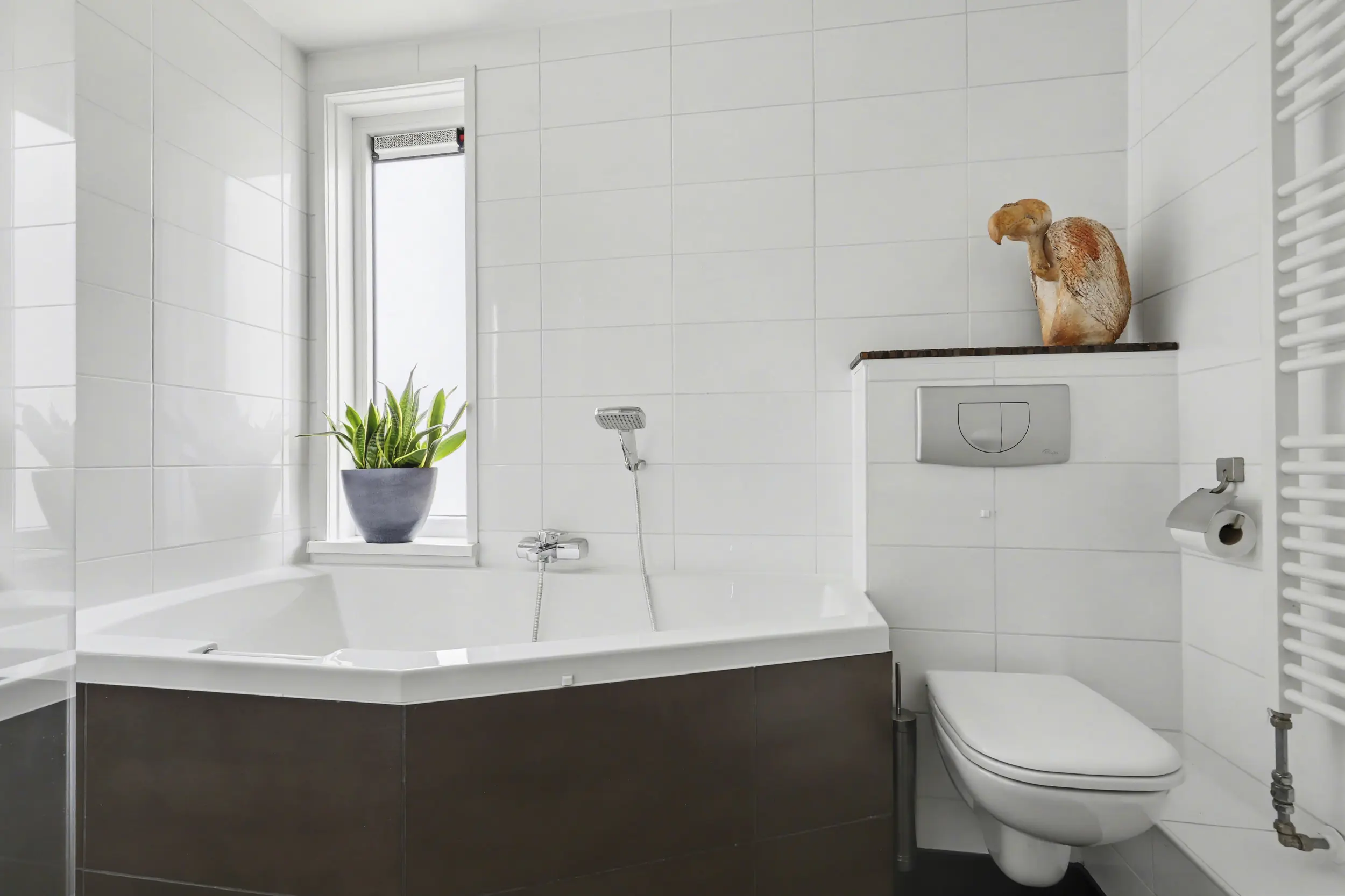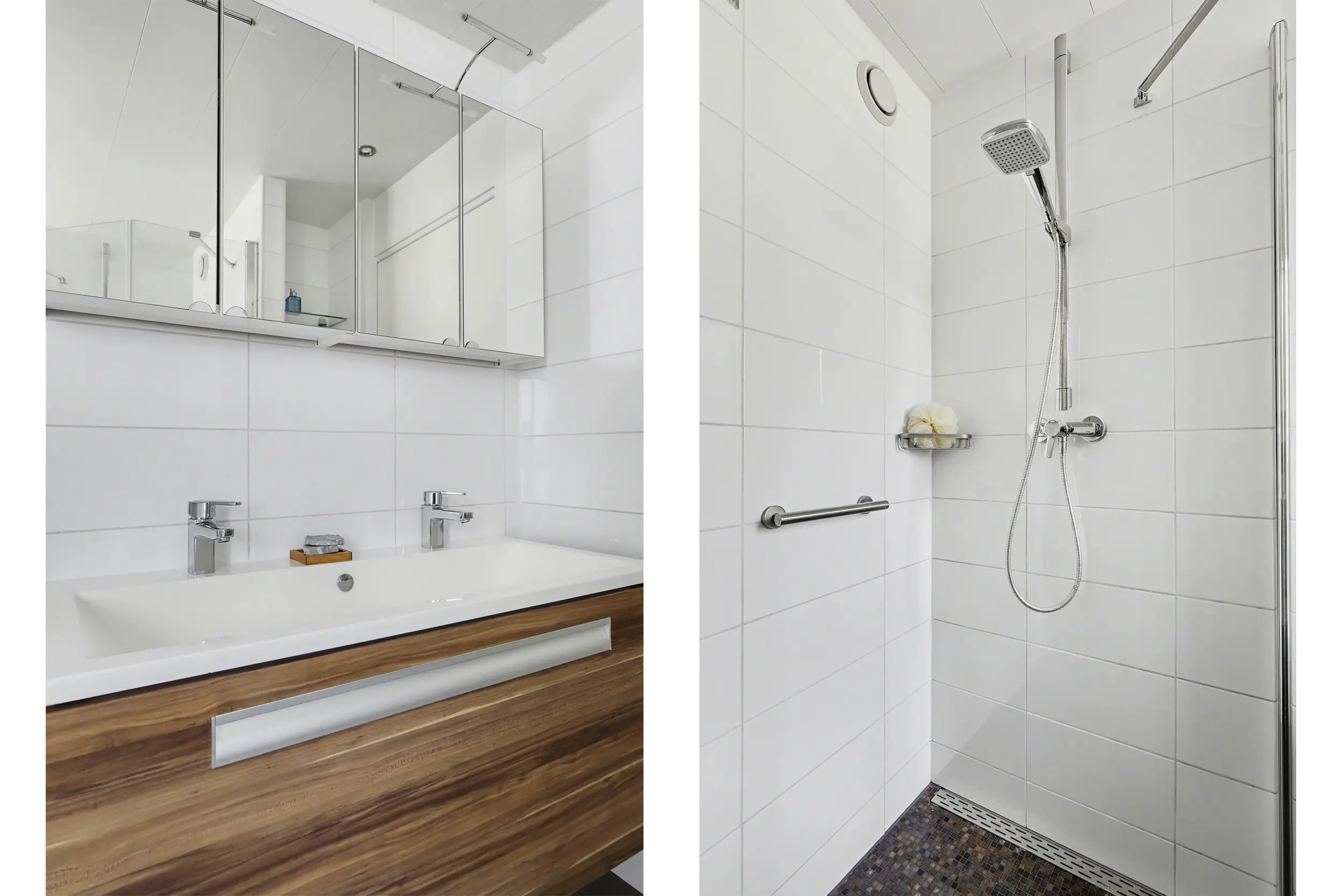 De vergrote badkamer is volledig uitgerust met een ligbad, douche, toilet en een modern wastafelmeubel.