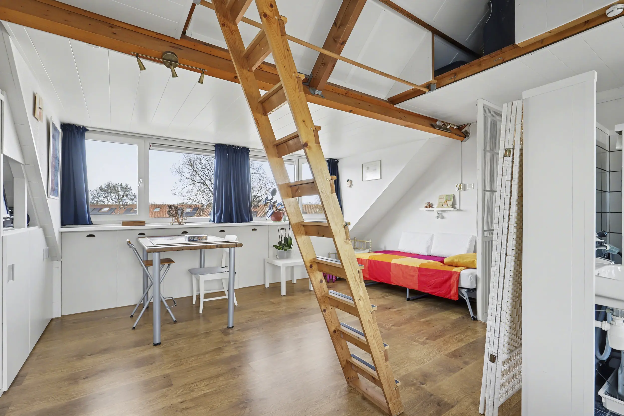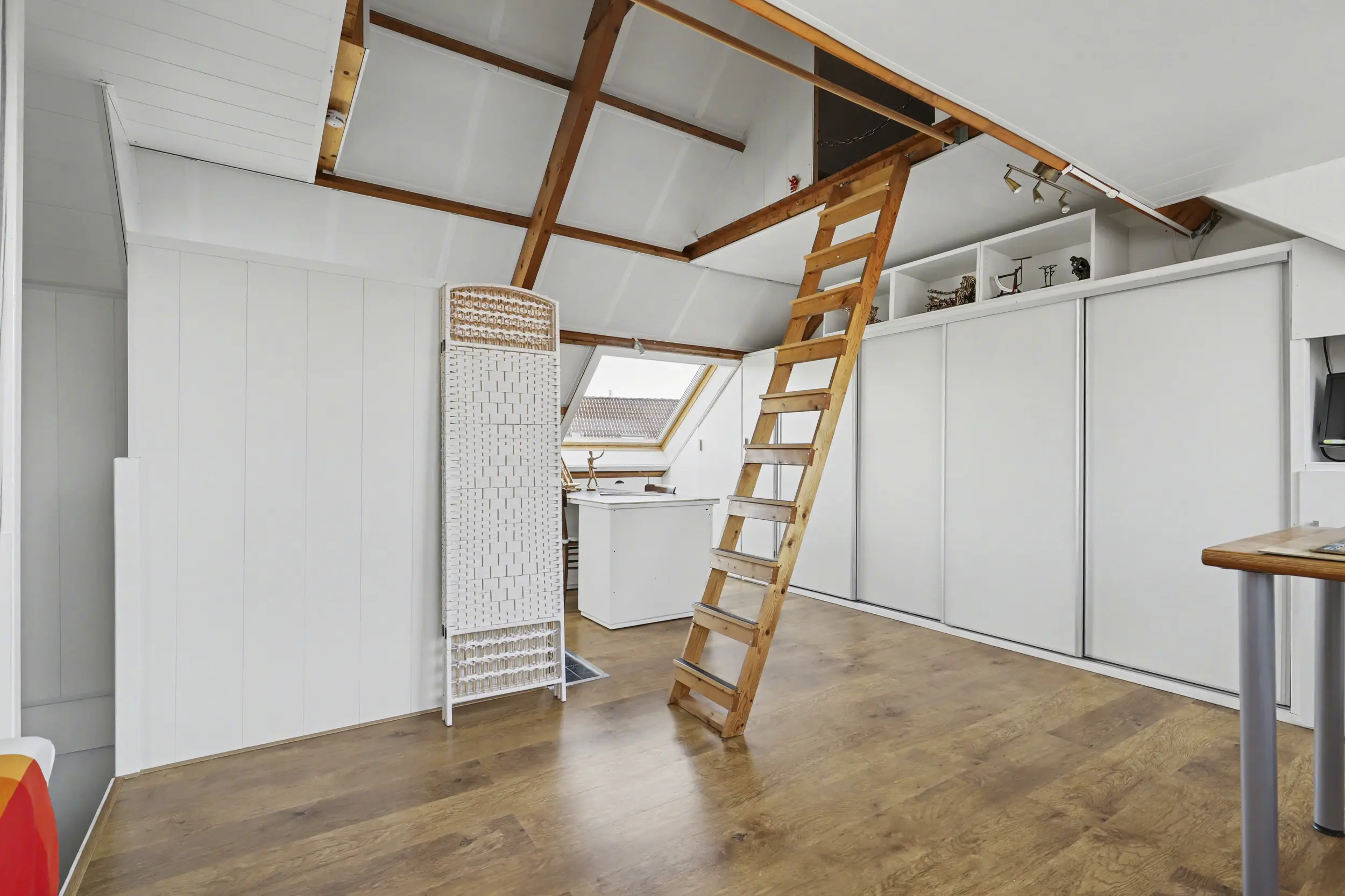 De vliering is aan twee zijden bereikbaar en een deel wordt momenteel gebruikt als knusse speelhoek voor de (klein)kinderen.
