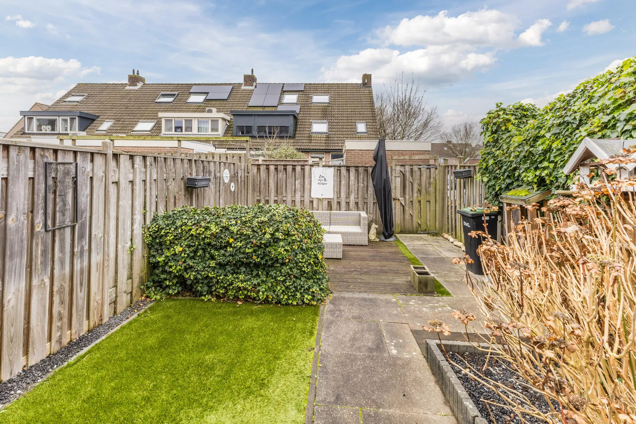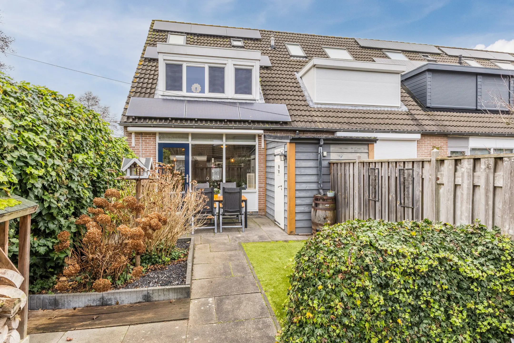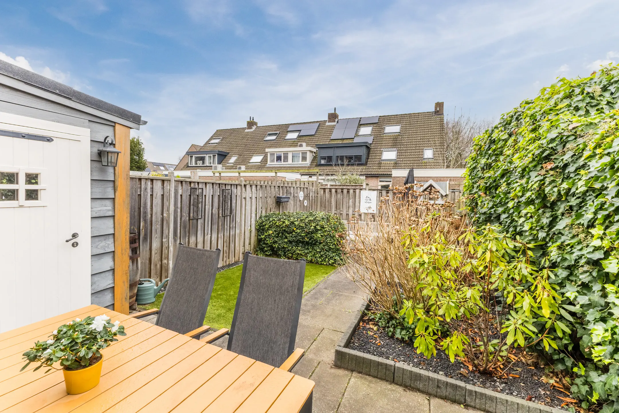 De achtertuin ligt gunstig op het zuidoosten en doordat het een hoekhuis betreft, geniet je hier tot in de avond van de zon. Voor extra comfort is er een elektrisch zonnescherm (knikarmscherm) aanwezig. Op het perceel bevinden zich maar liefst drie bergingen: twee aan de voorzijde en één achter. De stenen berging is momenteel ingericht als hobbyruimte en voorzien van een cv-kachel en bergvliering, terwijl een andere berging dienstdoet als praktische fietsschuur. Aan de voorzijde beschikt de woning over een ruime voortuin met eigen, royale parkeergelegenheid.