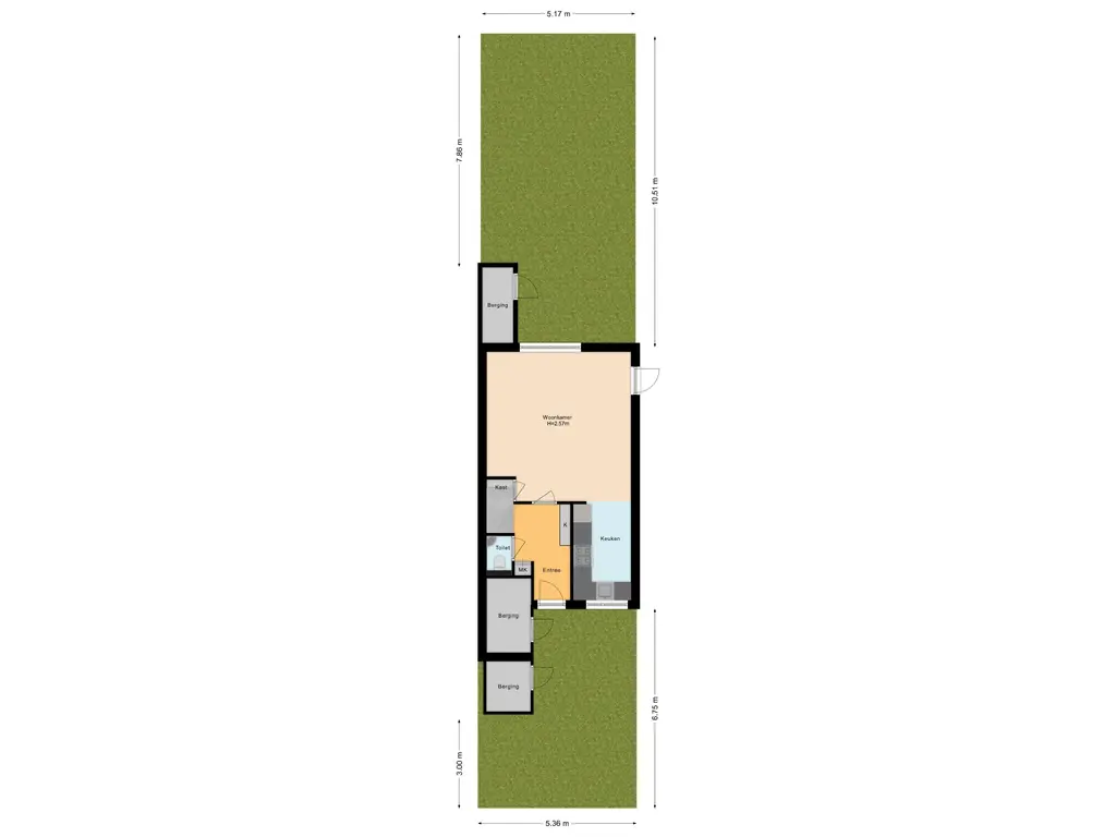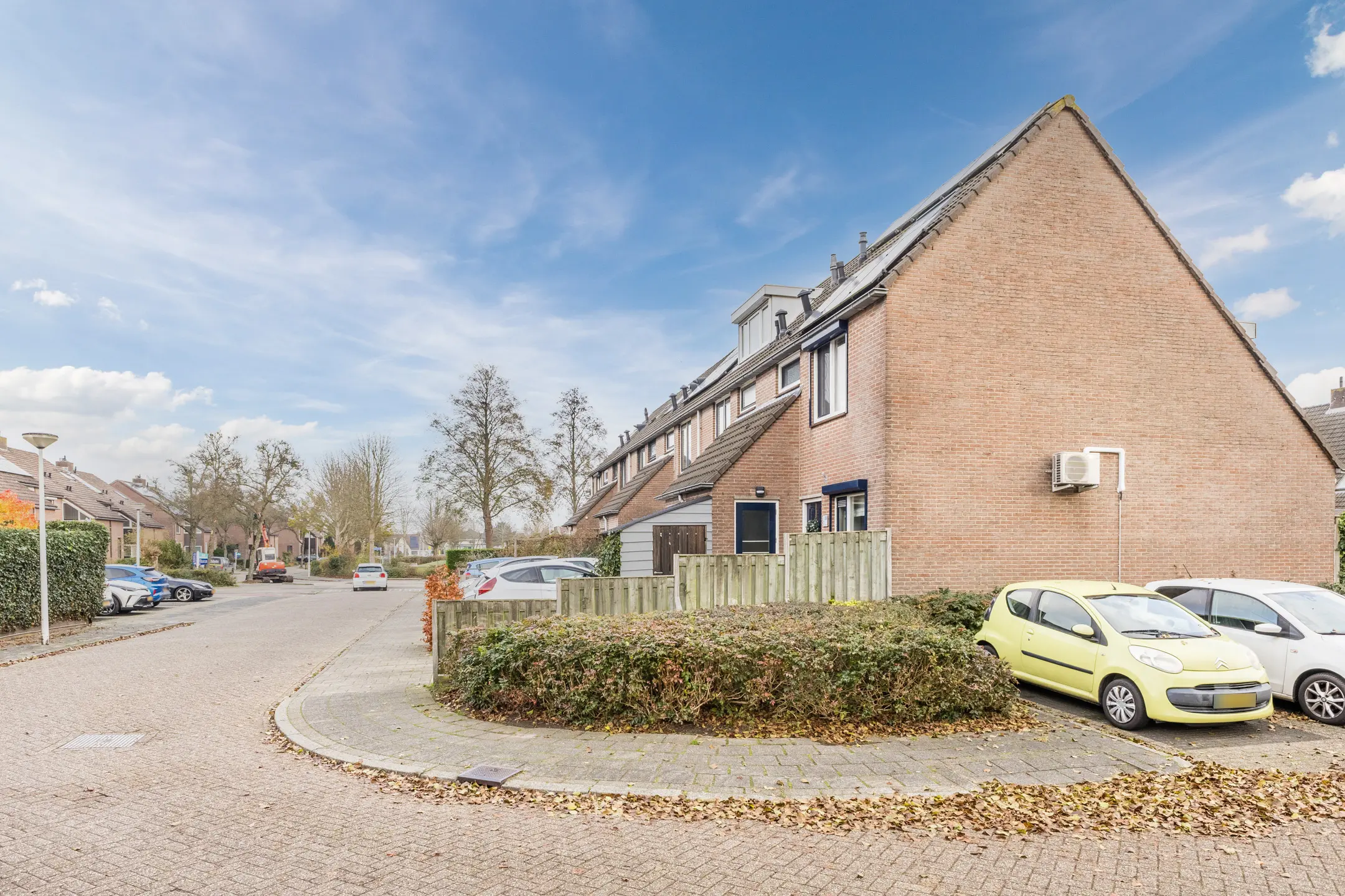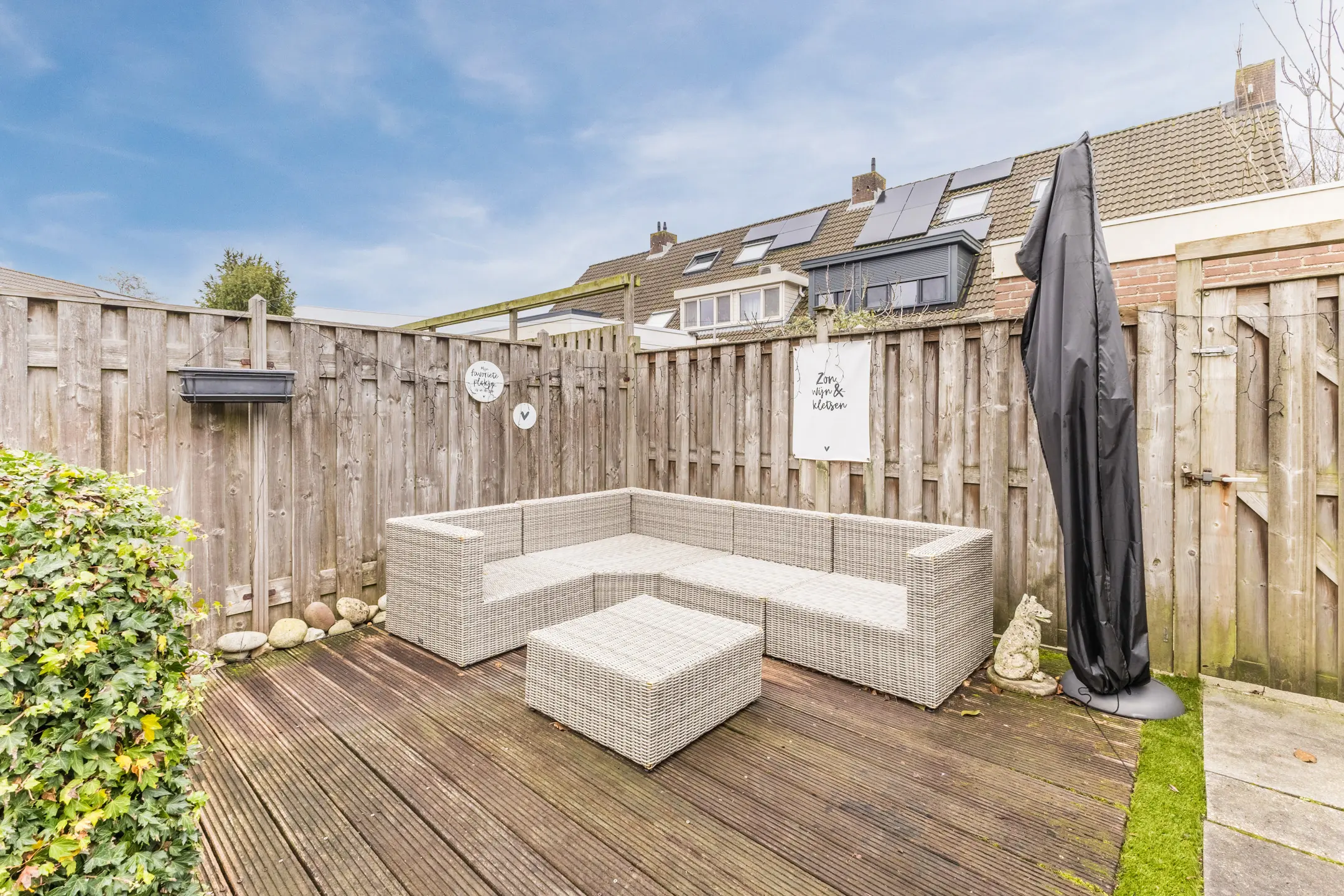 De achtertuin ligt gunstig op het zuidoosten en doordat het een hoekhuis betreft, geniet je hier tot in de avond van de zon. Voor extra comfort is er een elektrisch zonnescherm (knikarmscherm) aanwezig. Op het perceel bevinden zich maar liefst drie bergingen: twee aan de voorzijde en één achter. De stenen berging is momenteel ingericht als hobbyruimte en voorzien van een cv-kachel en bergvliering, terwijl een andere berging dienstdoet als praktische fietsschuur. Aan de voorzijde beschikt de woning over een ruime voortuin met eigen, royale parkeergelegenheid.